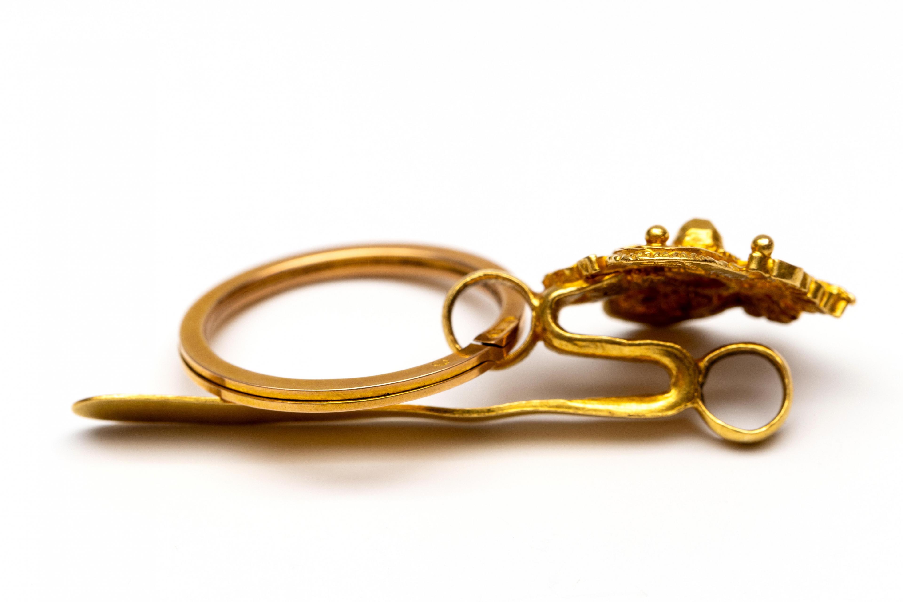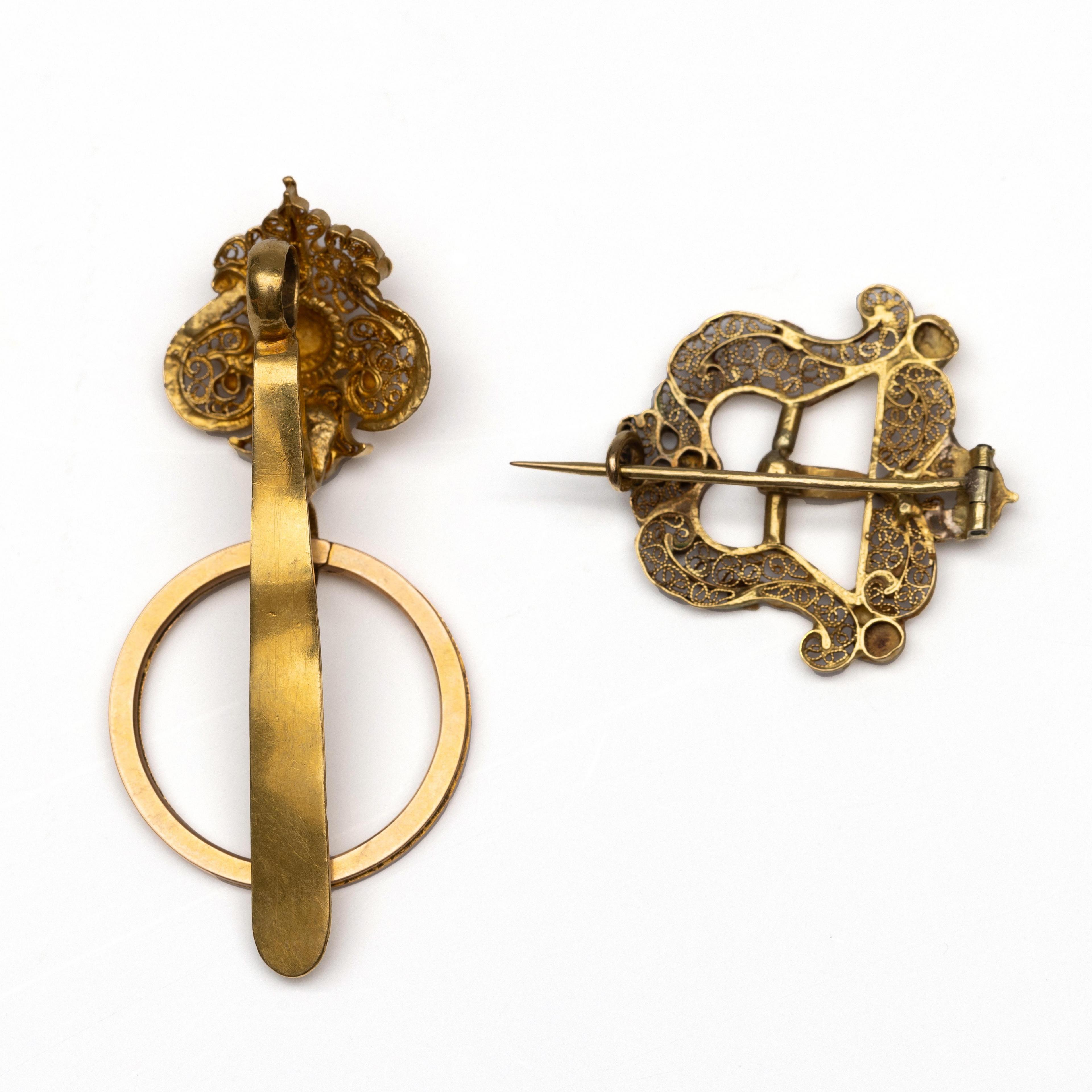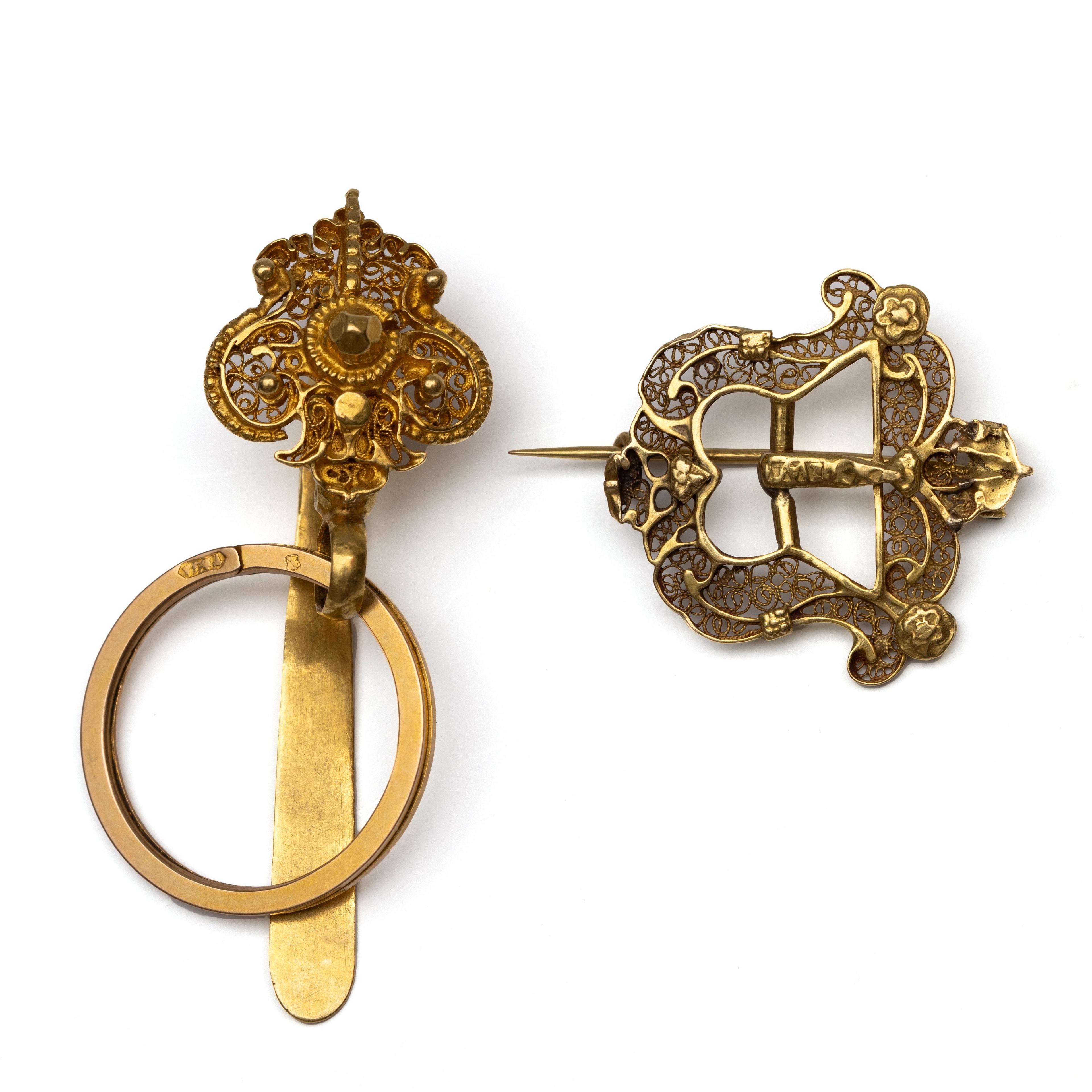 18 k. Gold purse hook and brooch, first half of the 19th century. The hook features a shield-shaped appliqué with filigree scrolls, with a split ring. The maker's mark is illegible. The brooch originally a clasp, decorated with rosettes and filigree.