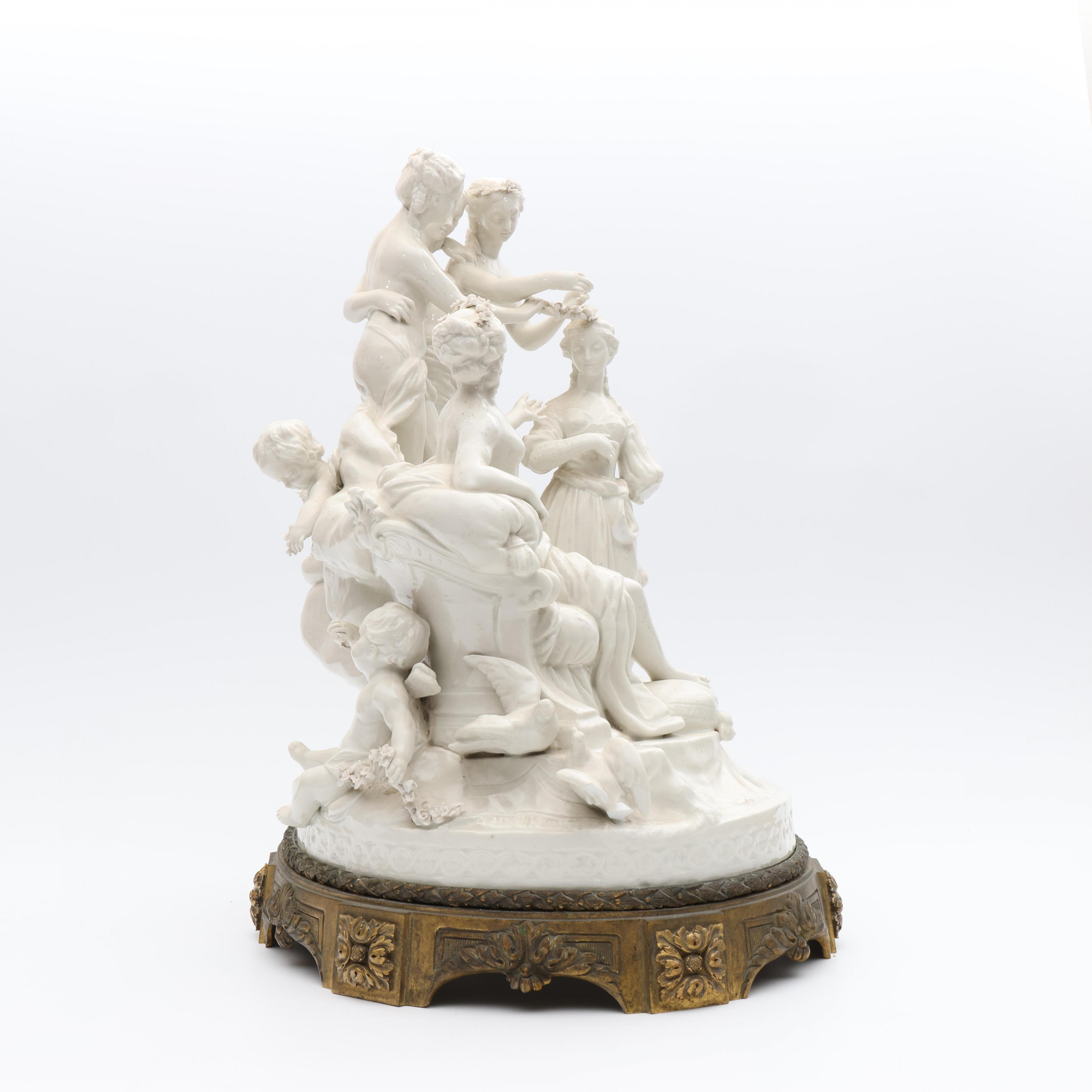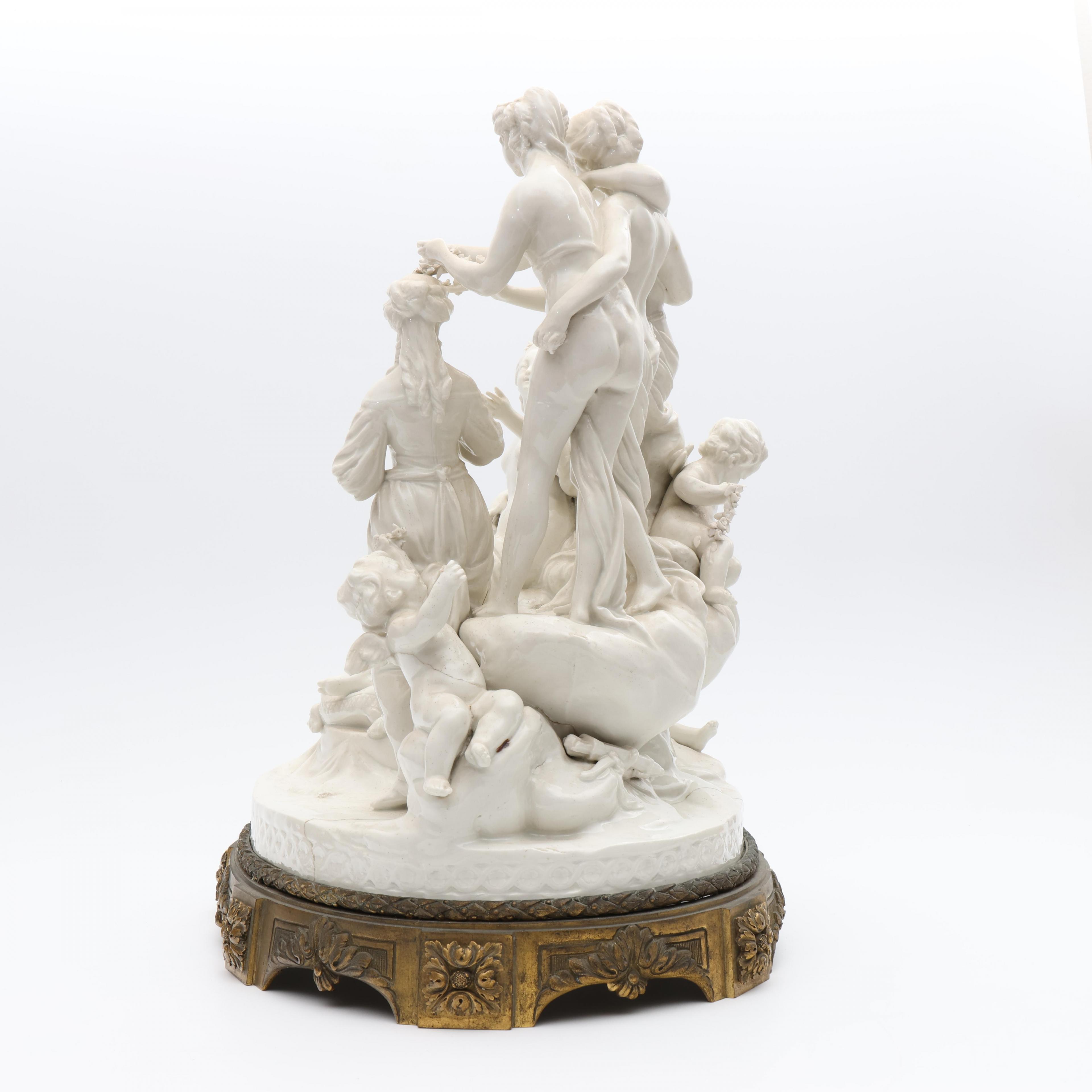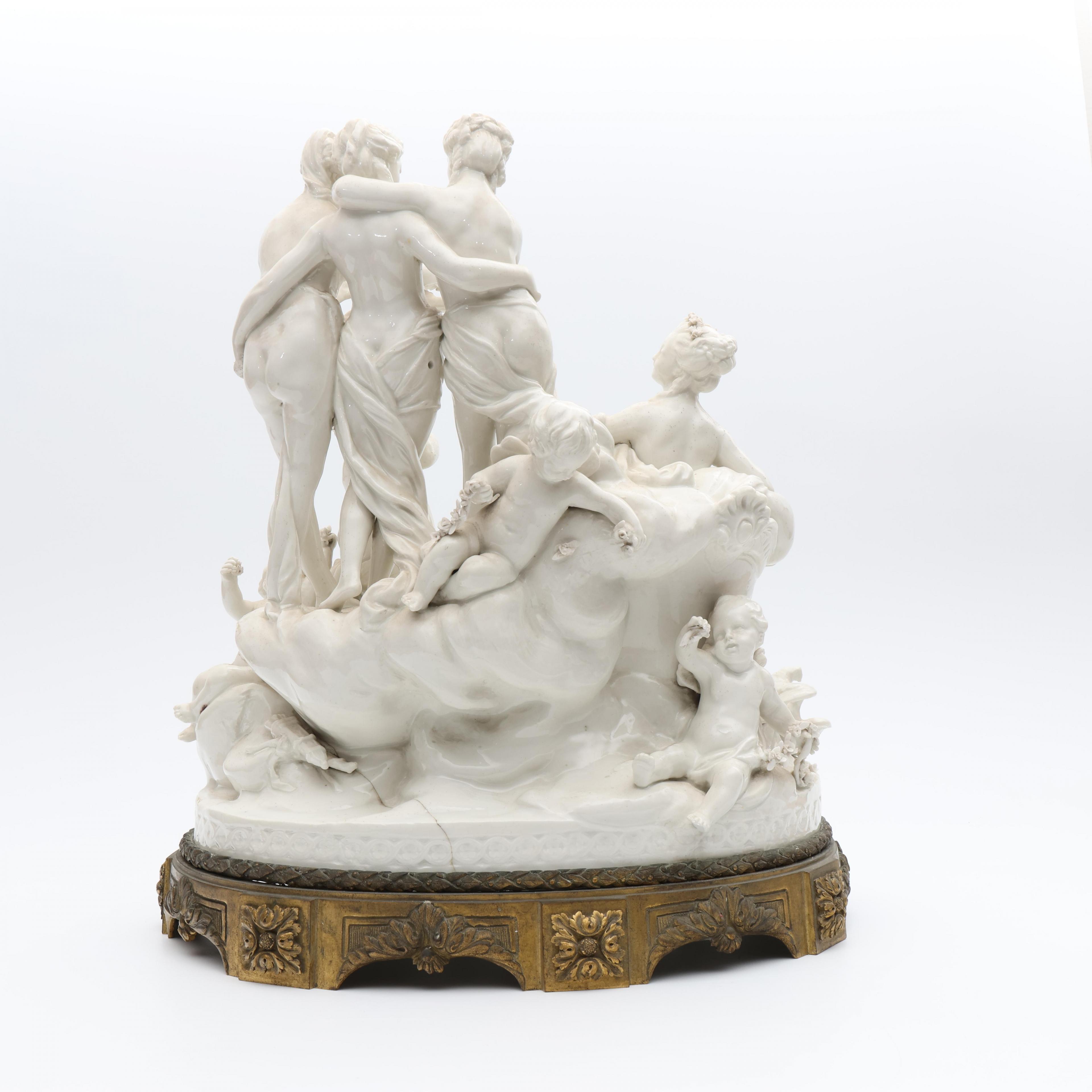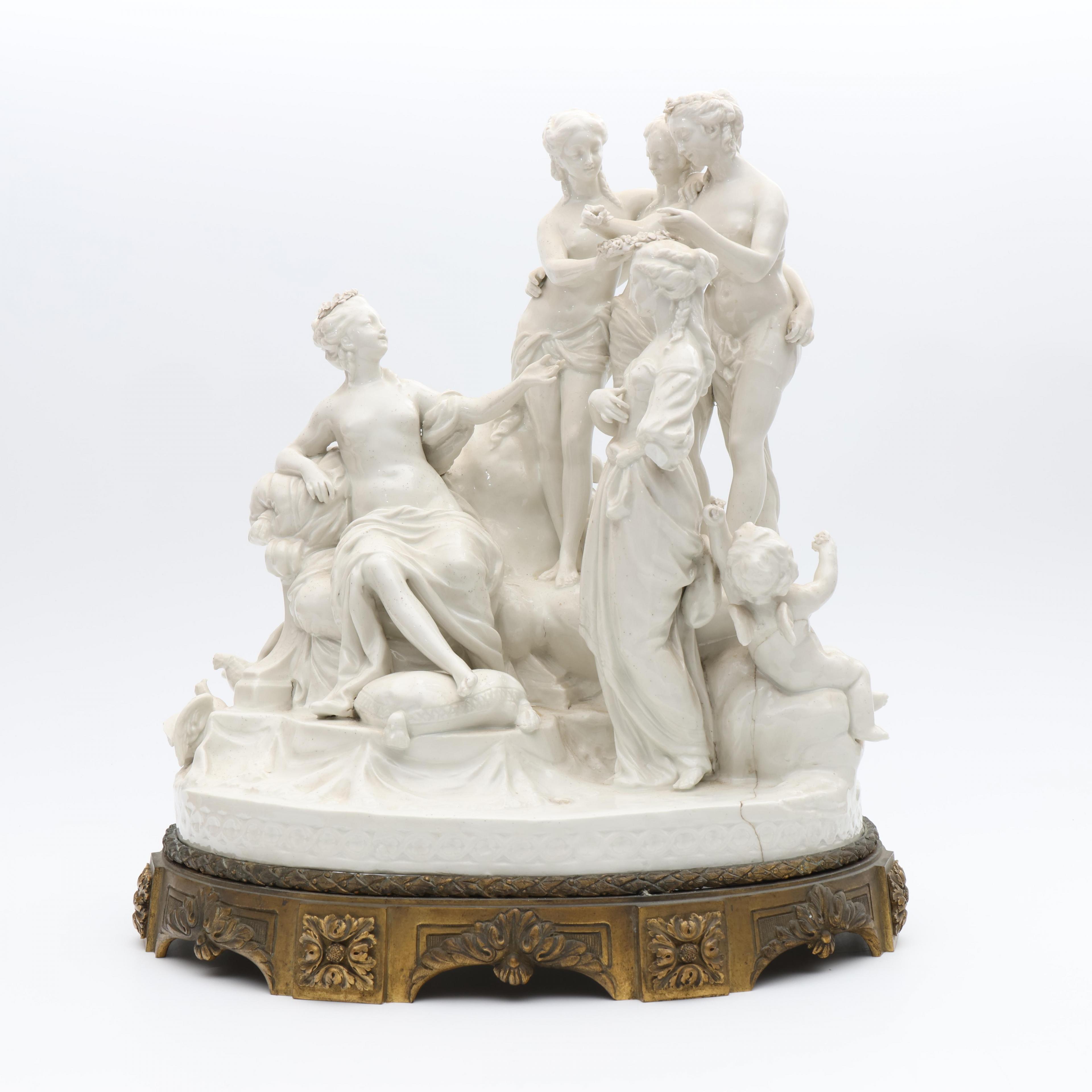 Voorstellende mythologische groep. Onderzijde gemerkt met semi Meissen merk. Geheel op vuurvergulde bronzen voet. (Bodem gelijmd, beschadigingen, manco's).