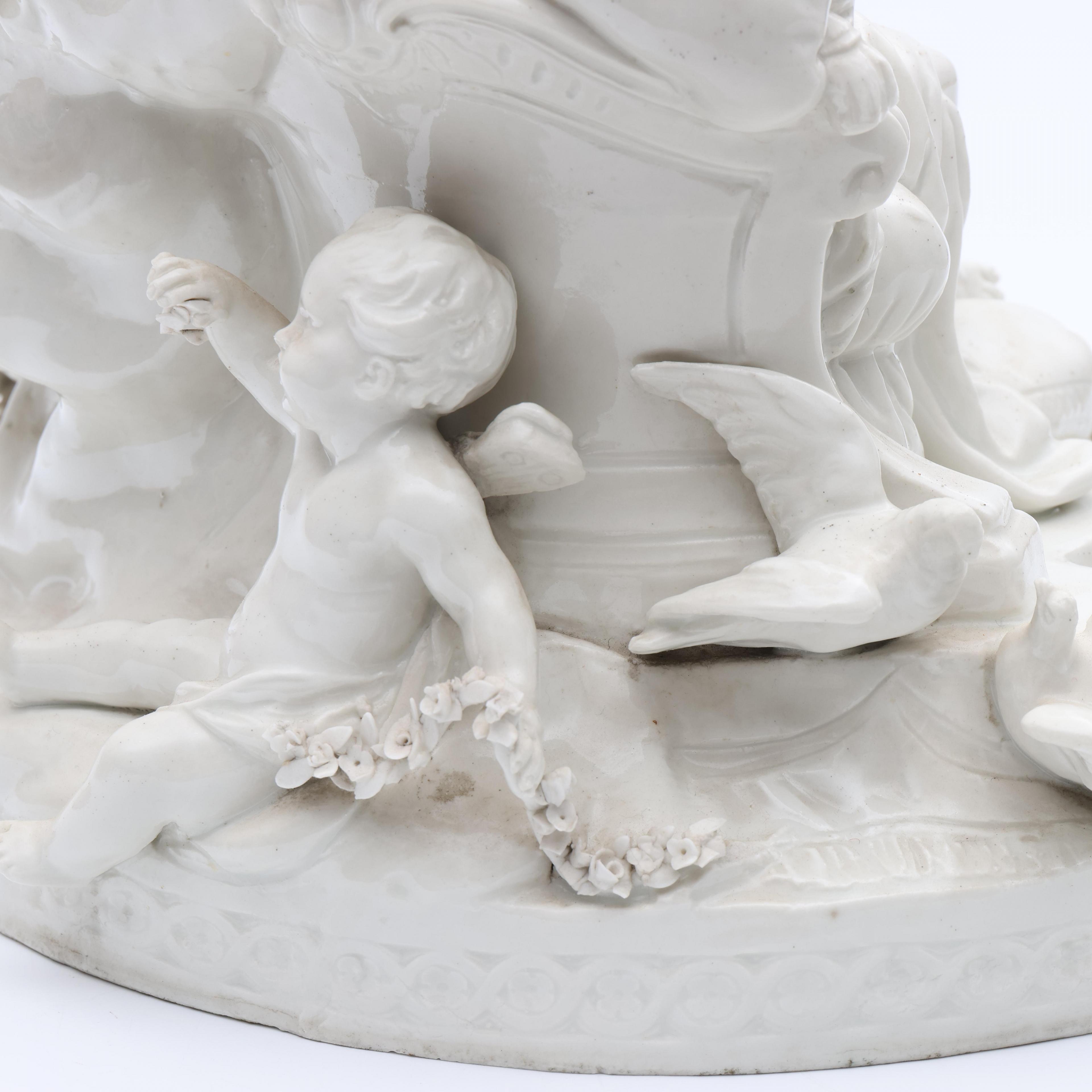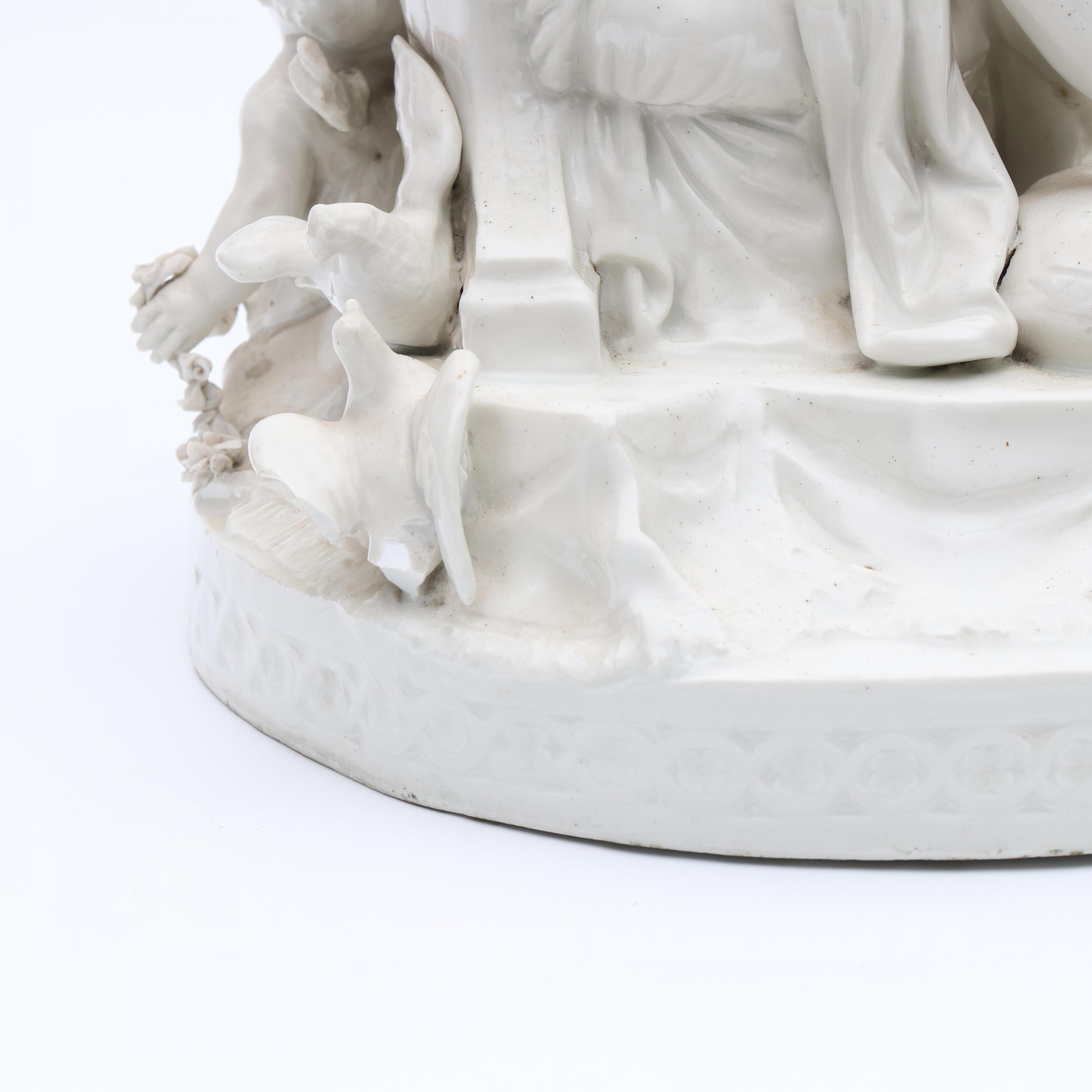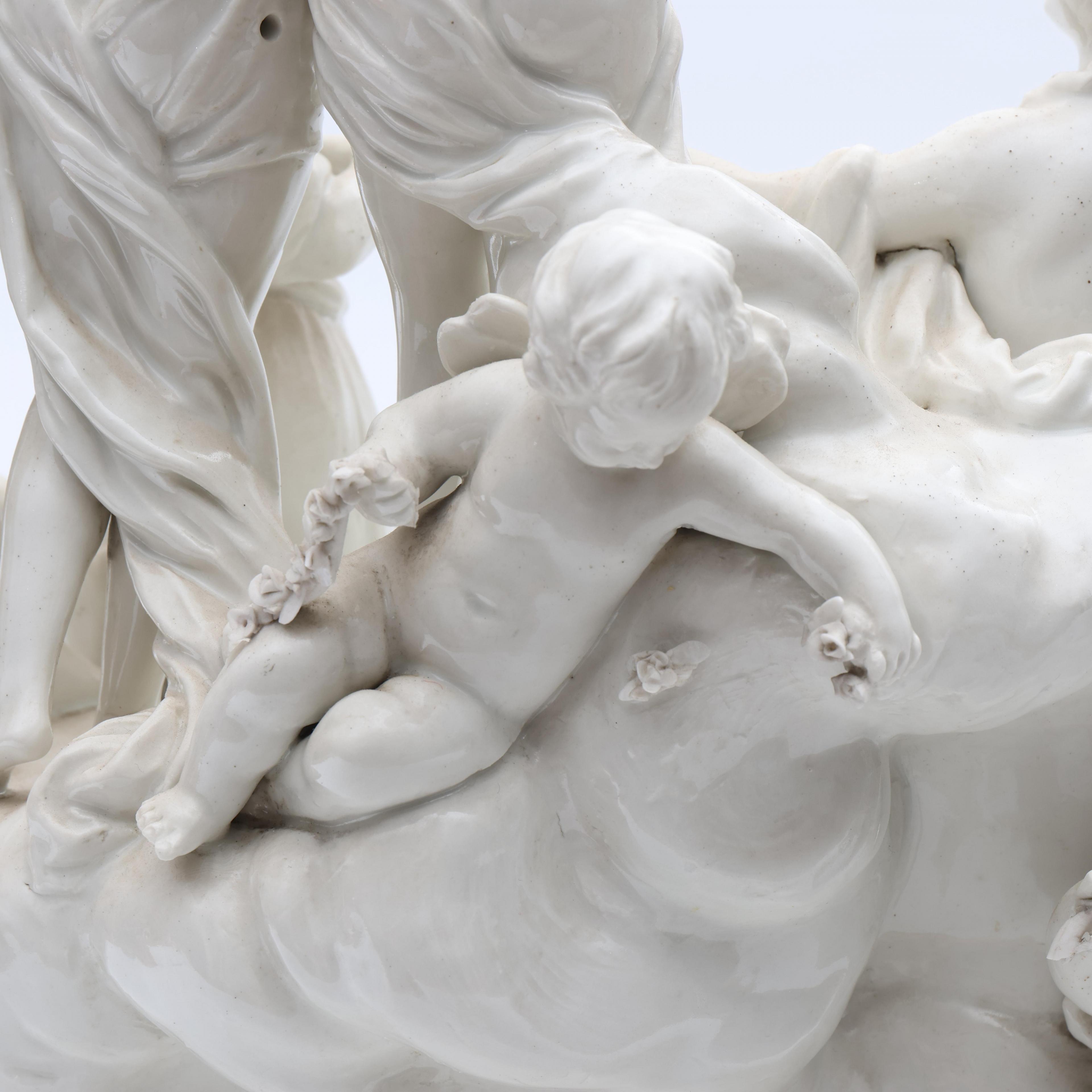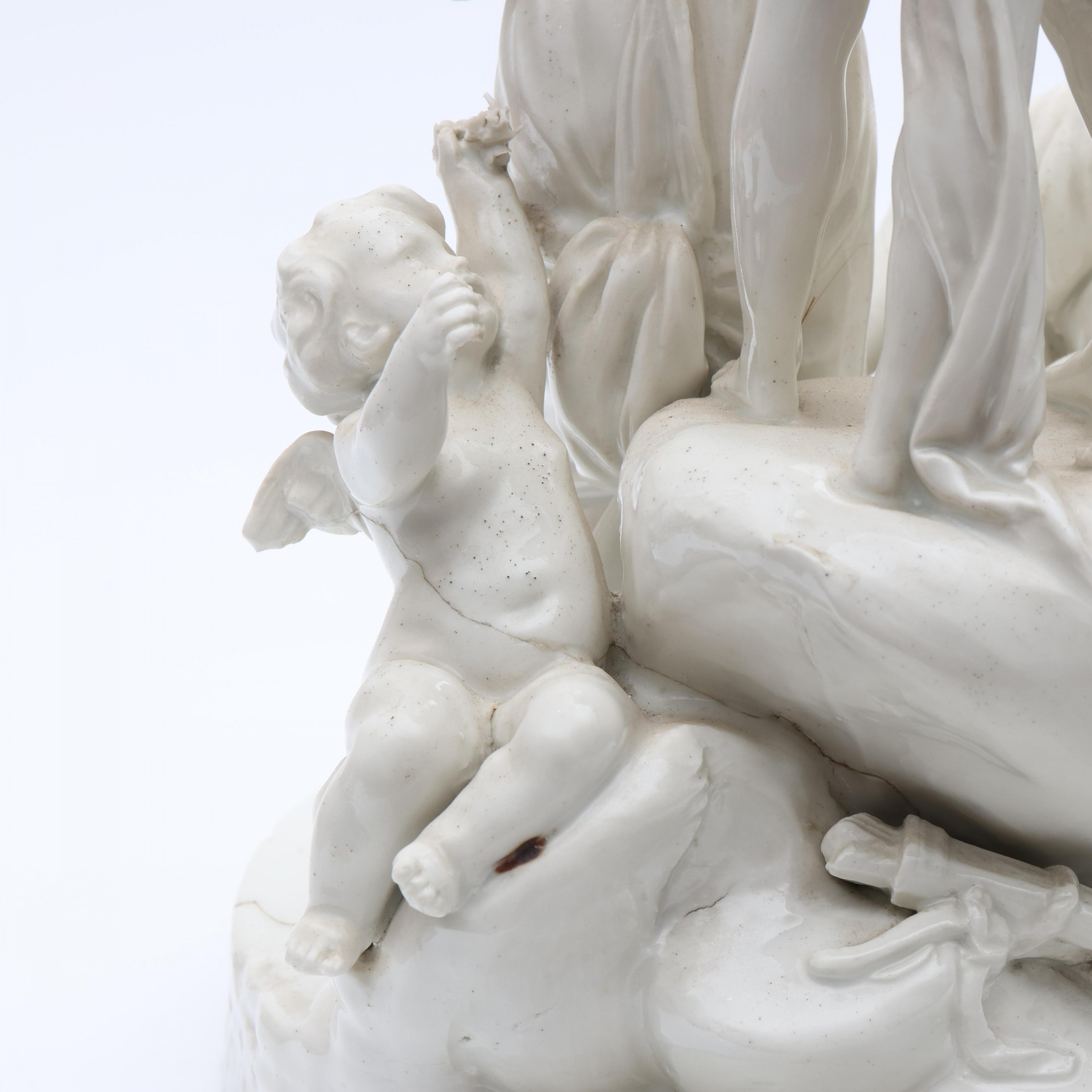 Voorstellende mythologische groep. Onderzijde gemerkt met semi Meissen merk. Geheel op vuurvergulde bronzen voet. (Bodem gelijmd, beschadigingen, manco's).