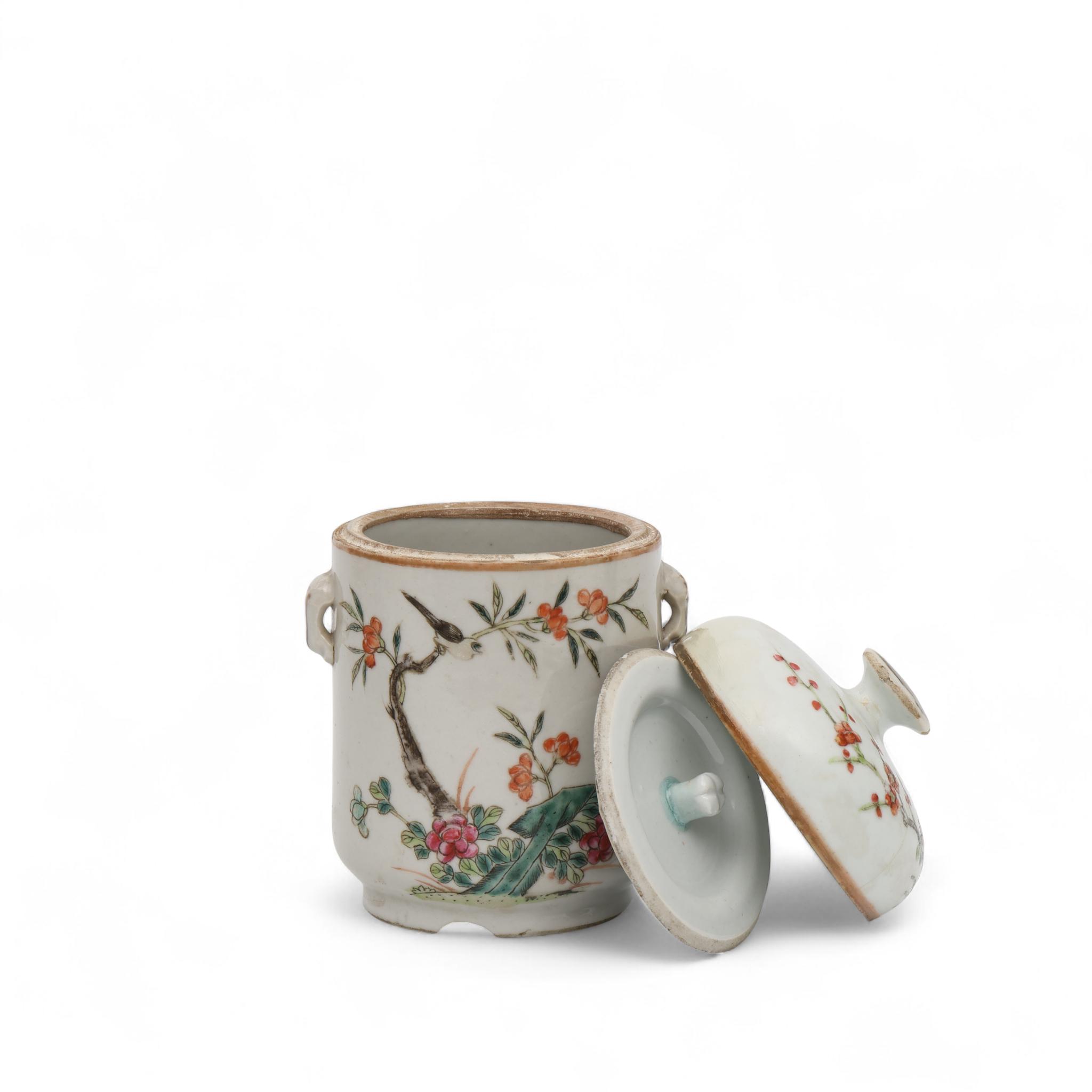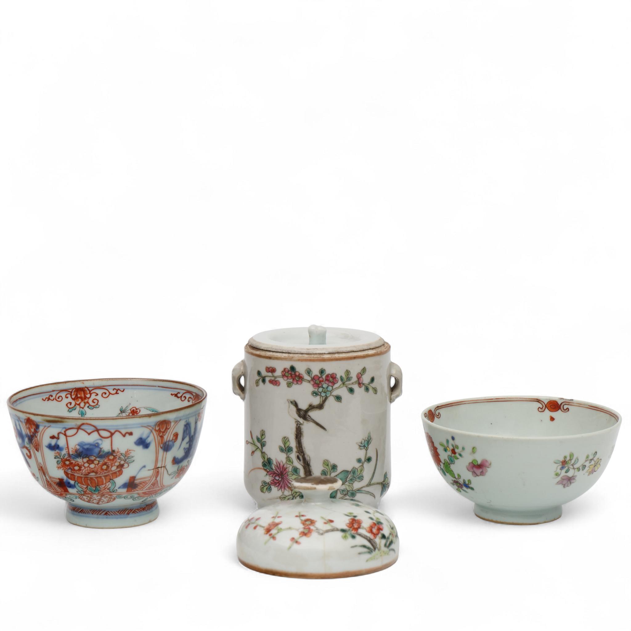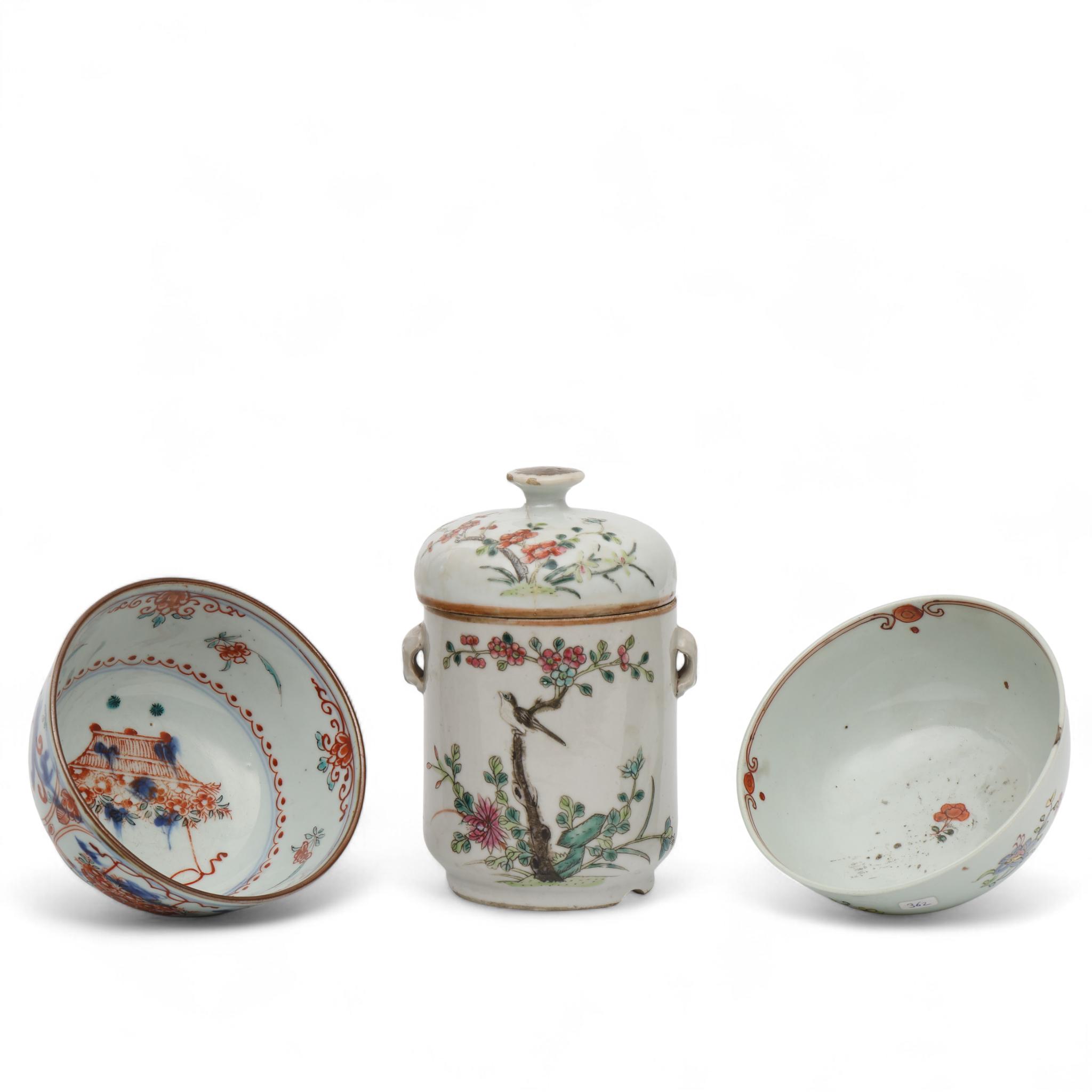 comprising an overdecorated 'Amsterdams Bont' bowl, a famille rose floral bowl and a famille rose jar and cover painted with bird on a flowering branch (cover restored and with hairlines)
