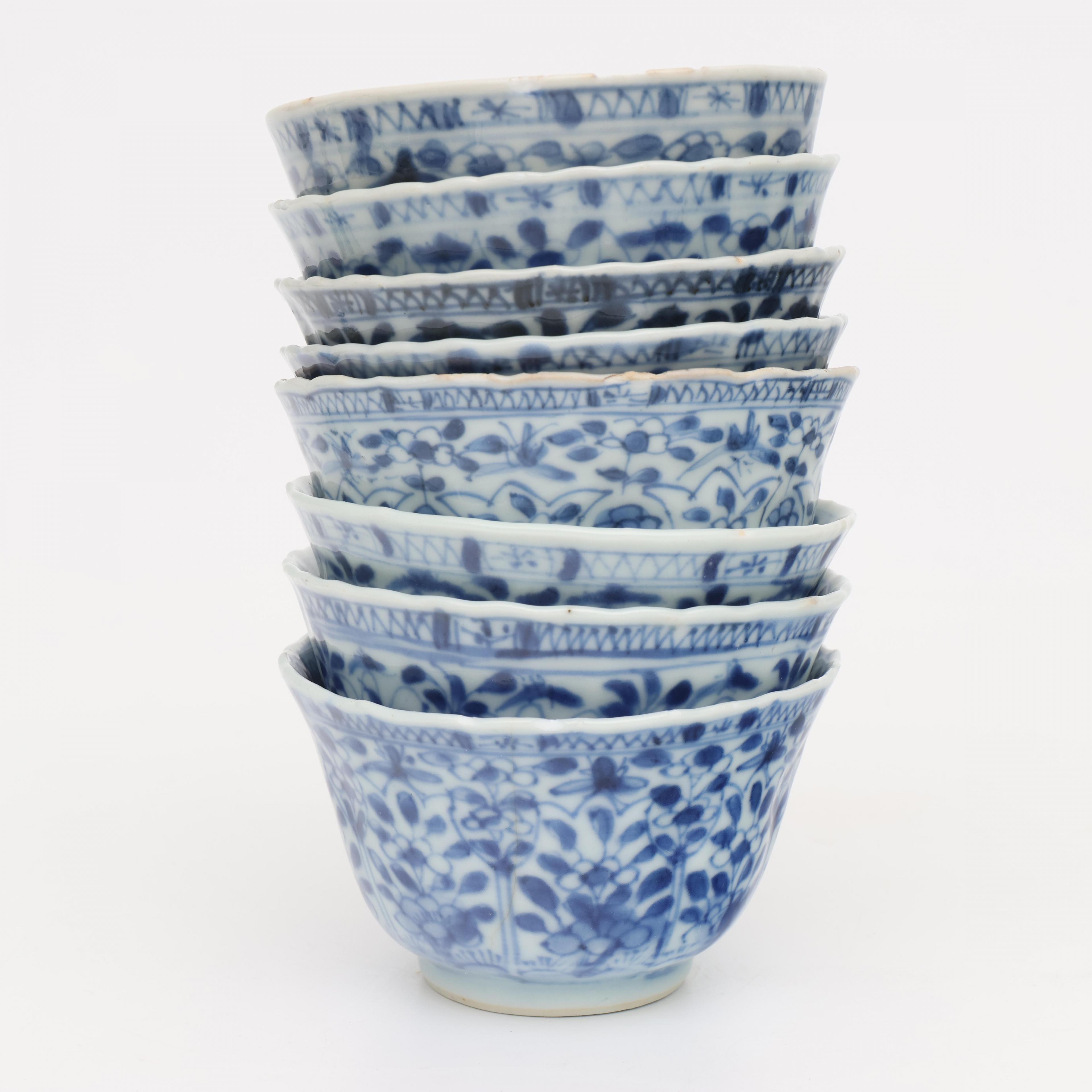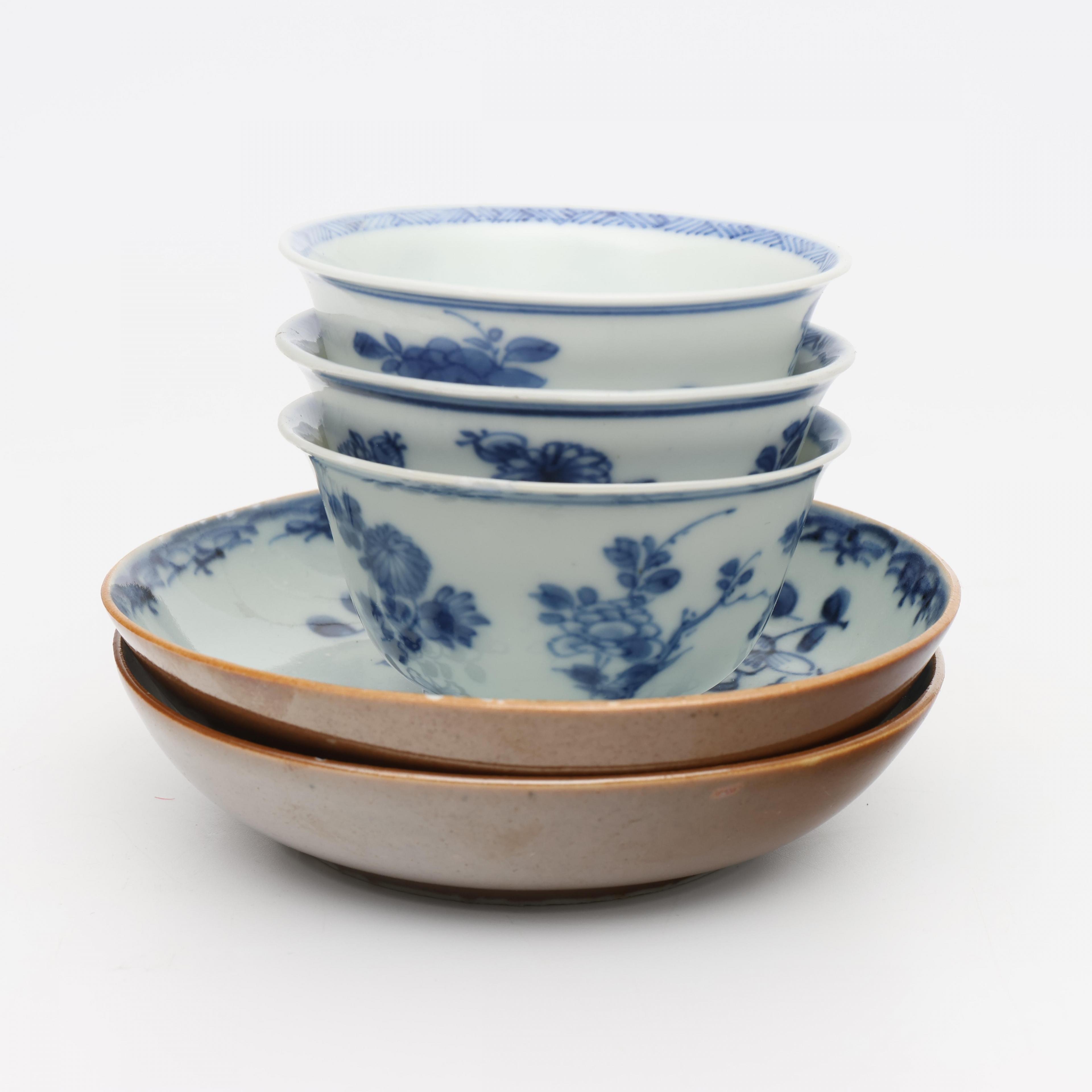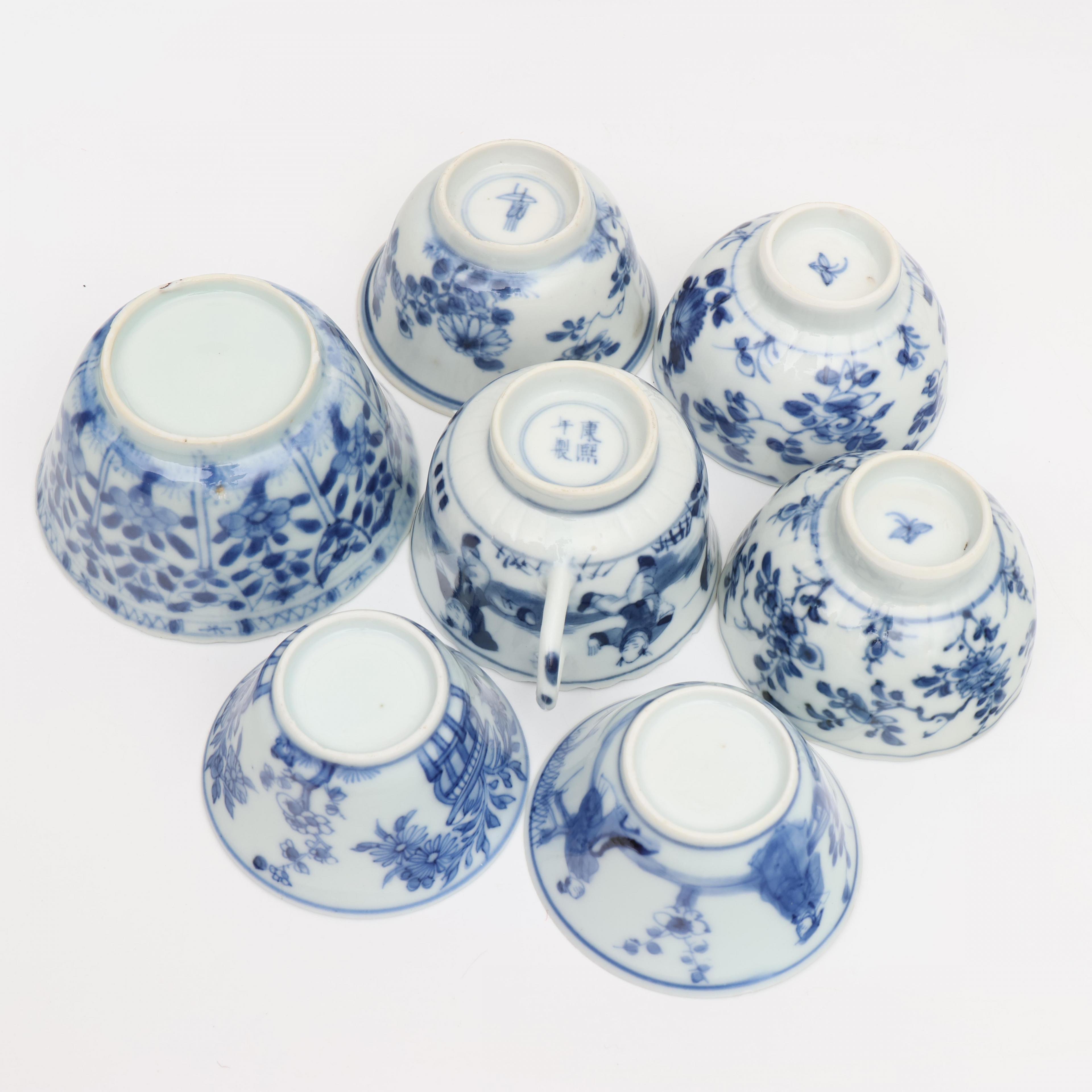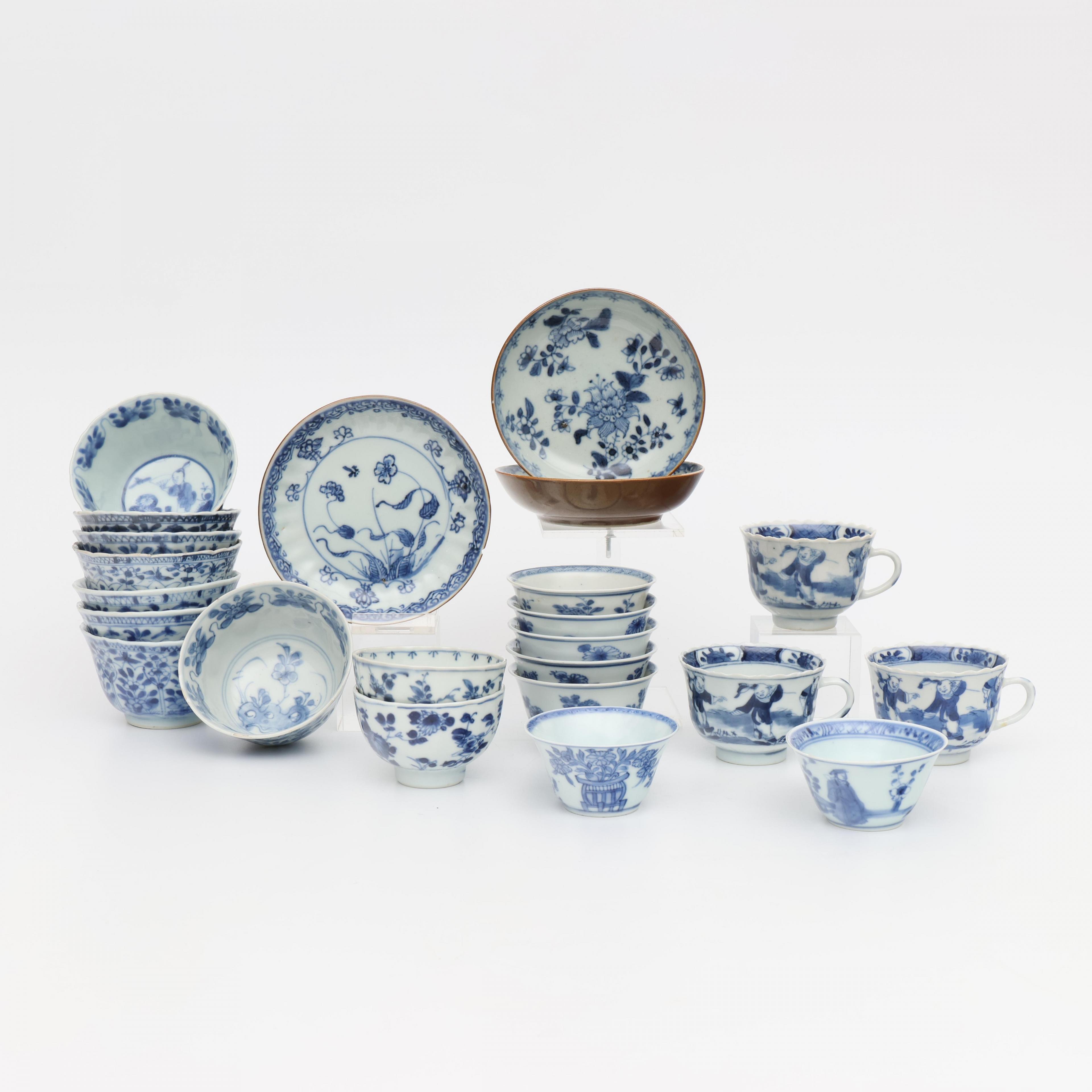 China, a collection of blue and white porcelain cups and saucers, mainly 18th century,