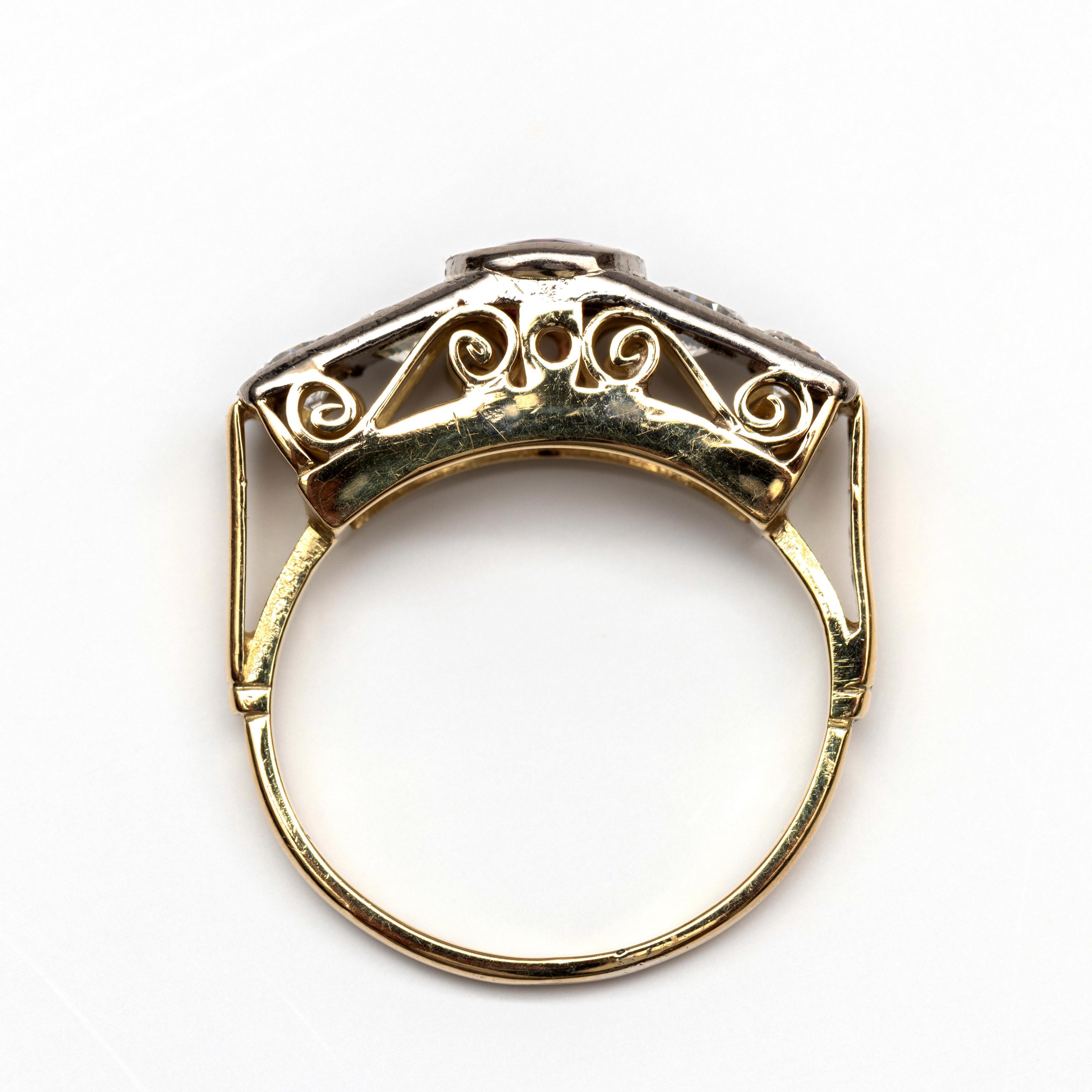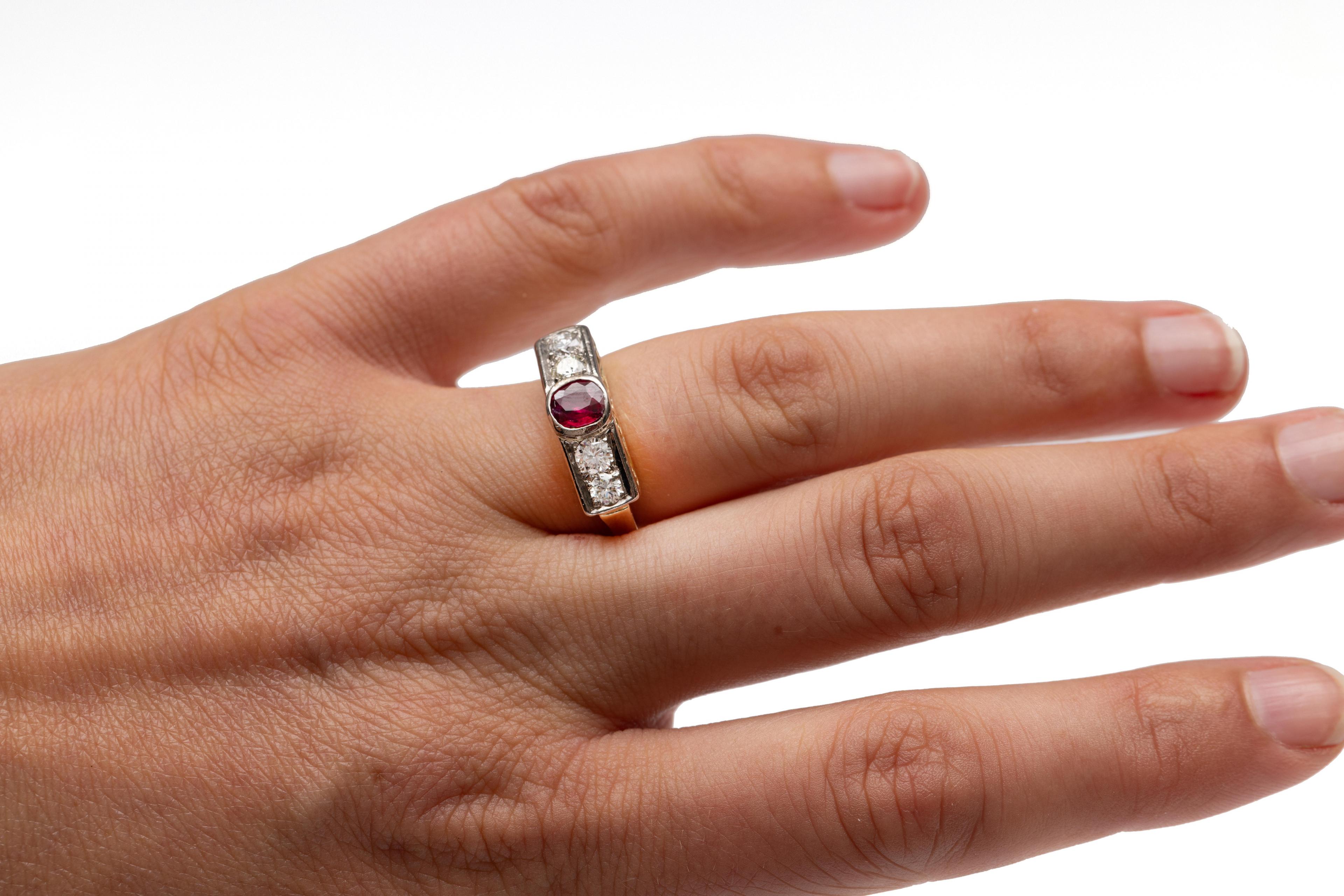 De bovenzijde gehoekt. Centraal bezet met een kussenvormige gefacetteerde robijn (ca. 5,2 x 4,7 mm) met aan weerszijde twee briljant geslepen diamanten met een totaalgewicht van ca. 0.80 ct.