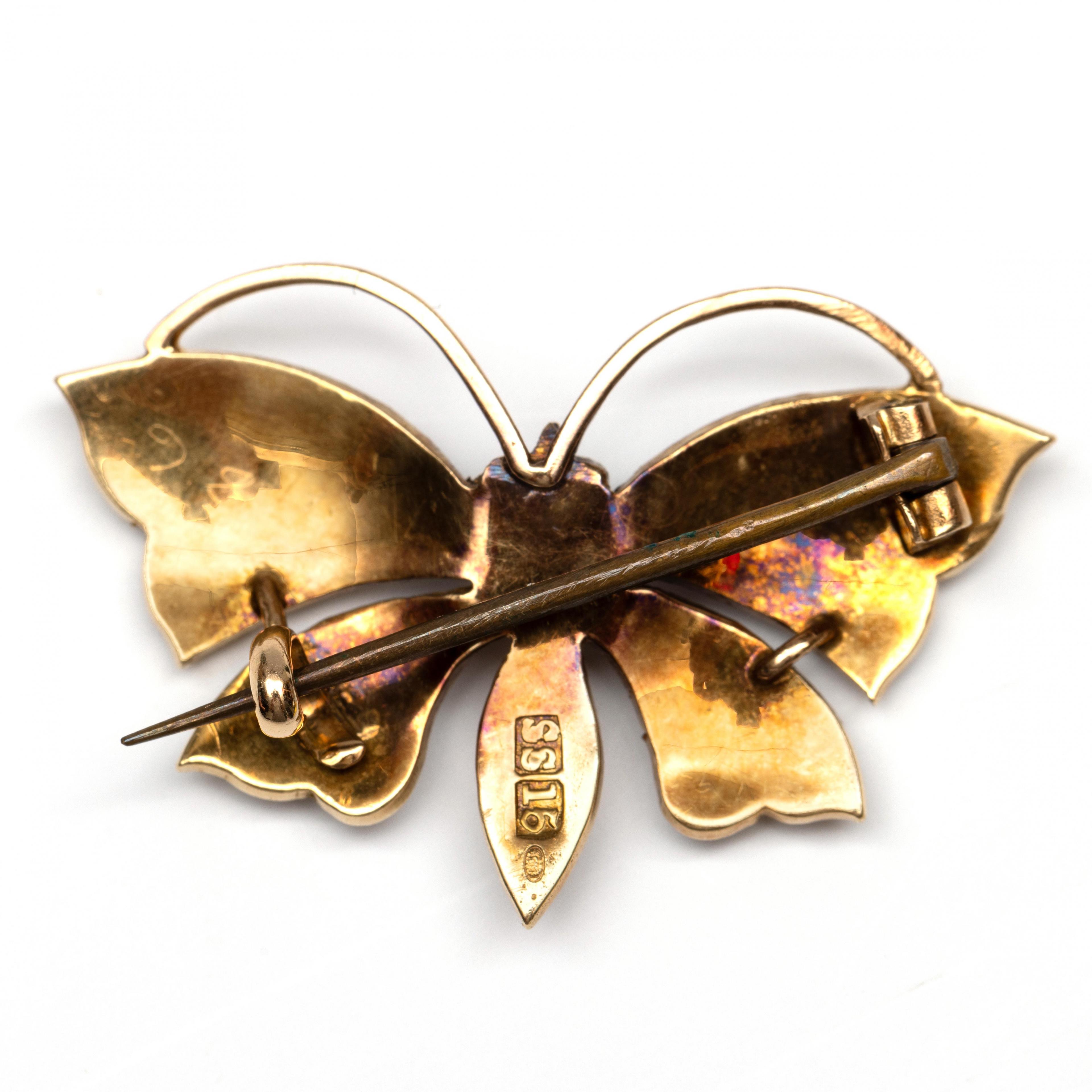14 k. gold brooch, second half of the 19th century. In the shape of a butterfly. The body and wings are set with half-pearls, the eyes are set with small rose-cut diamonds.