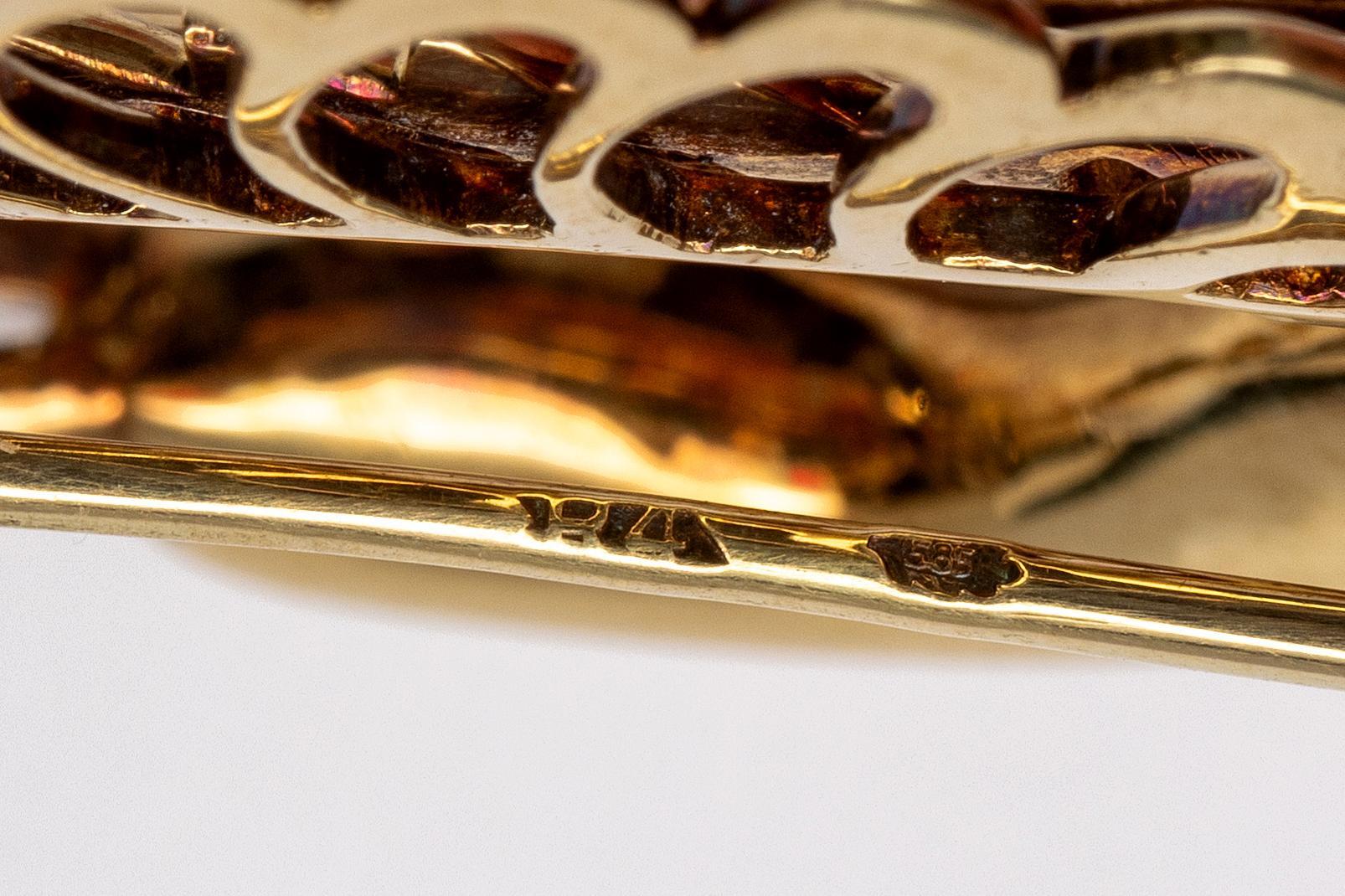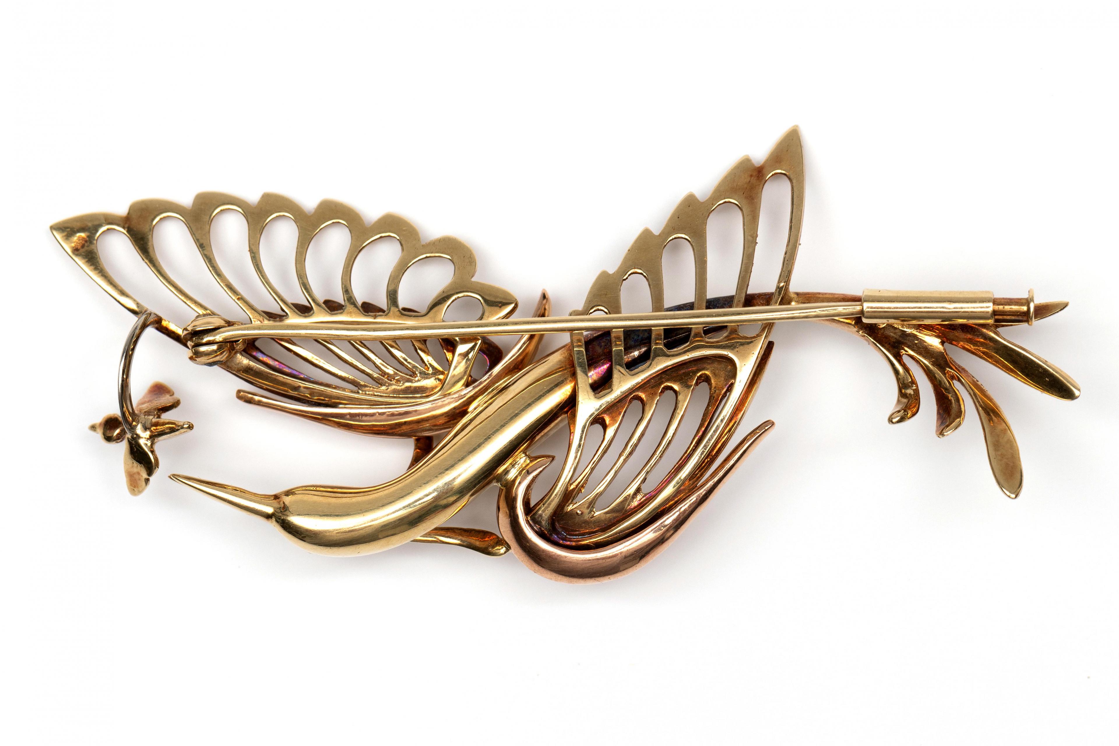Reggers, 14 k. gold brooch, in the shape of a bird in flight, chasing a butterfly. The wings openworked and trimmed with red gold. Hallmarked with the maker's mark of the Reggers Brothers, Amsterdam, 1934-1971.