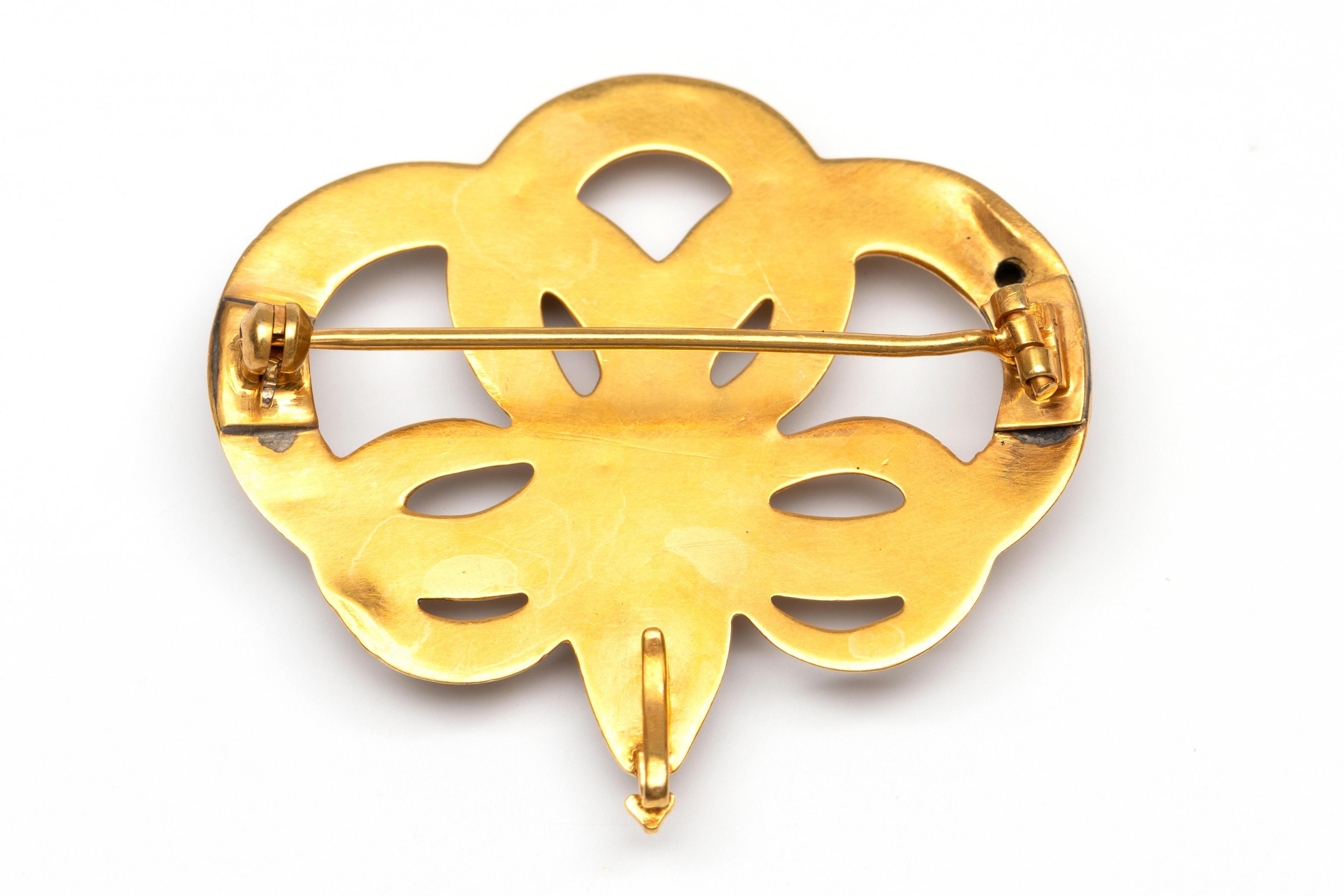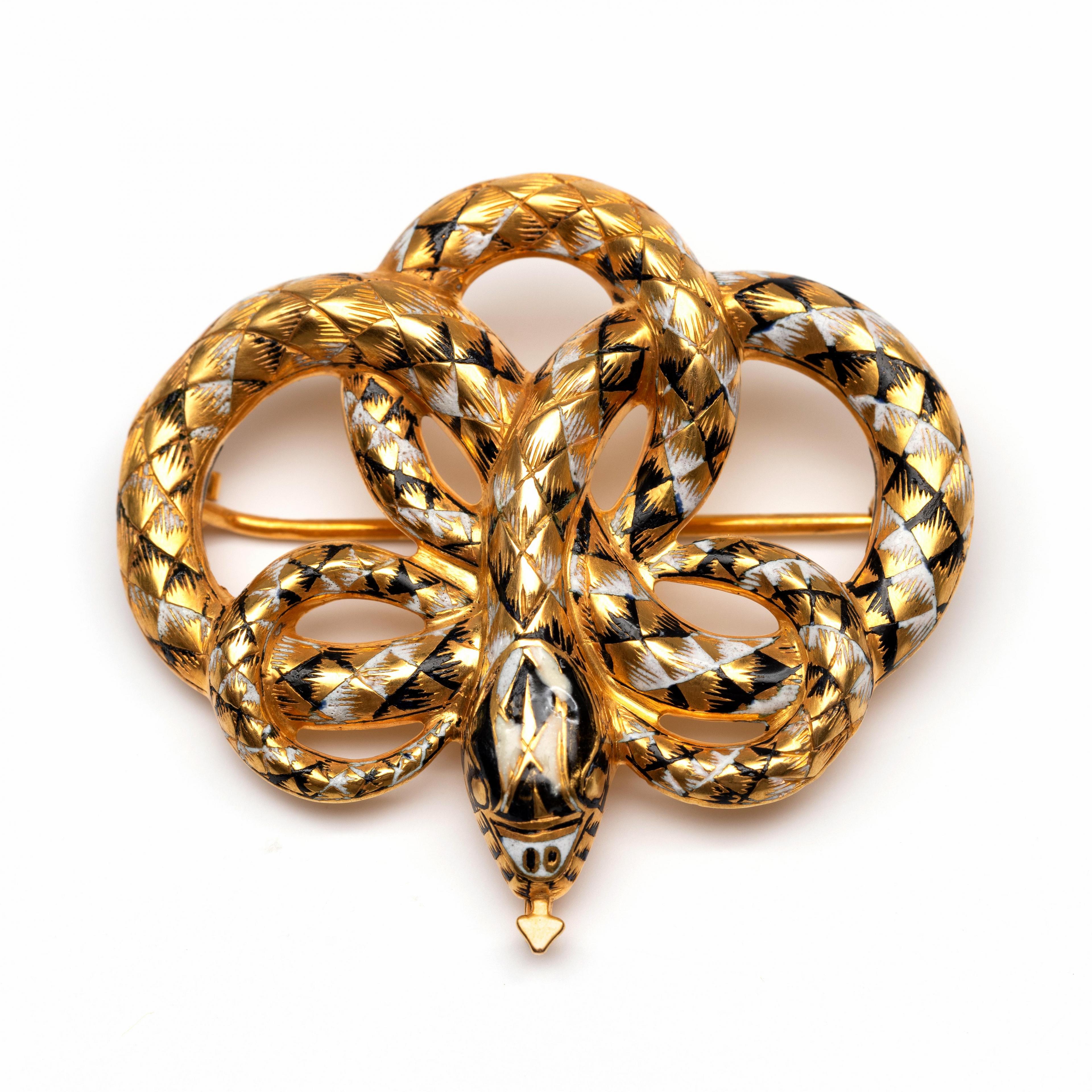 14 k. Gold brooch, 19th century. In the shape of a coiled snake with its tongue extended, the scales trimmed with white and black enamel.