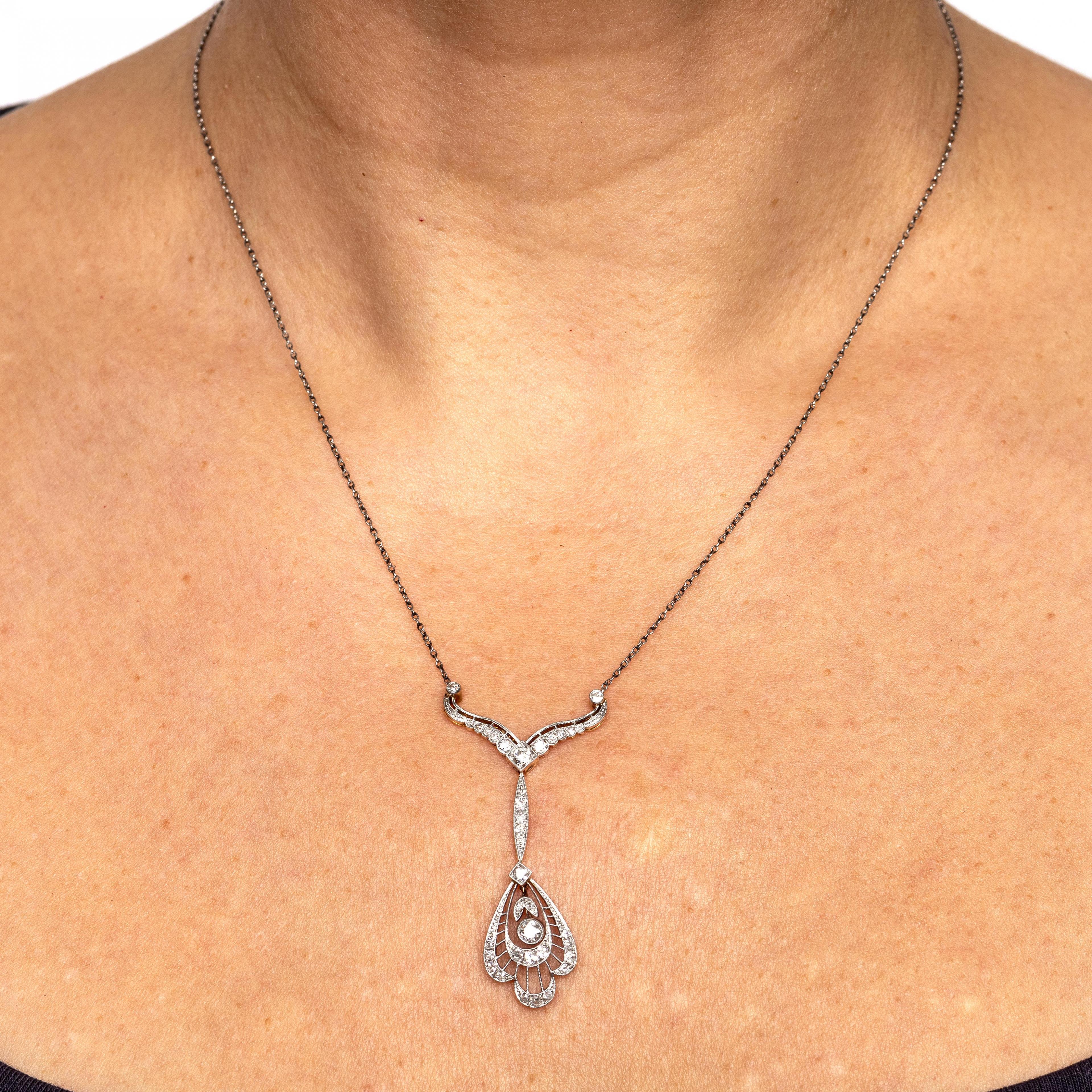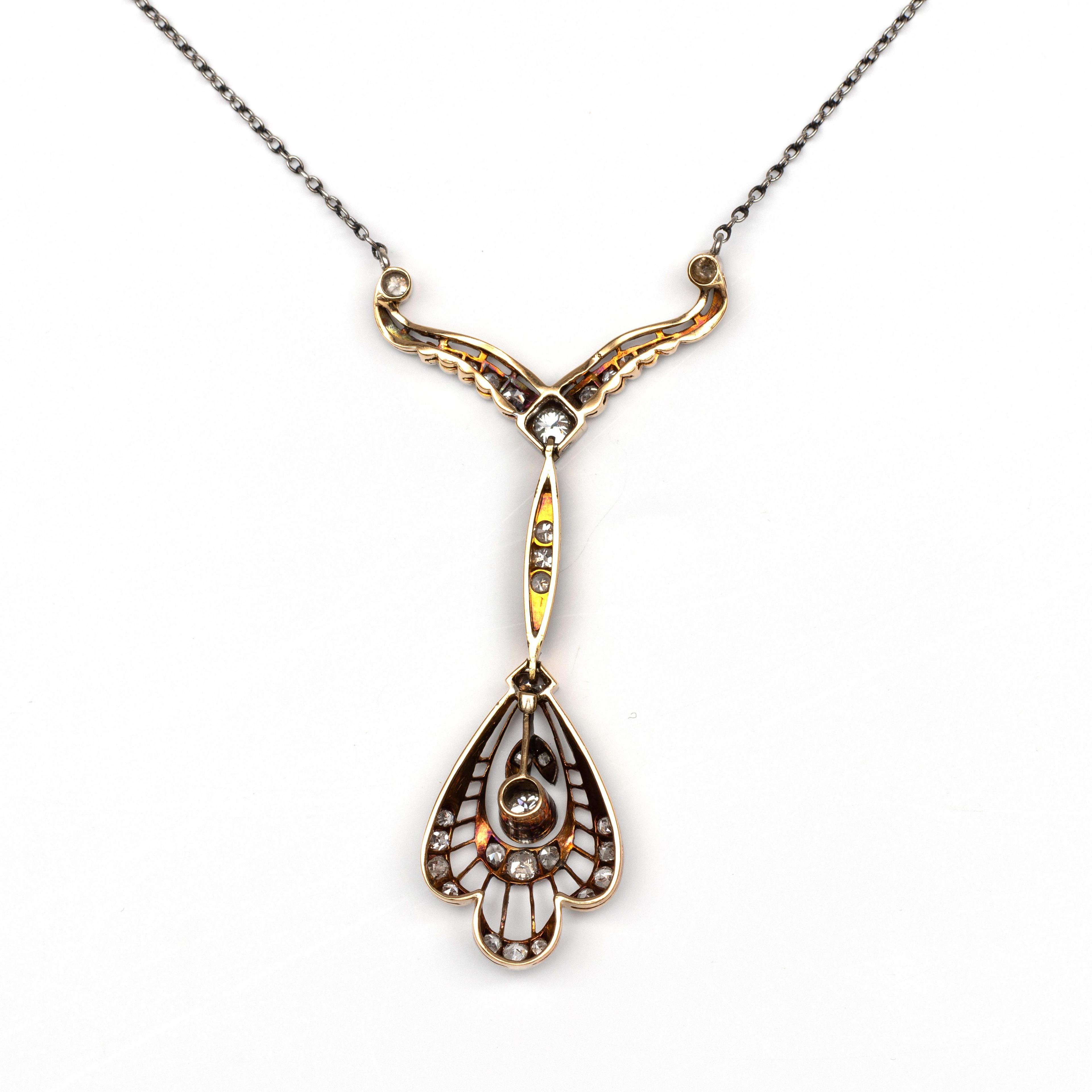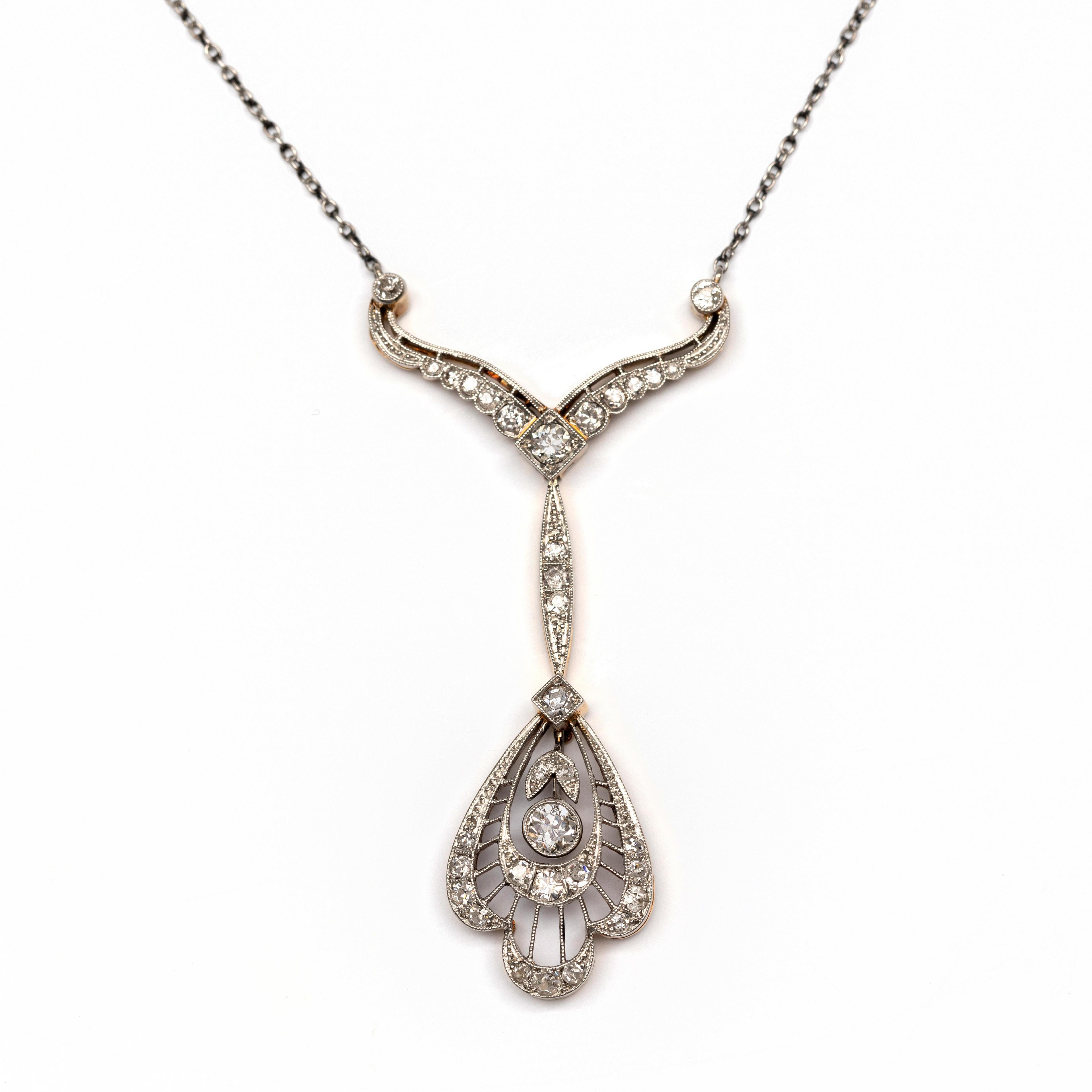 18 k. gold lavalière pendant, Belle Epoque. With a decoration of bars, an old brilliant-cut diamond with leaf motifs dangling loosely in the centre. Total diamond weight approx. 0.40 ct. On a fine white gold cable link necklace.