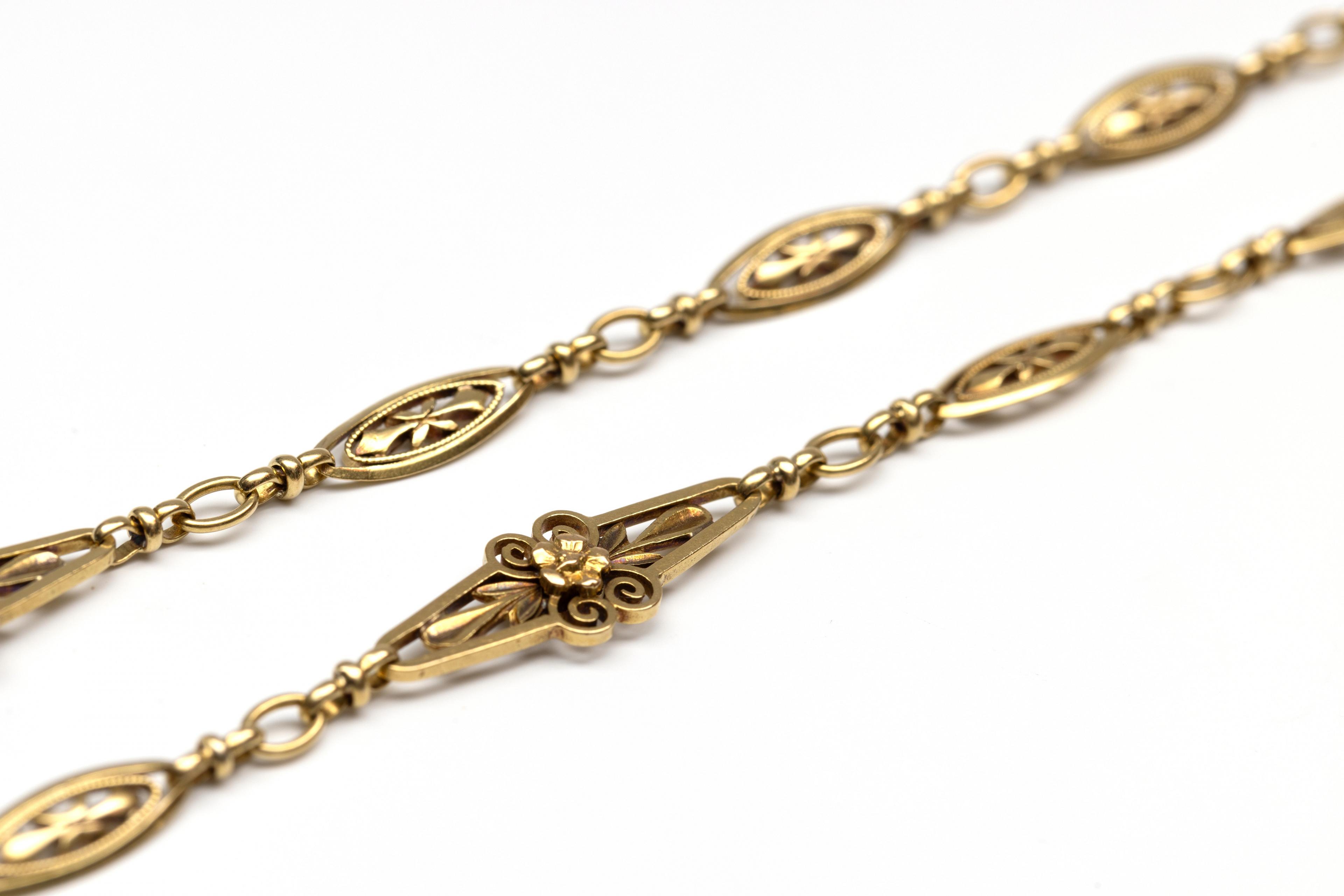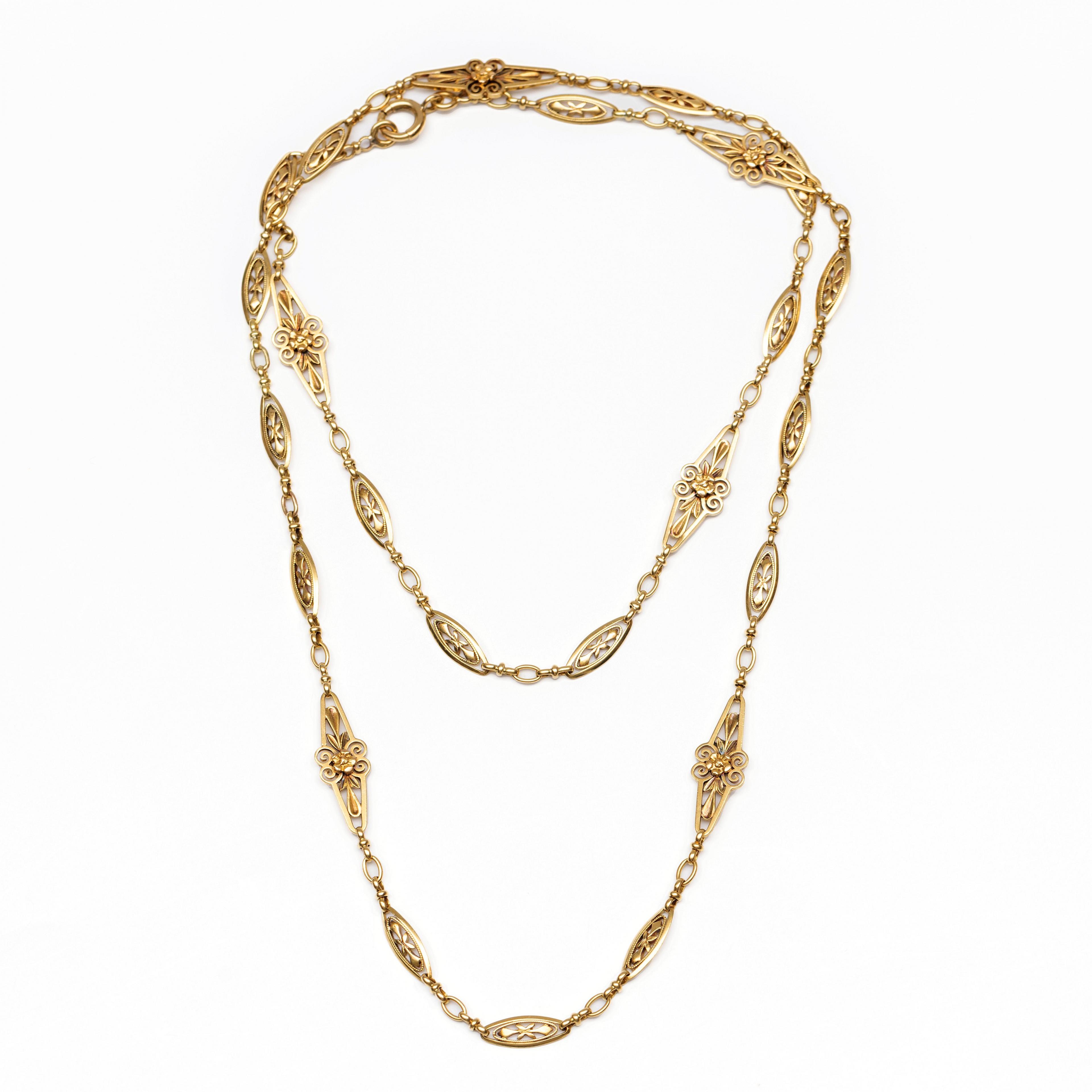 France, 18 k. gold sautoir, mid-19th century. Constructed of diamond-shaped and oval openwork links with floral and leaf motifs on both sides. Hallmarked with a horse's head for 18 k. gold 1838-1847 and a rhinoceros head for 18 k. gold chains 1838-1847, and a bigorne mark on the other side.