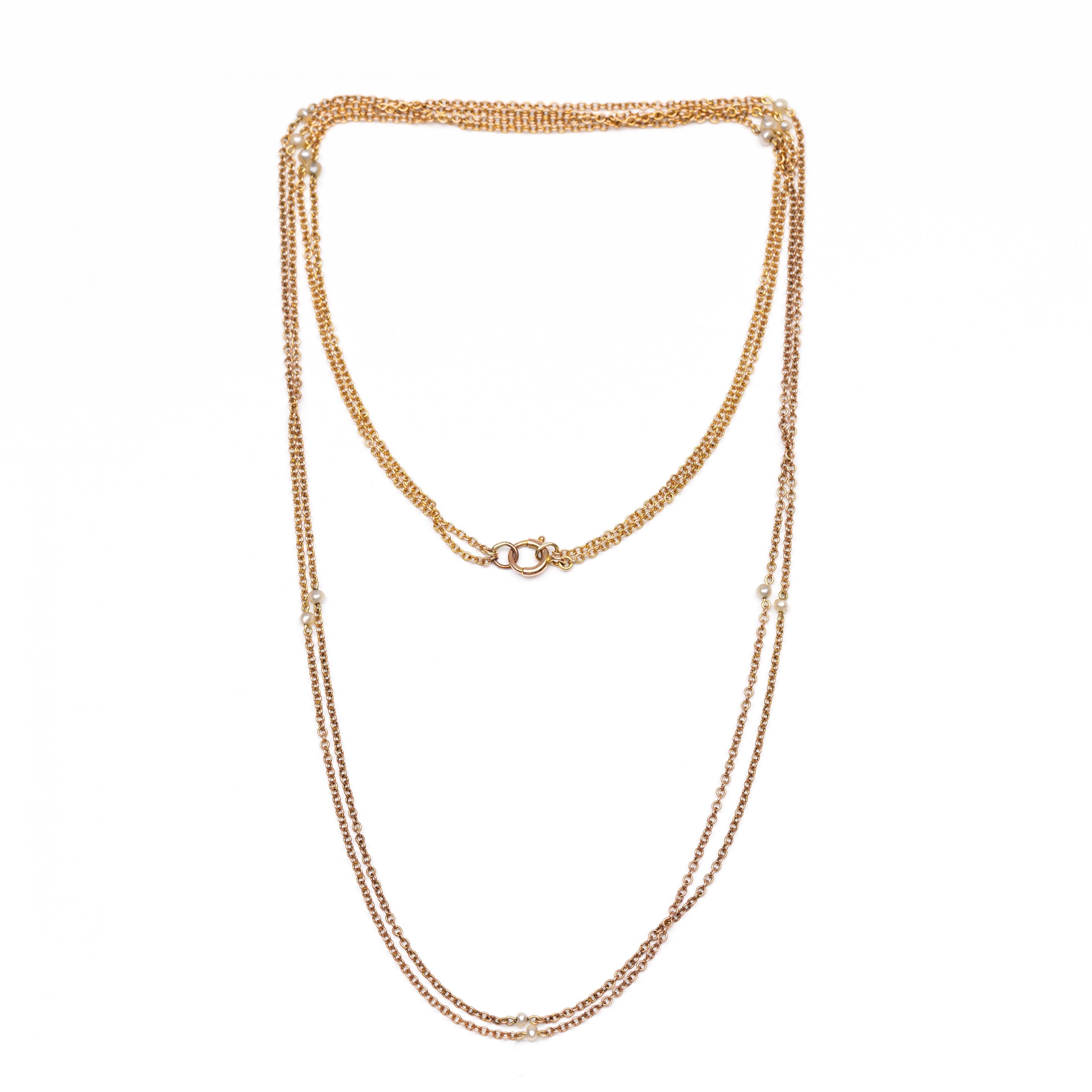 Long, below legal gold alloy necklace. Constructed of a delicate cable link, with a pearl every 9 cm. It has a loop halfway along the chain, allowing the necklace to be easily worn double.
