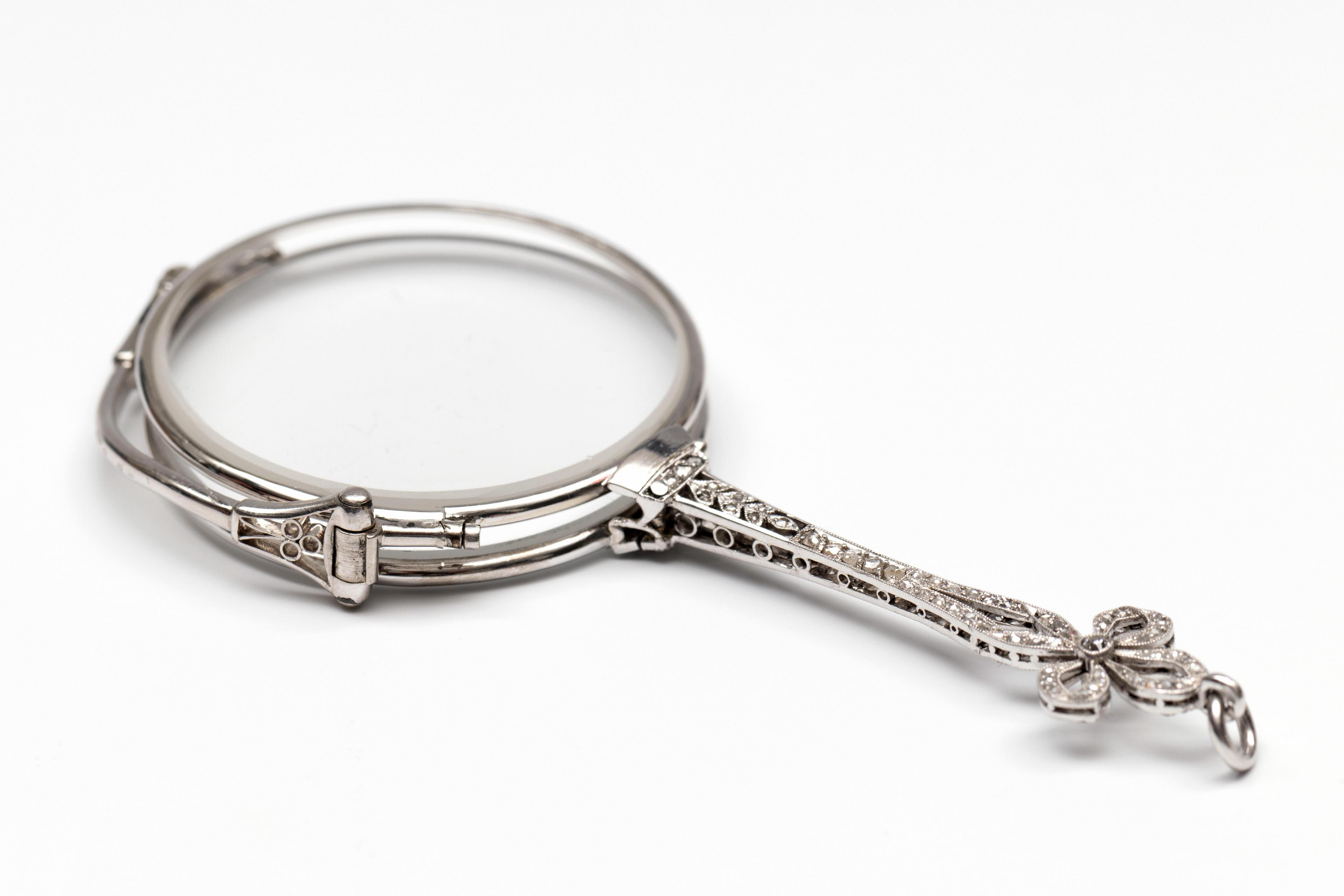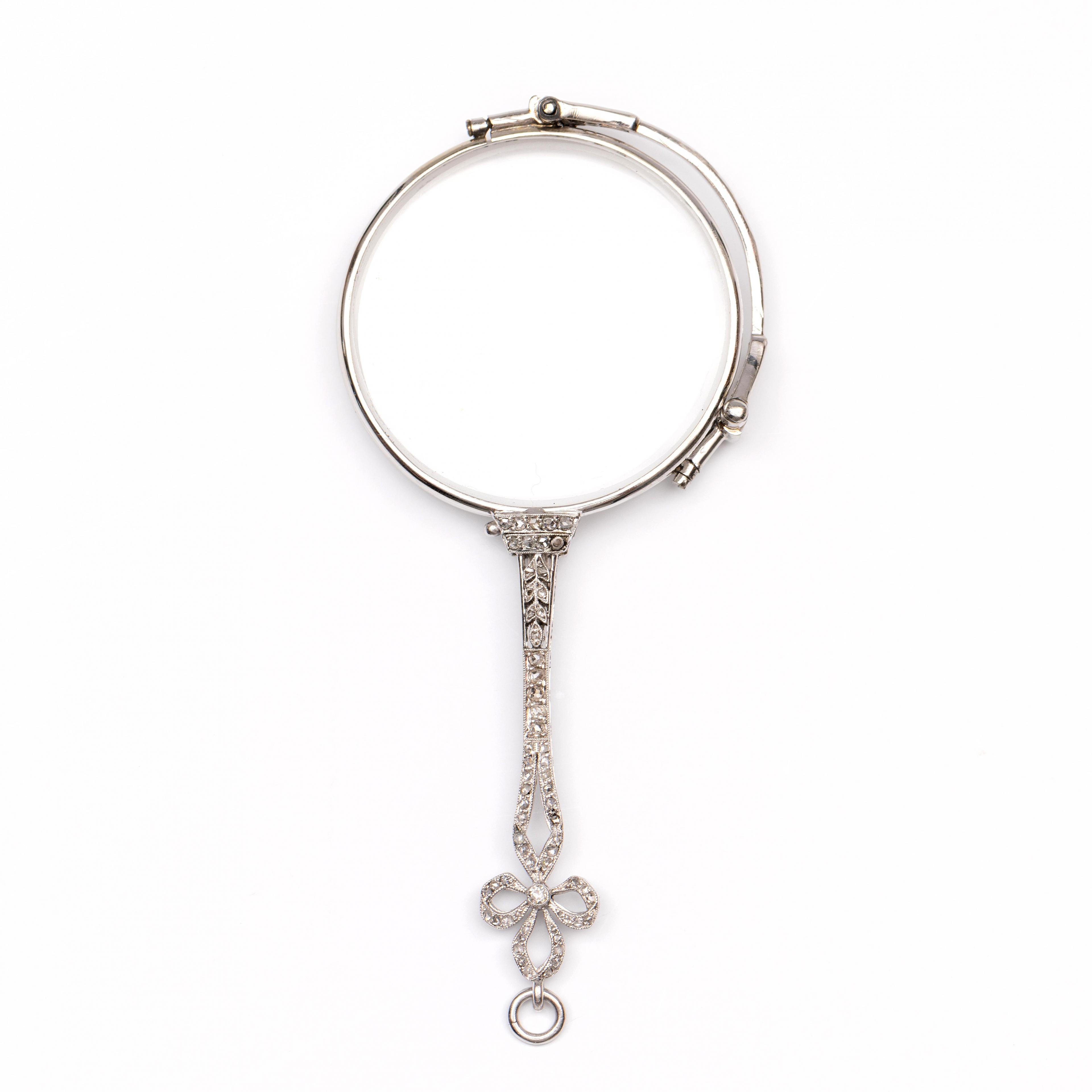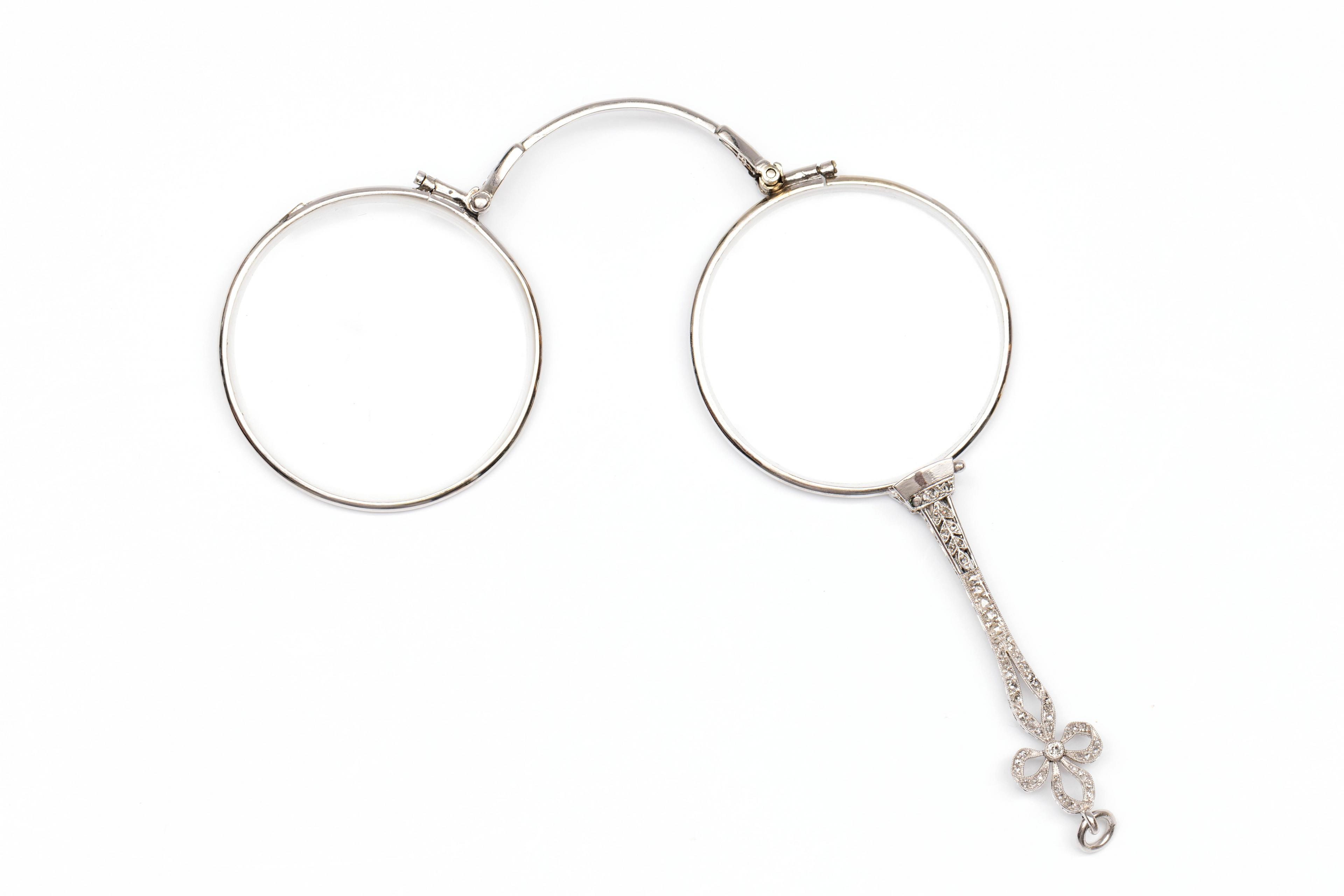 France, Platinum lorgnette, Belle Epoque. Decorated with a bow and leaf motifs, set with fine rose-cut diamonds. The maker's mark illegible.