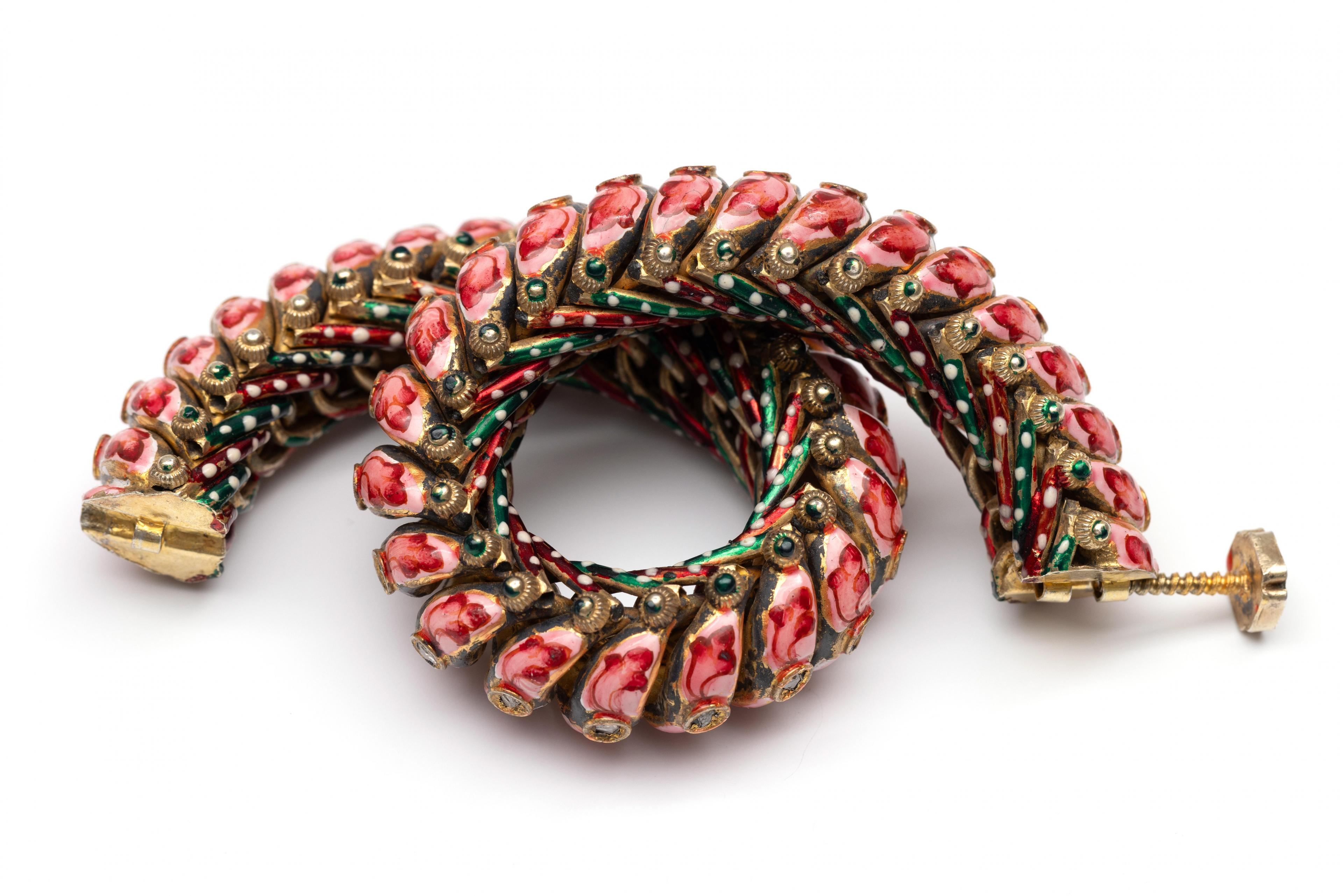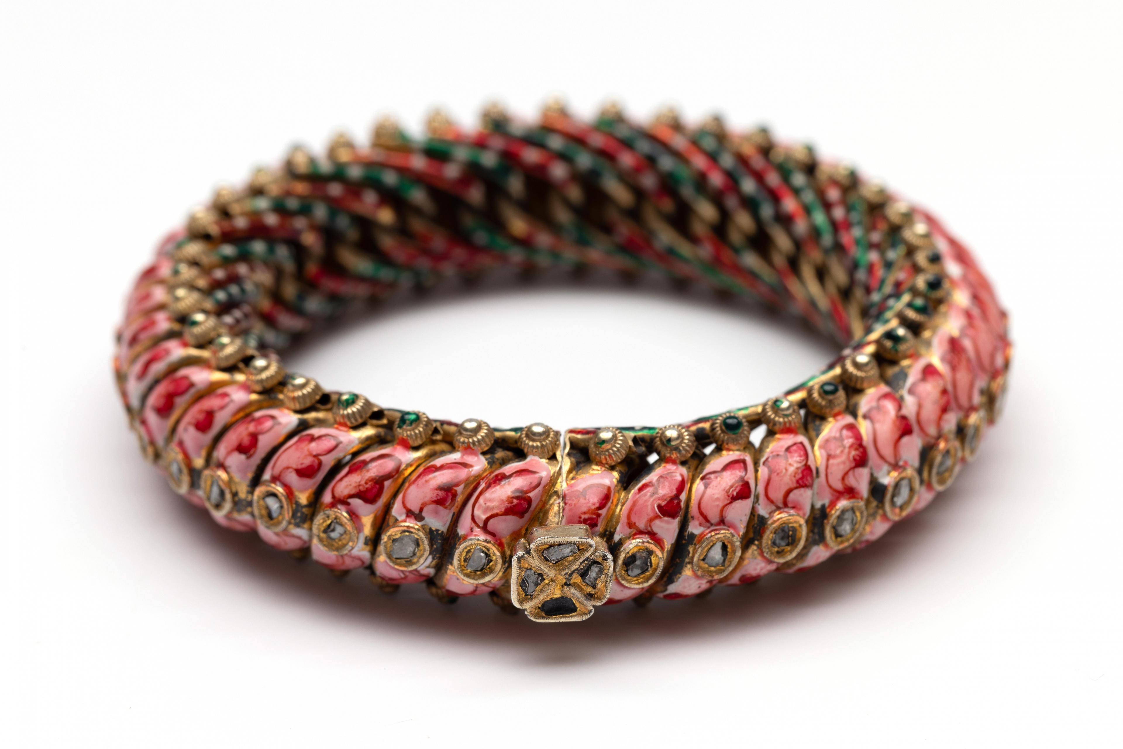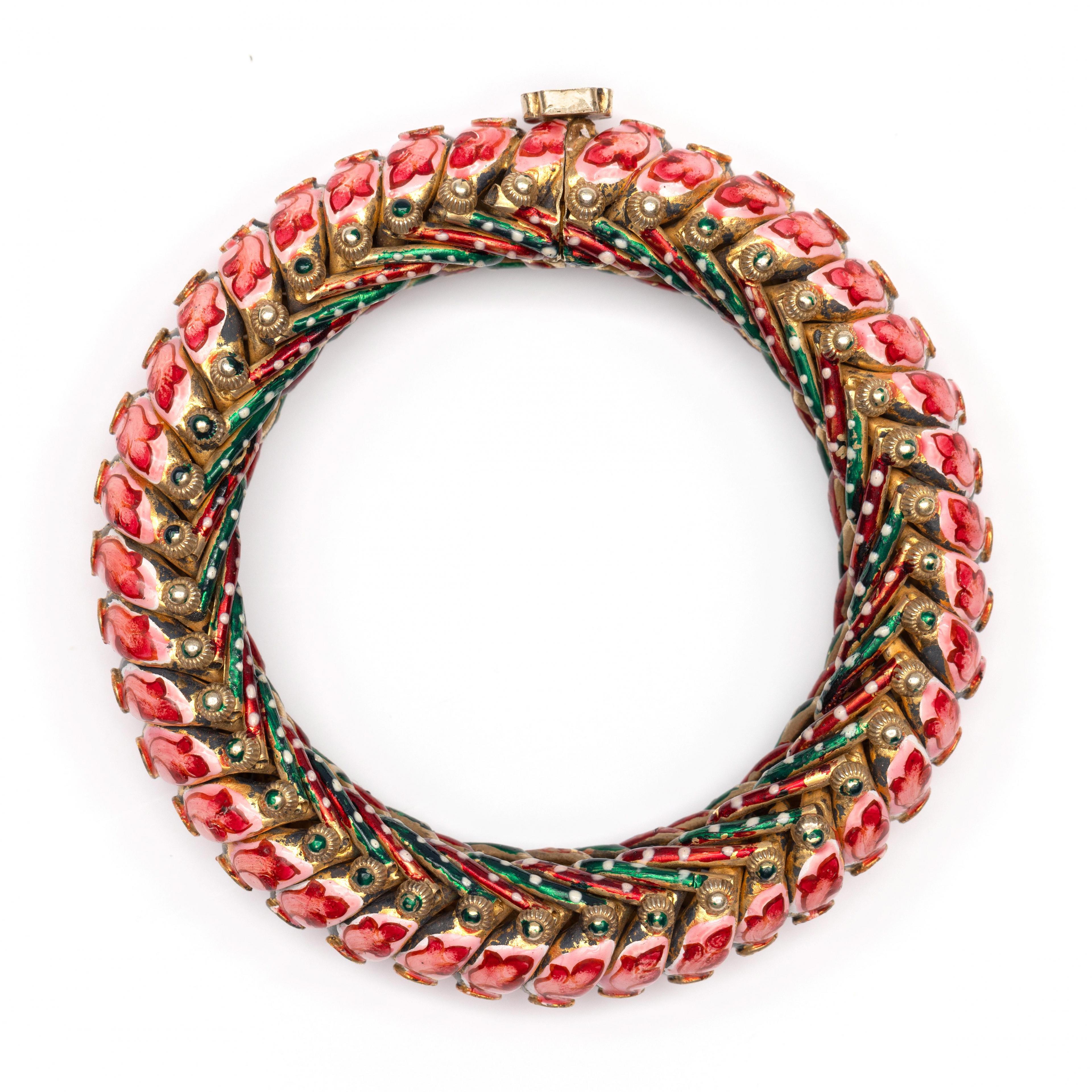 India, silver-plated bracelet, made of wavy links. The top link is decorated with pink enamel featuring a red leaf motif, and a chaton set with a rose-cut white sapphire. The bottom links are alternately decorated with red and green enamel, finished with white dots. The sides are decorated with knots. The screw-on clasp is in the shape of a flower.