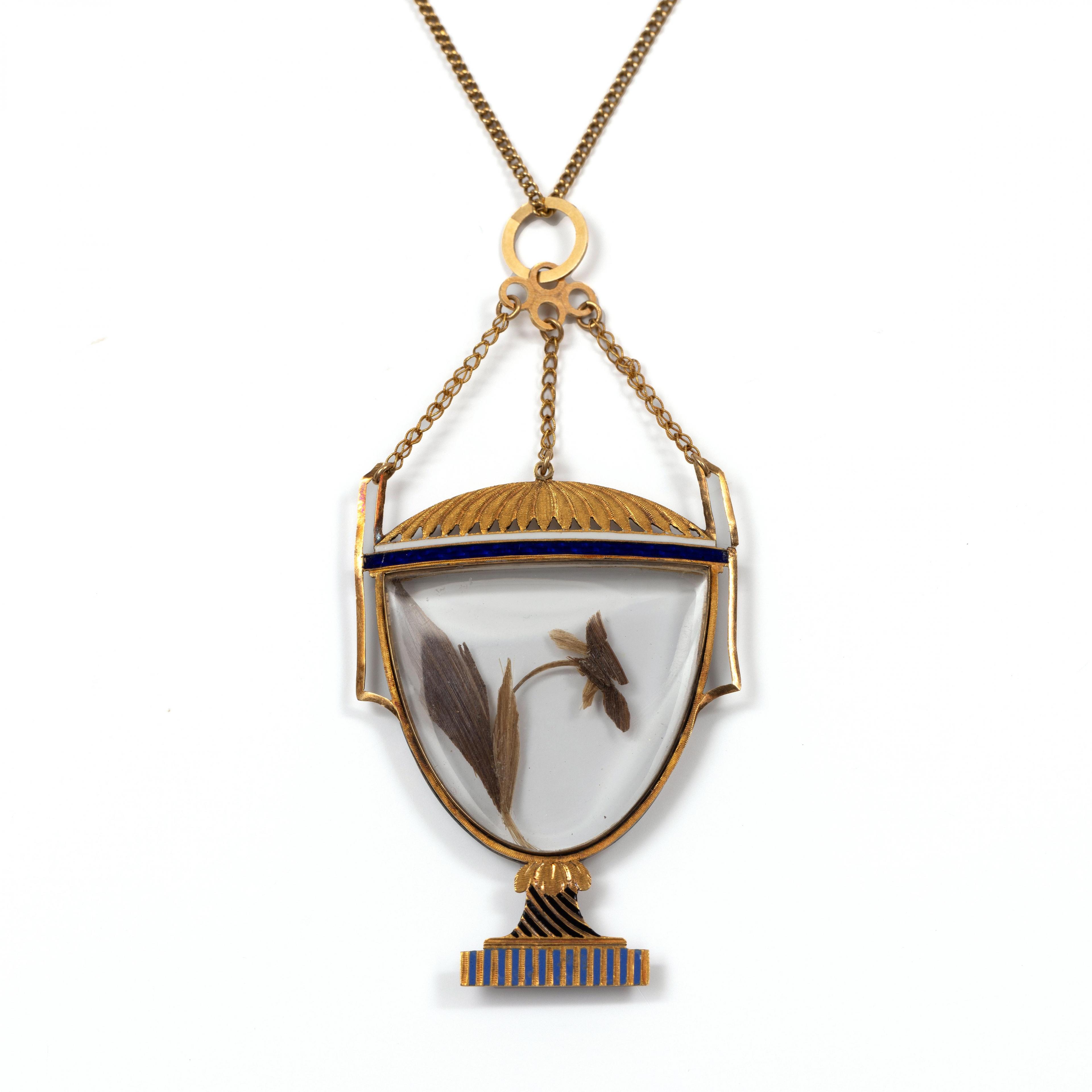 In de vorm van een urn. Het middengedeelte van glas waartussen een haarwerk in de vorm van een viooltje. De urn afgezet met zwart, blauw en wit email. Aan een 14 kt. gouden gourmetschakel collier
