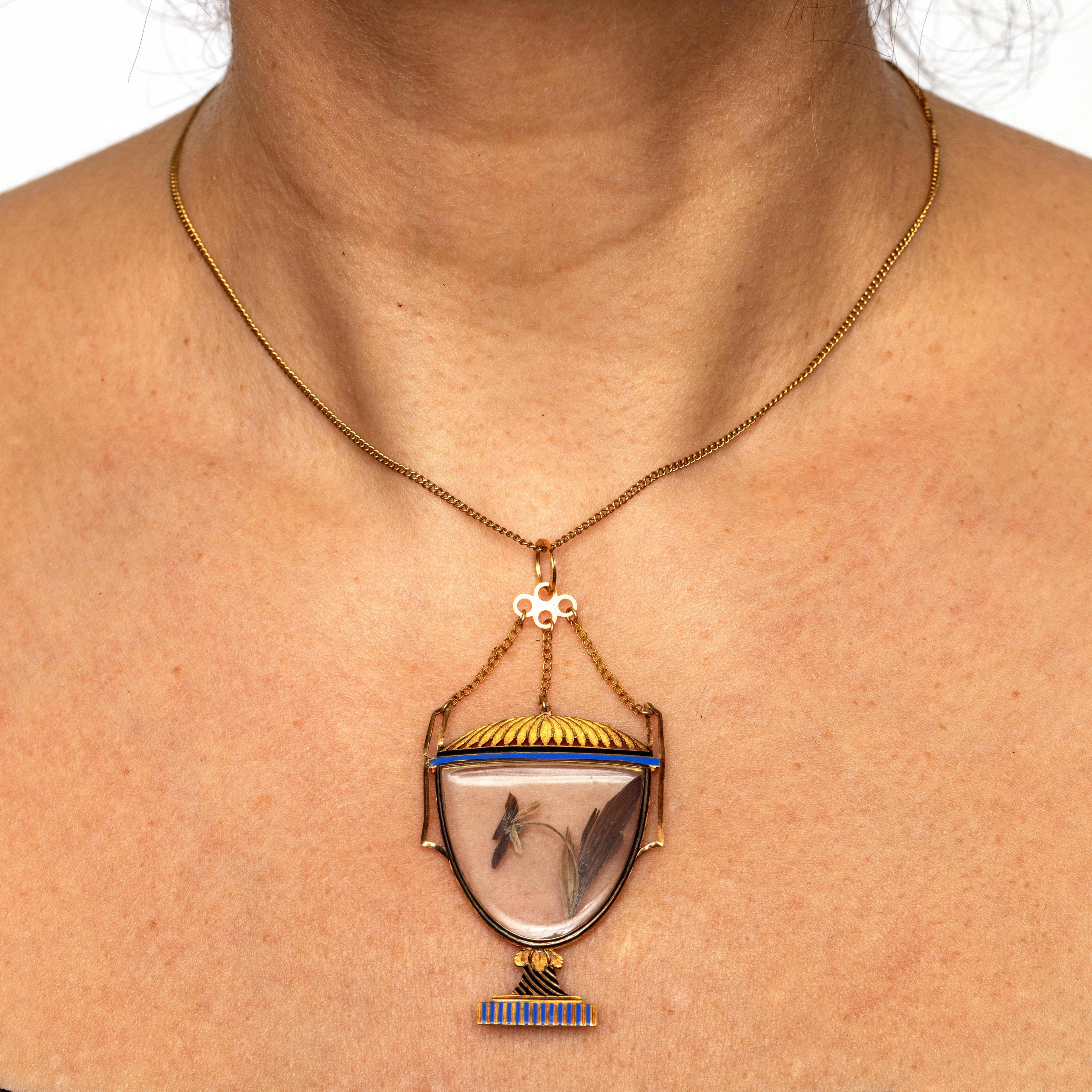 18 k. gold pendant, circa 1800. In the shape of an urn. The center is made of glass, with a hairwork in the shape of a pansy. The urn is trimmed with black, blue, and white enamel. Attached to a 14 k. gold curb link necklace.
