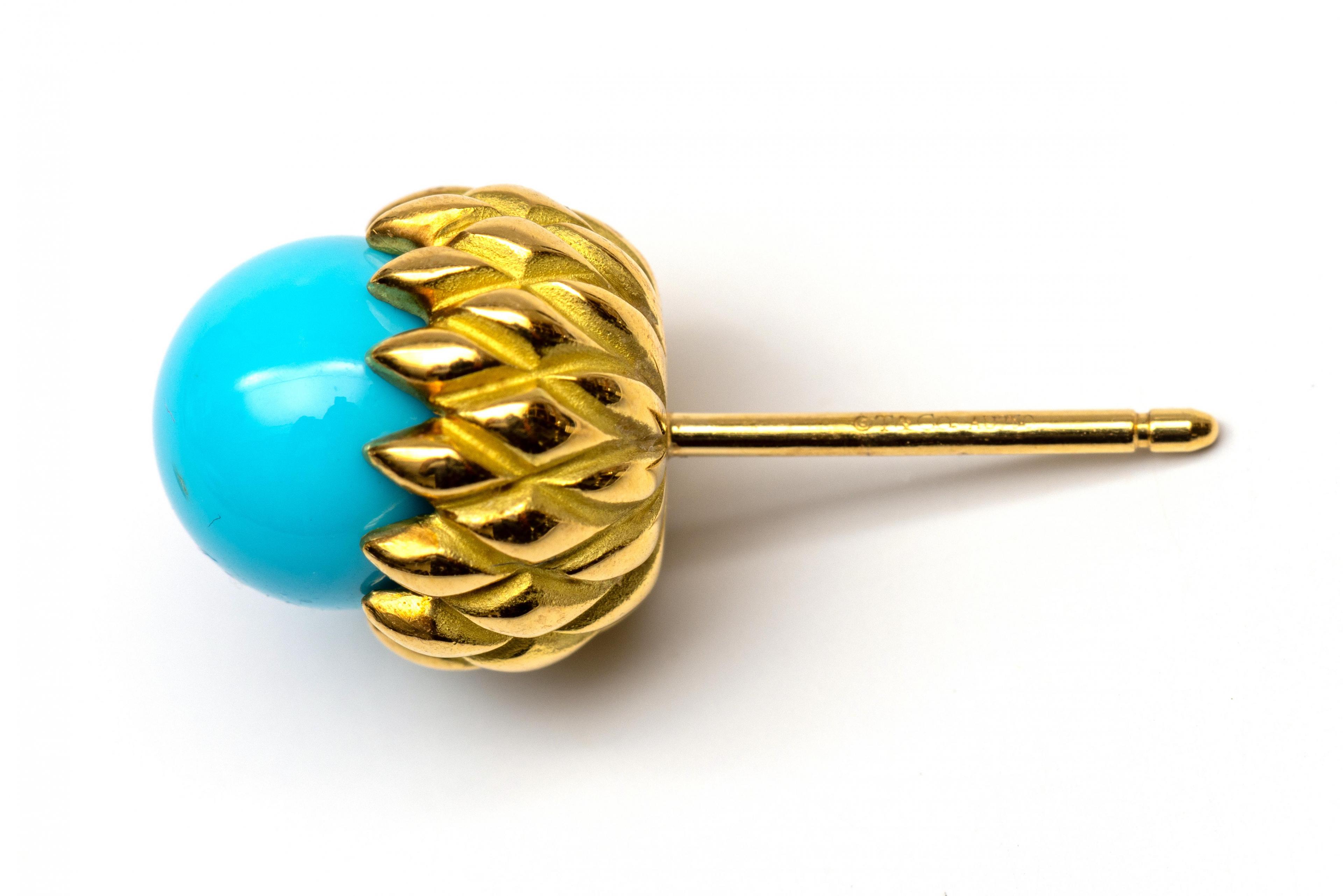 Tiffany & Co. 18 k. gold stud earrings. Designed by Schlumberger. Shaped like a stylized acorn, set with a turquoise (7.5 mm diameter). The stud is signed T & Co. Comes with a box, pouch, and outer box.