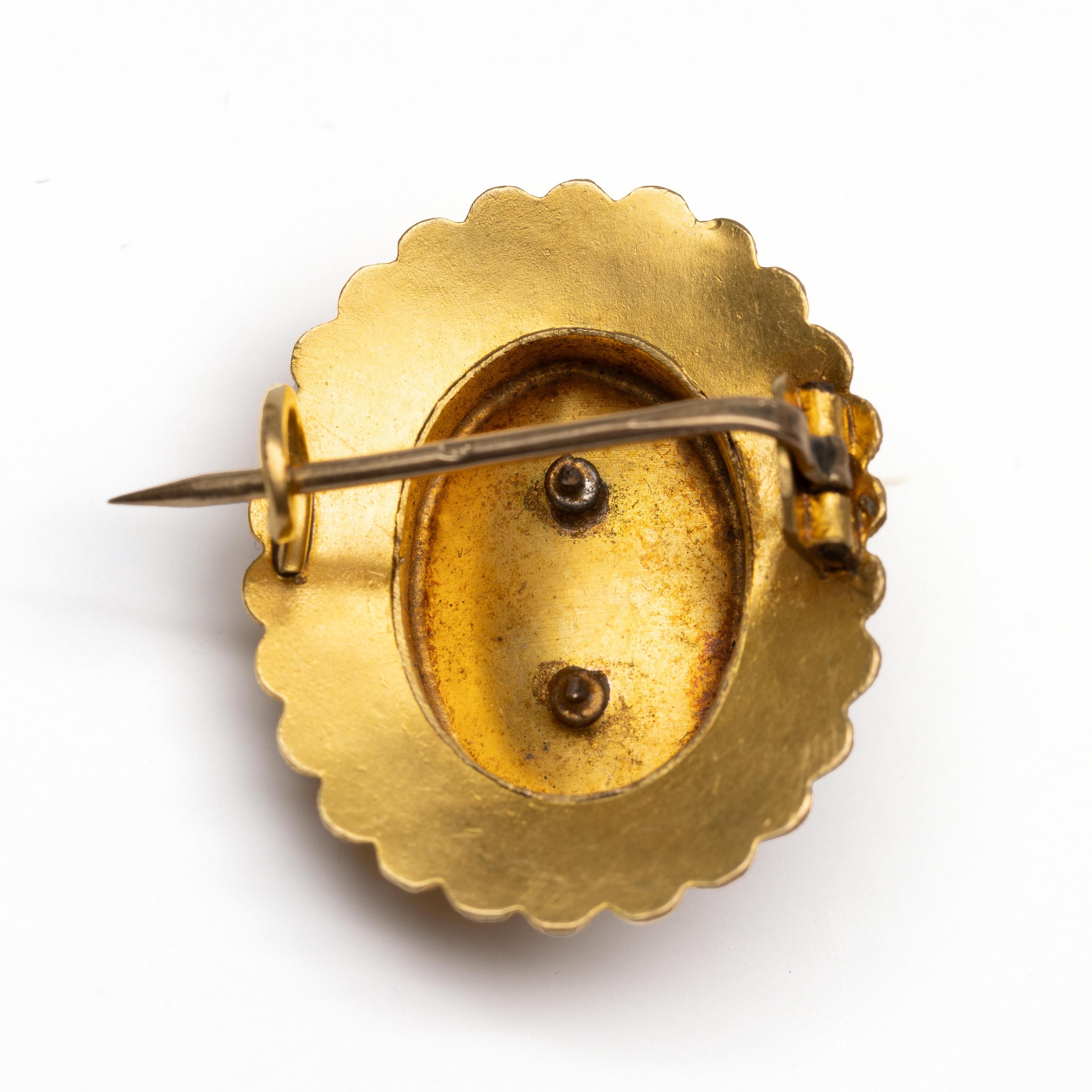 14 k. gold brooch, 19th century. With a silver appliqué set with rose-cut diamonds in the centre. The bezel decorated with filigree.