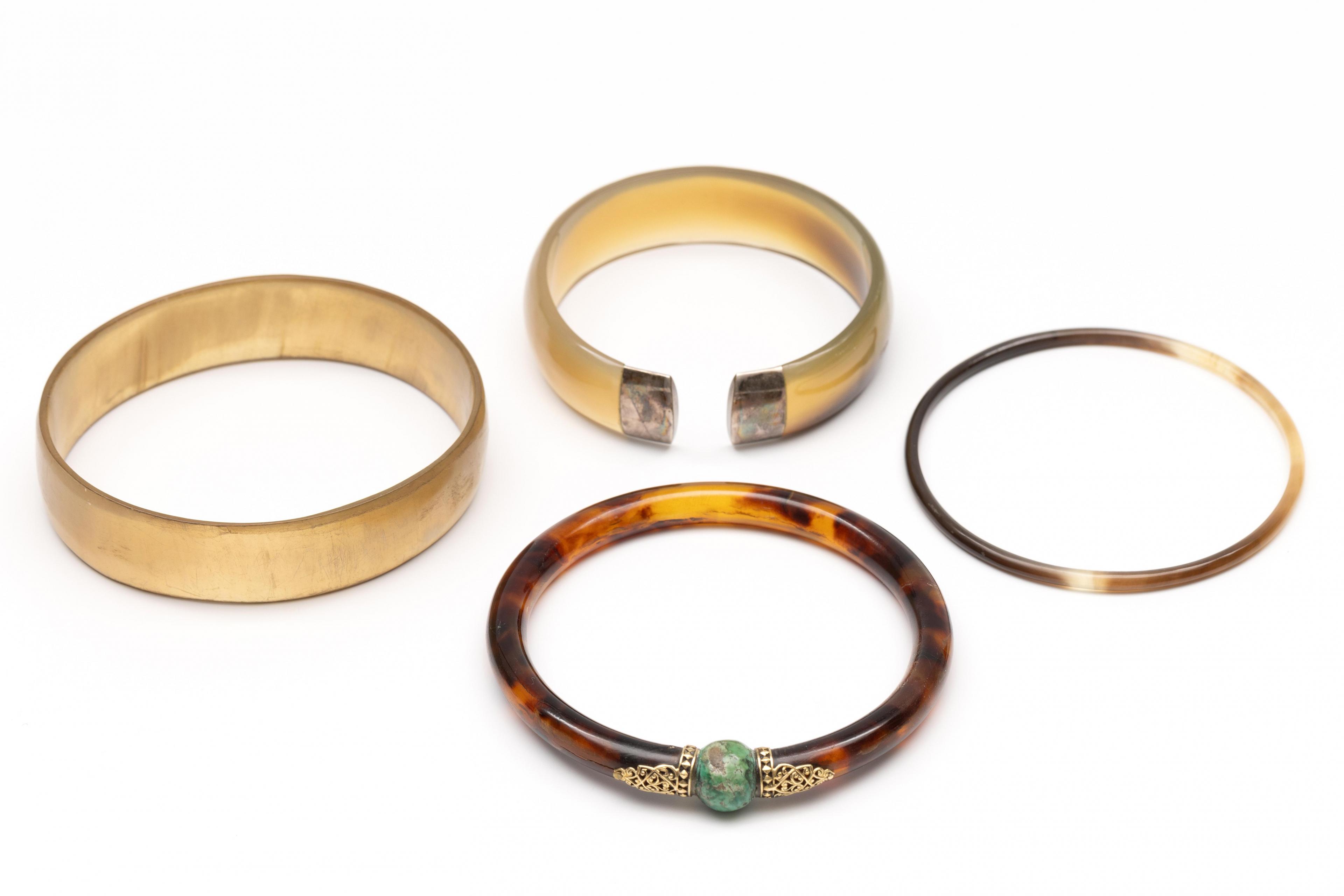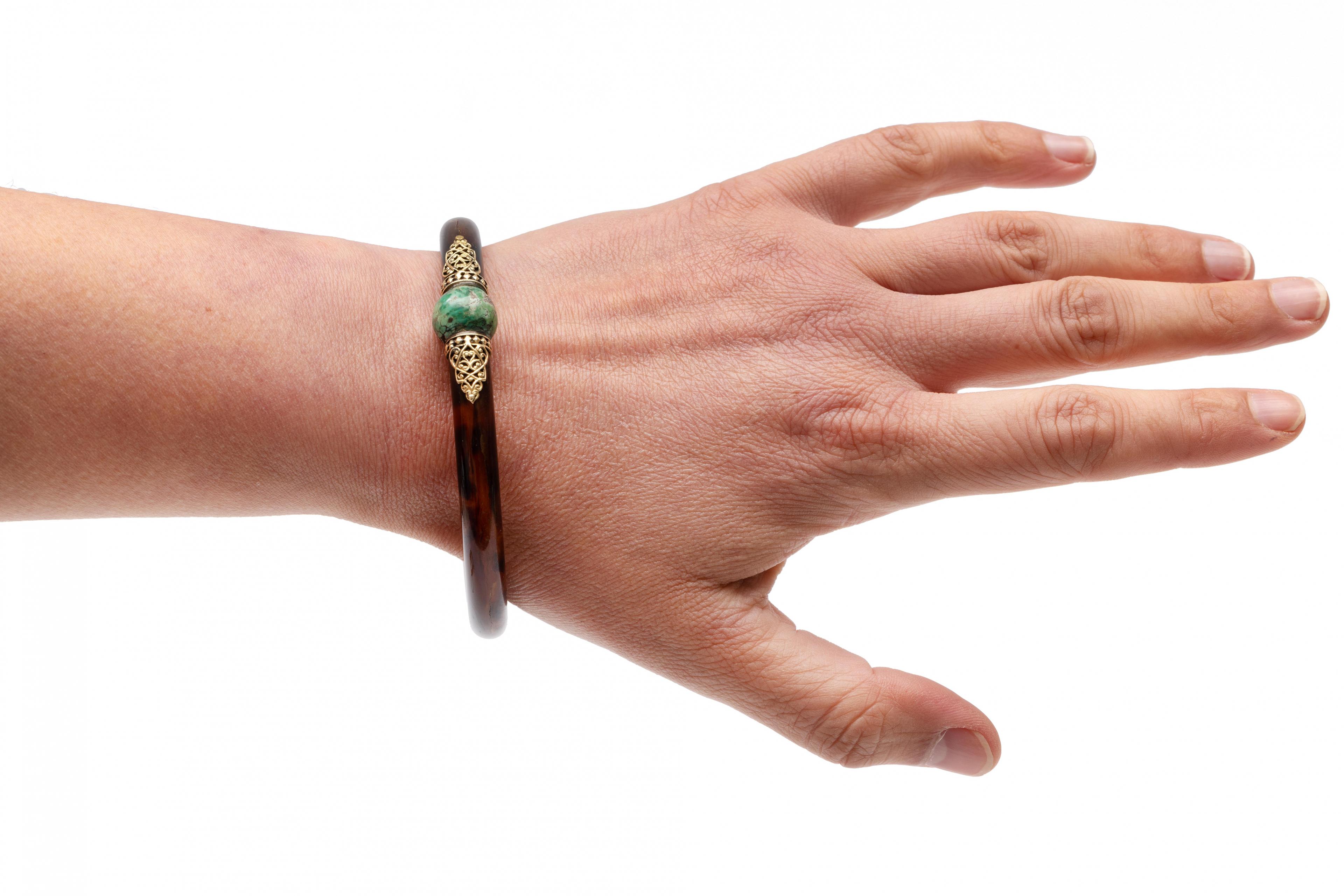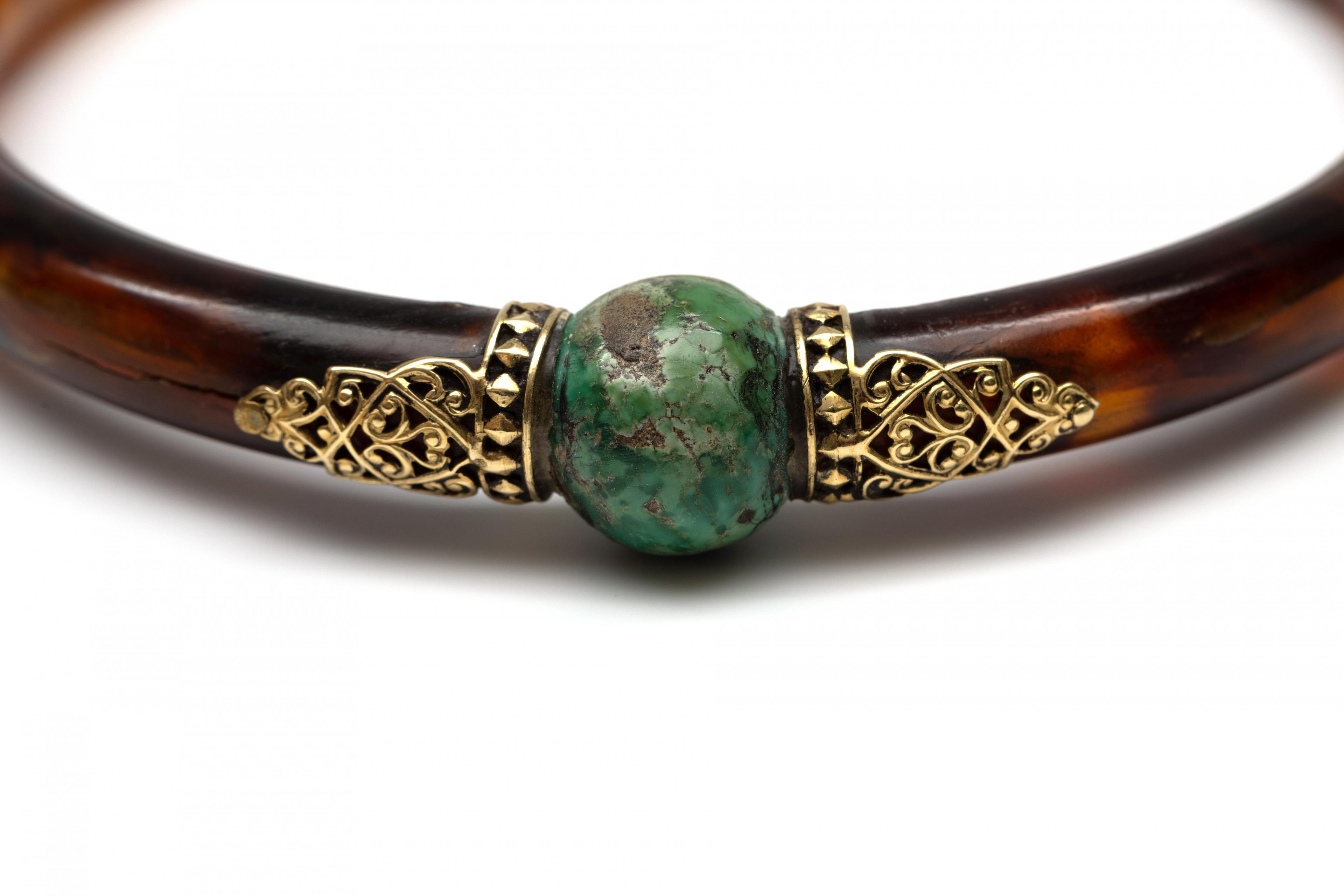 Faux tortoise bangle. WIth a round turquoise in the centre, flanked by a 14-karat gold appliqué of curls on either side. Herewith three horn bangles, one with silver hardware.
