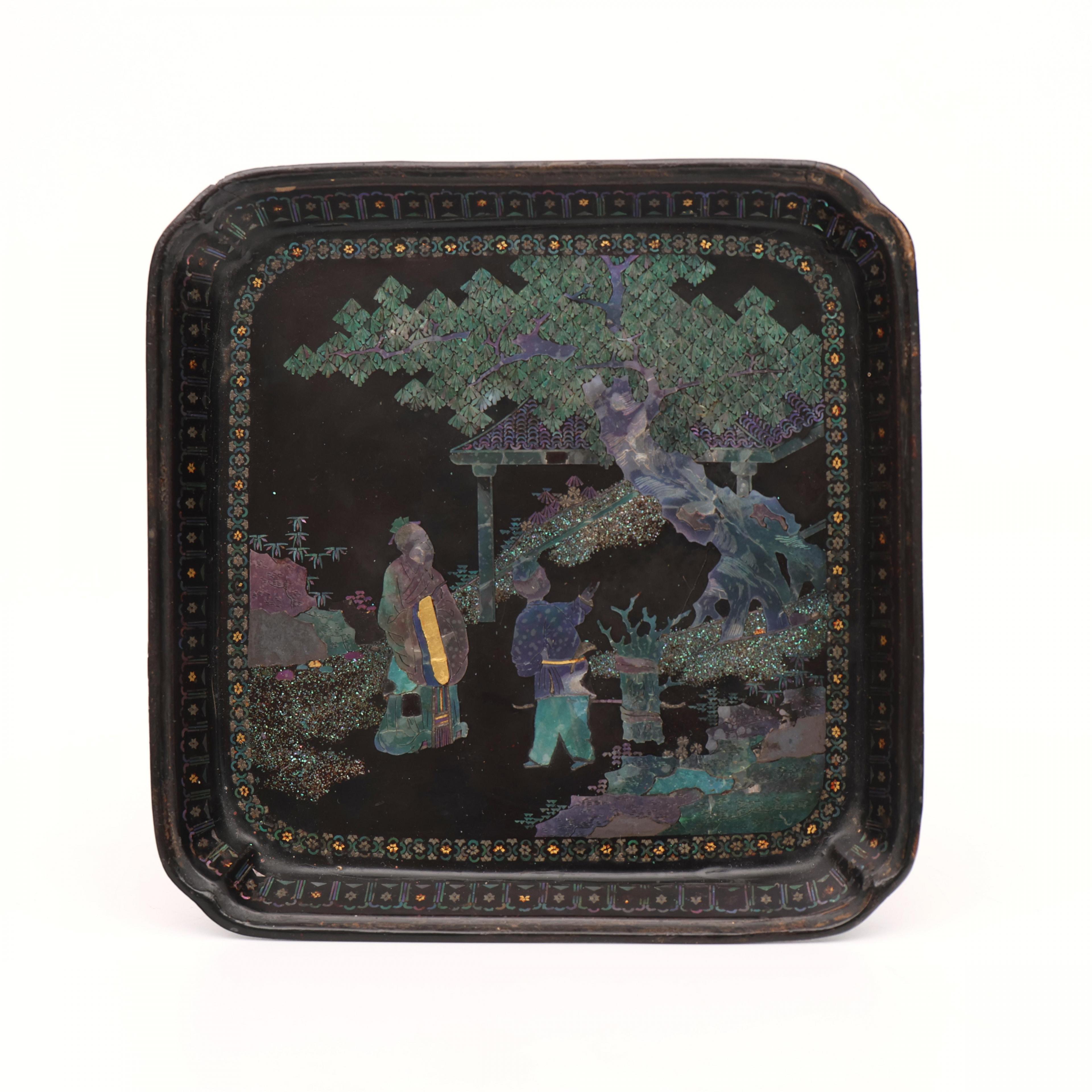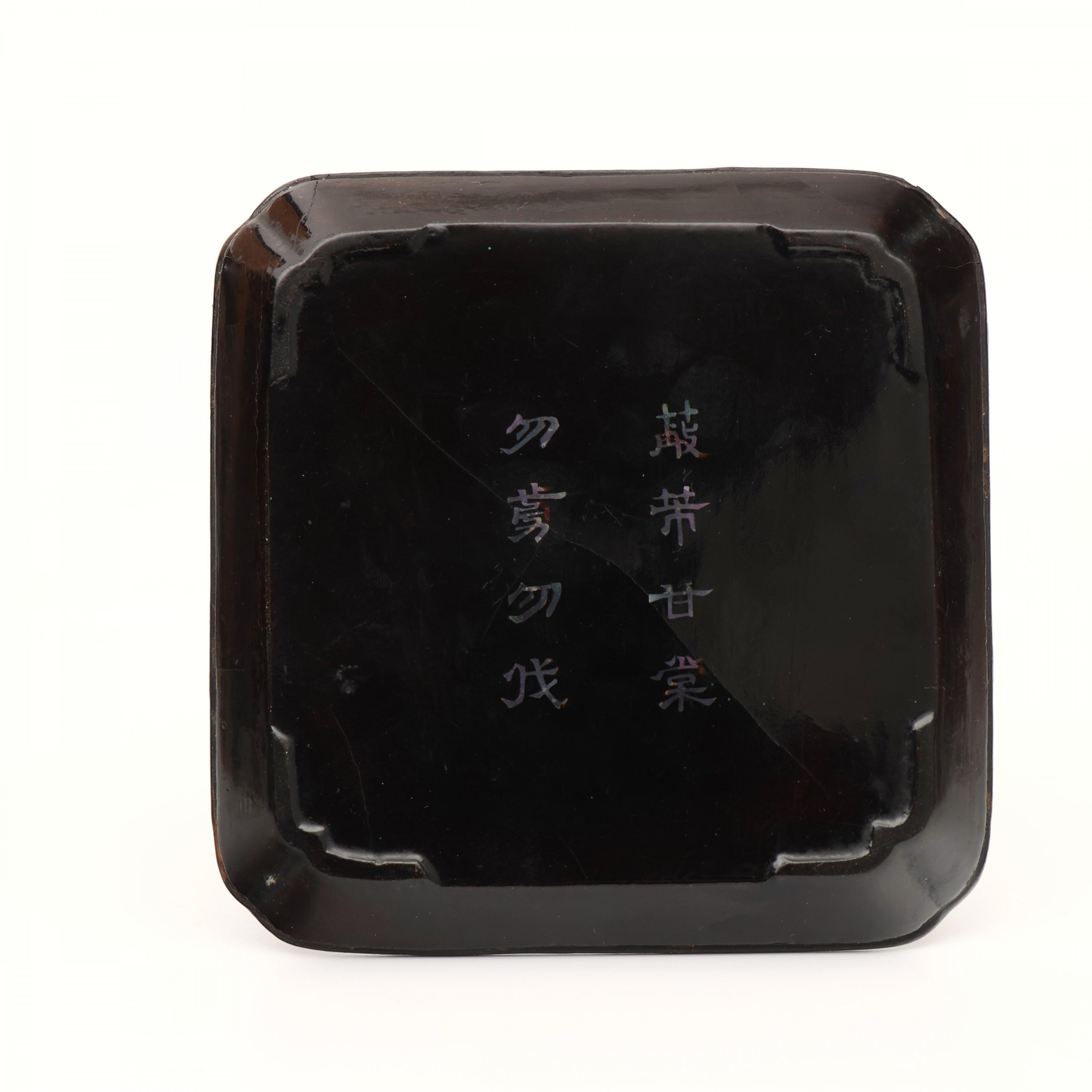 the square dish inlaid with a scholar and a boy approaching a pavilion, the reverse inscribed with eight characters (some cracks to the lacquer, some small losses to inlays)