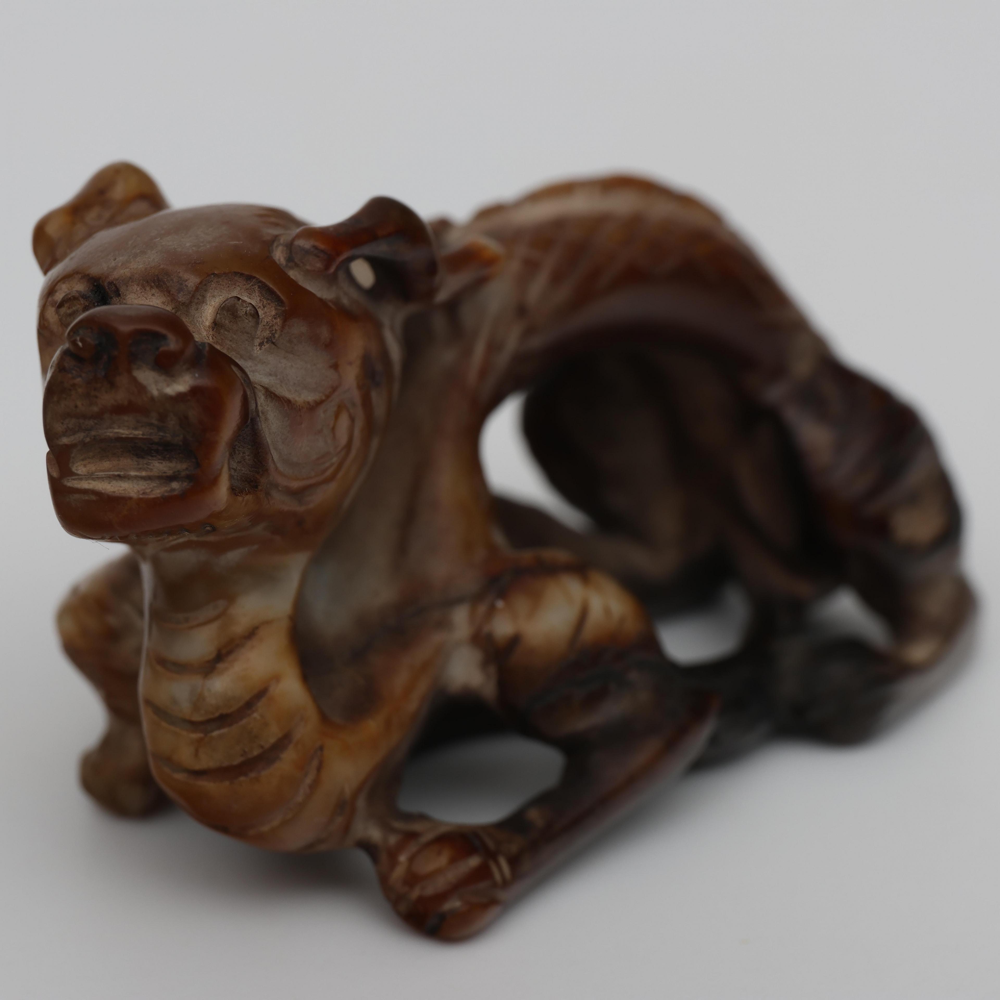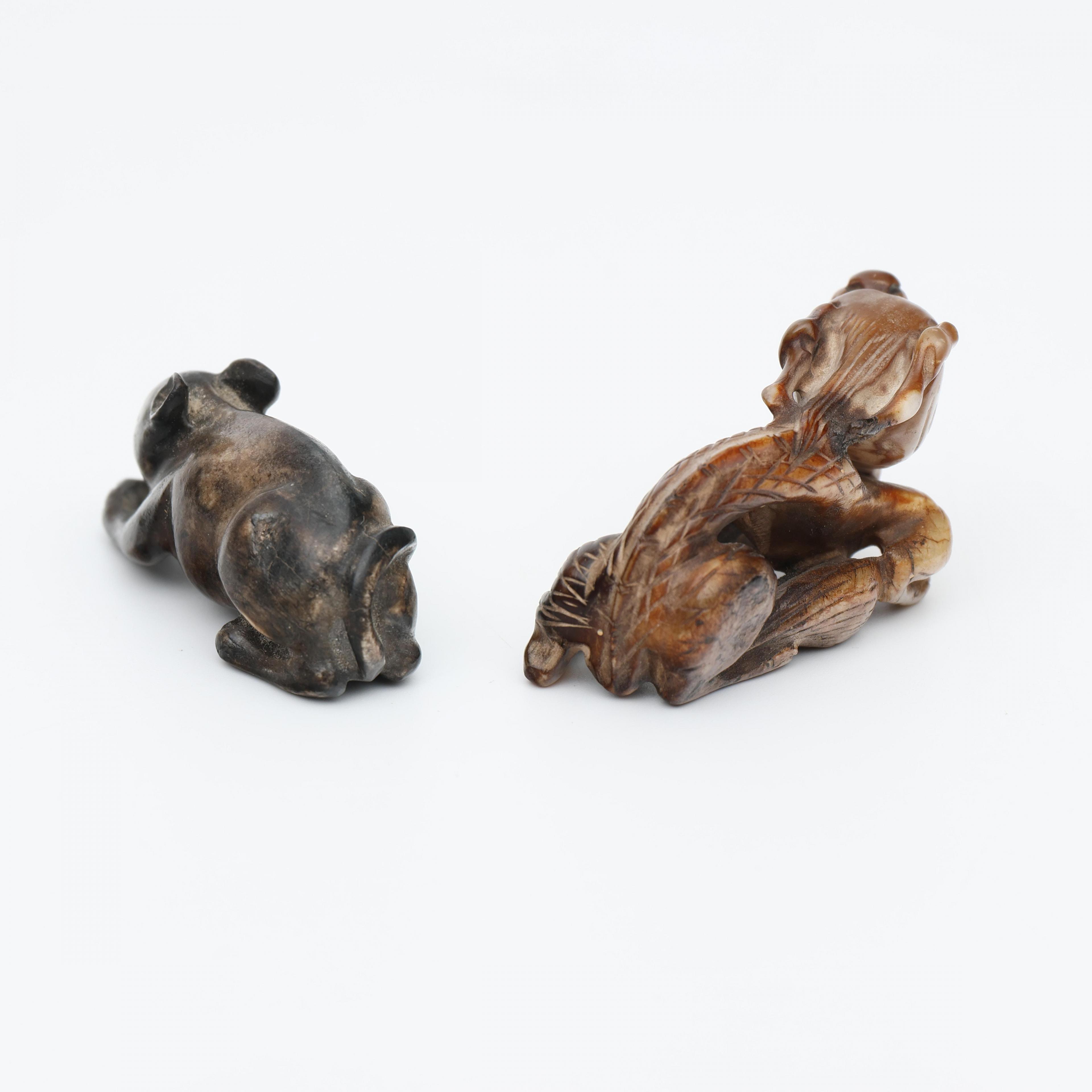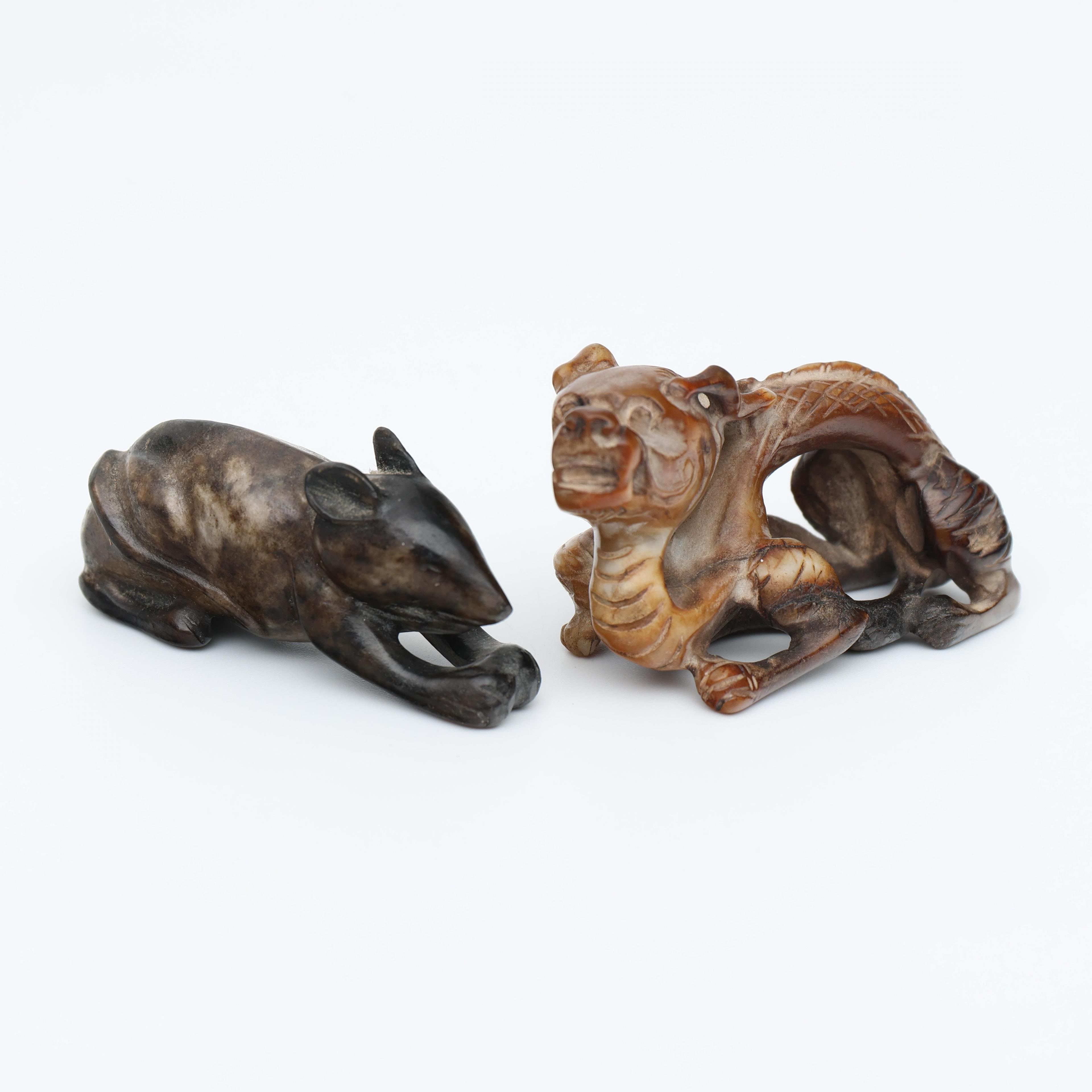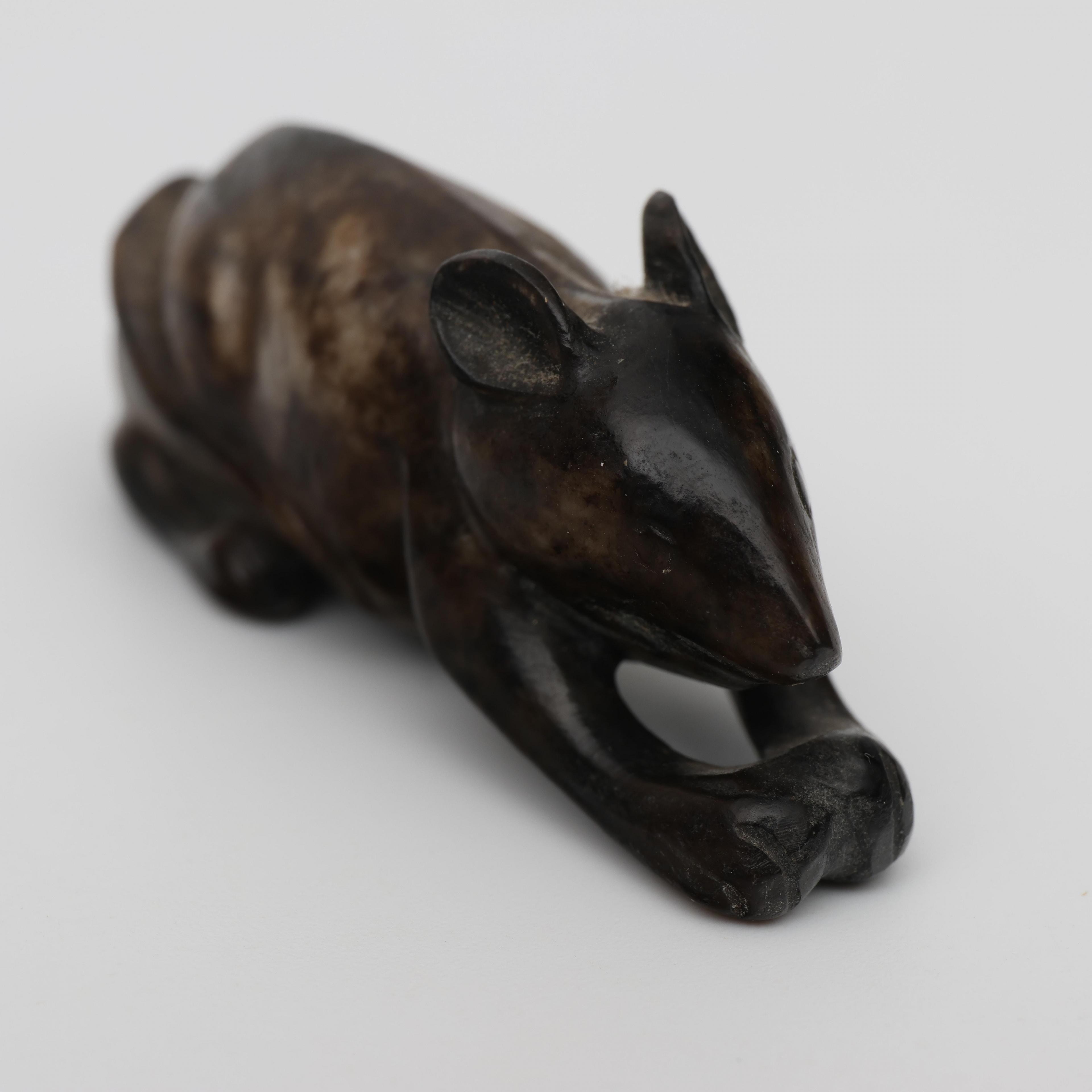 in crouching position, the stone altered to cream and brown tones, together with a hardstone carving of a rat (some wear as expected)