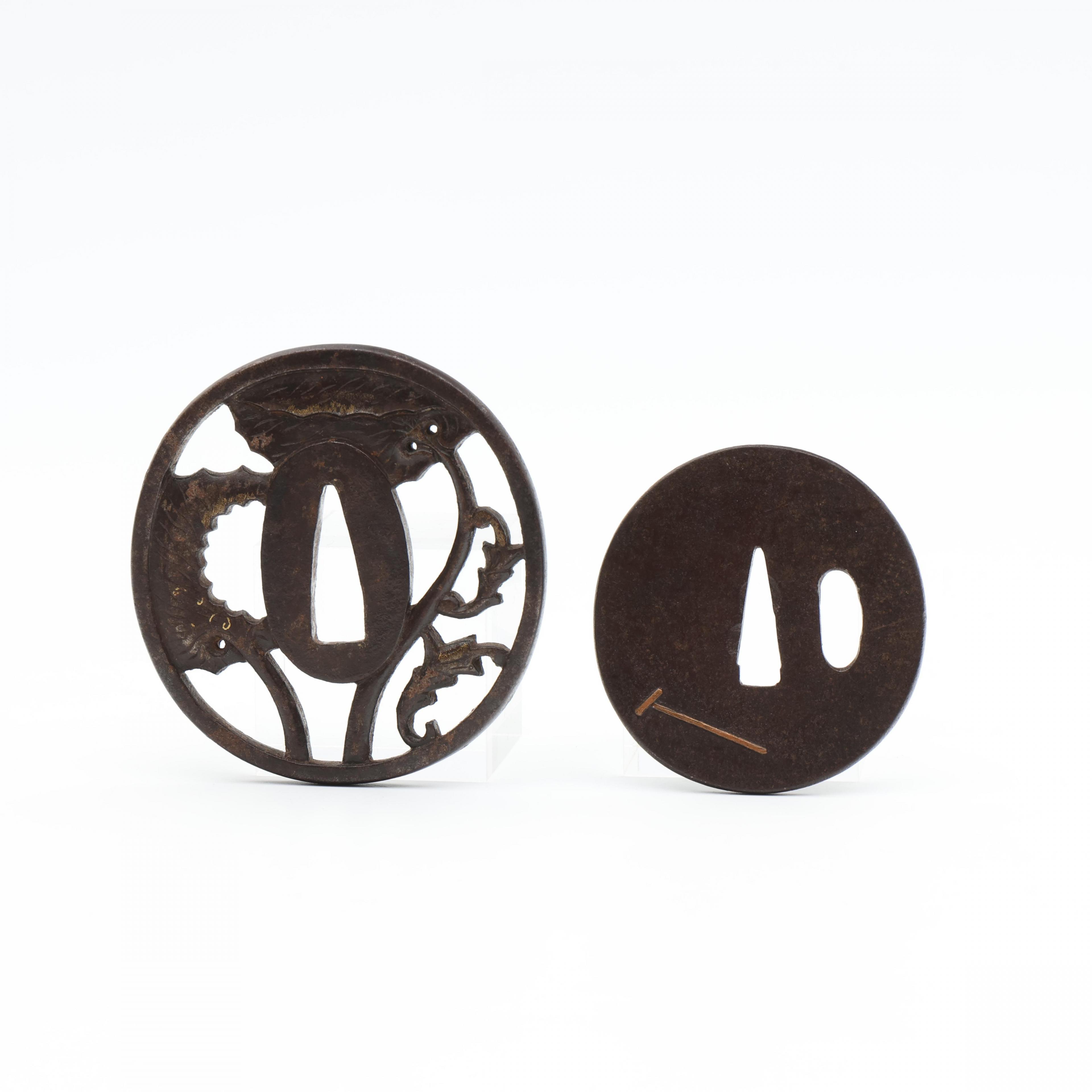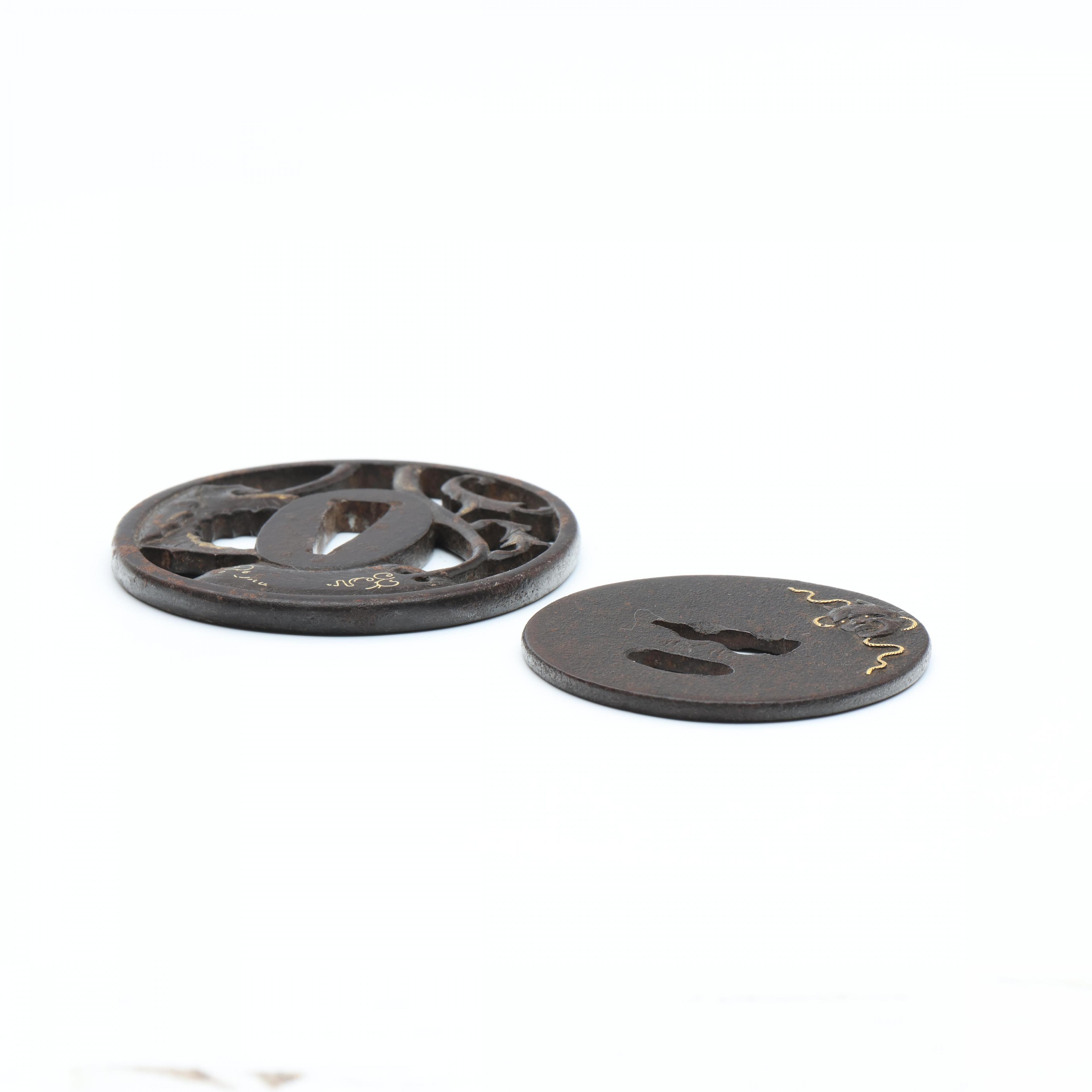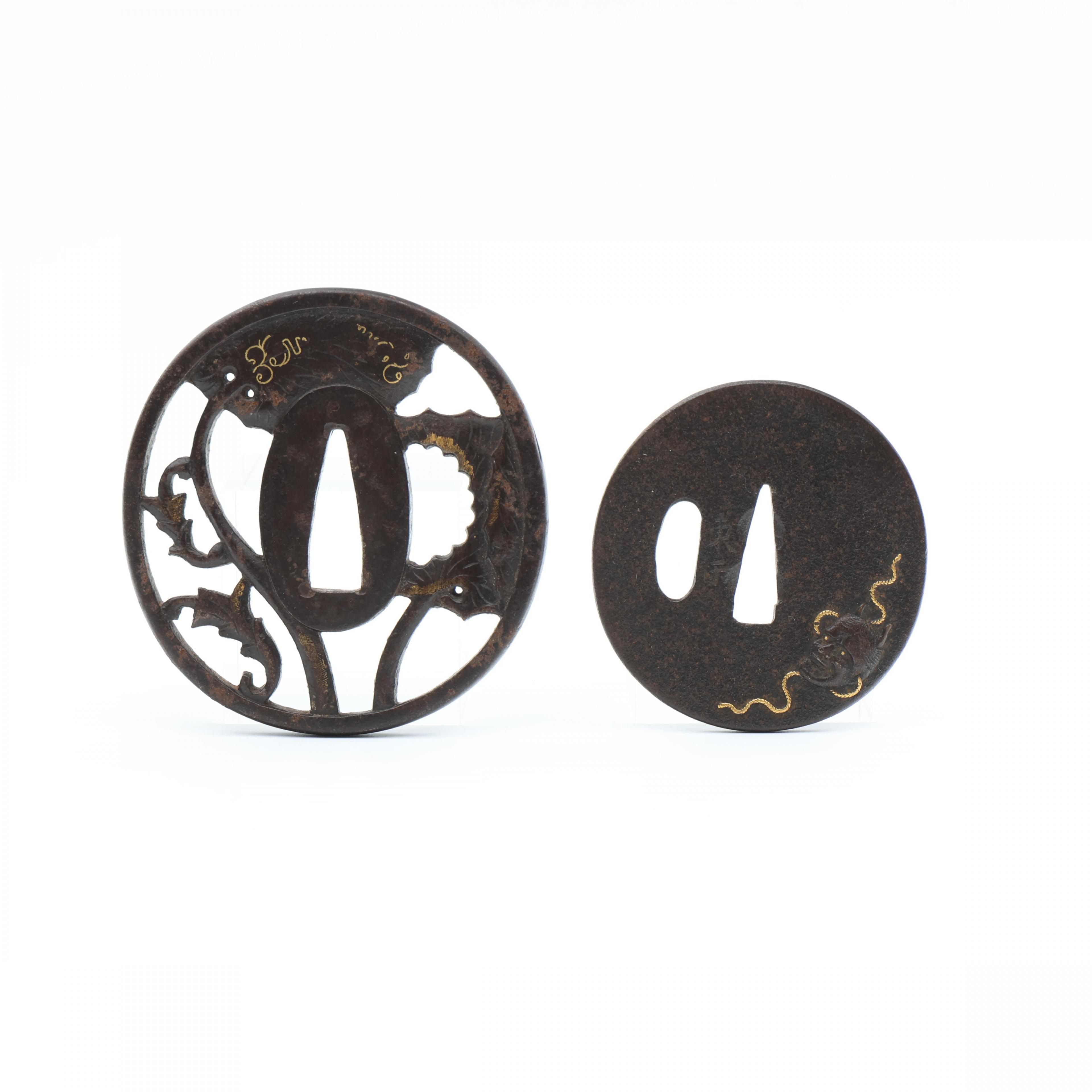 one with leaves and the other with mask, signed Tōu, both with gilt detailing (some wear)