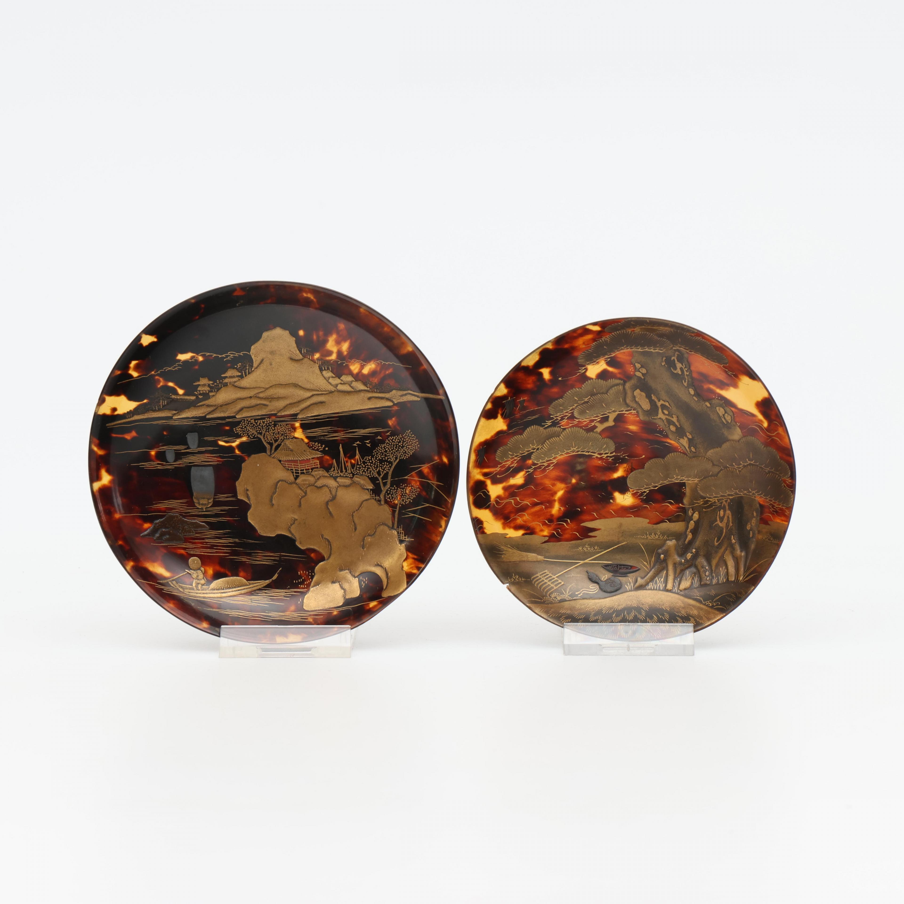 one decorated in gold and silver takamakie with a mountainous riverscape, signed Manshu, and the other in gold takamakie and togidashi makie with farmer's utensils beside a pine tree, signed Shokusai (the latter with some damage to the rim)