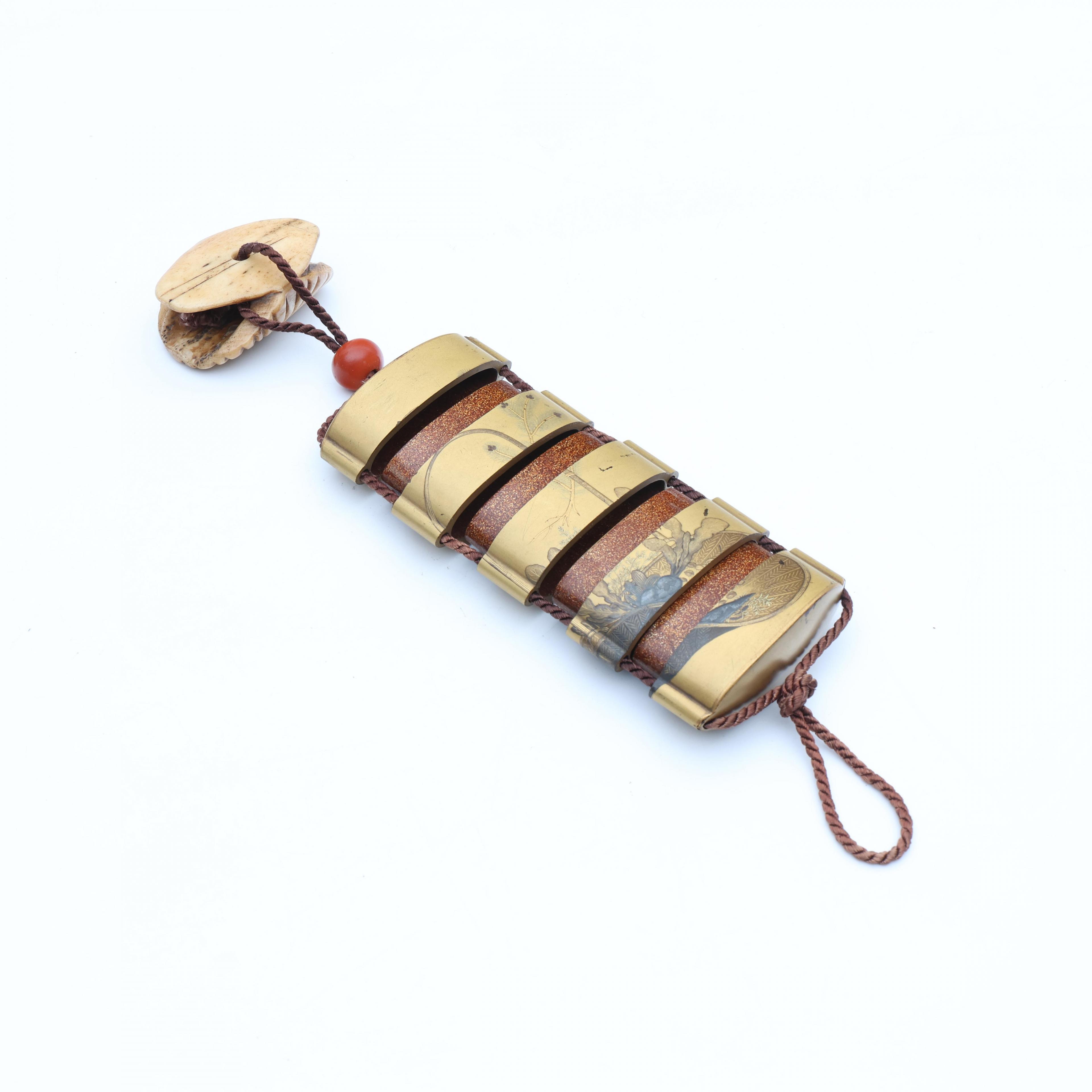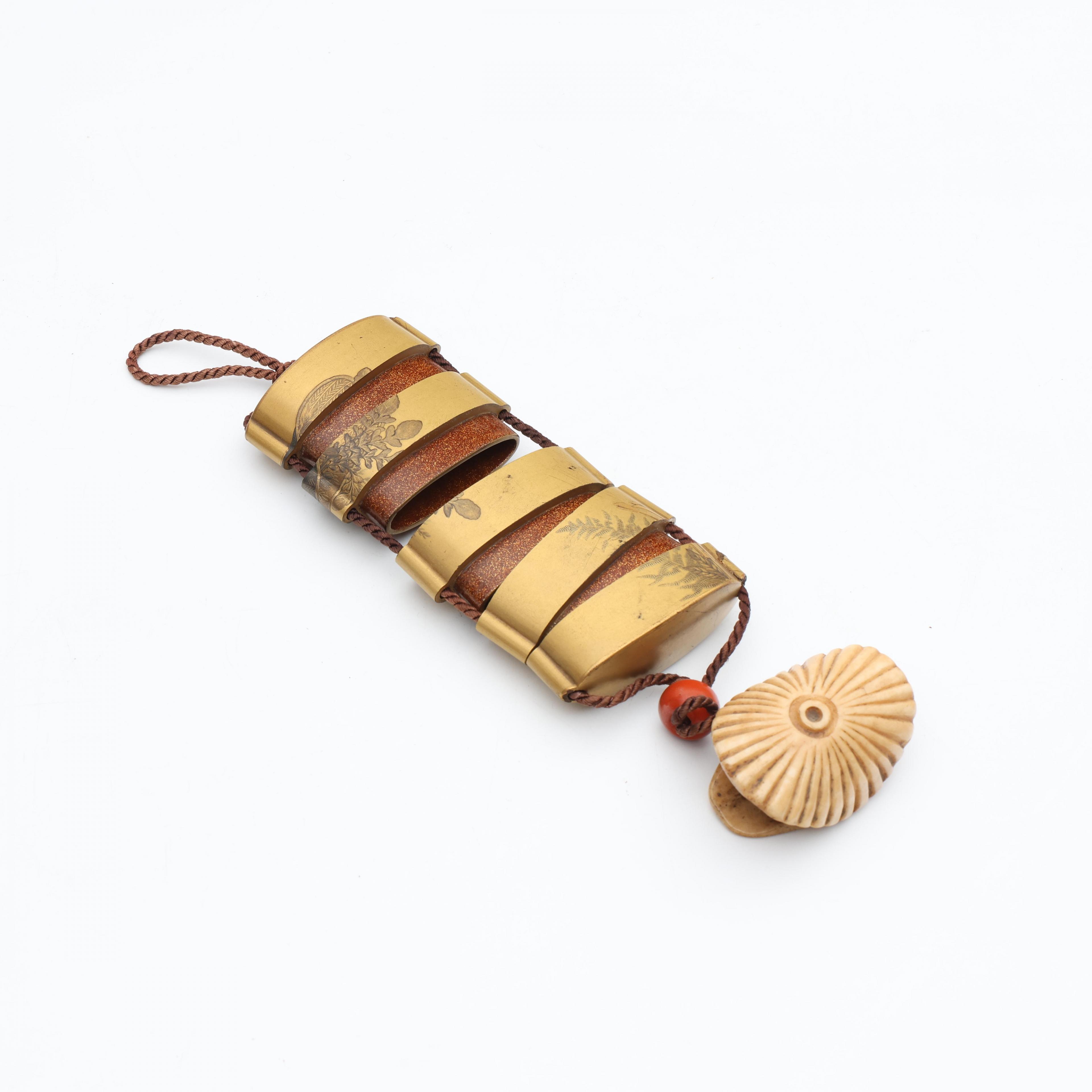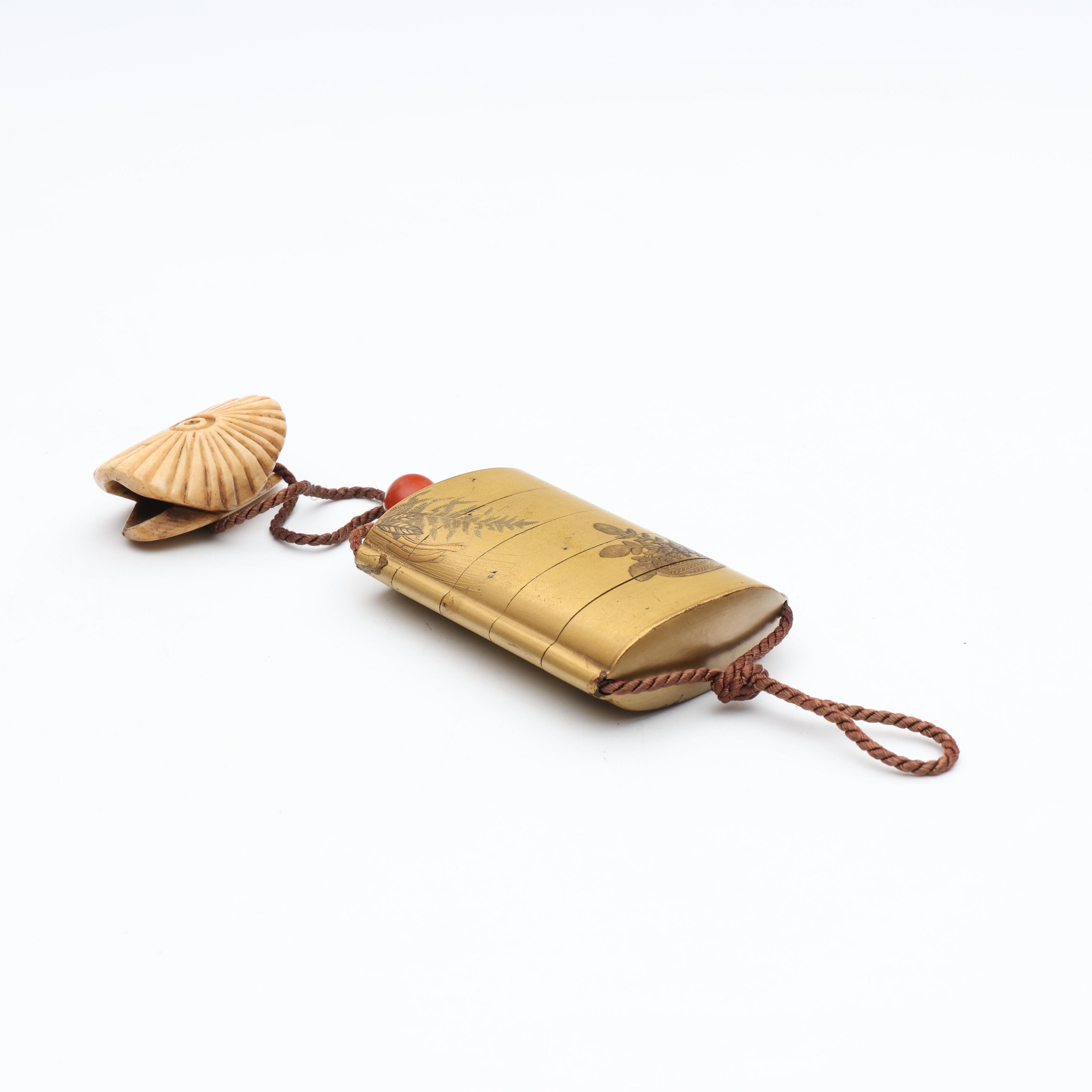 decorated in gold makie and togidashi makie with an ikebana basket, with nashiji interior, with marine ivory netsuke shaped as a clam and red ojime (some wear and scratches to the lacquer)