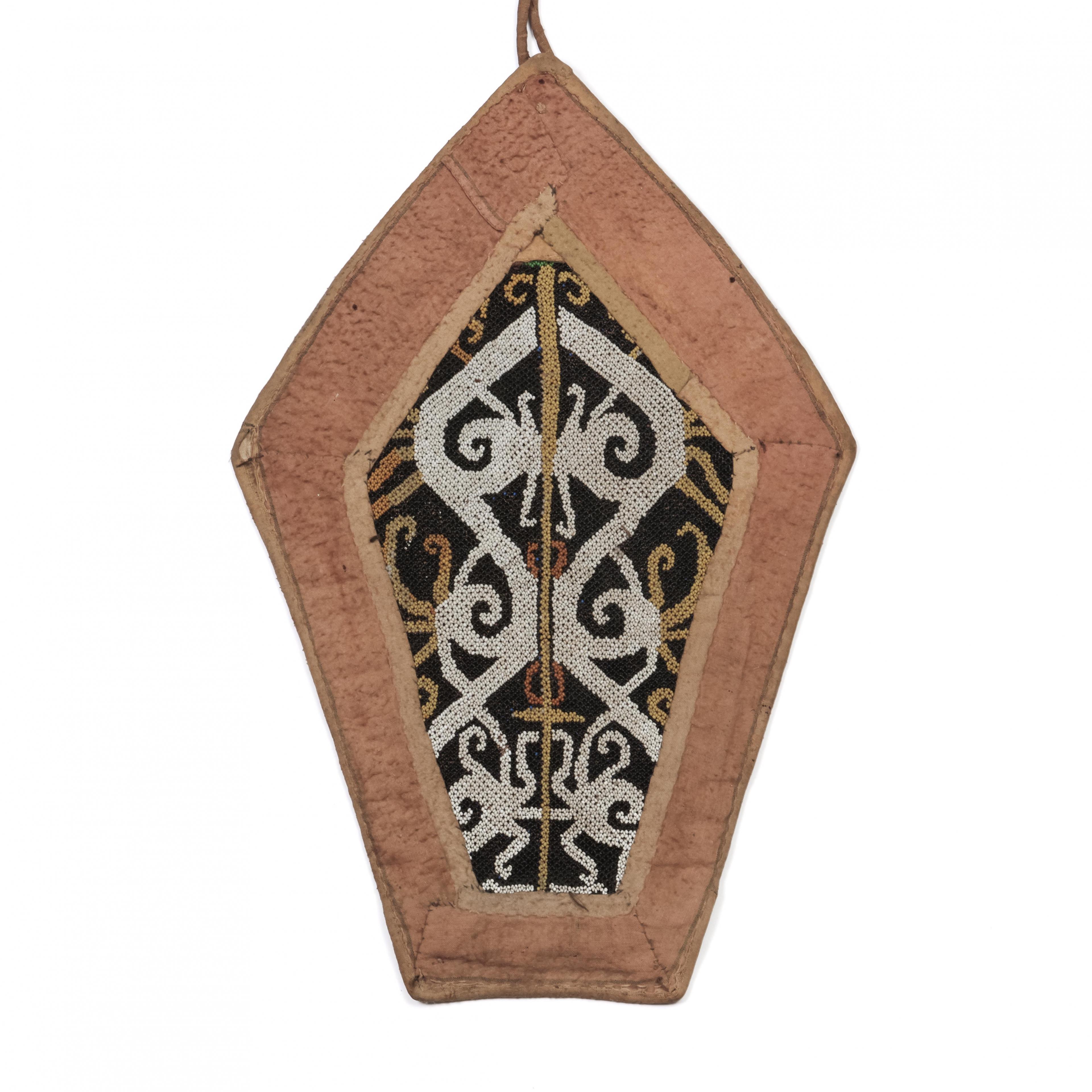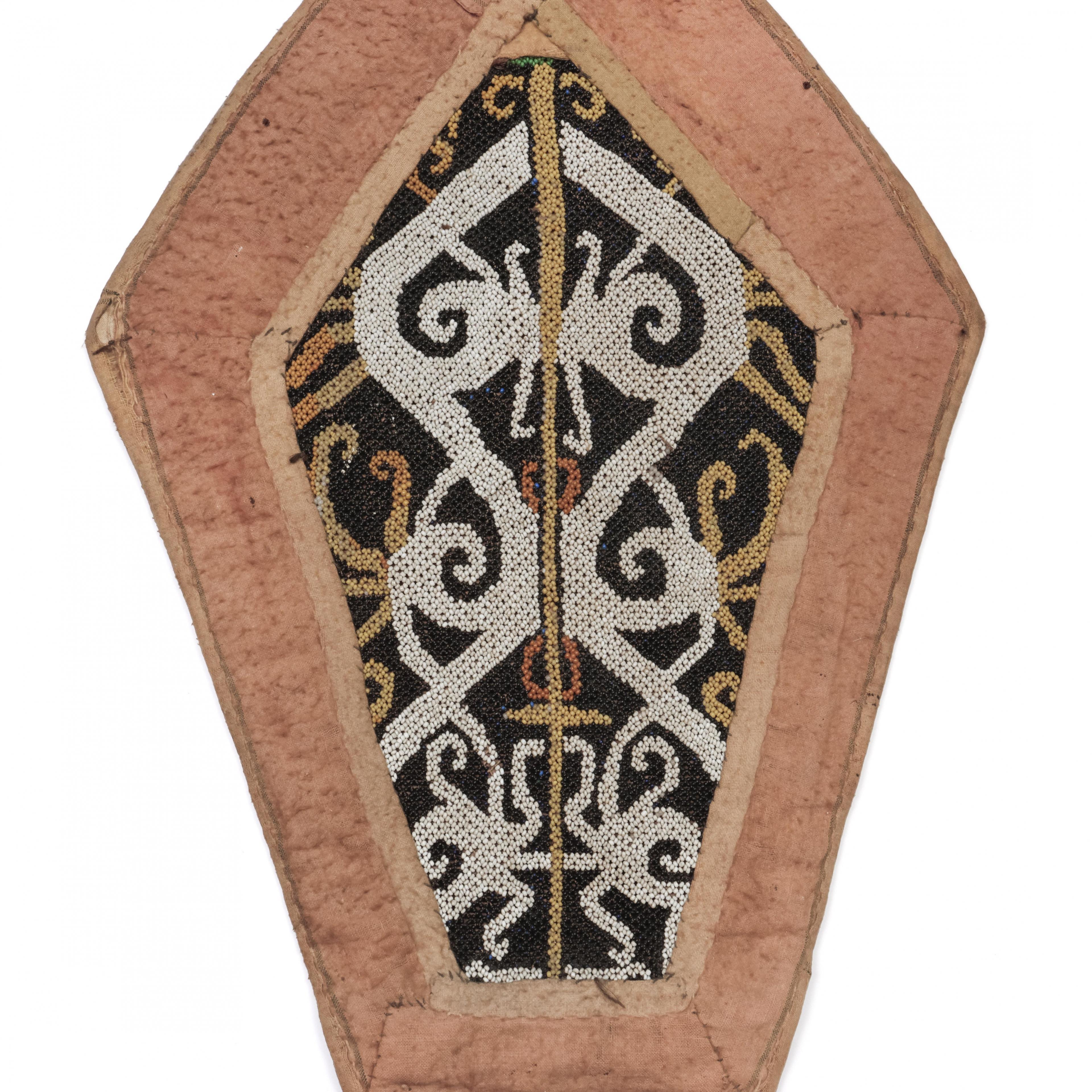 the beaded central panel showing stylised aso patterns in white and yellow against a black ground.