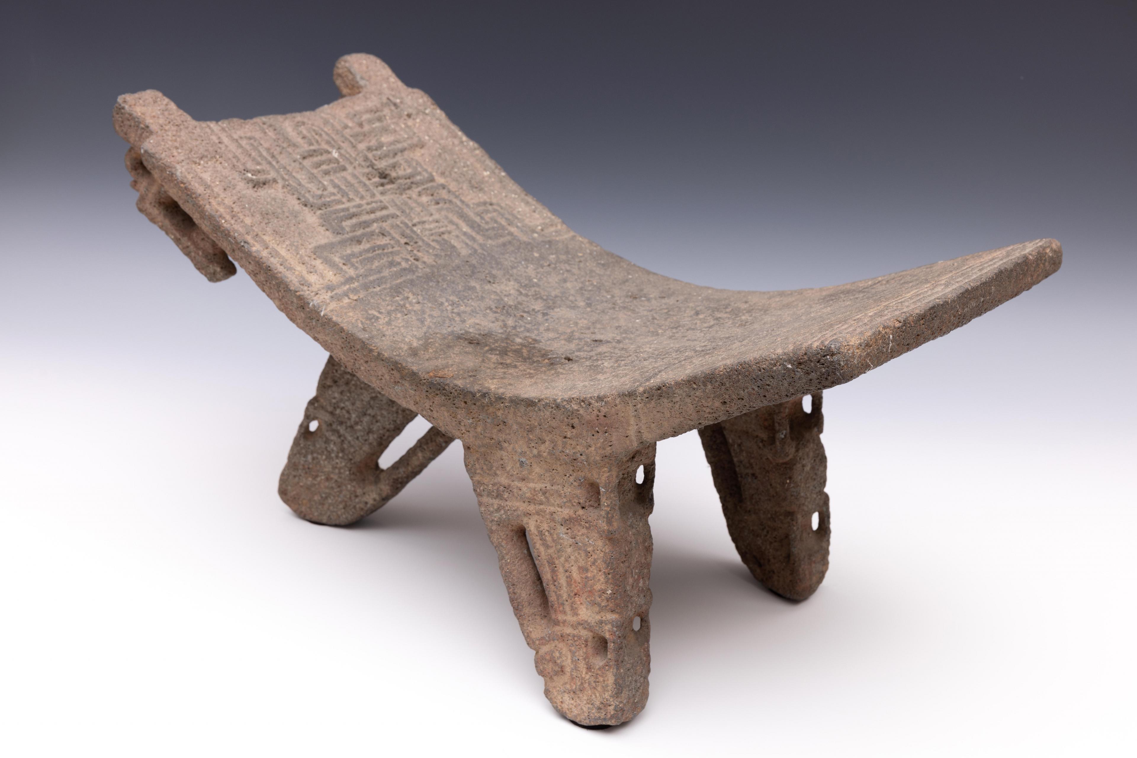 the three open worked legs with stylized animals, the seat and legs with carved geometrical pattern.