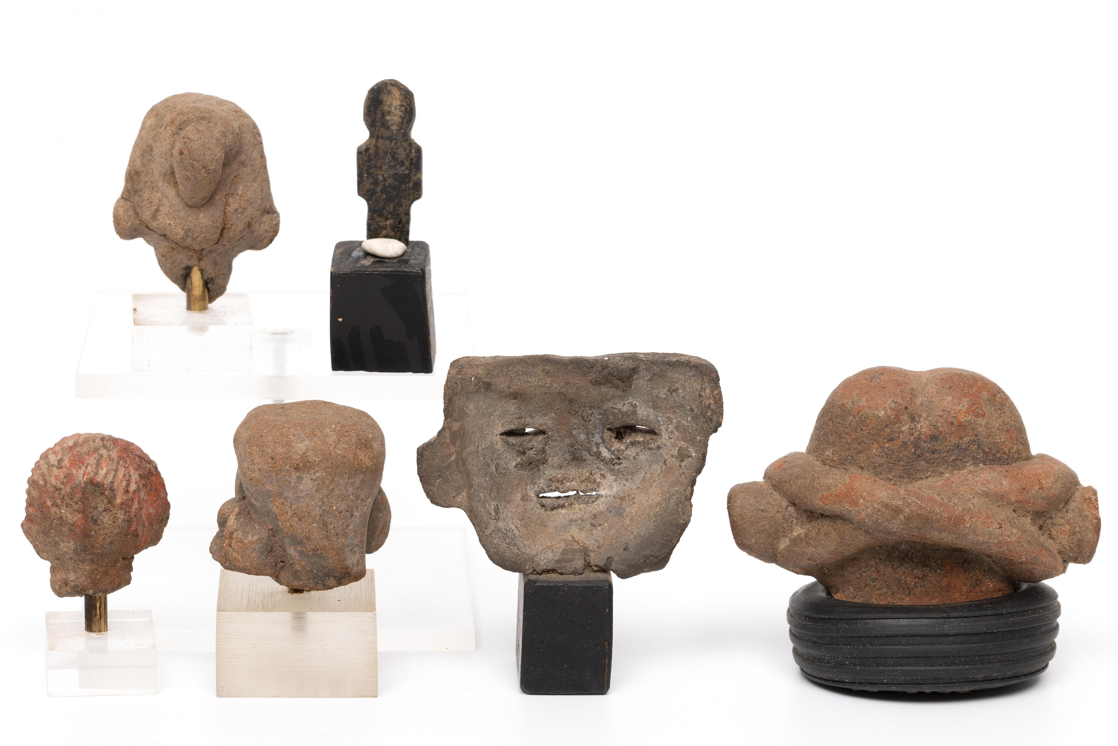 Mexico, Classic Culture, 100 - 700 CE, a miniature stone figure and a collection of five terracotta heads.