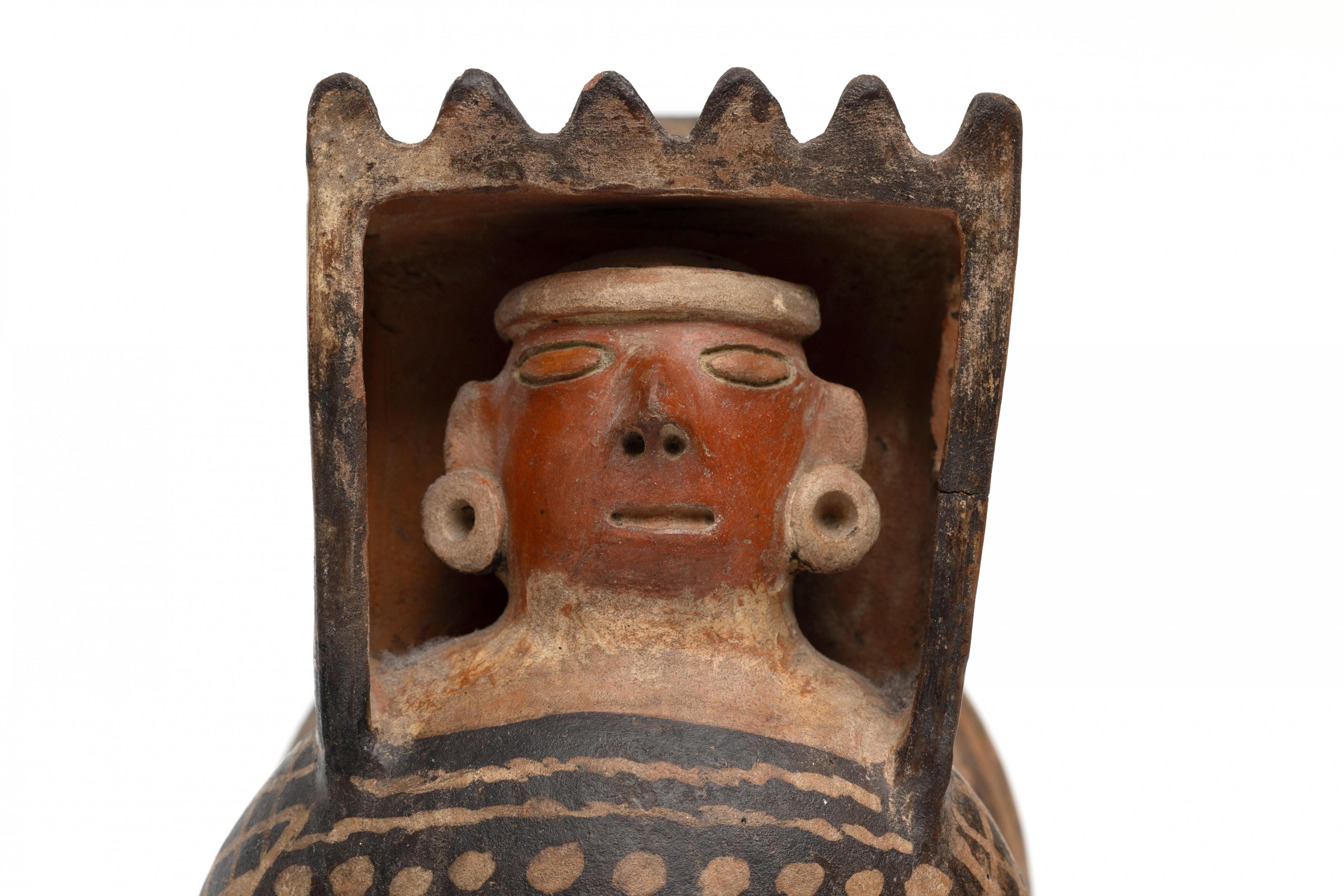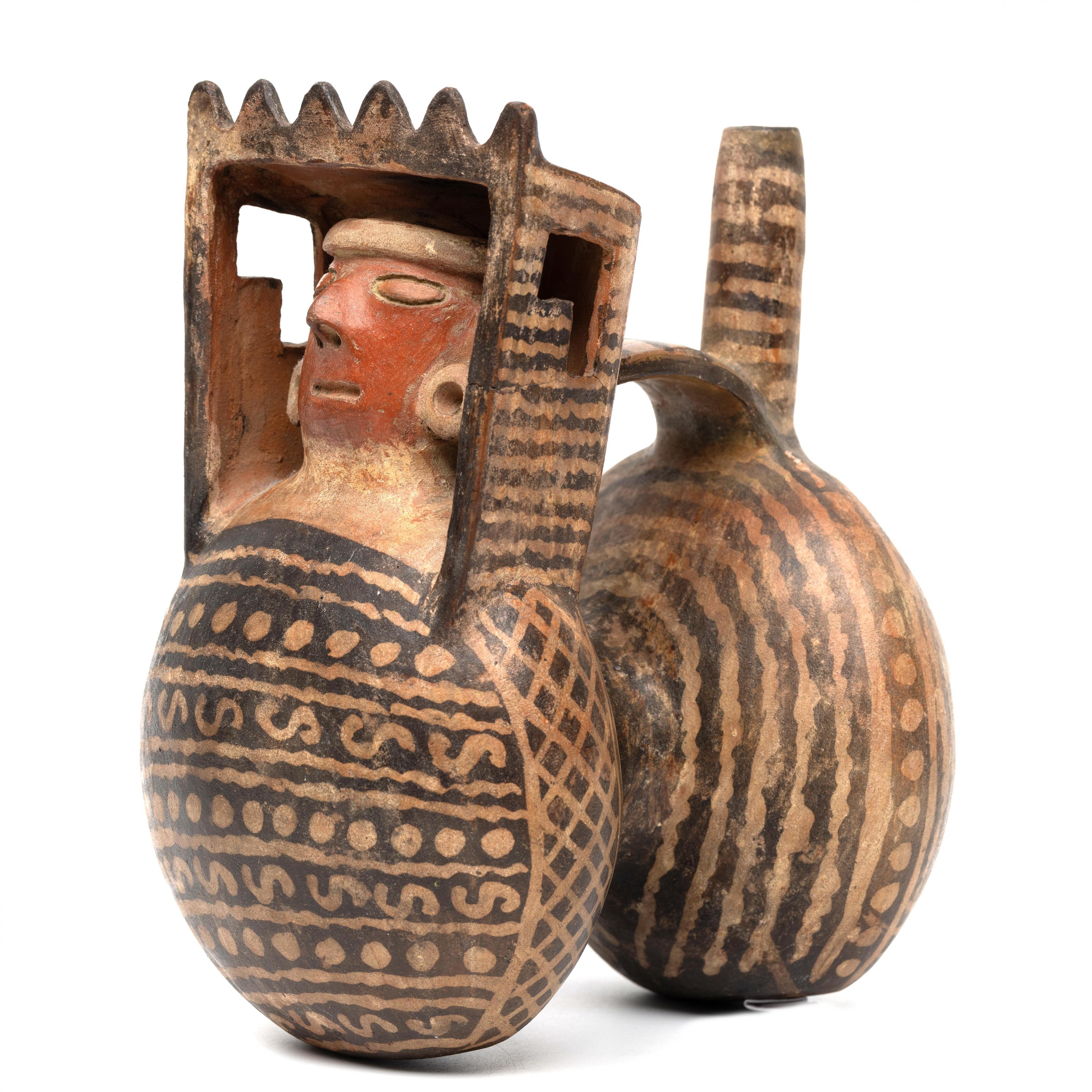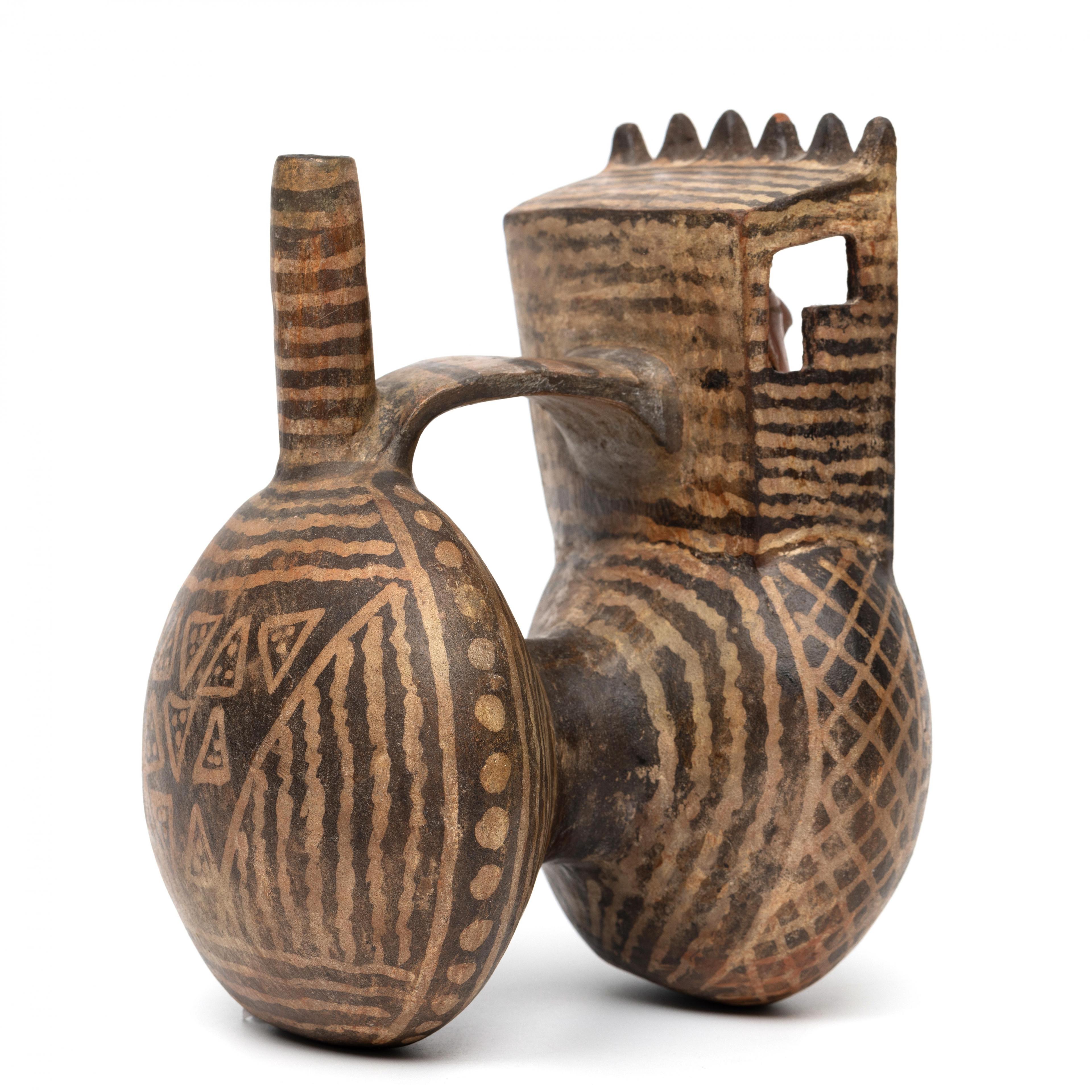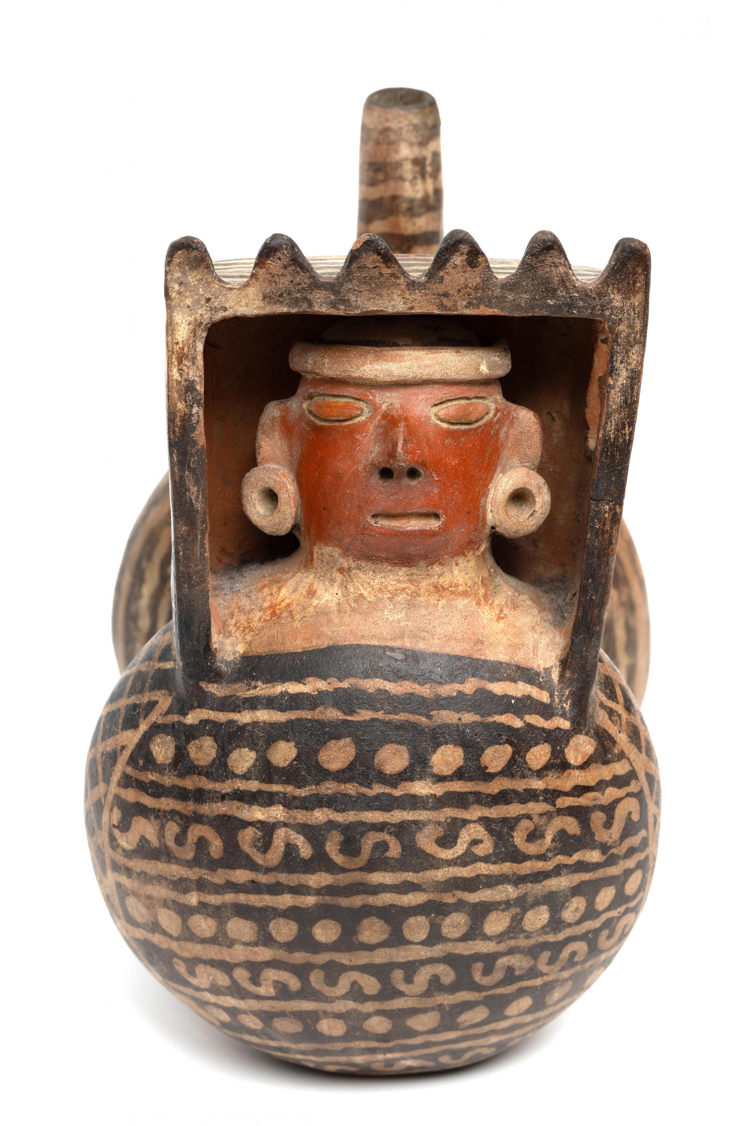 Peru, Vicus, 500 BCE-200 CE, a double chambered stirrup spout vessel showing a bust under a roof,