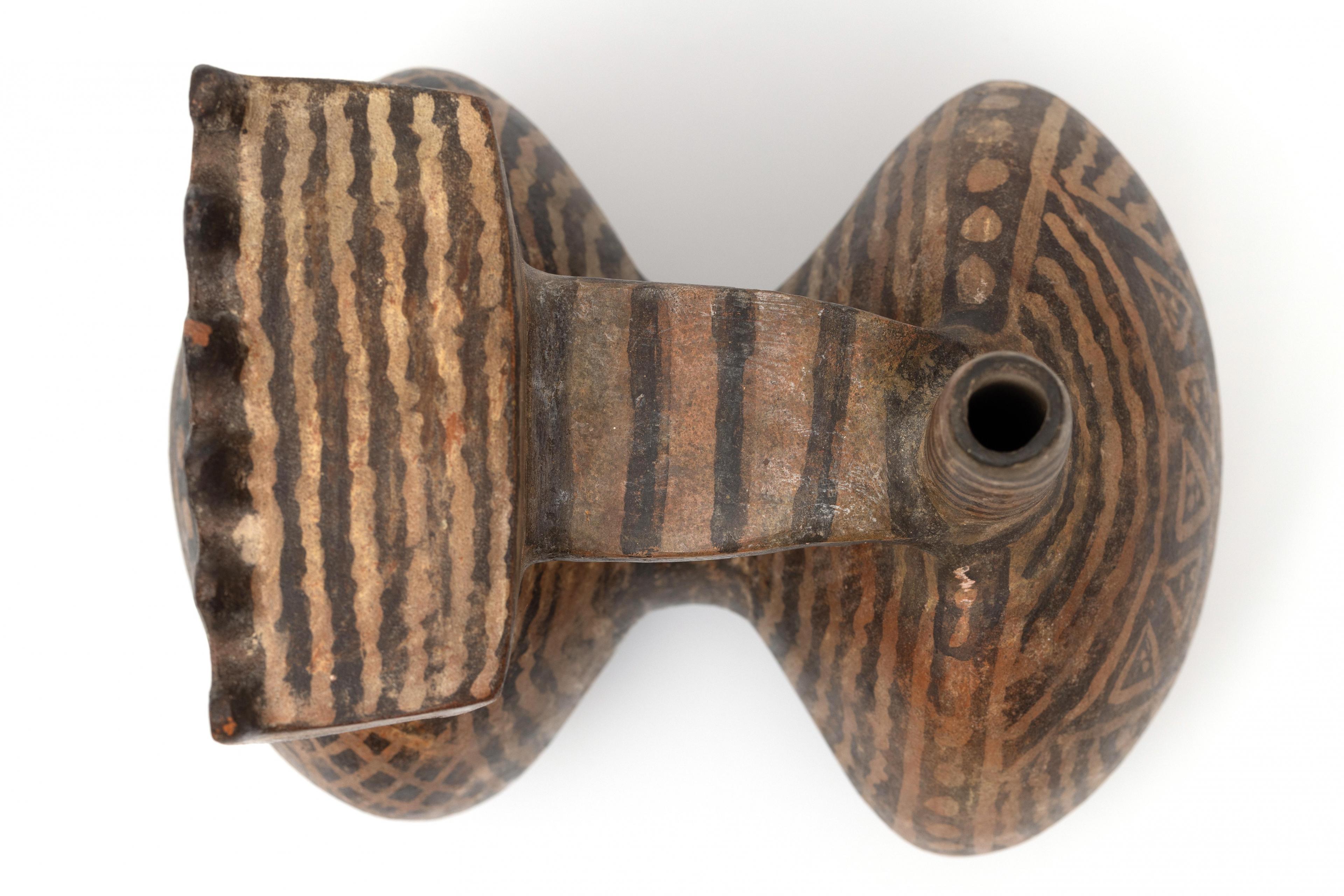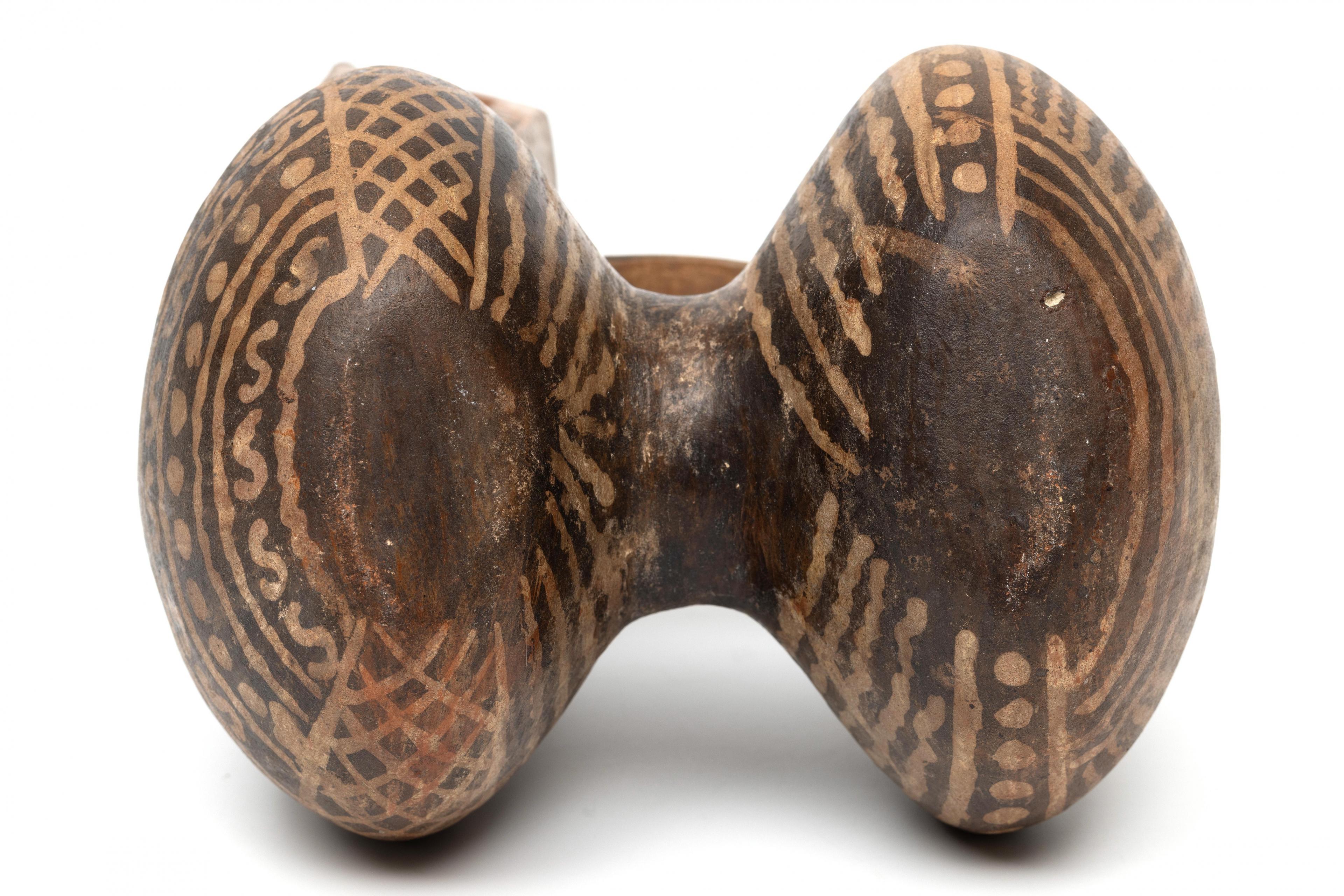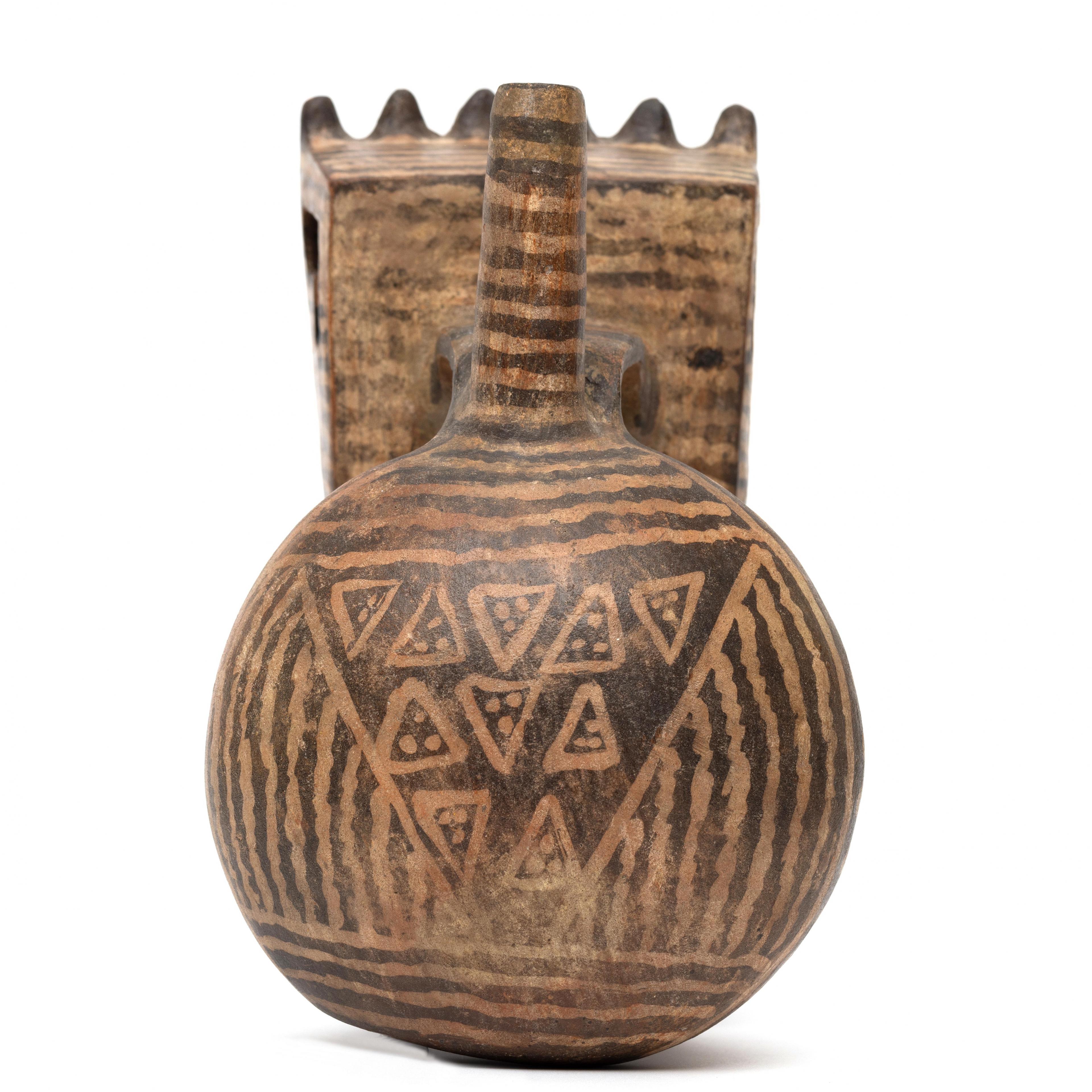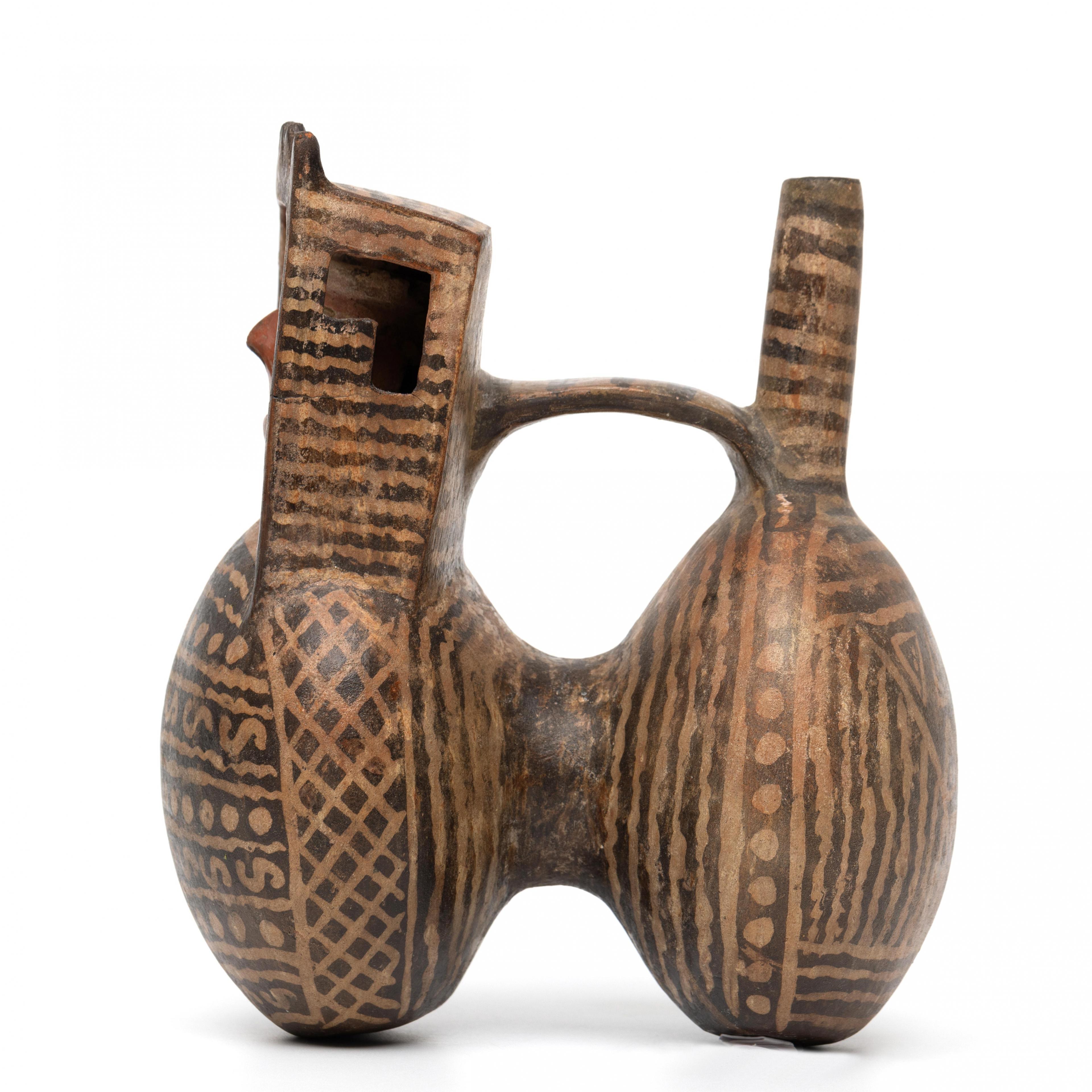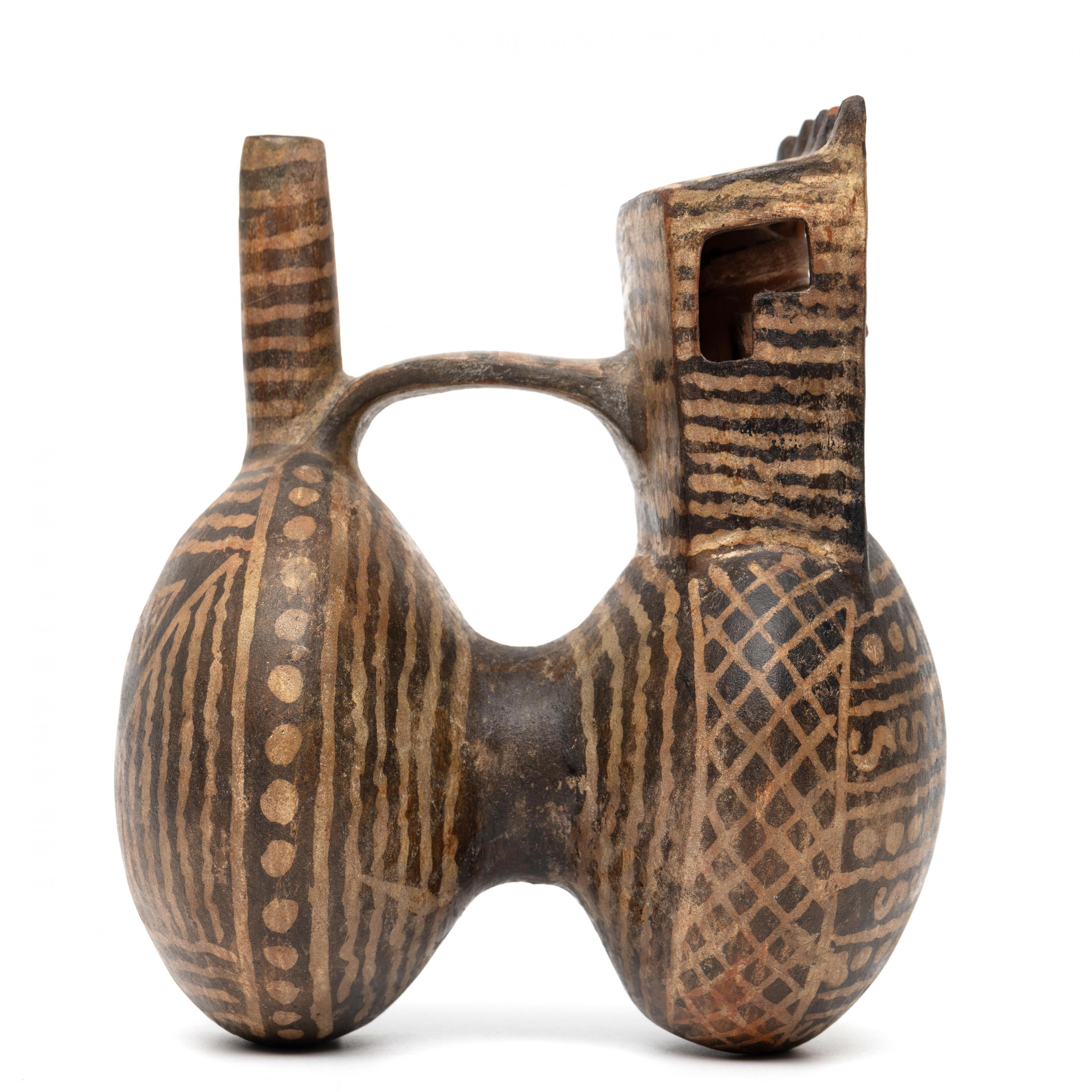 Peru, Vicus, 500 BCE-200 CE, a double chambered stirrup spout vessel showing a bust under a roof,