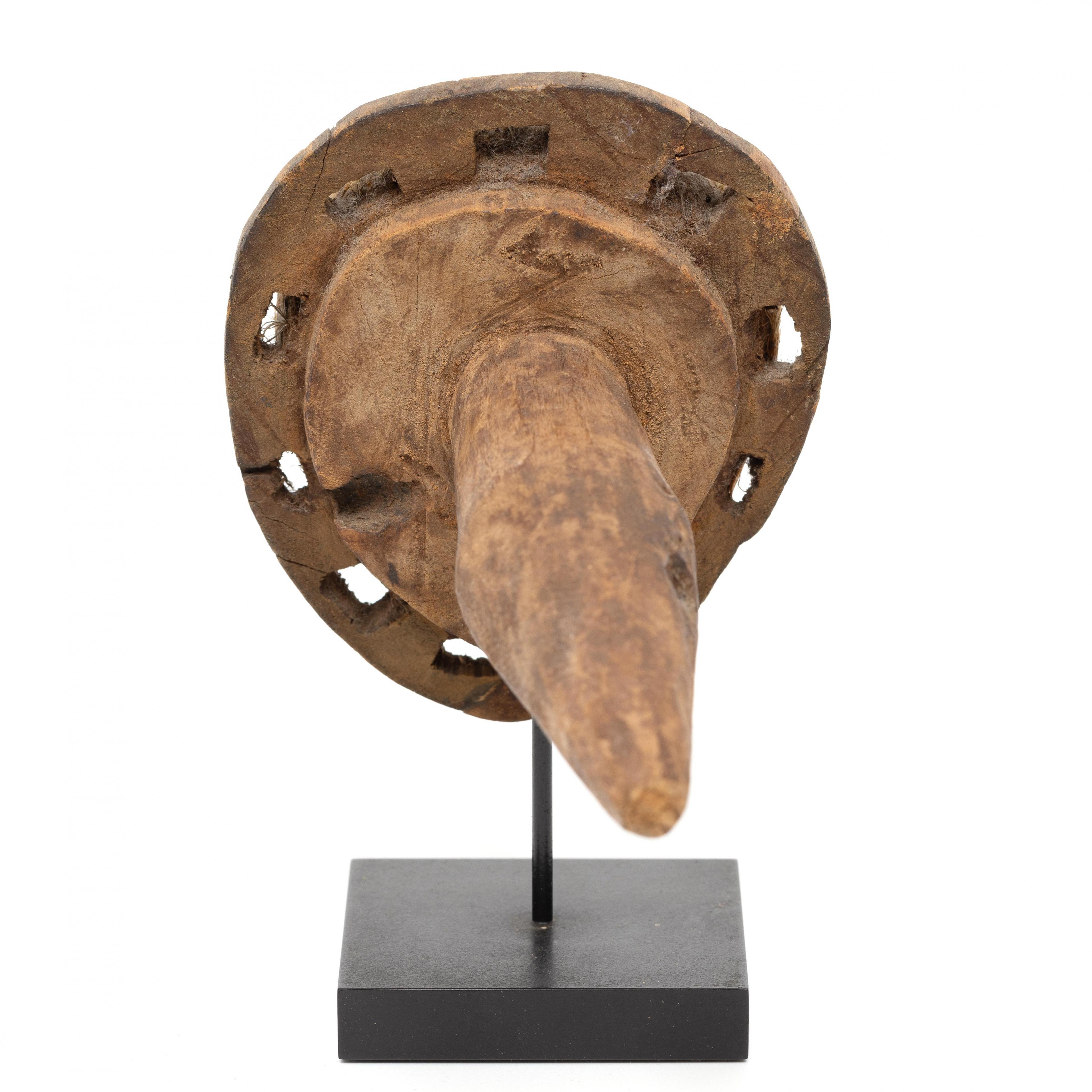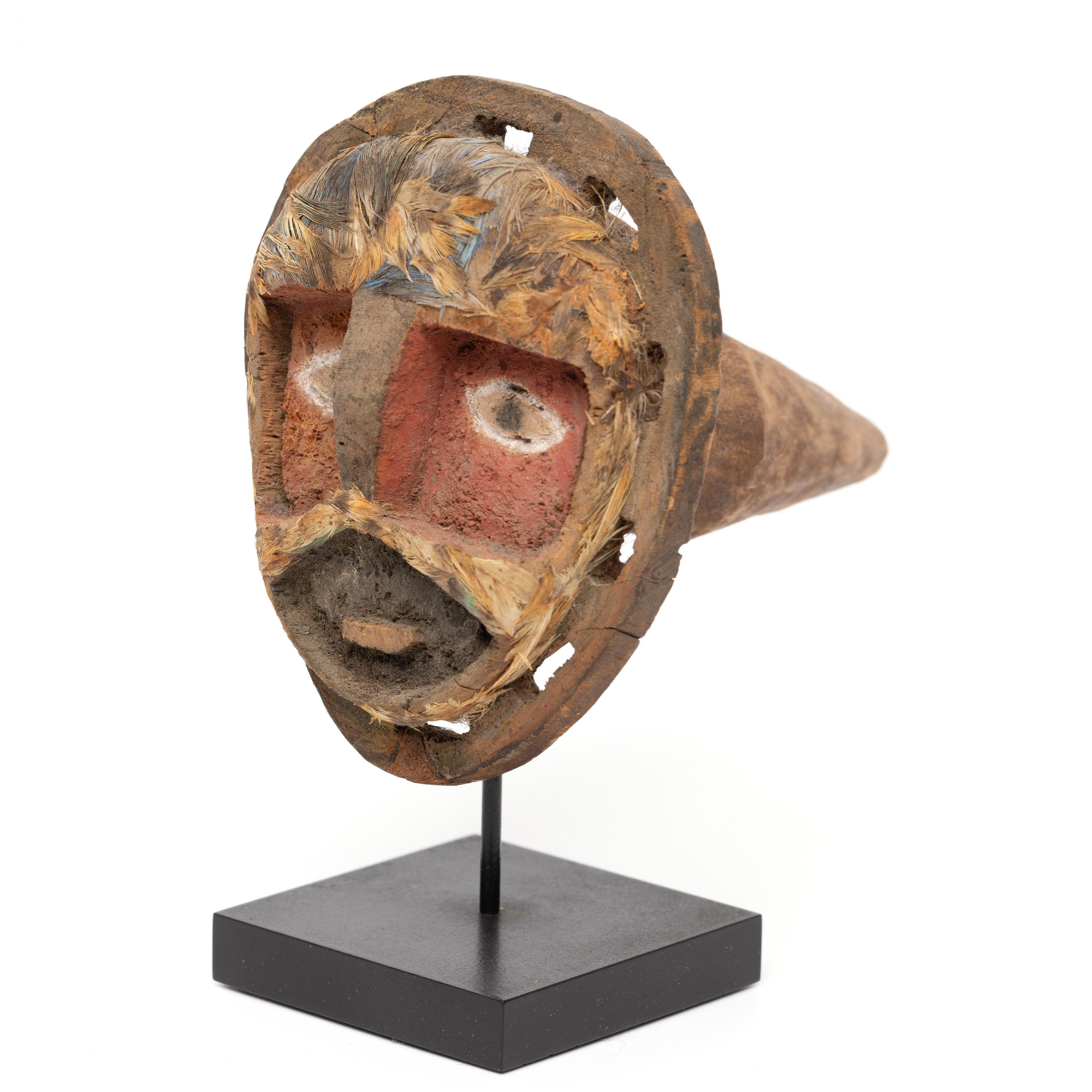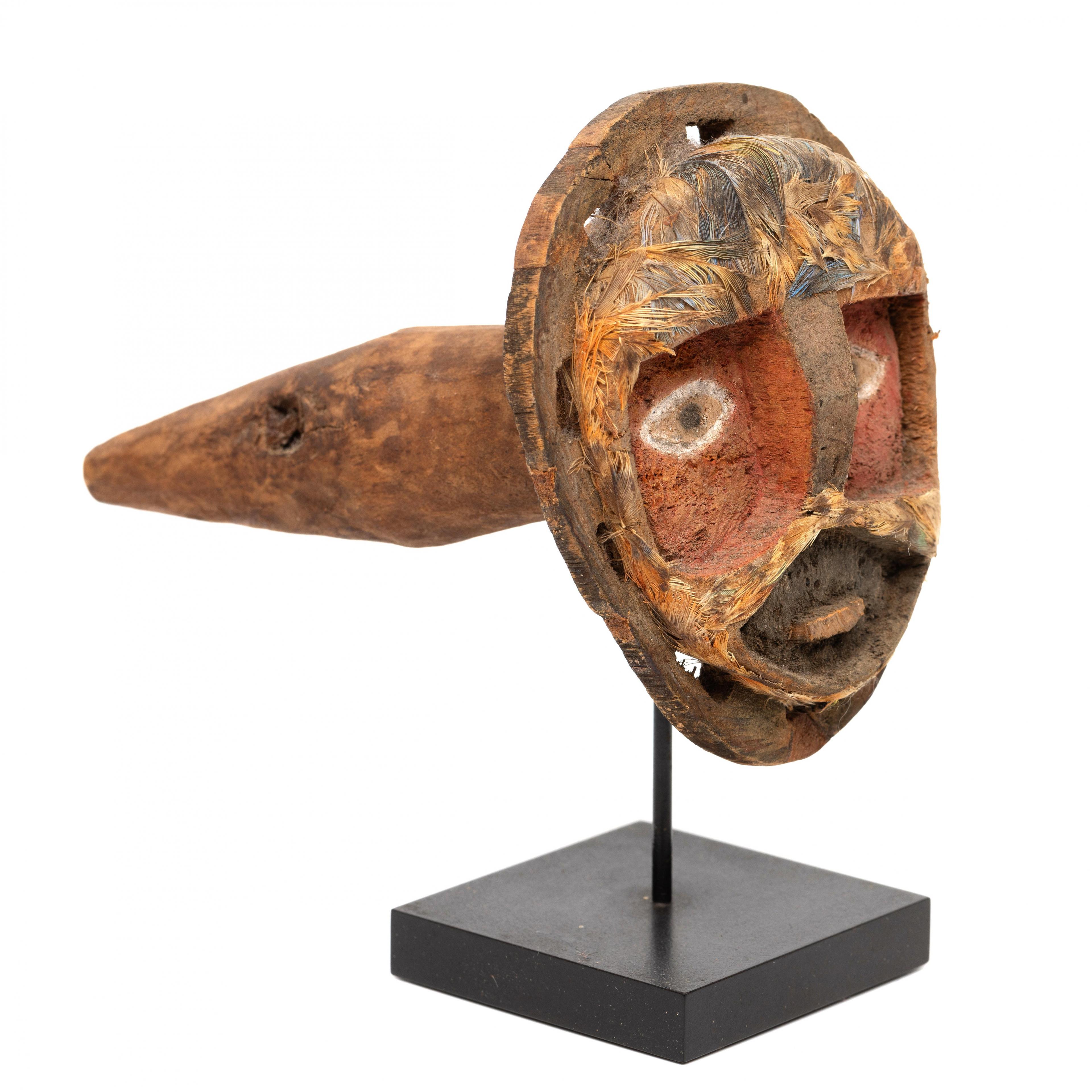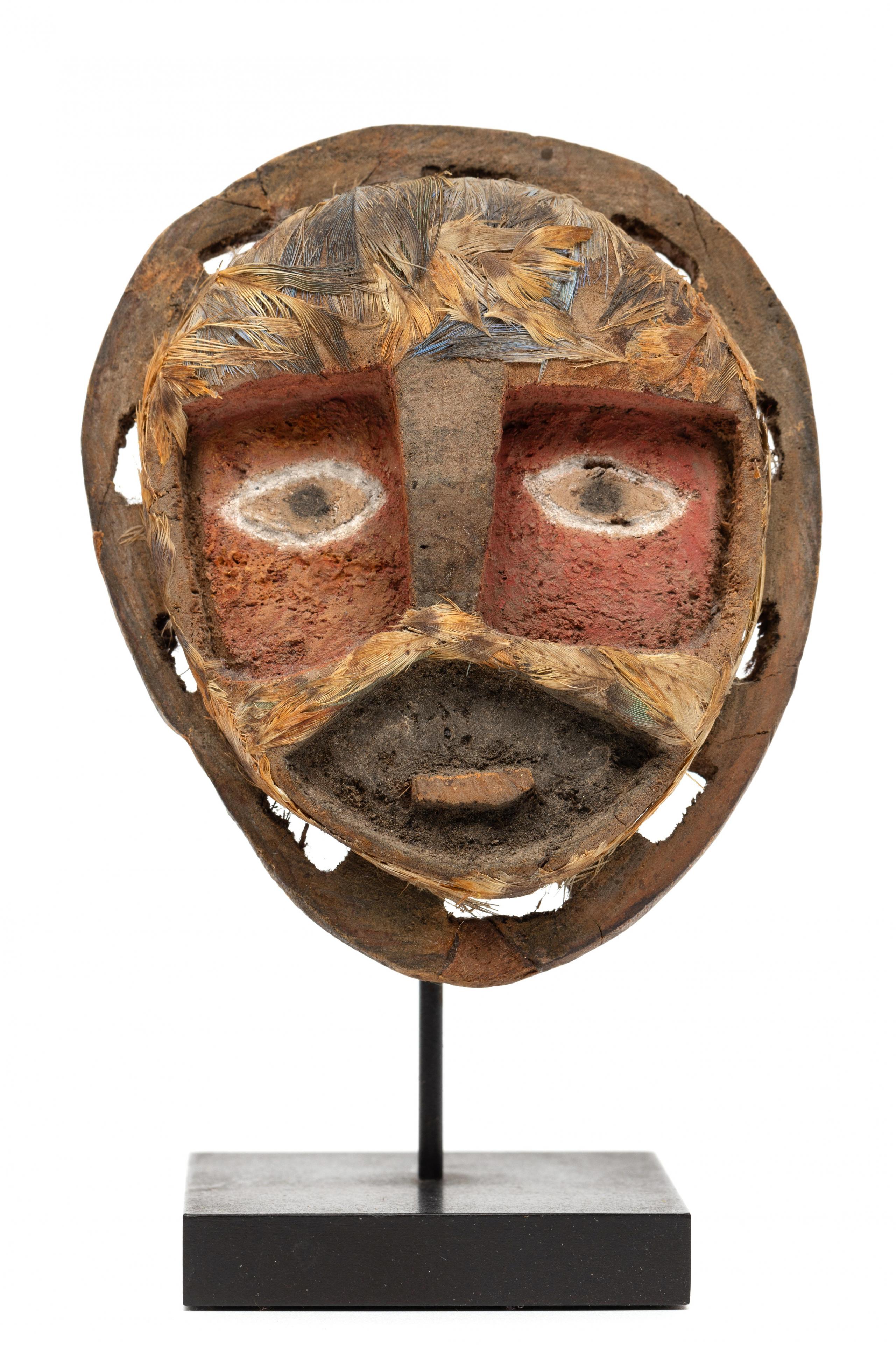 with the depiction of a face in relief. With red, white, black pigments and attached feathers.
