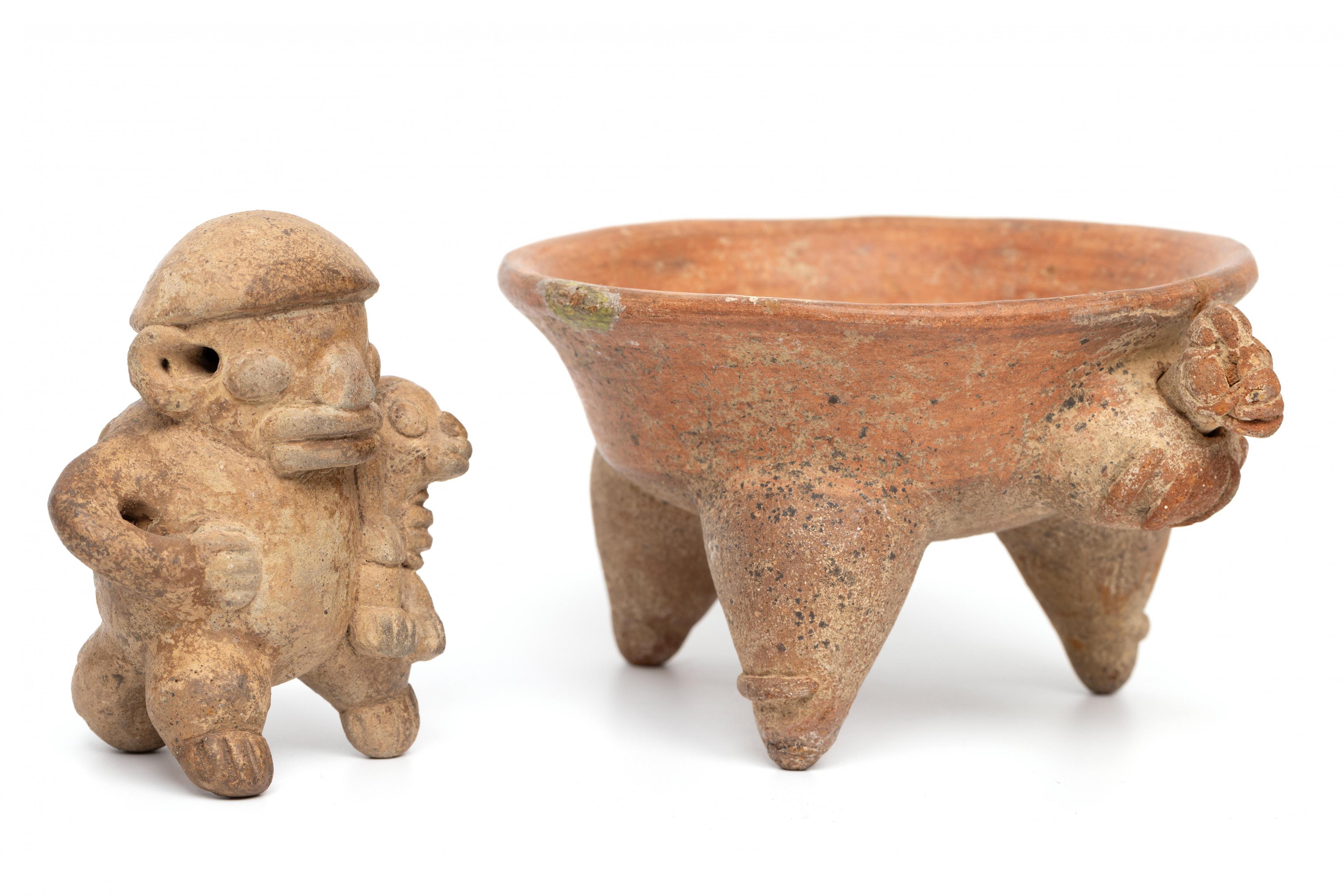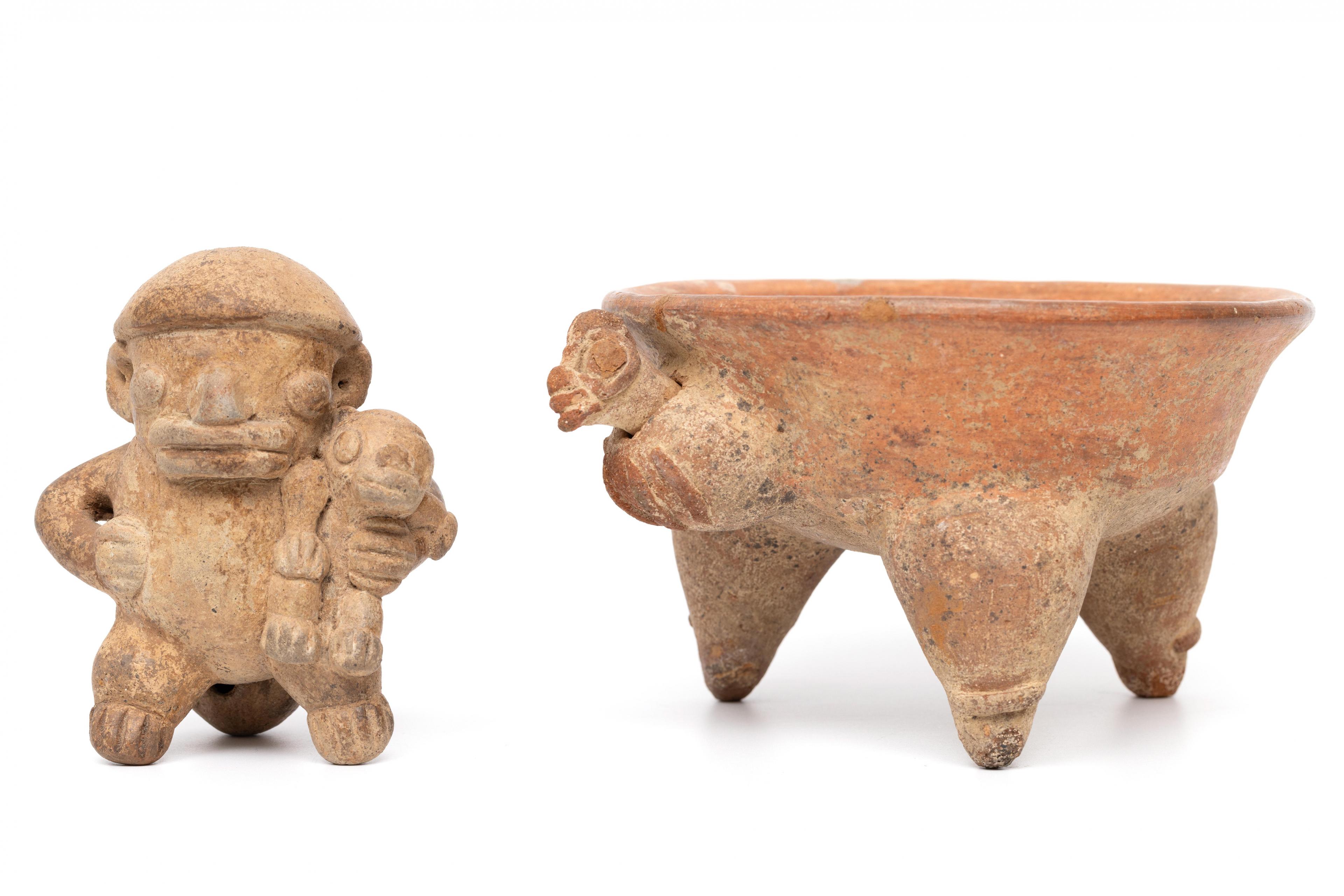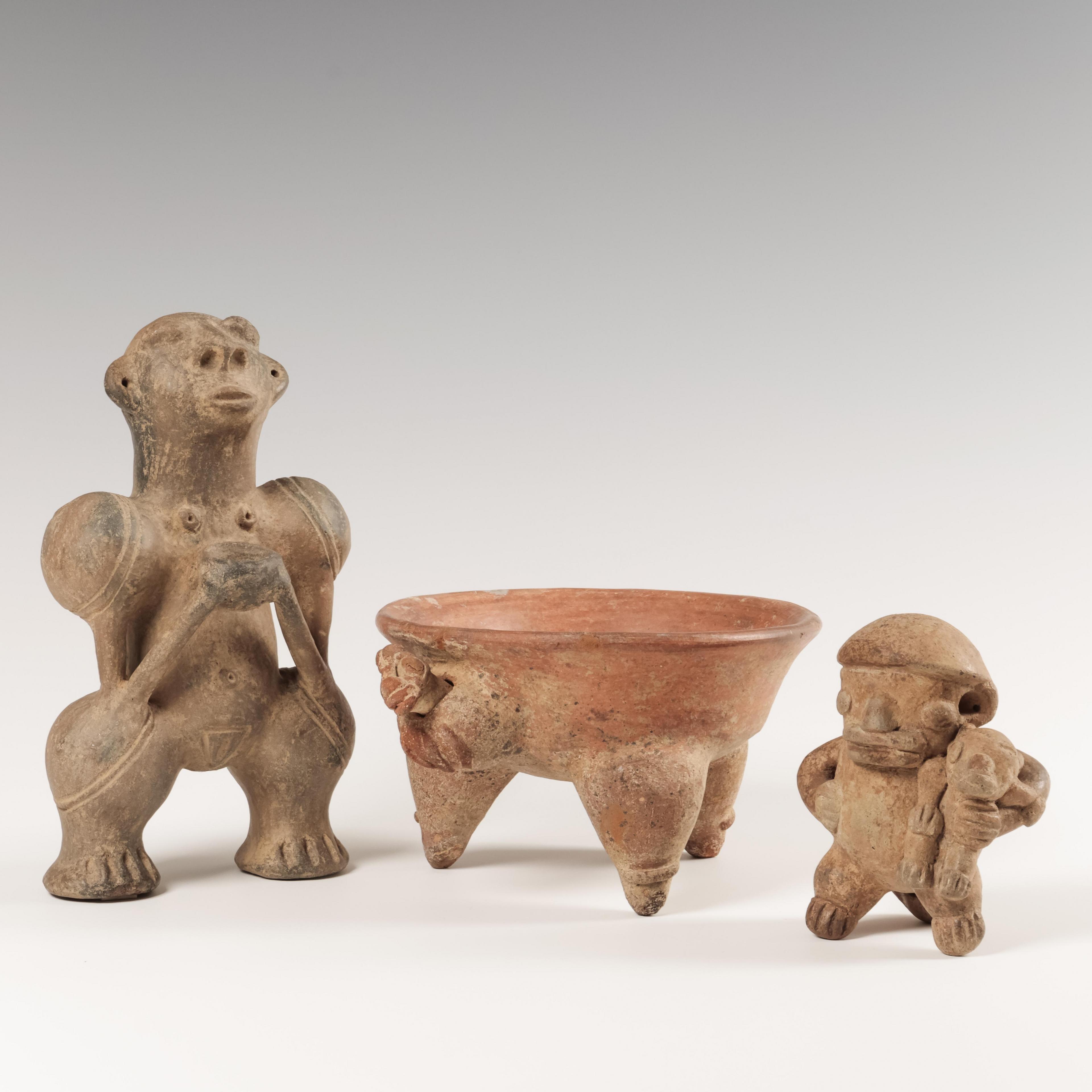 Costa Rica, Nicoya, 500-1500 CE, two terracotta statues and a bowl.