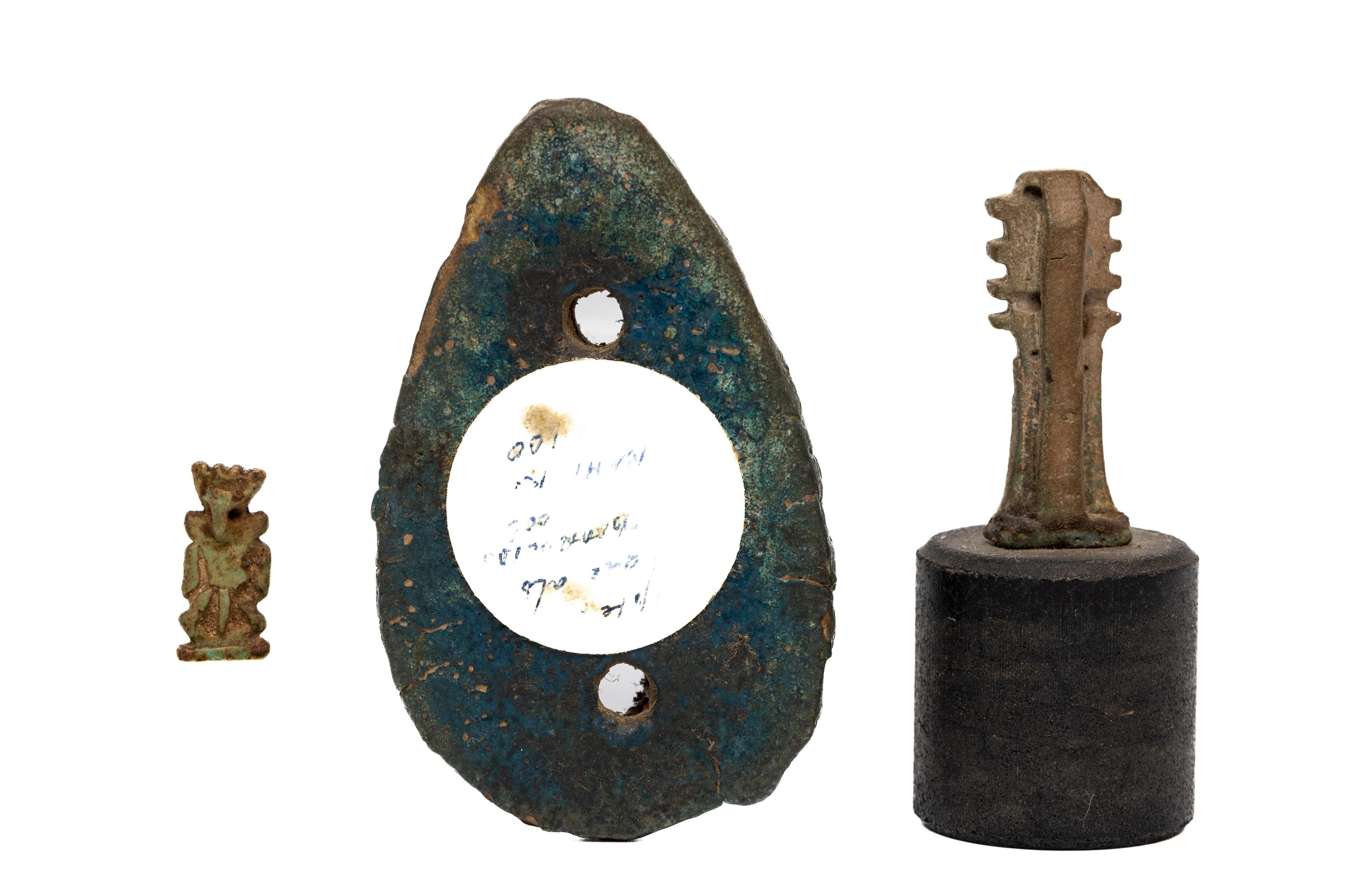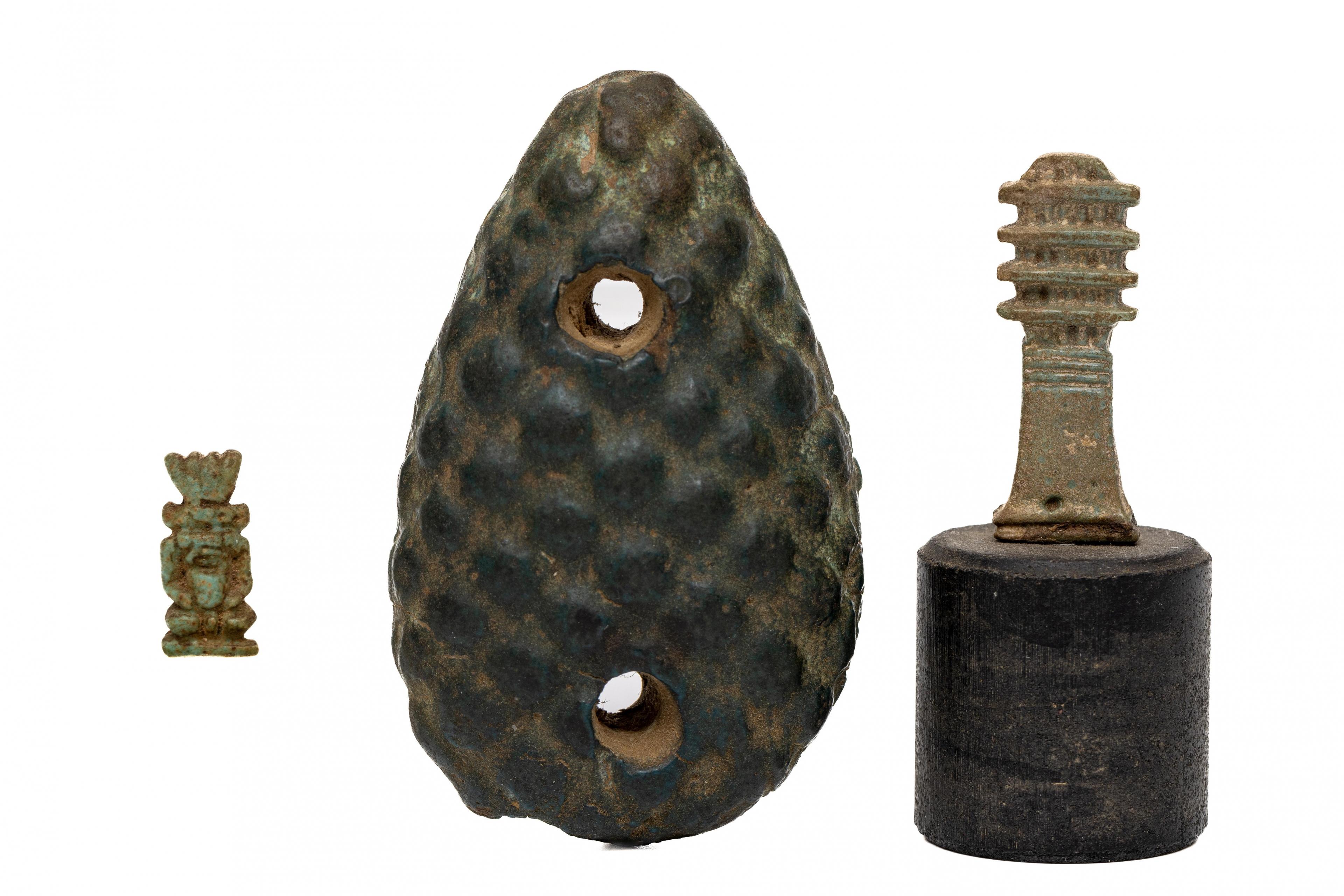 an amulet in the form of a grape, a Bess figure and a Djed pillar