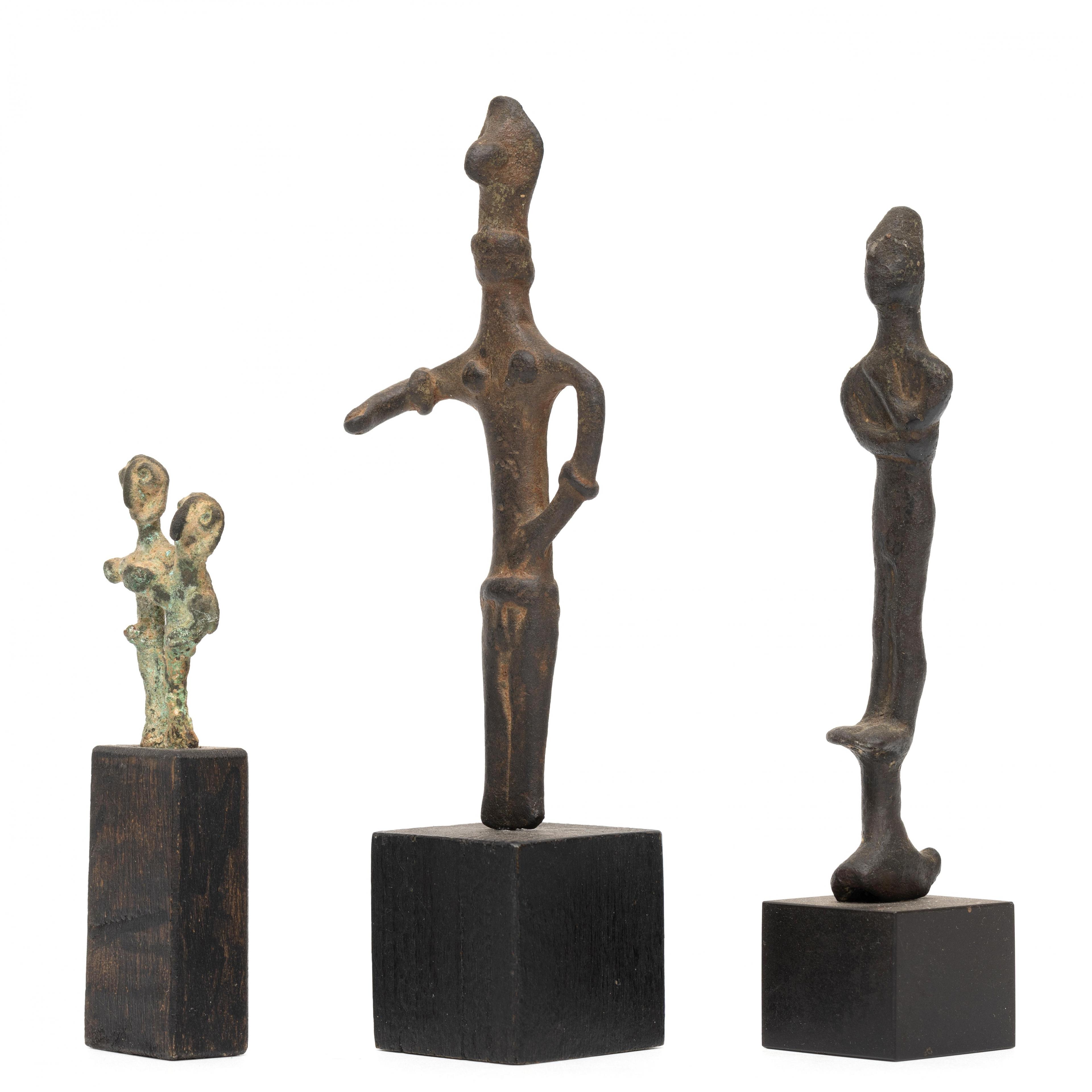 Middle East, two fine bronze fertility statues, ca. 2nd Mill BCE and a bronze votif figure, possibly Etruscan, ca. 3rd century BCE;