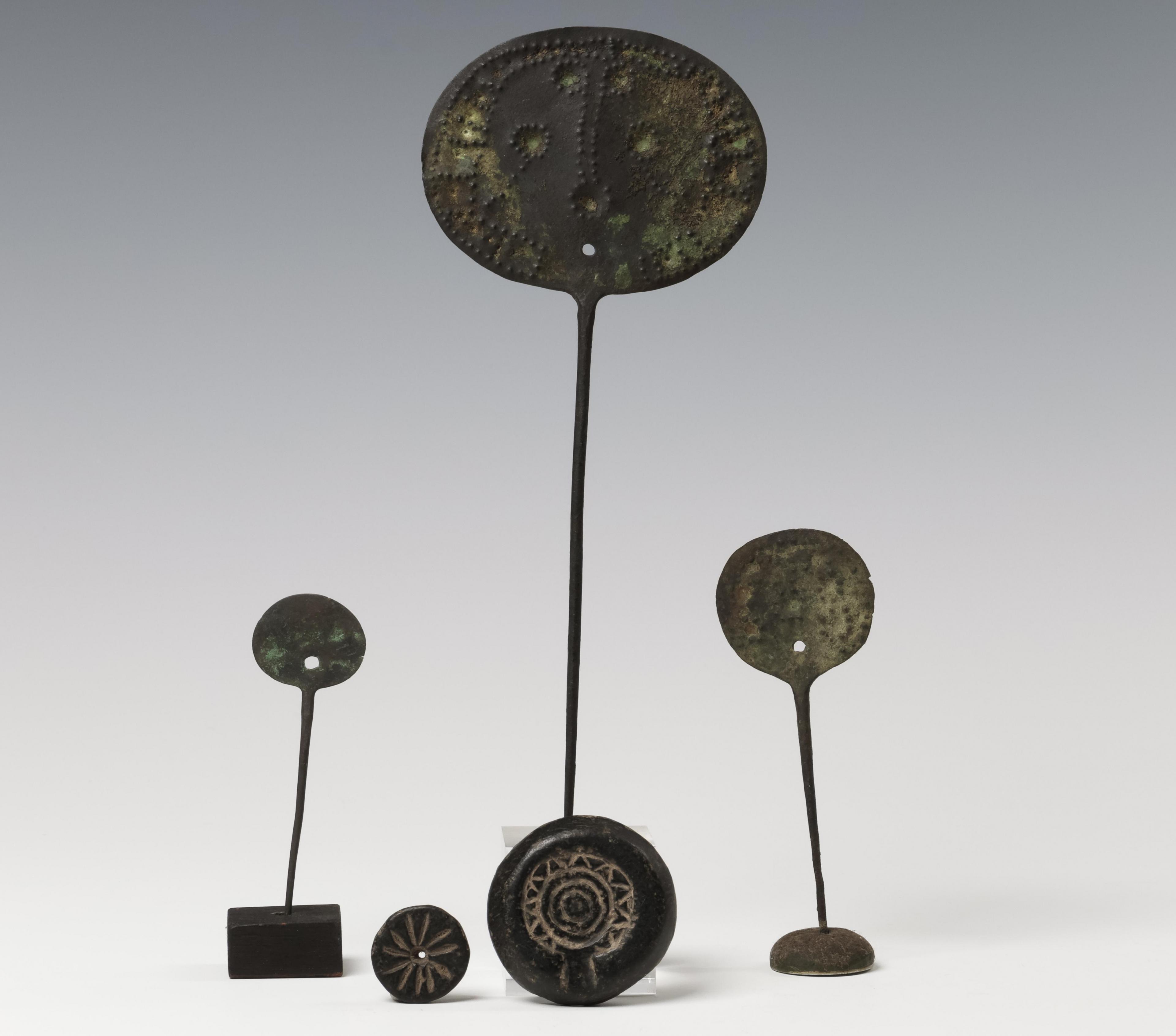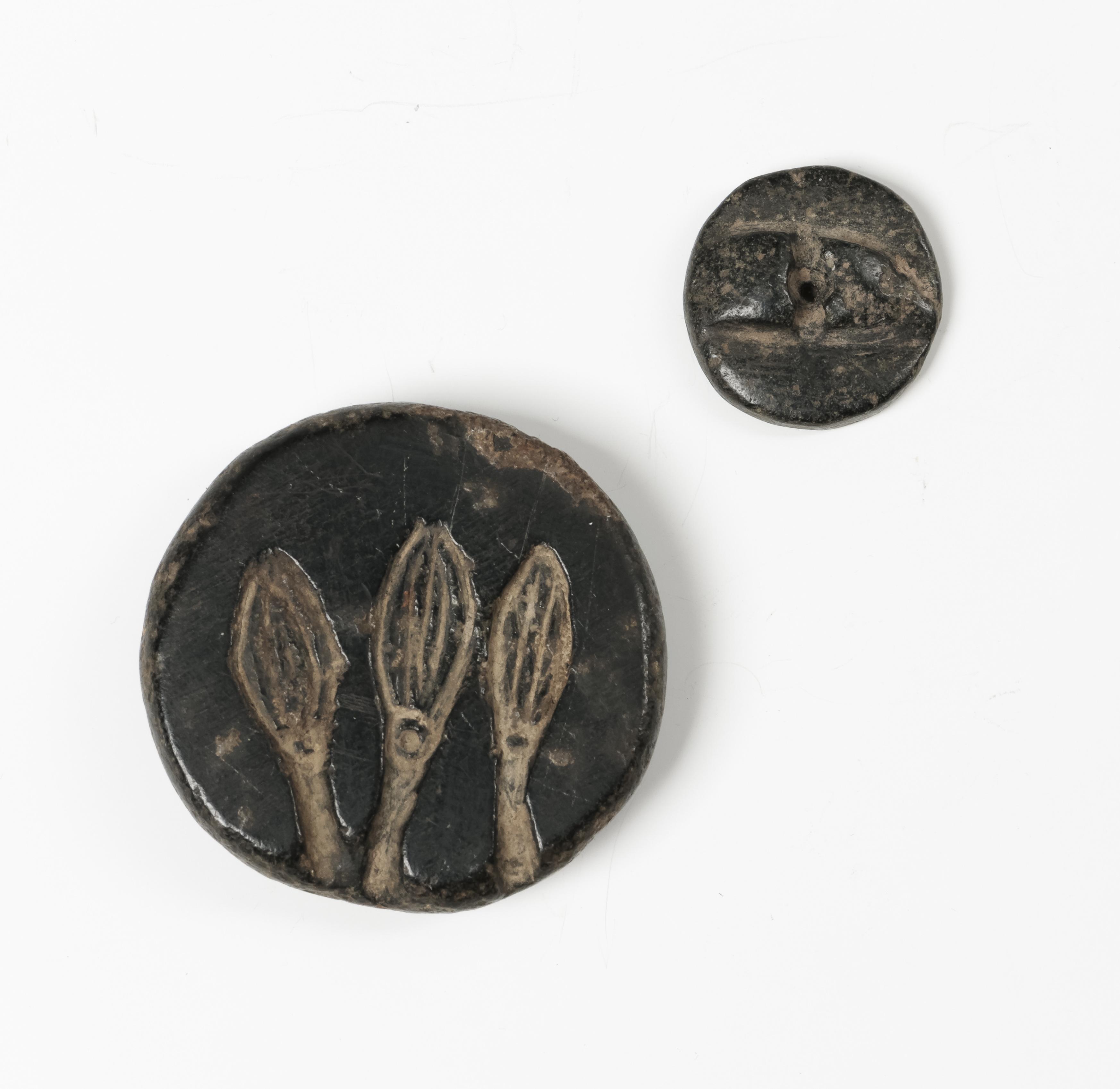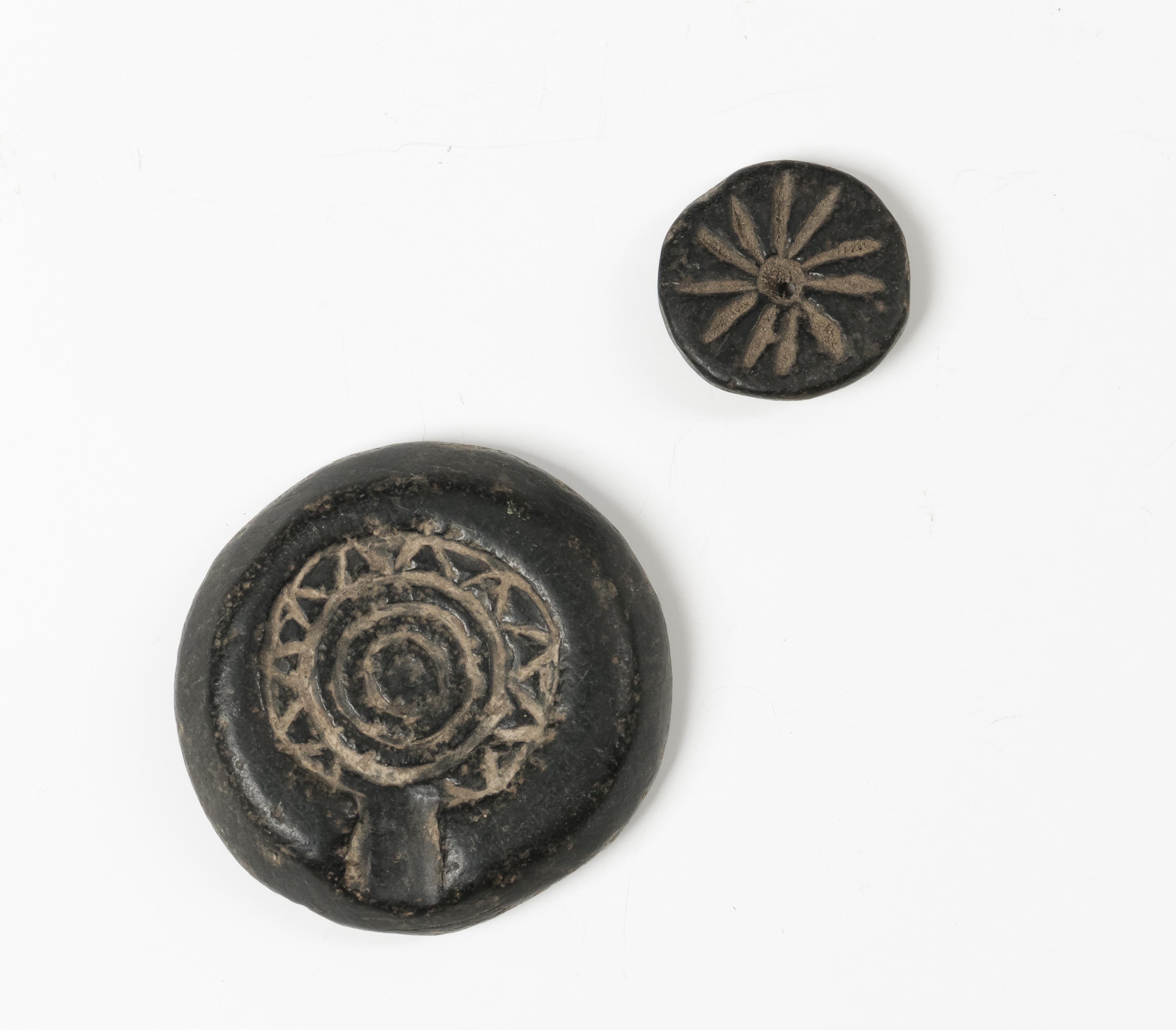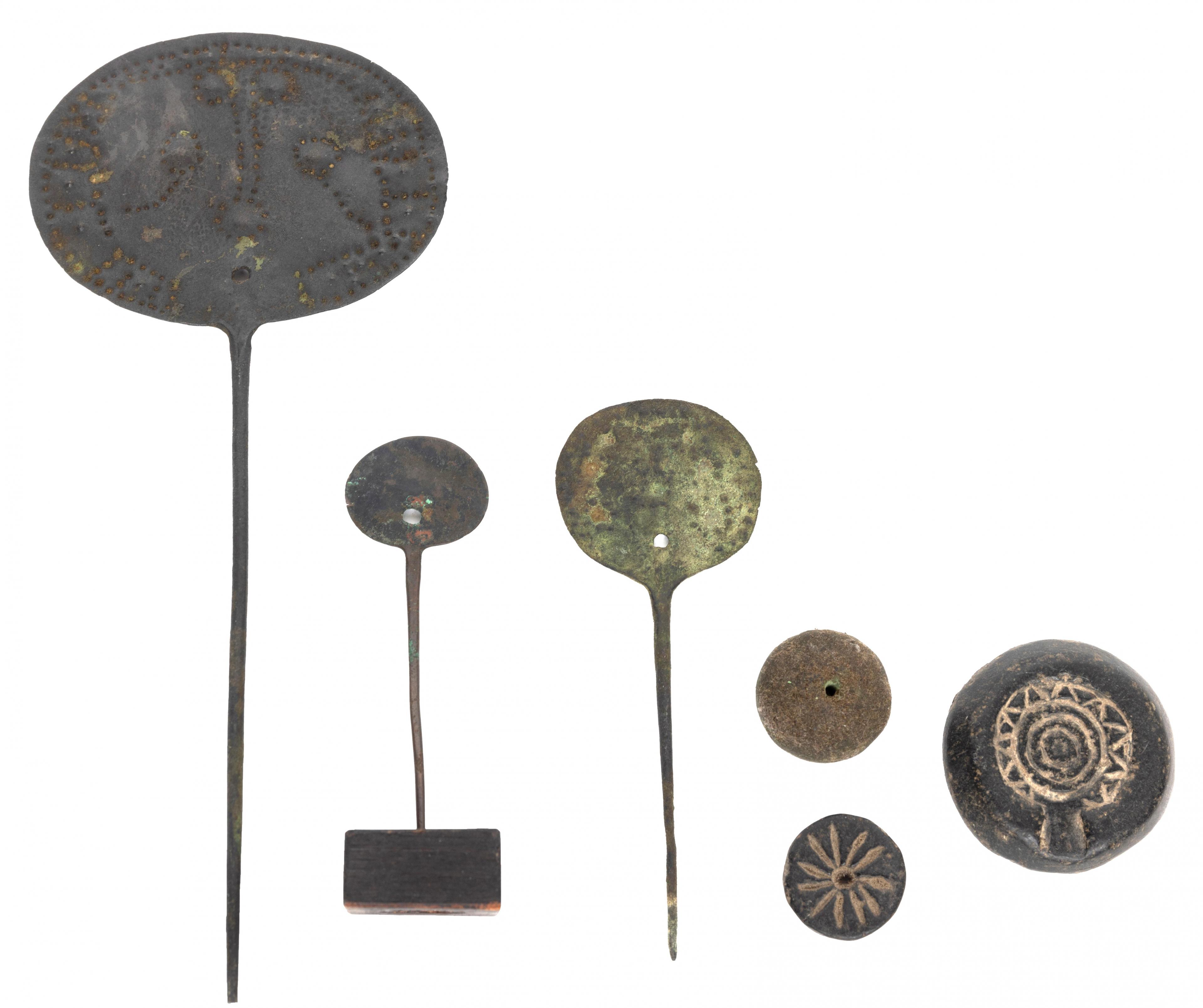 one pin decorated in the form of a stylized anthropomorphic face. One seal carved with a human and animal figure.