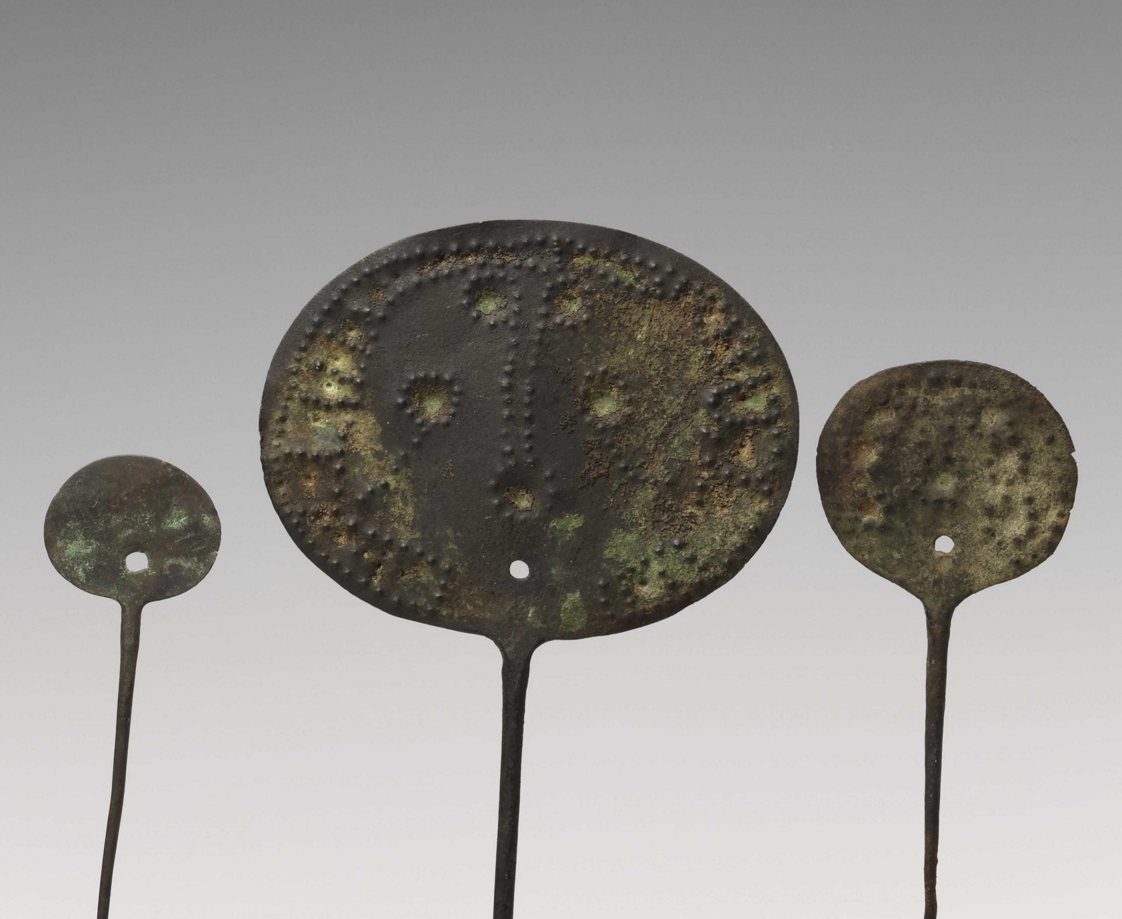 Middle East, a collection of three bronze clothing pins and three stone stamps, Bronze Age Period.