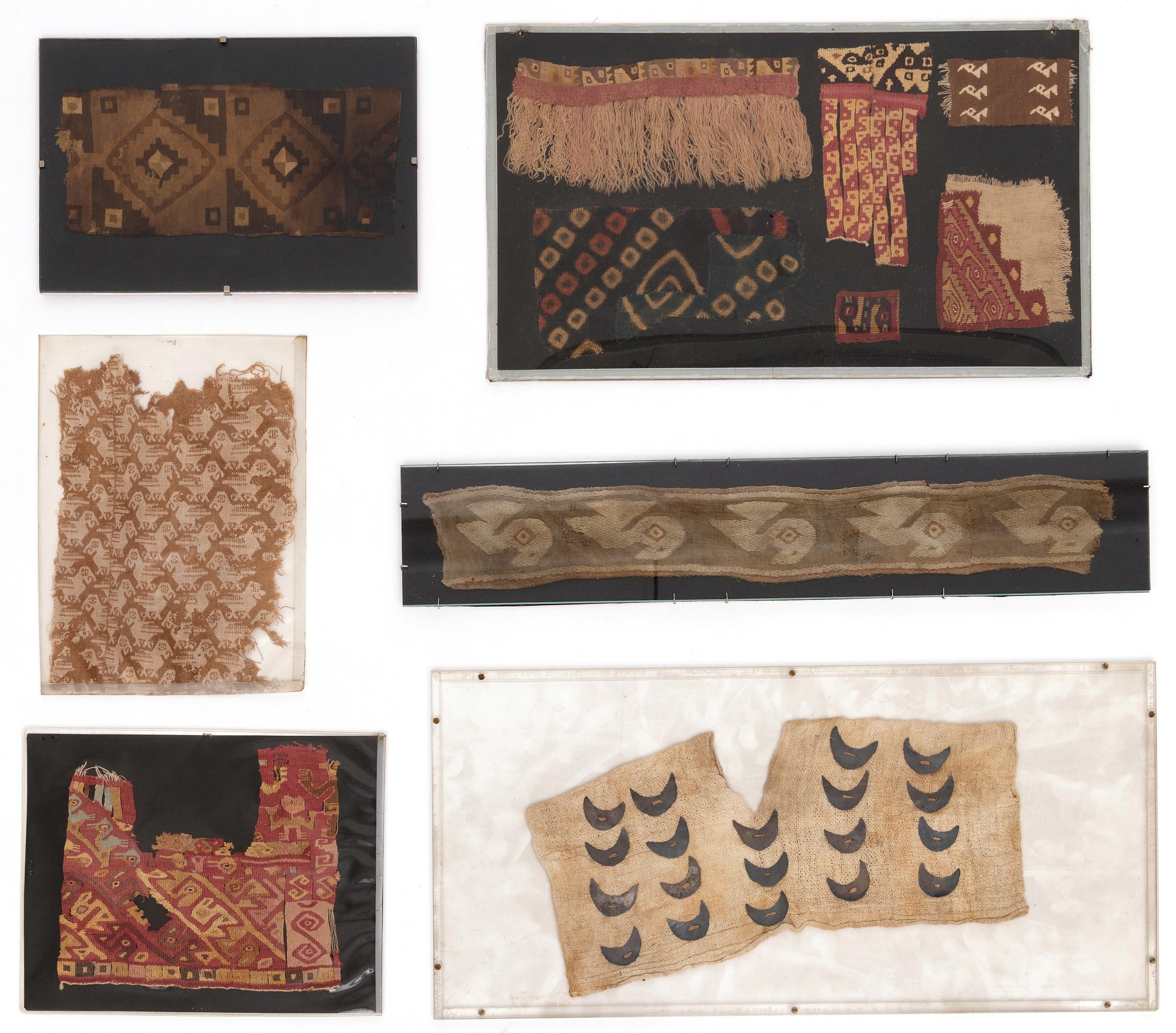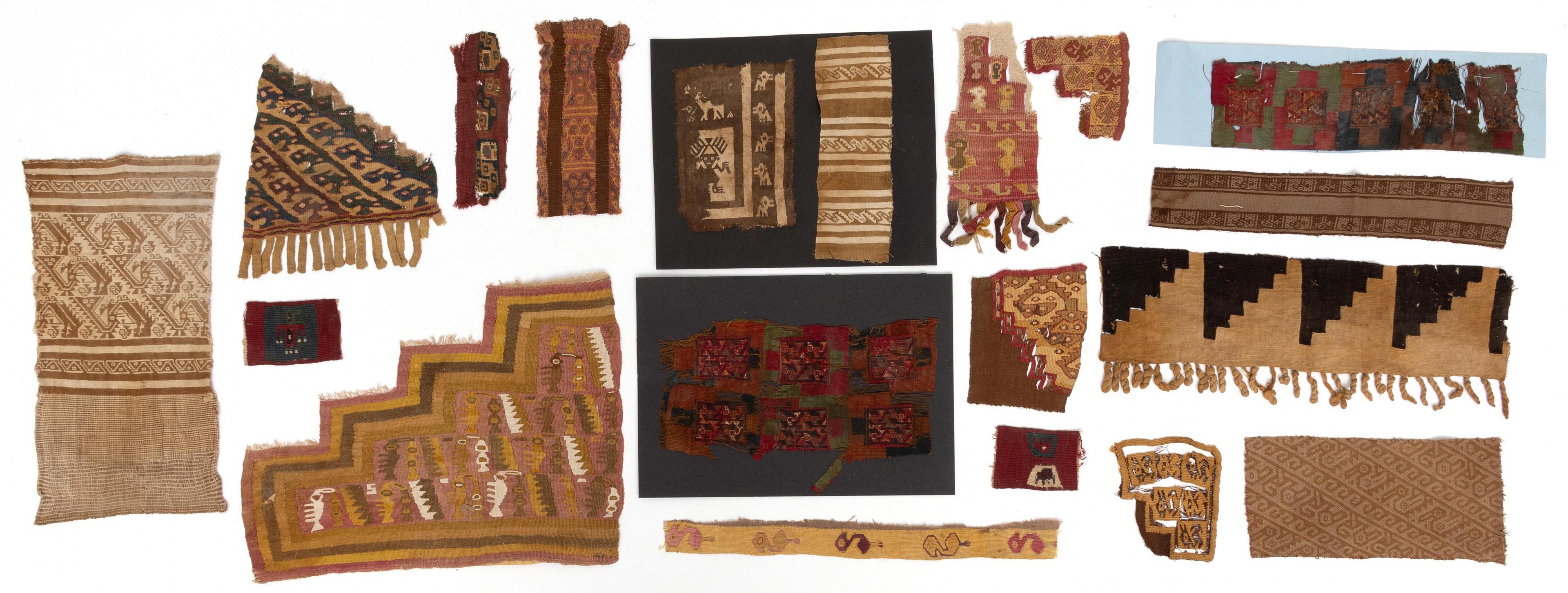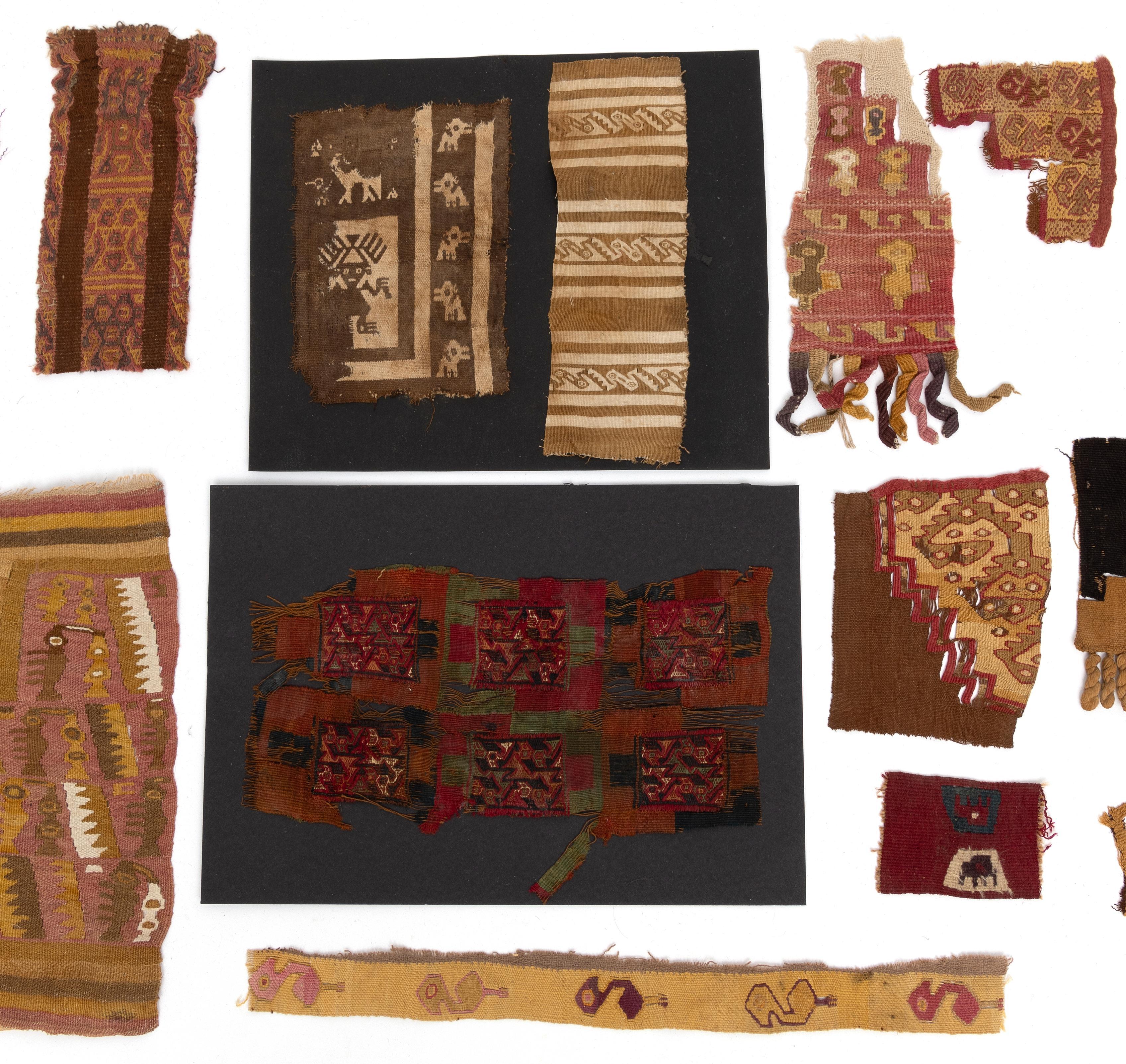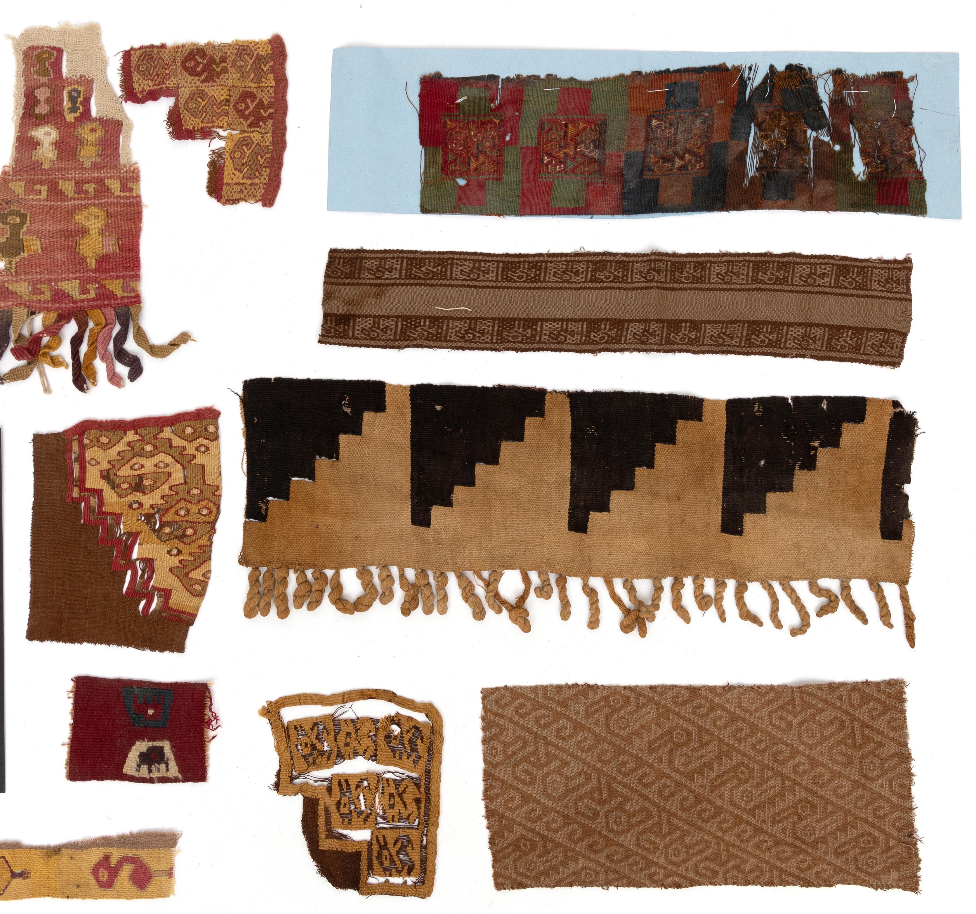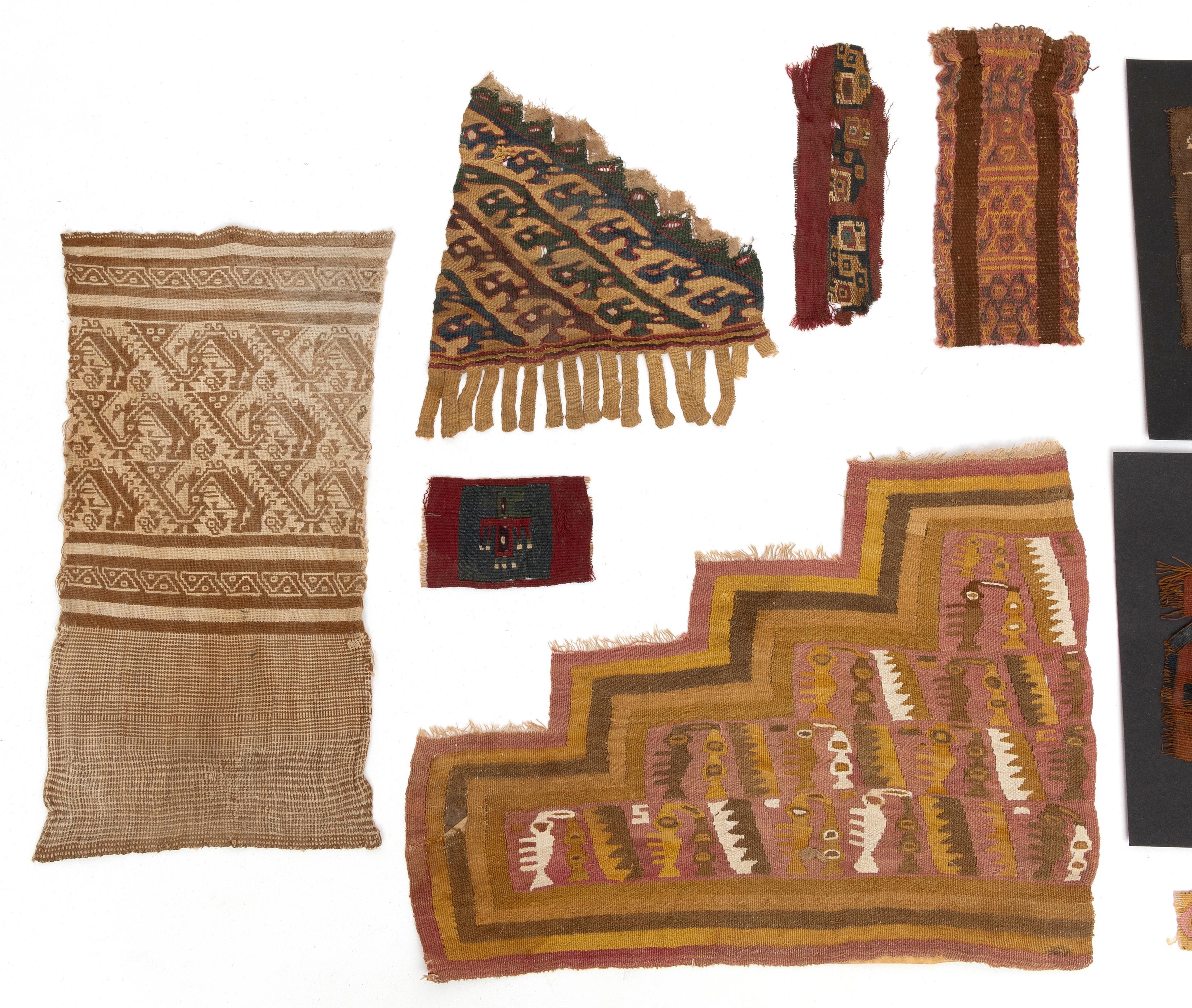 A collection of Peruvian pre-Columbian textile fragments from the Chancay and Nazca period.