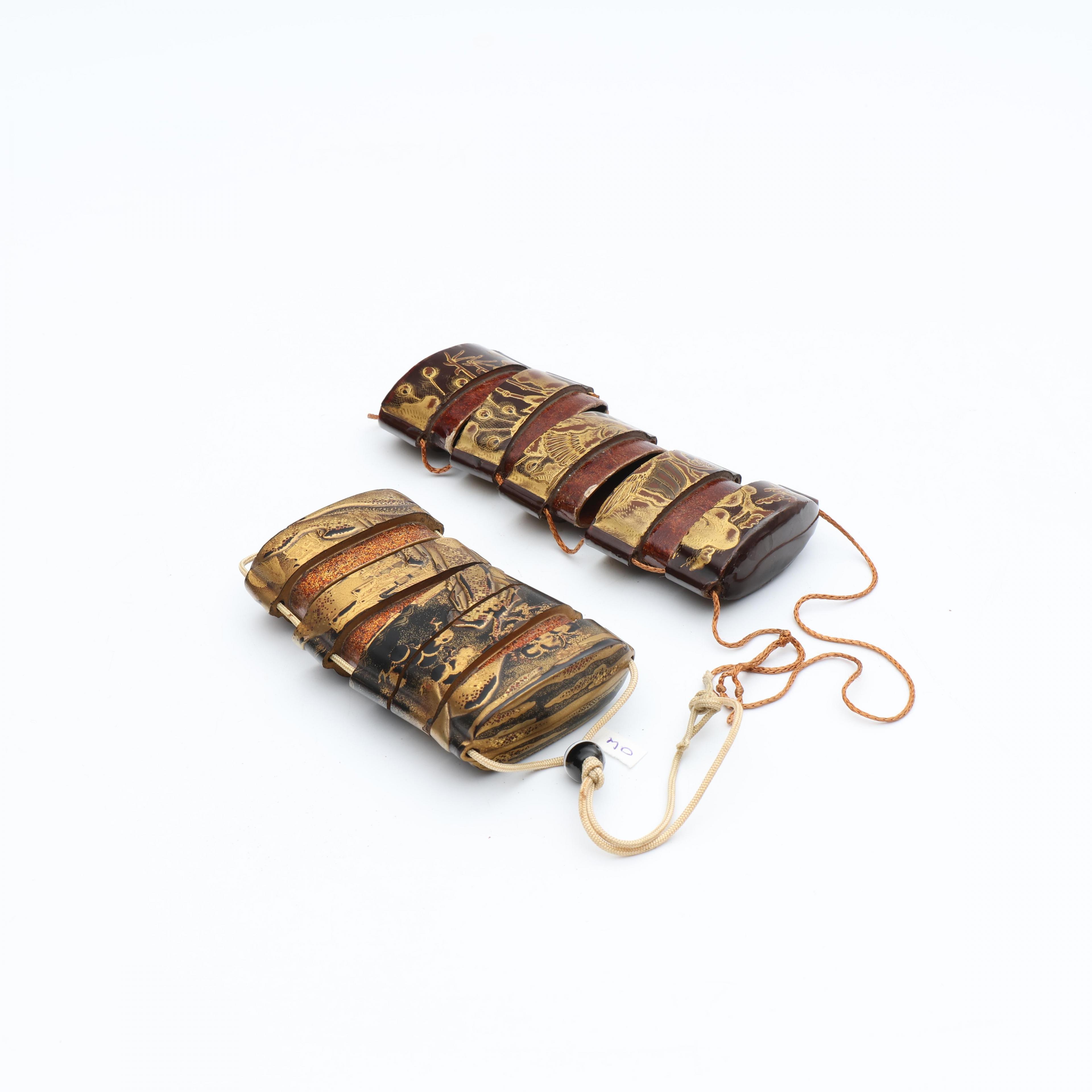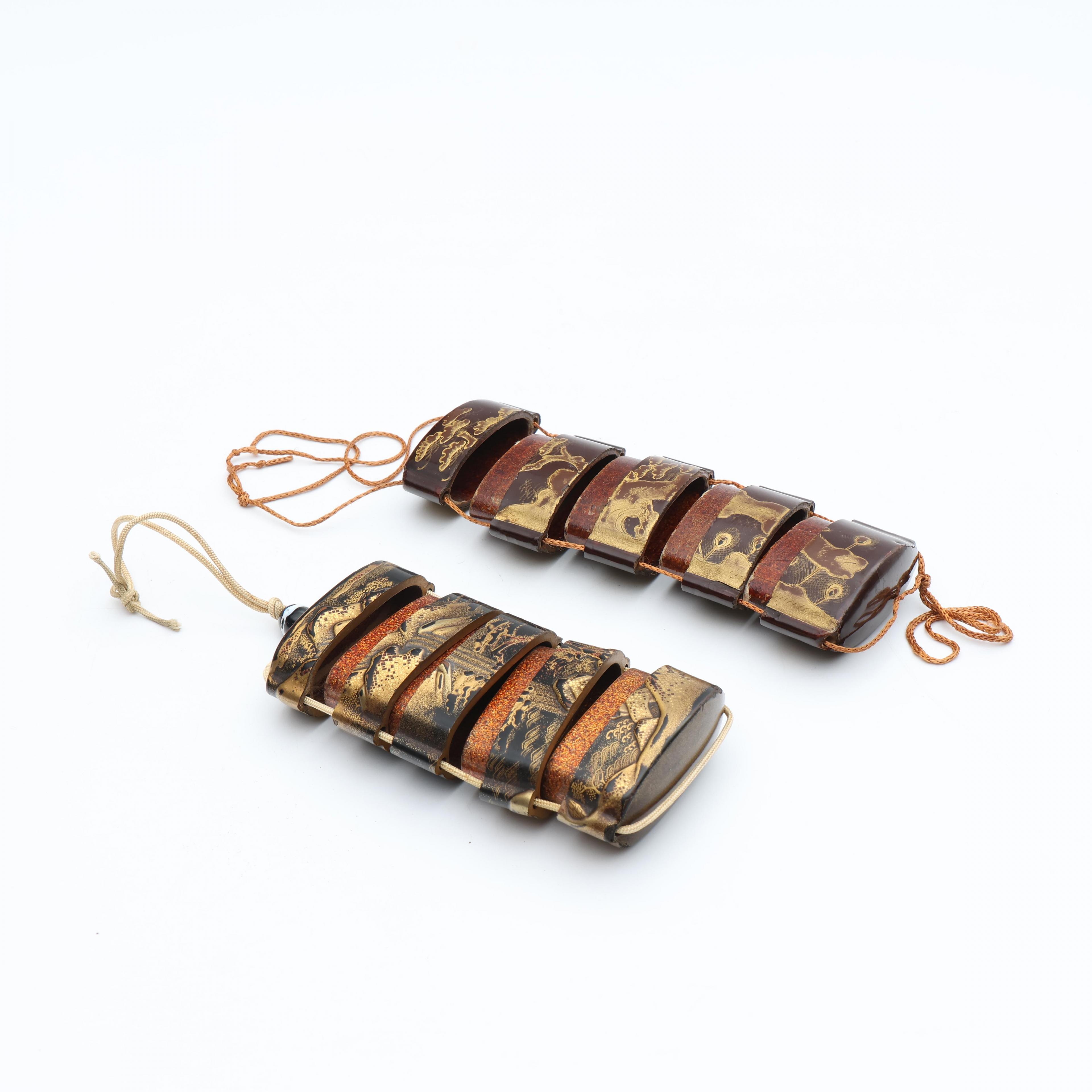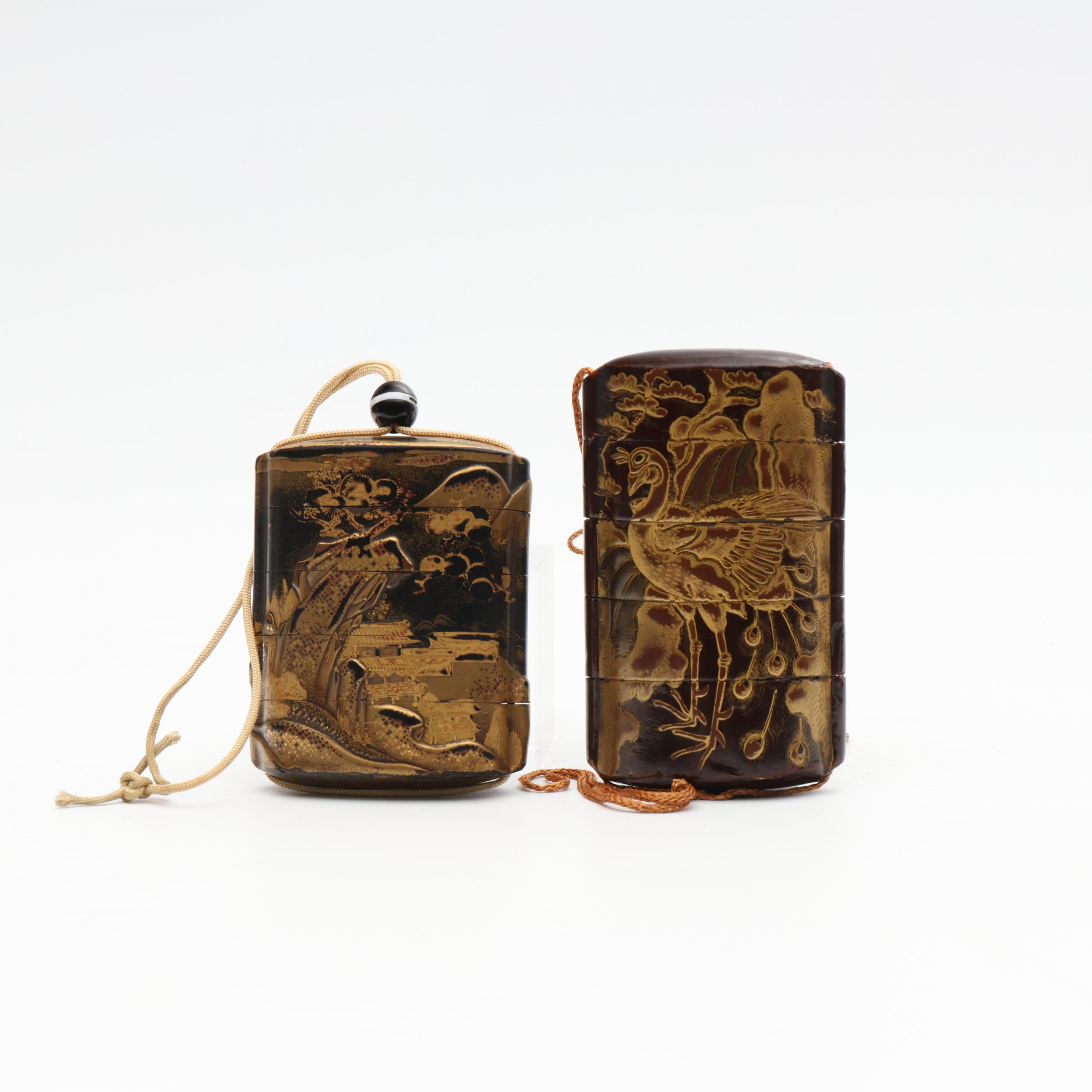 one decorated in gold hiramakie and takamakie and kimpaku with pavilions in a mountain landscape, the other with gold and red lacquer makie with a peacock (some small nicks, some wear to the lacquer)