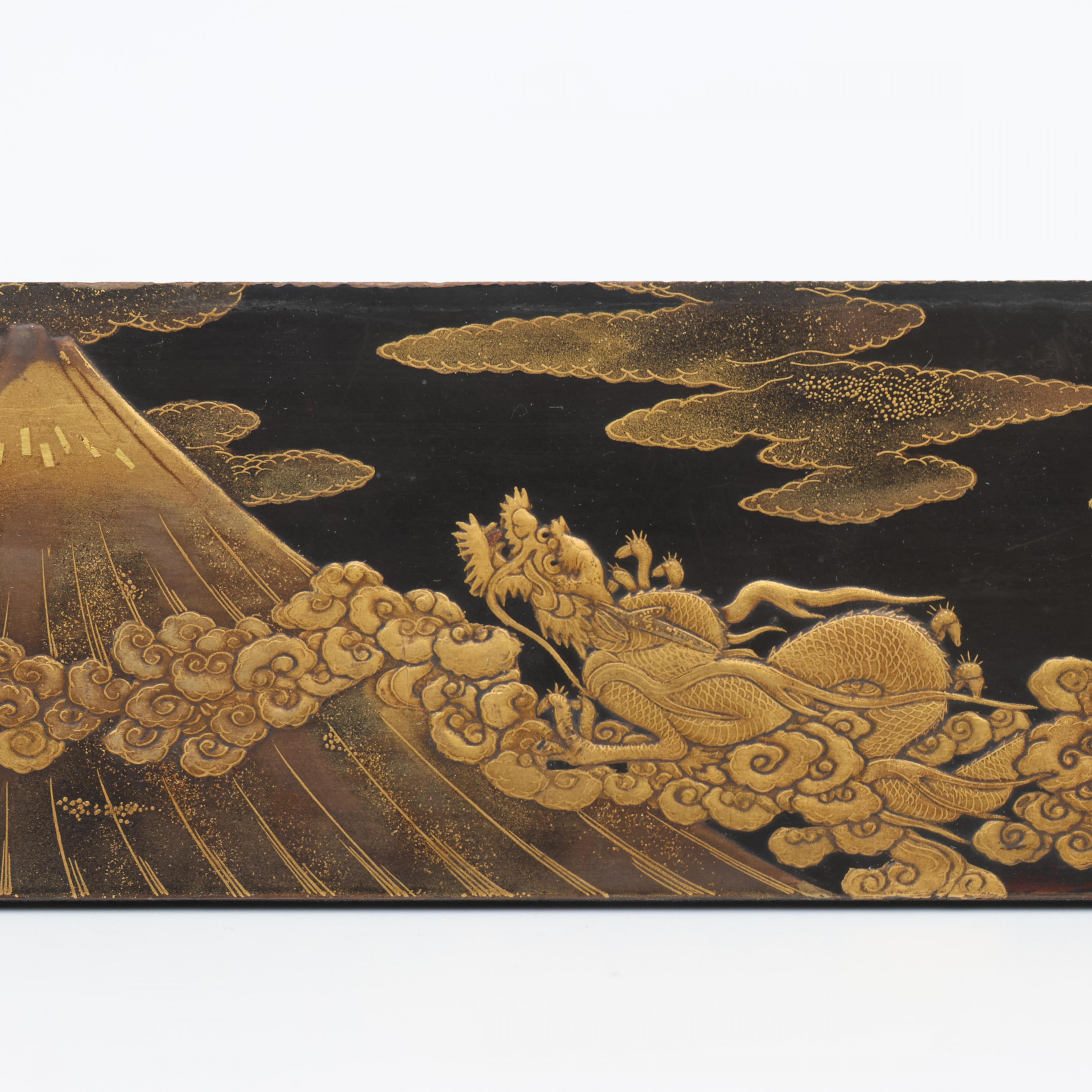 the tray decorated in gold hiramakie with fruiting branches and the panel in gold hiramakie, takamakie and togidashi makie with a dragon in the clouds near Mount Fuji (the tray with small restored chip to corner and a small loss to the rim, the panel with splits to the wood on the reverse)