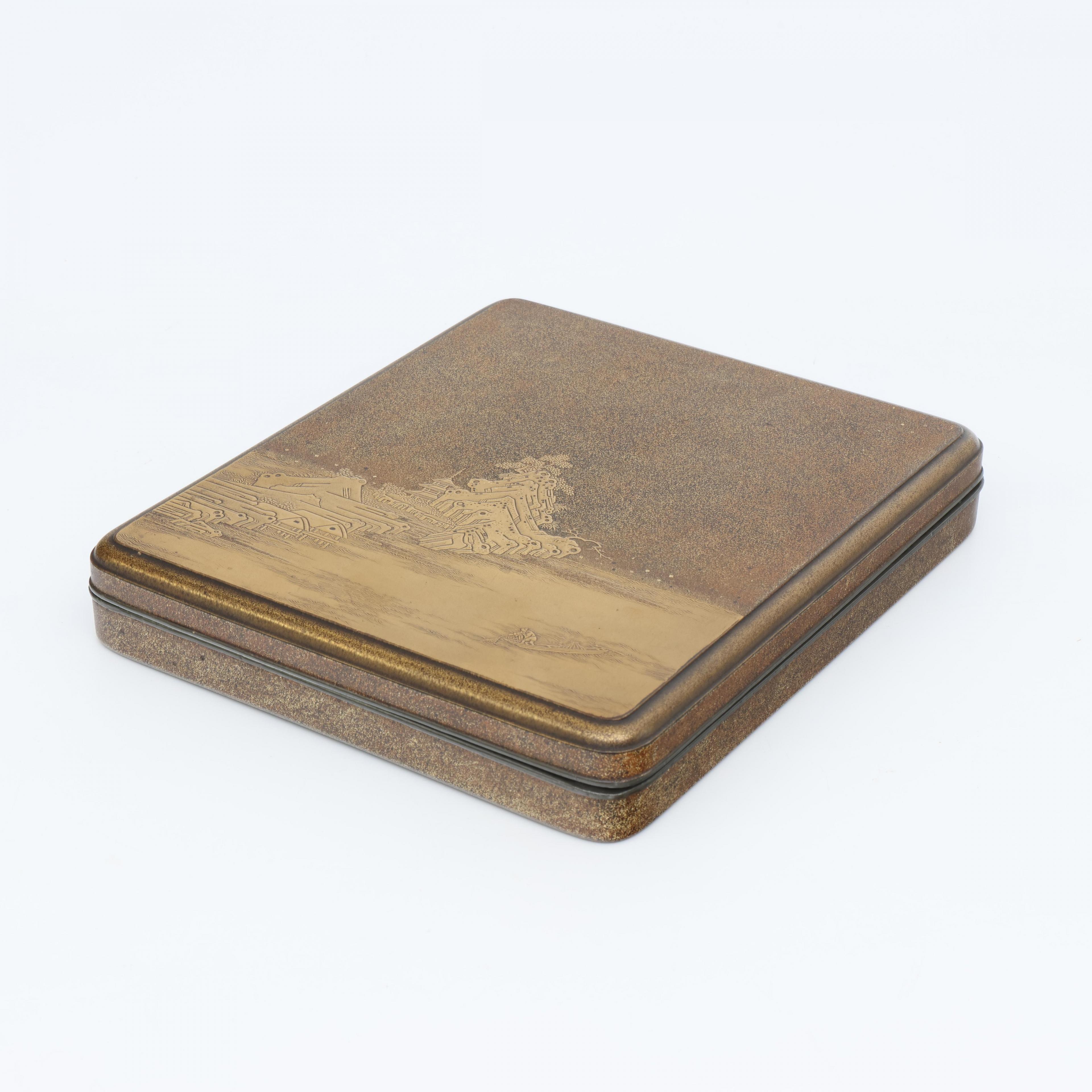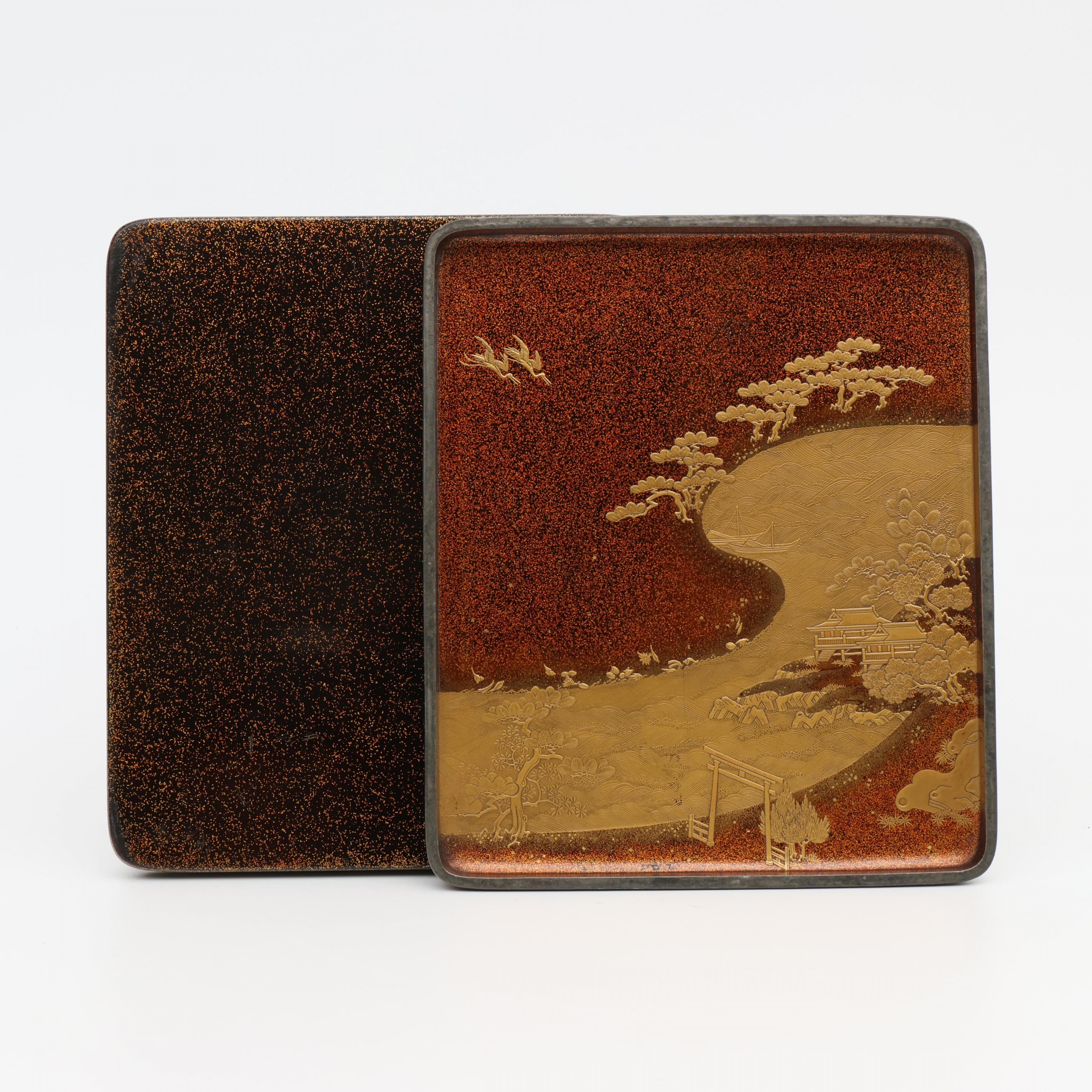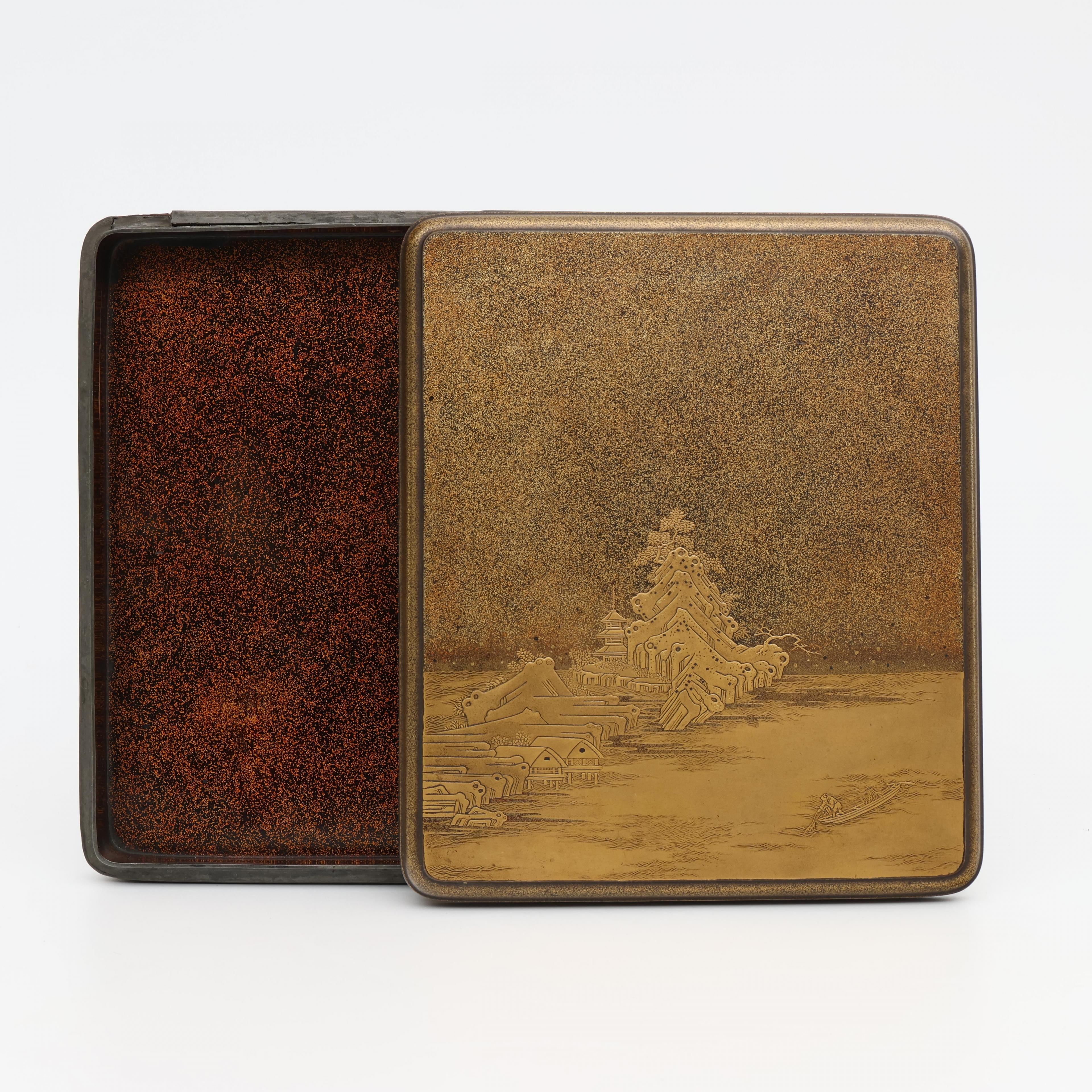 decorated in makie and gold leaf with a fisherman on a river beside a small village with pagoda and pavilions, on a nashiji ground, the decoration continuing into the interior cover with a river with pavilions and a temple gate, the interior with nashiji sprinkles on a black ground (some wear)