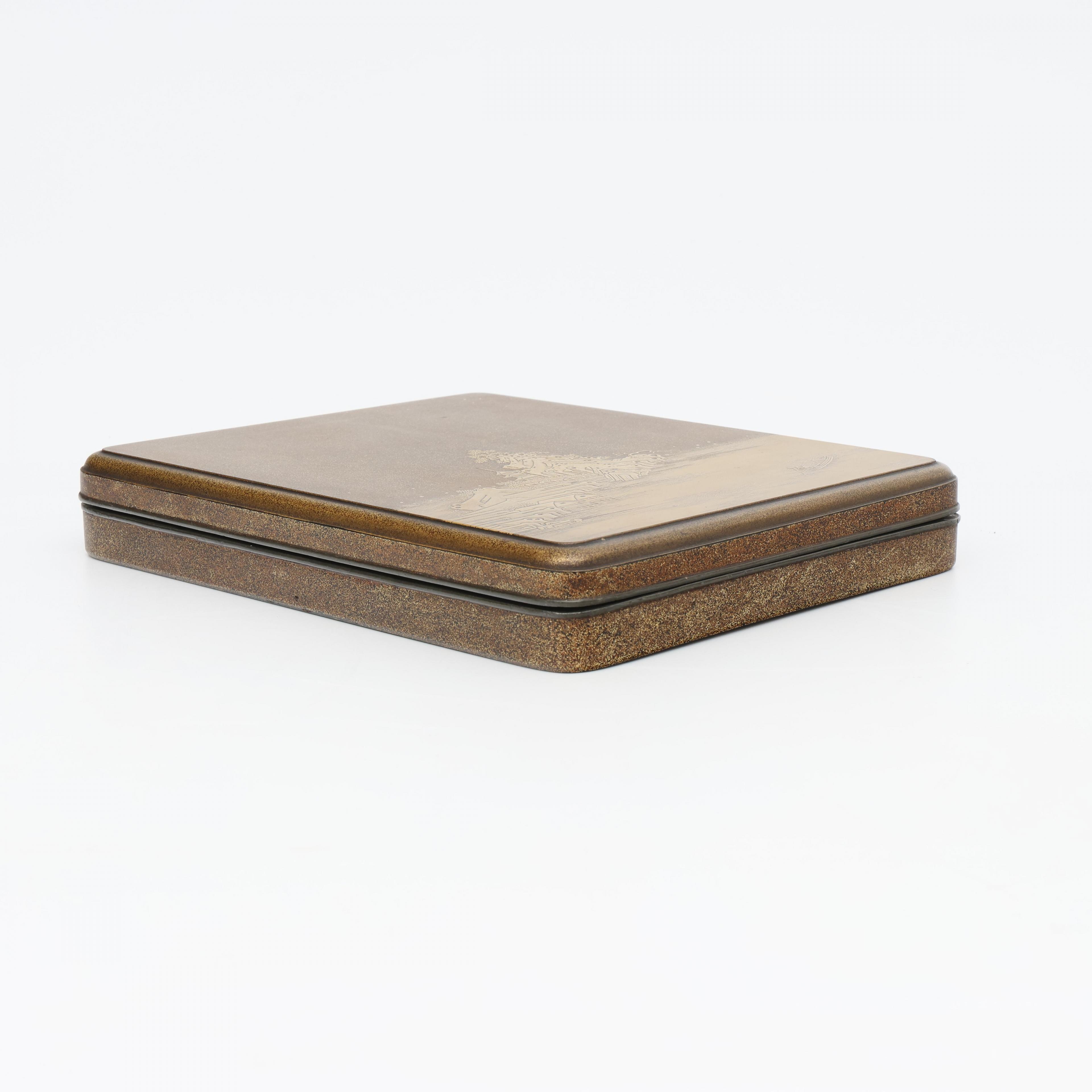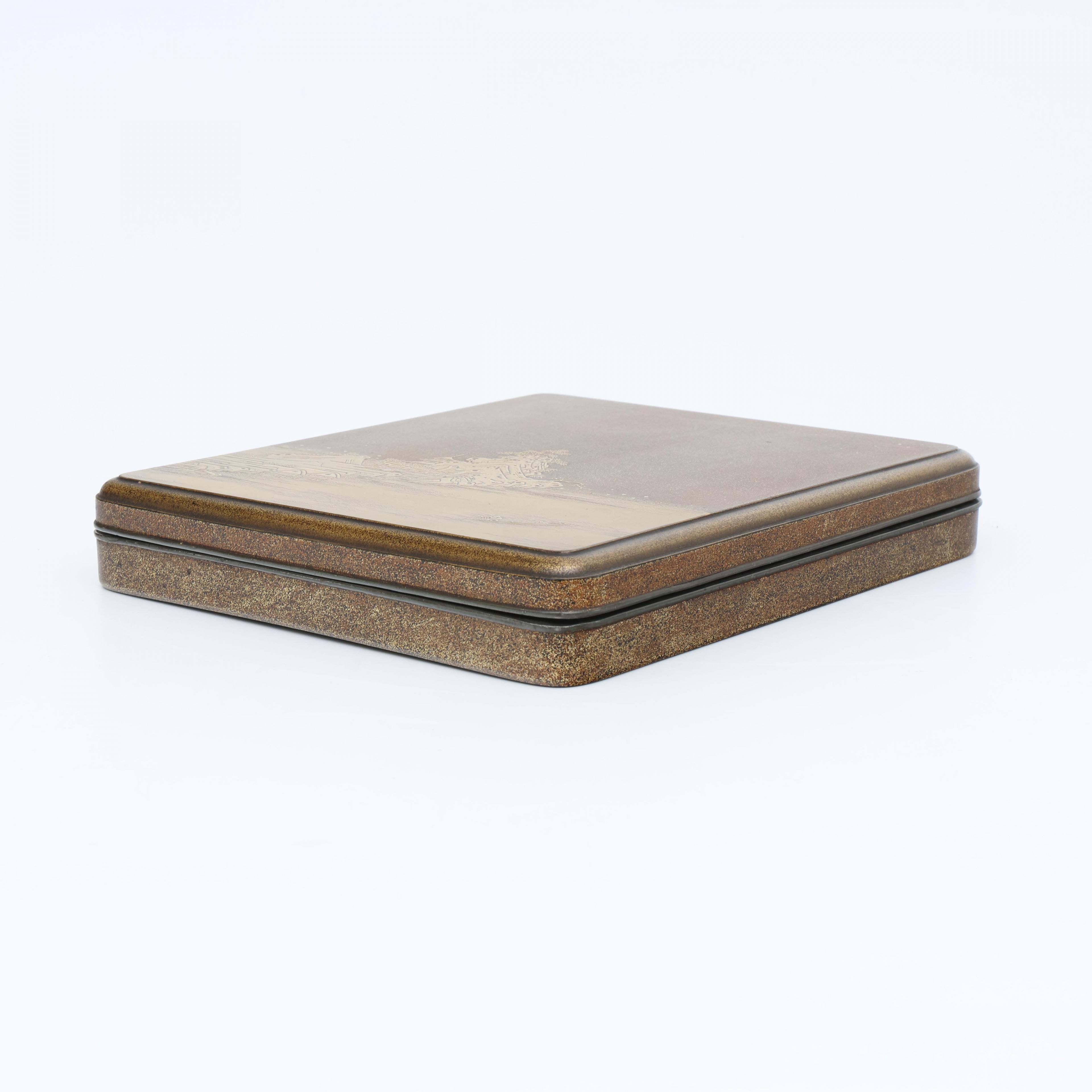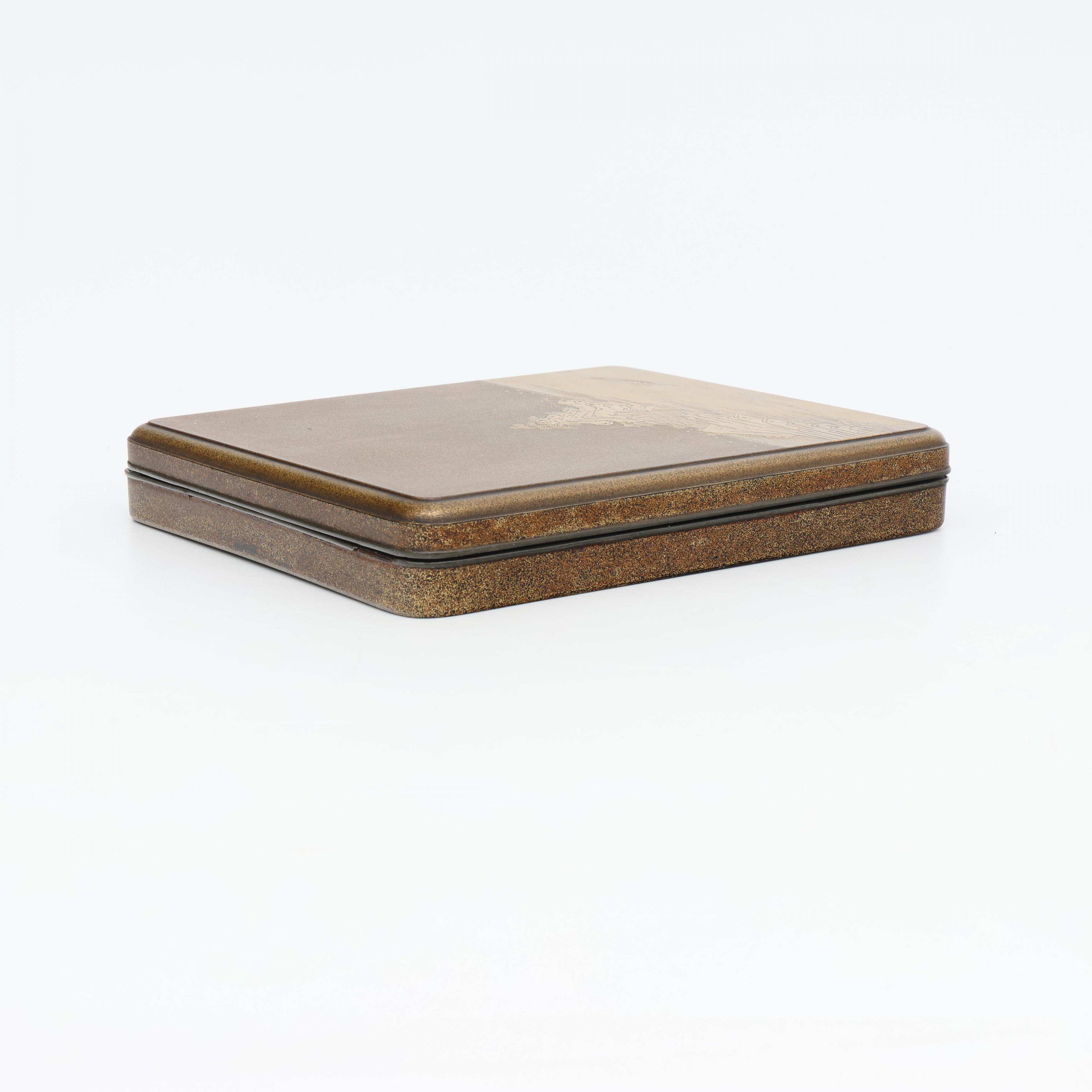 decorated in makie and gold leaf with a fisherman on a river beside a small village with pagoda and pavilions, on a nashiji ground, the decoration continuing into the interior cover with a river with pavilions and a temple gate, the interior with nashiji sprinkles on a black ground (some wear)