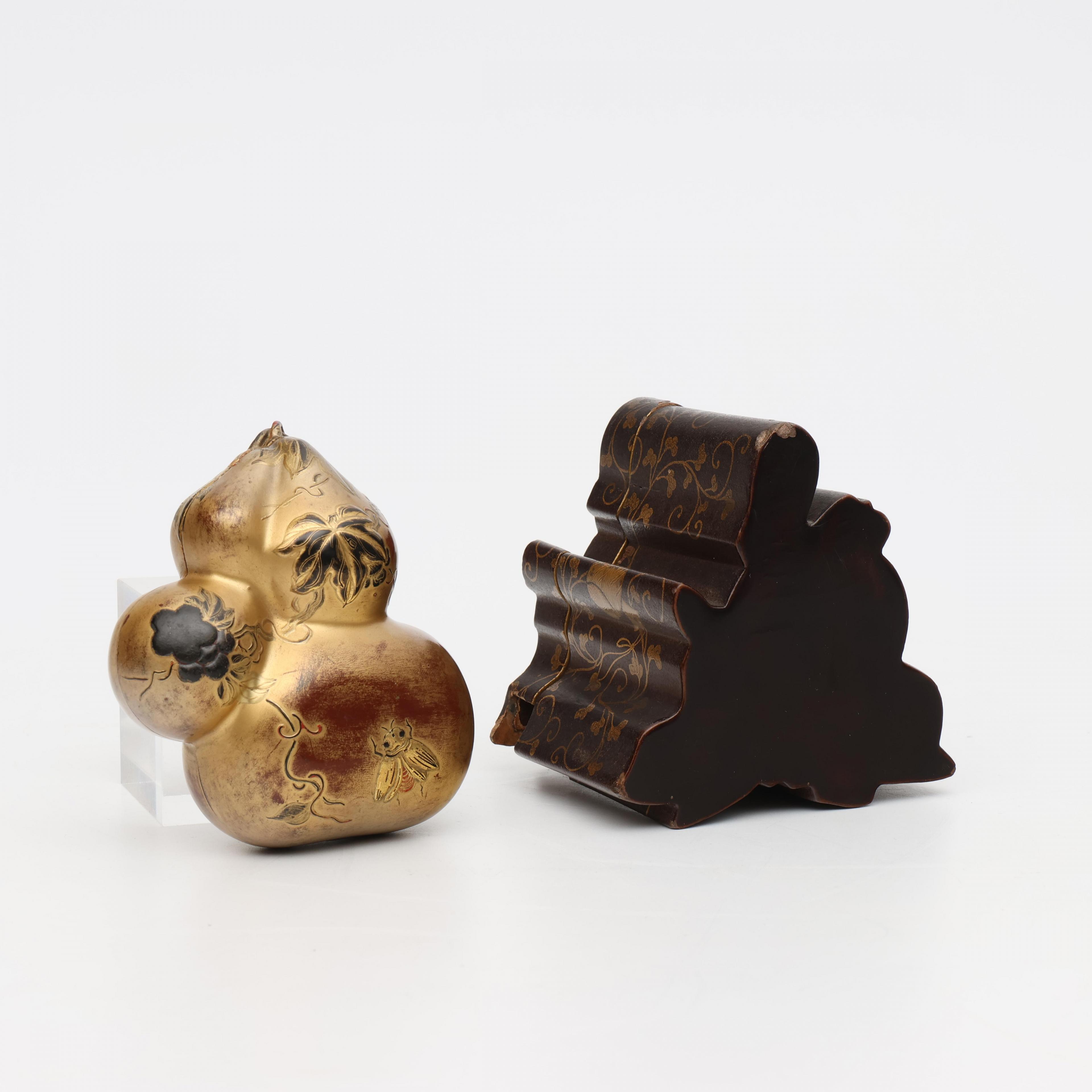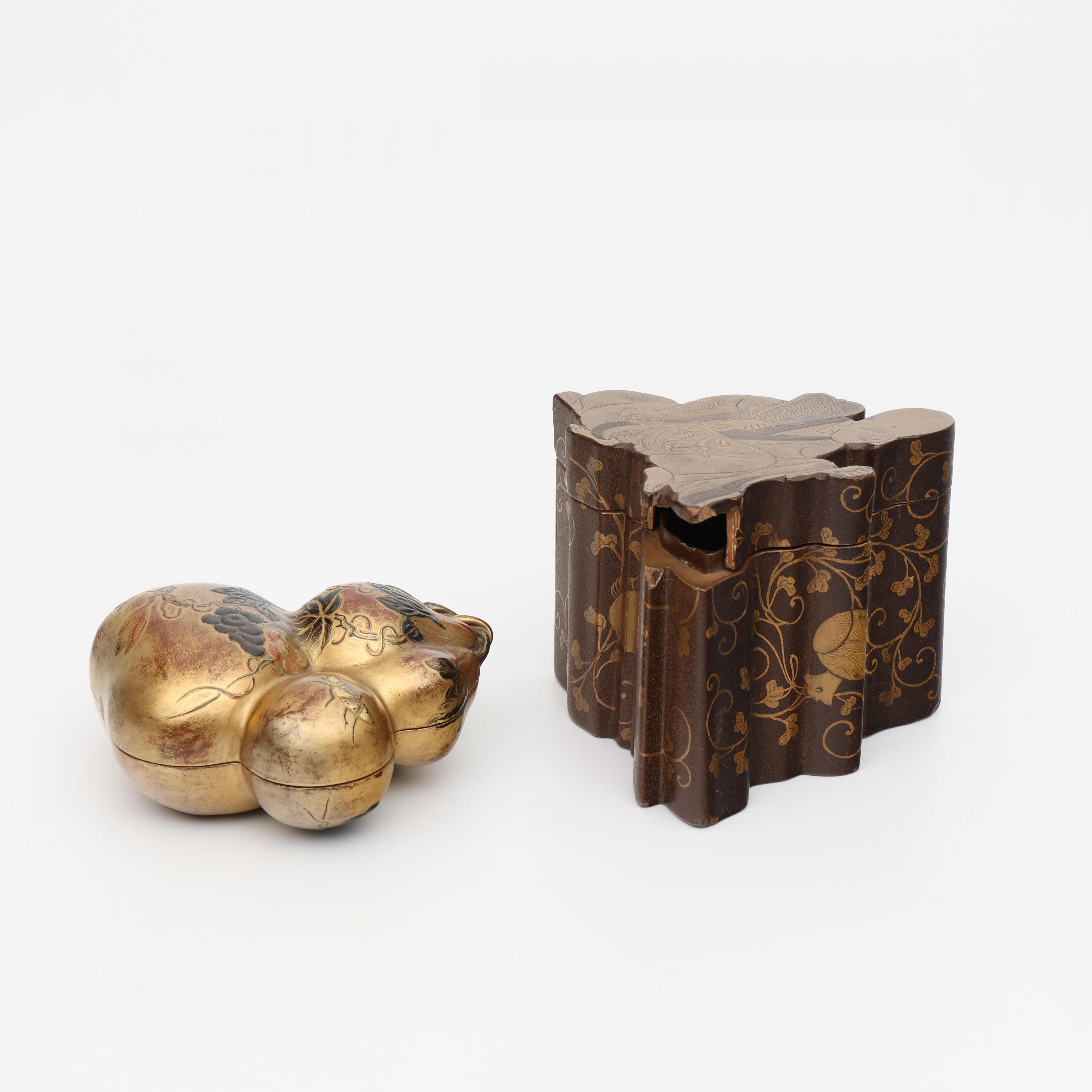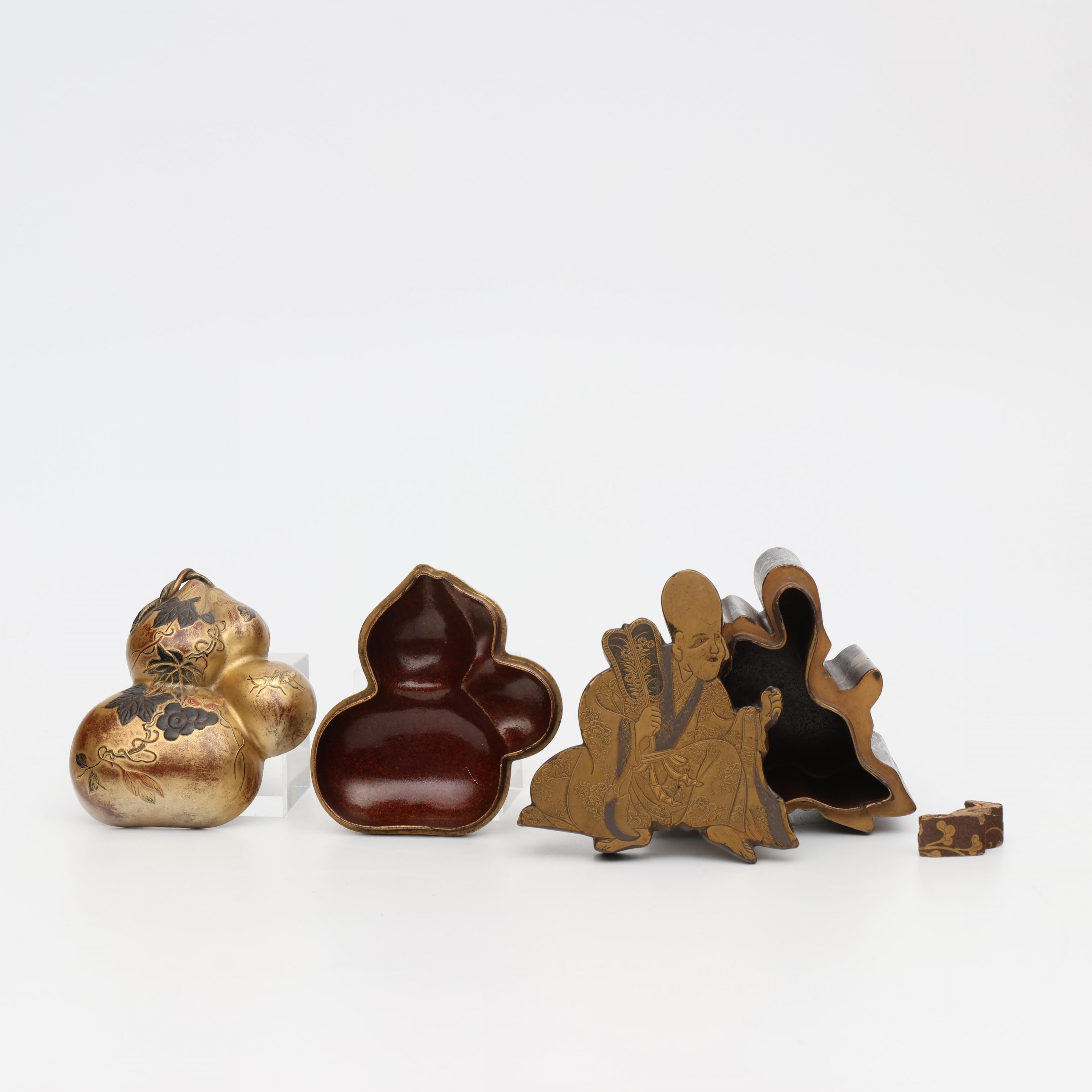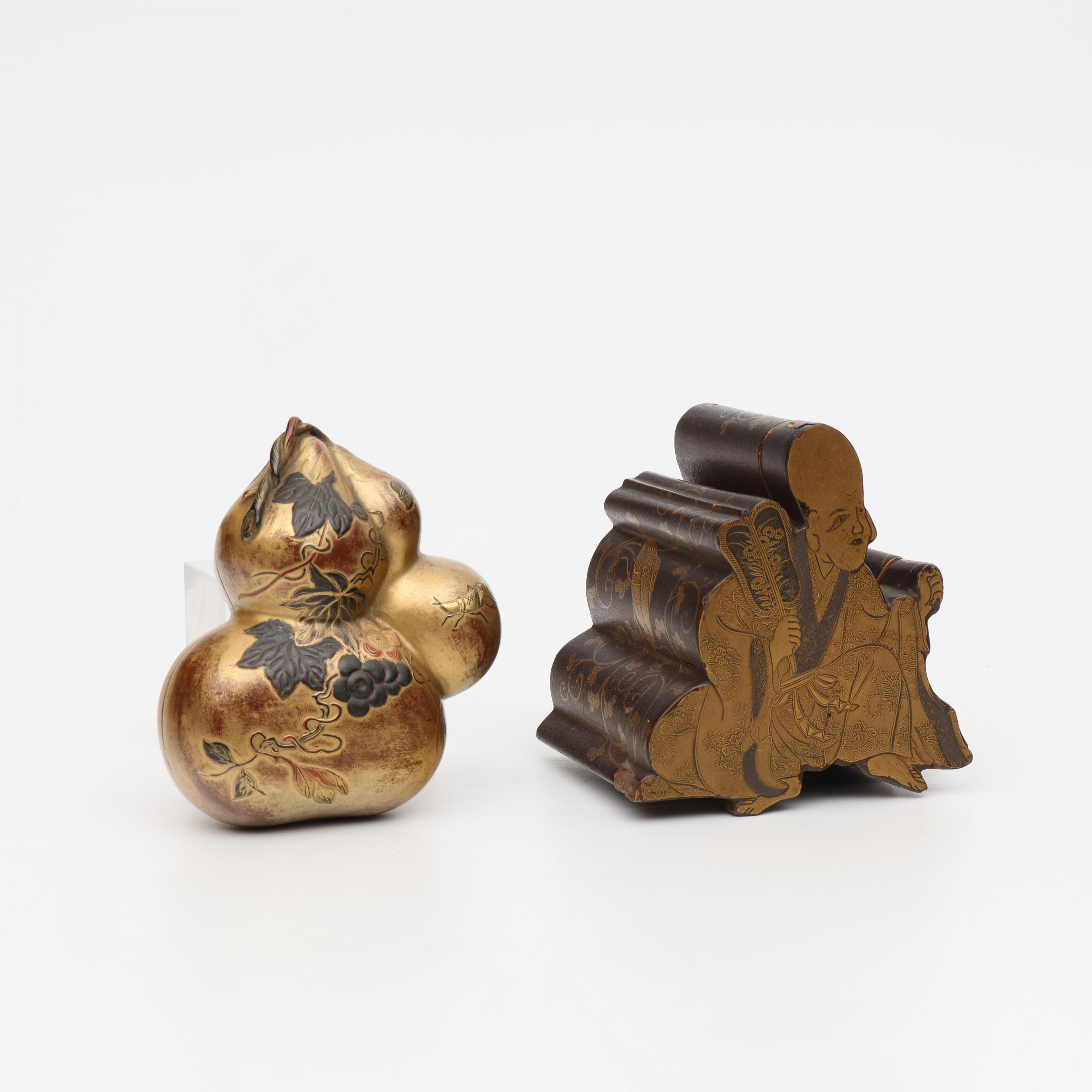 one shaped as a monk with fan, the other as a double gourd, both with makie decorations (the monk-shaped box with corner damaged (piece available), some small damages and repairs, the gourd box with small rim chips)