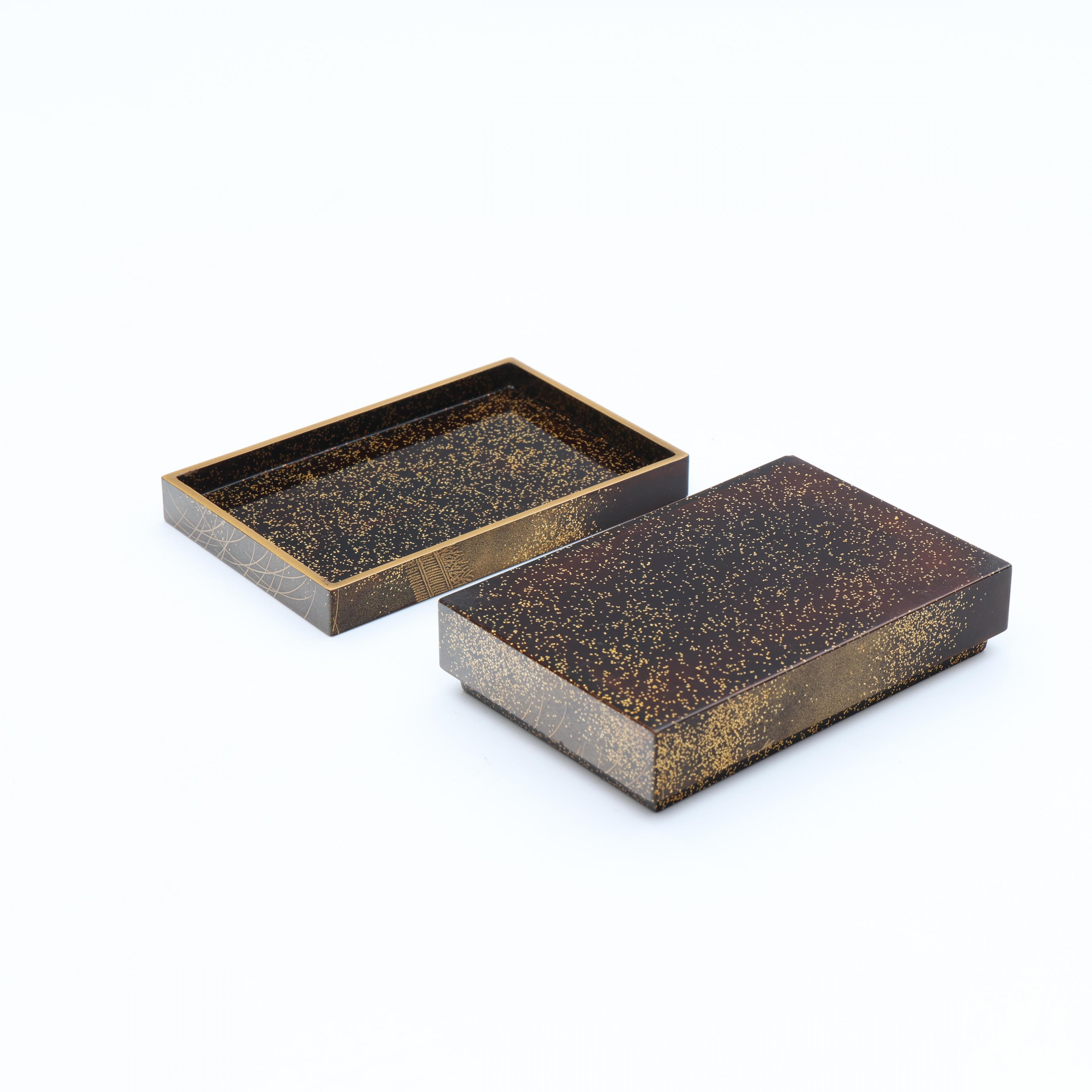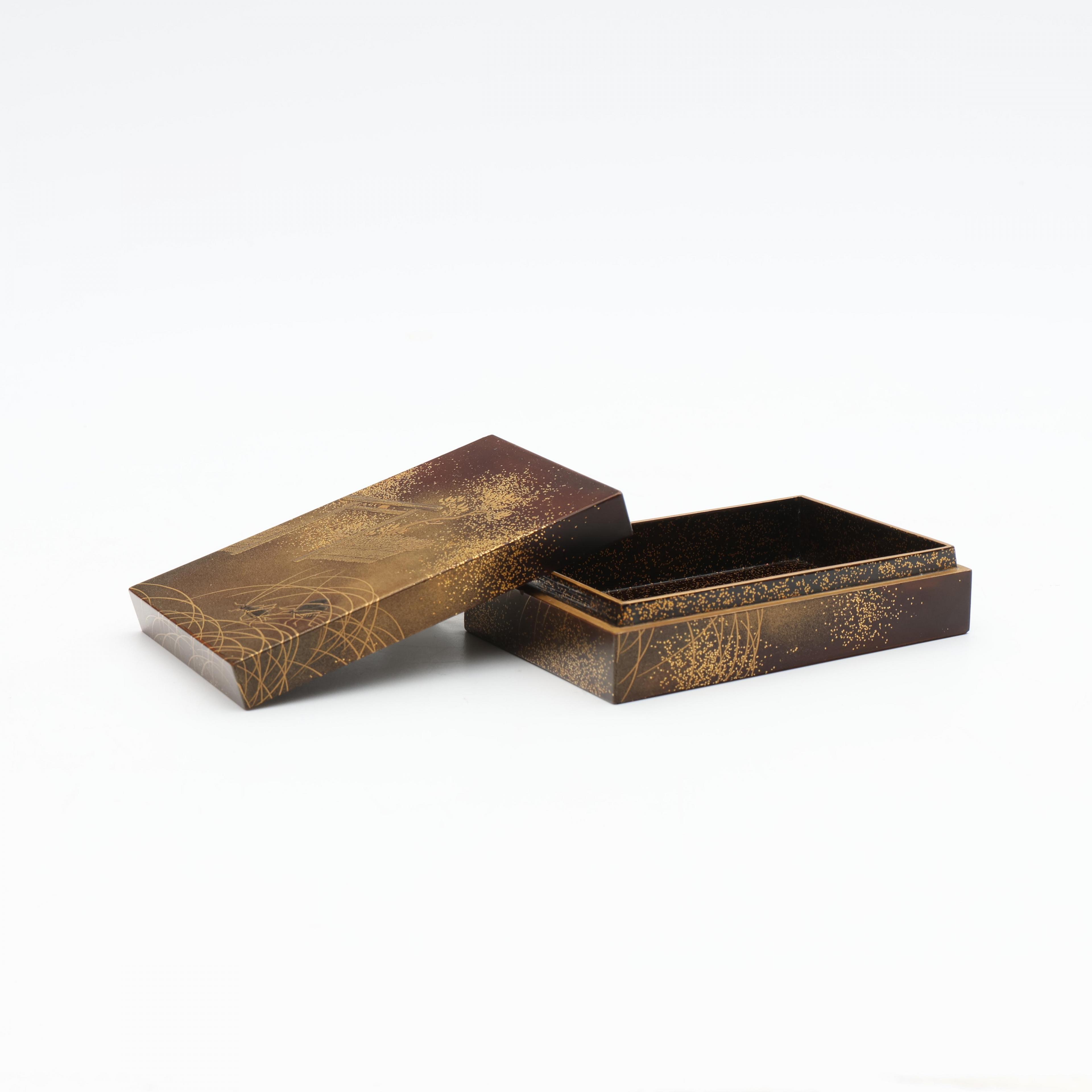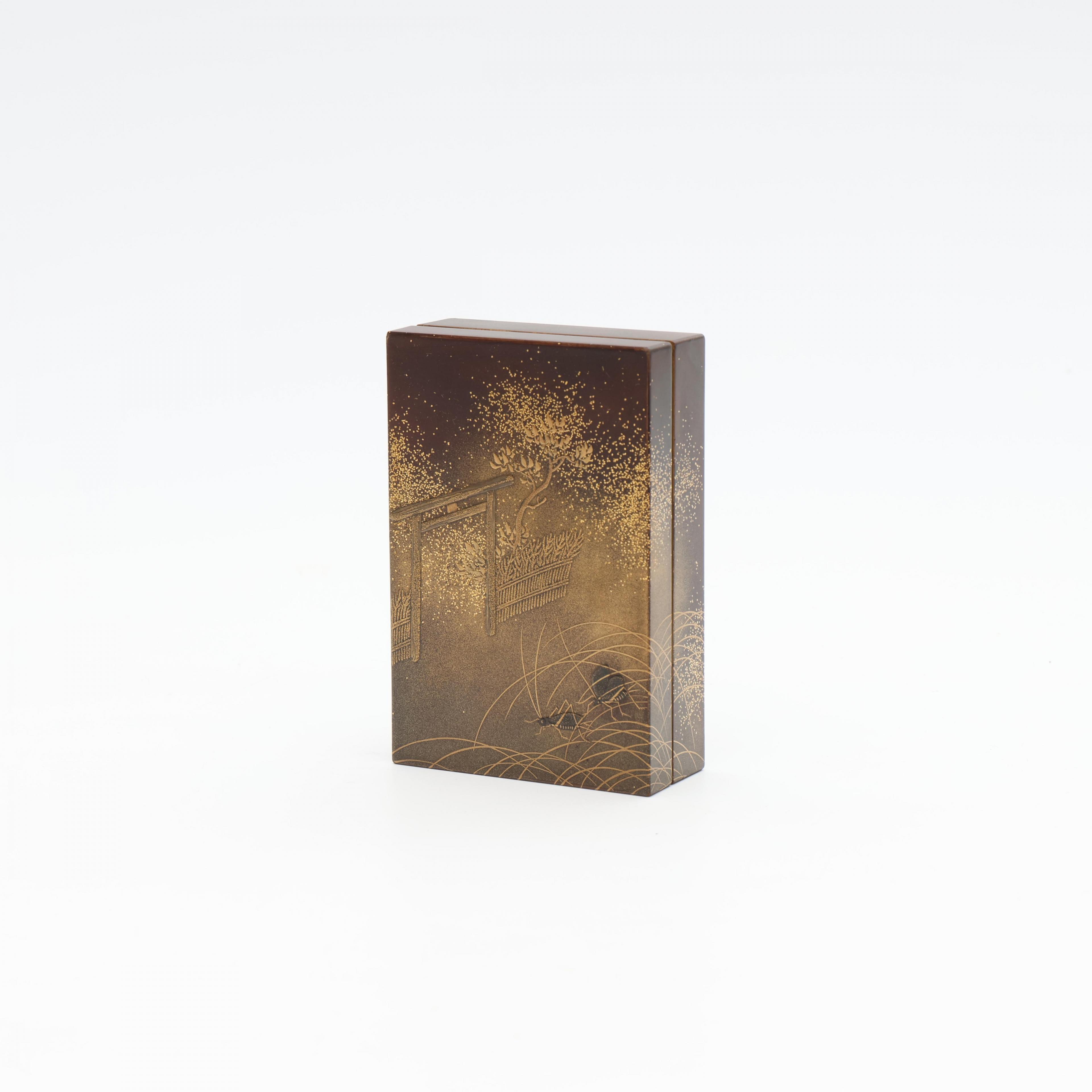 decorated in gold and black lacquer hiramaki and takamakie with two grasshoppers before a shrine, with nashiji sprinkles in the background, the base and interior with nashiji on a black lacquer ground (minute rim nicks)