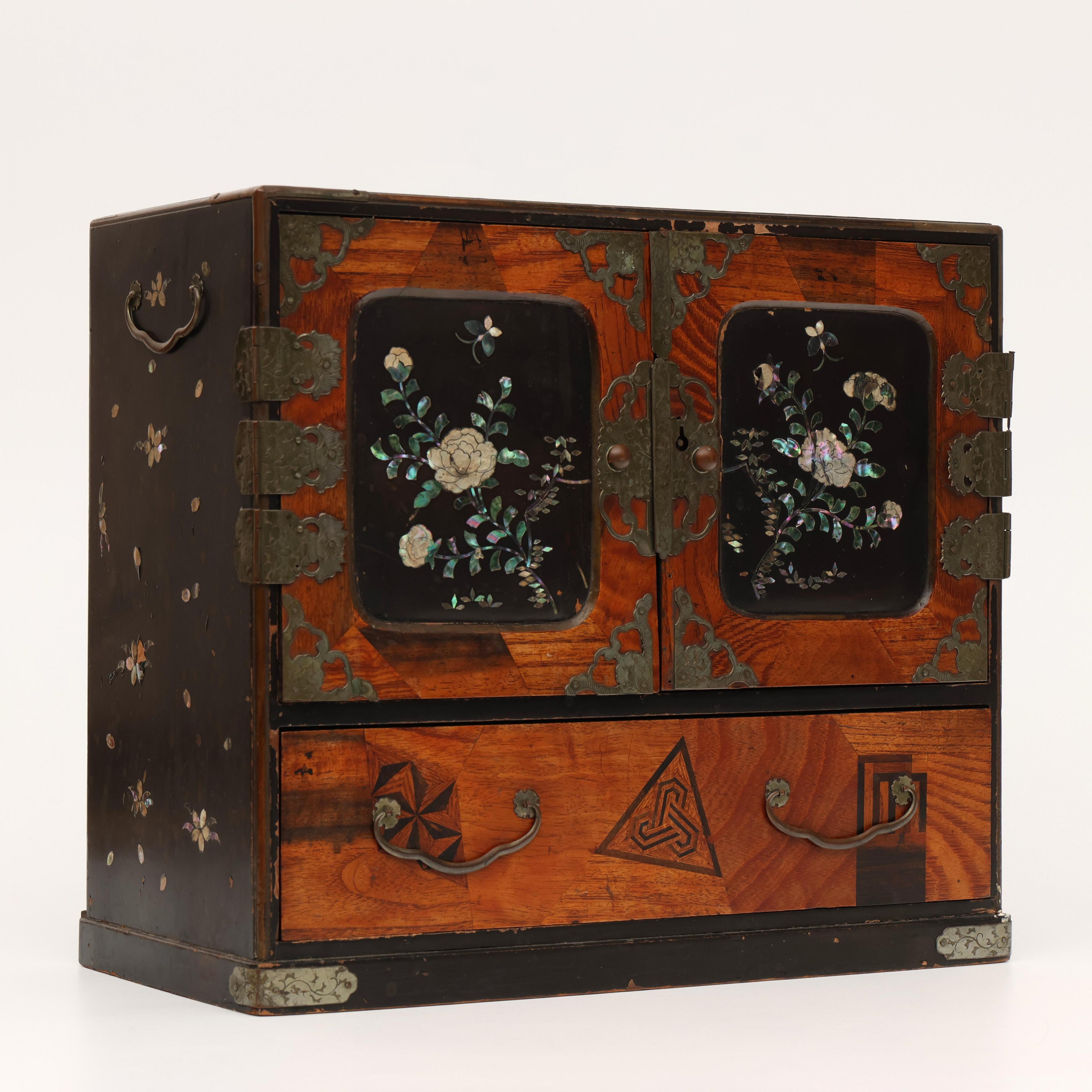 fitted with two doors revealing six drawers above a large drawers, inlaid with lacquer panels of aogai-inlaid flowers (some small damage and wear)