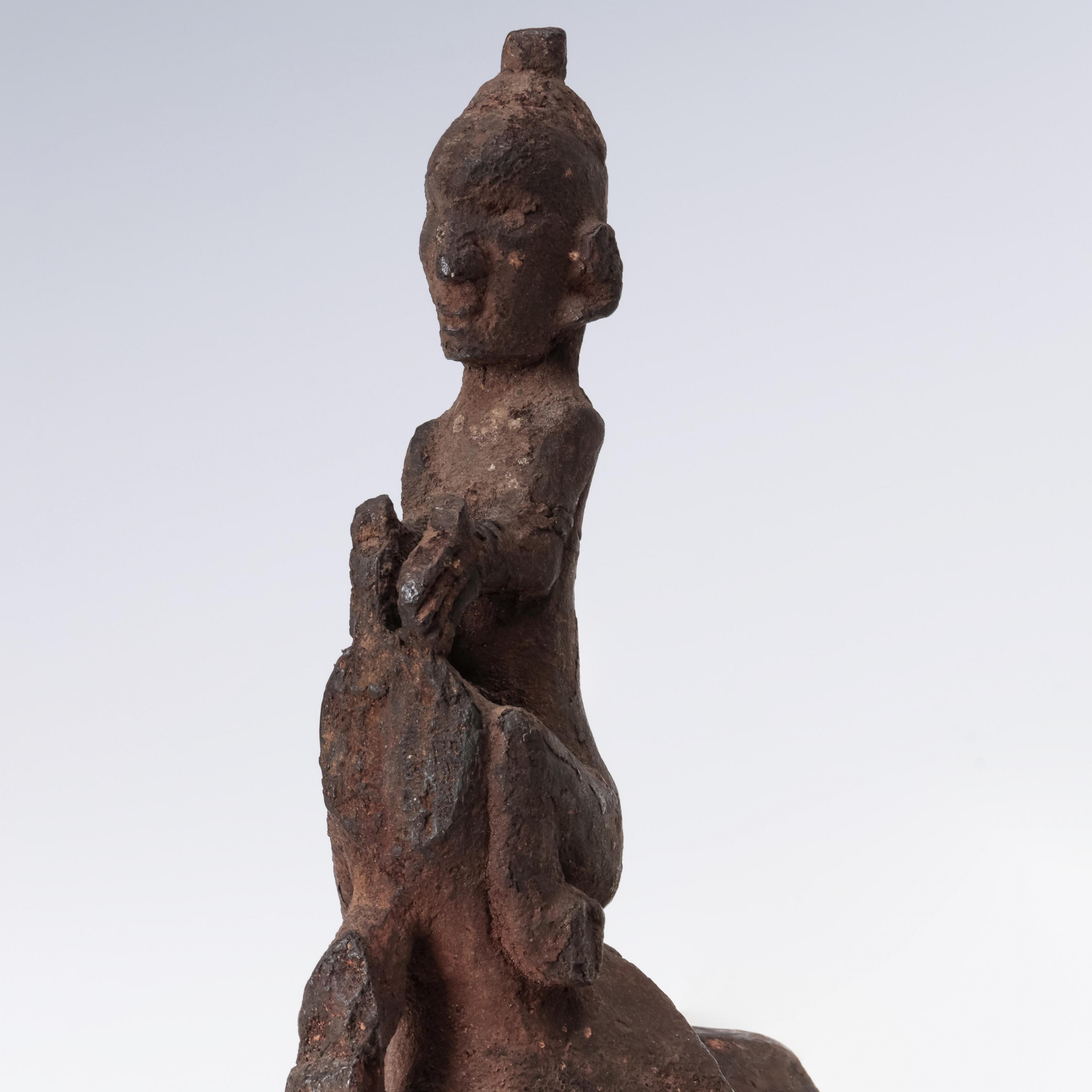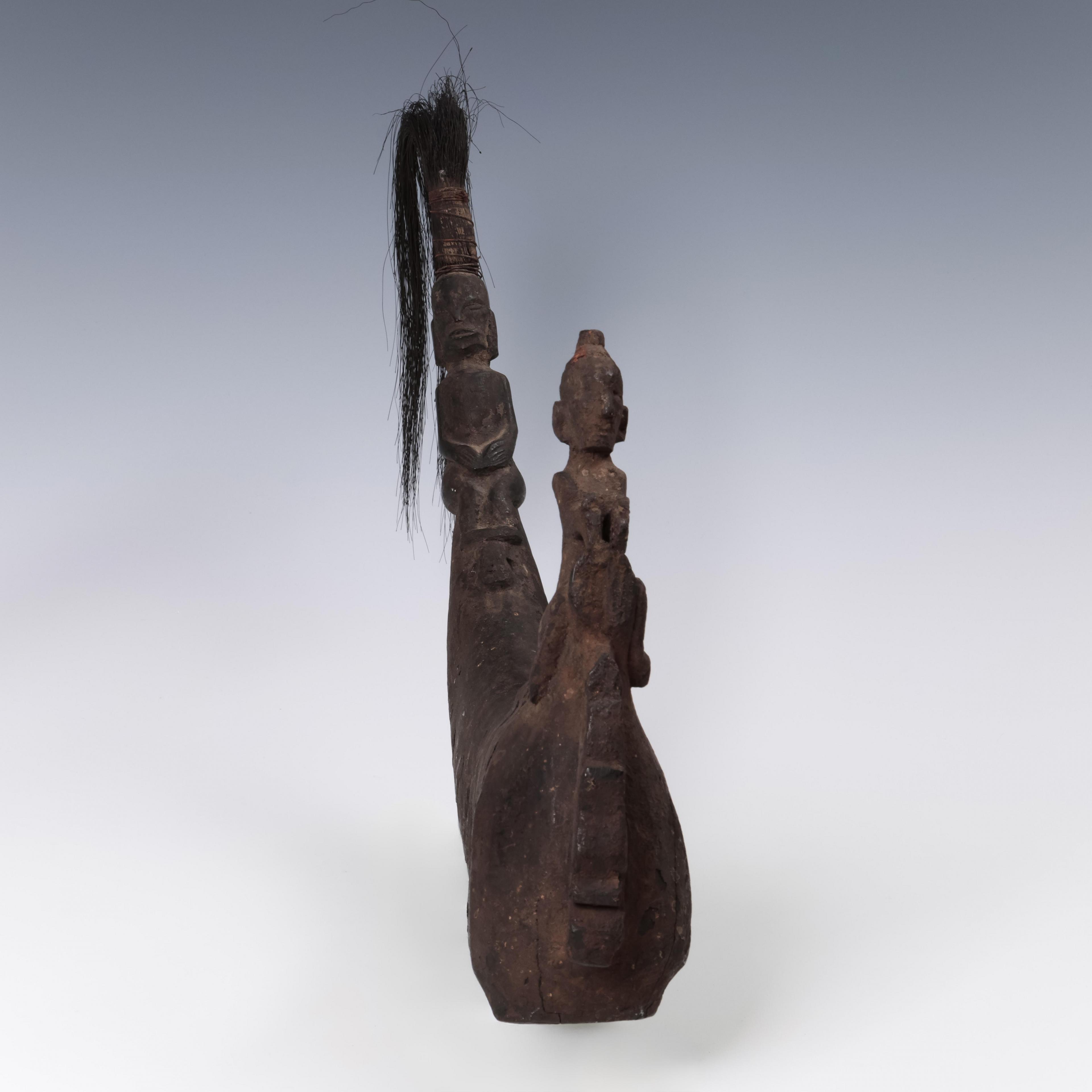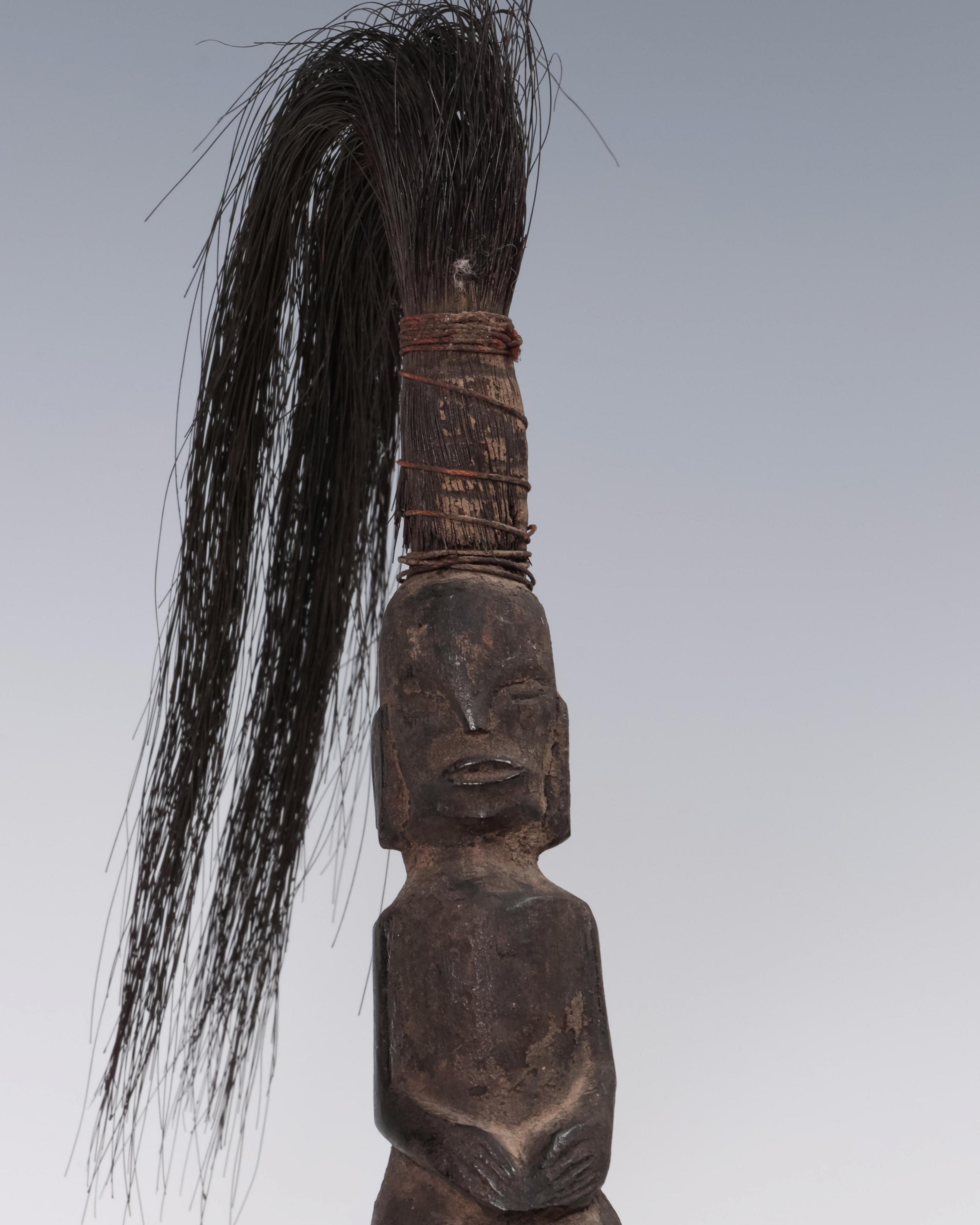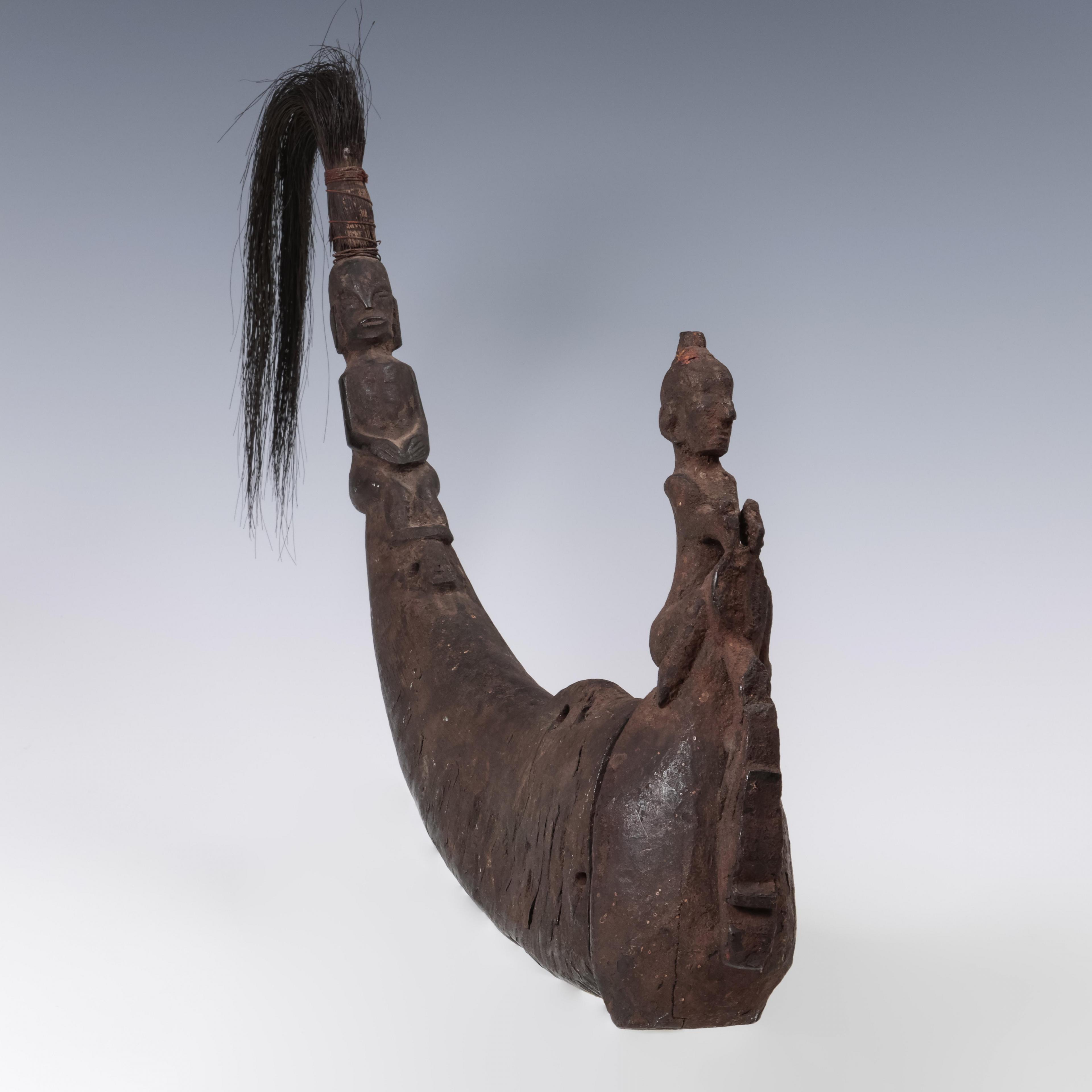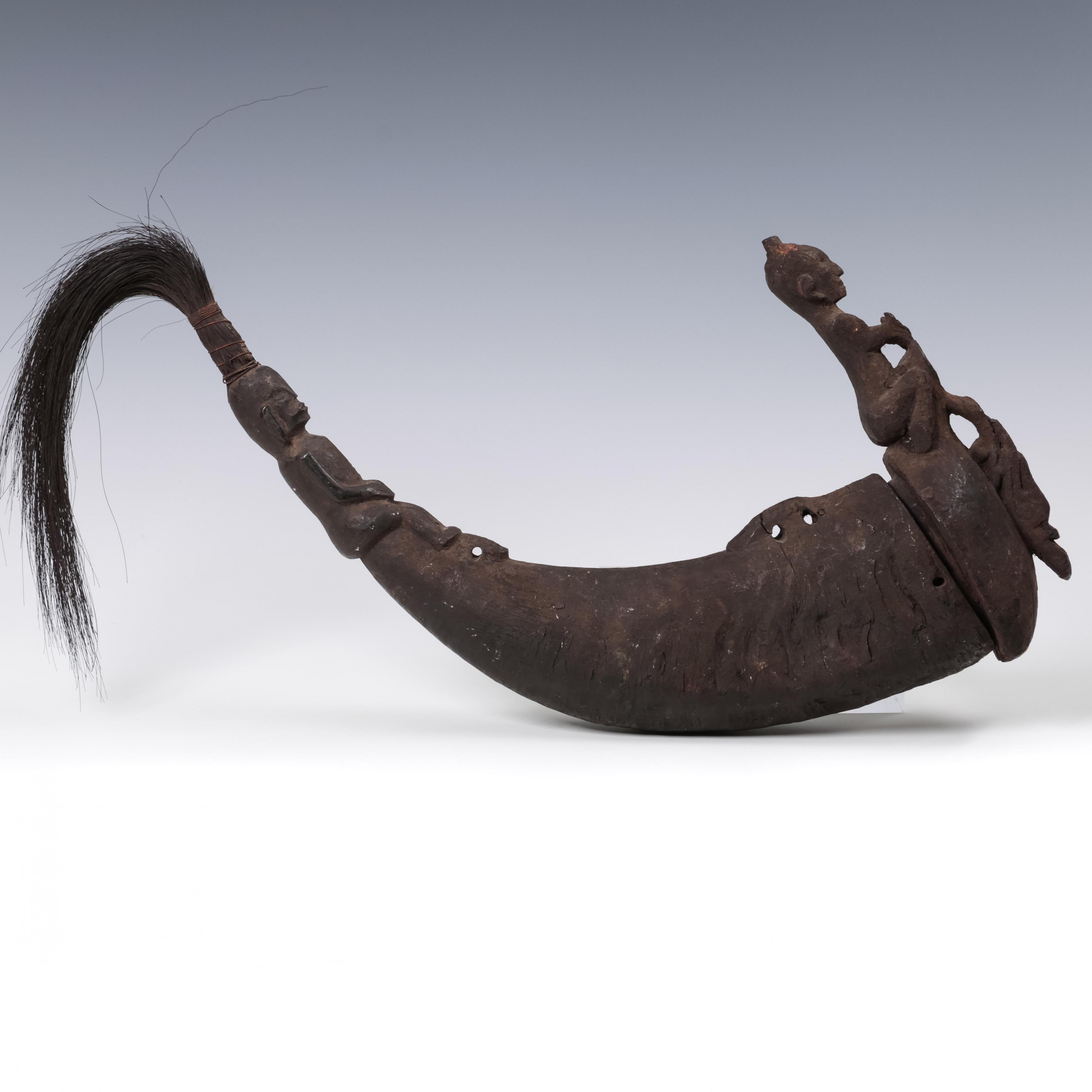 wooden lid, originally with a singa head now missing, a squatting anthropomorphic figure on the neck, water buffalo horn with seated anthropomorphic figure as finial, crowned by a tuft of ijuk, dry encrusted patina.