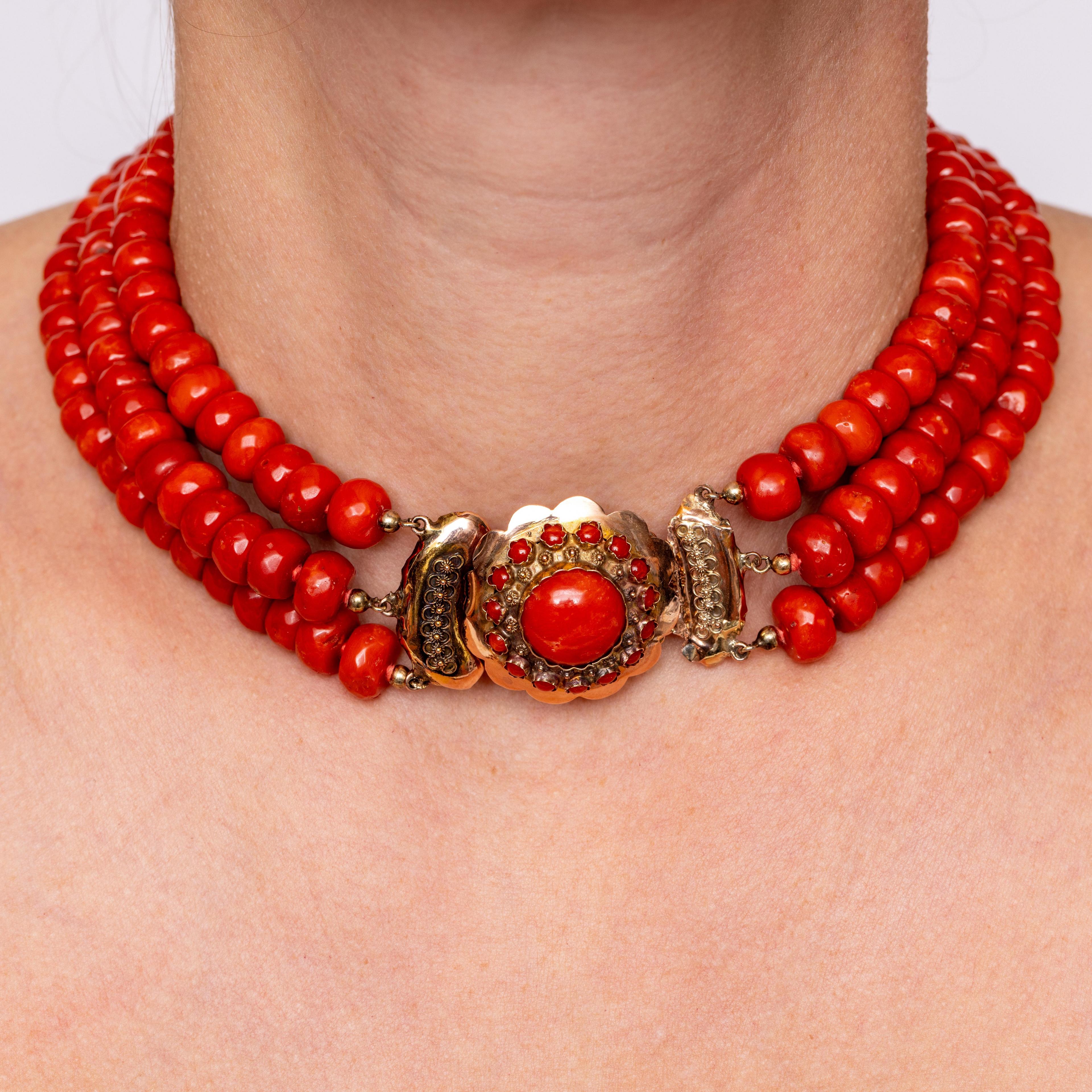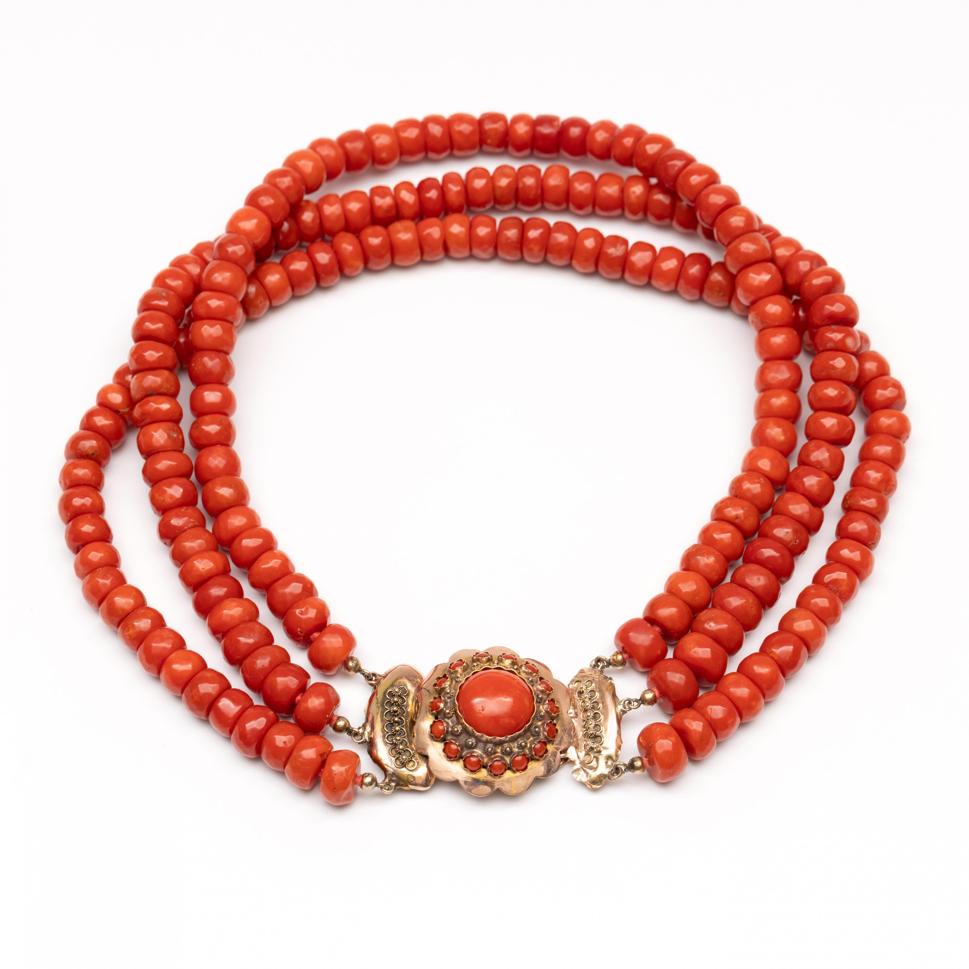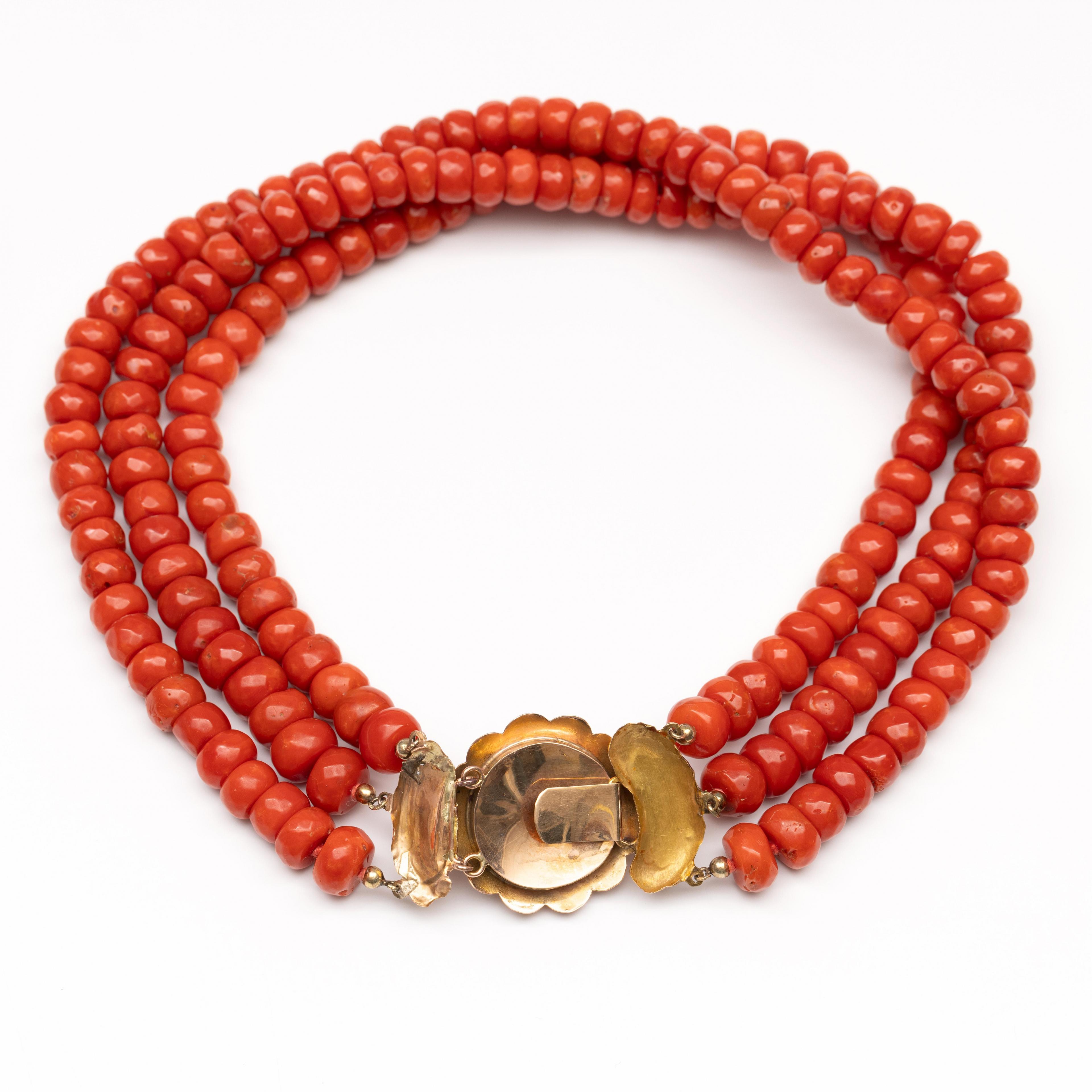 Necklace of three strands of red coral. The beads are faceted and barrel-shaped, 8.5-9 mm in diameter. On a 14 k. gold clasp set with cabochon-cut red coral.