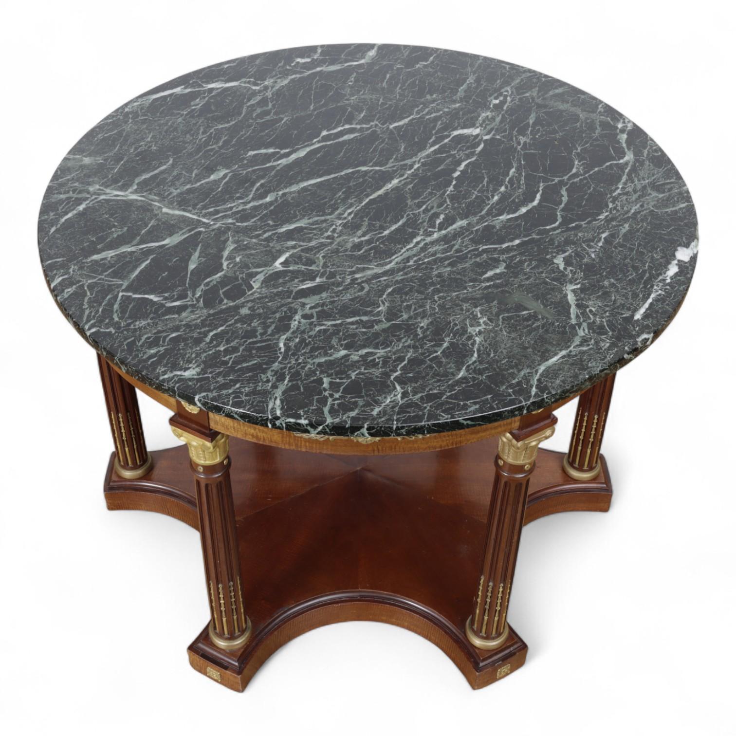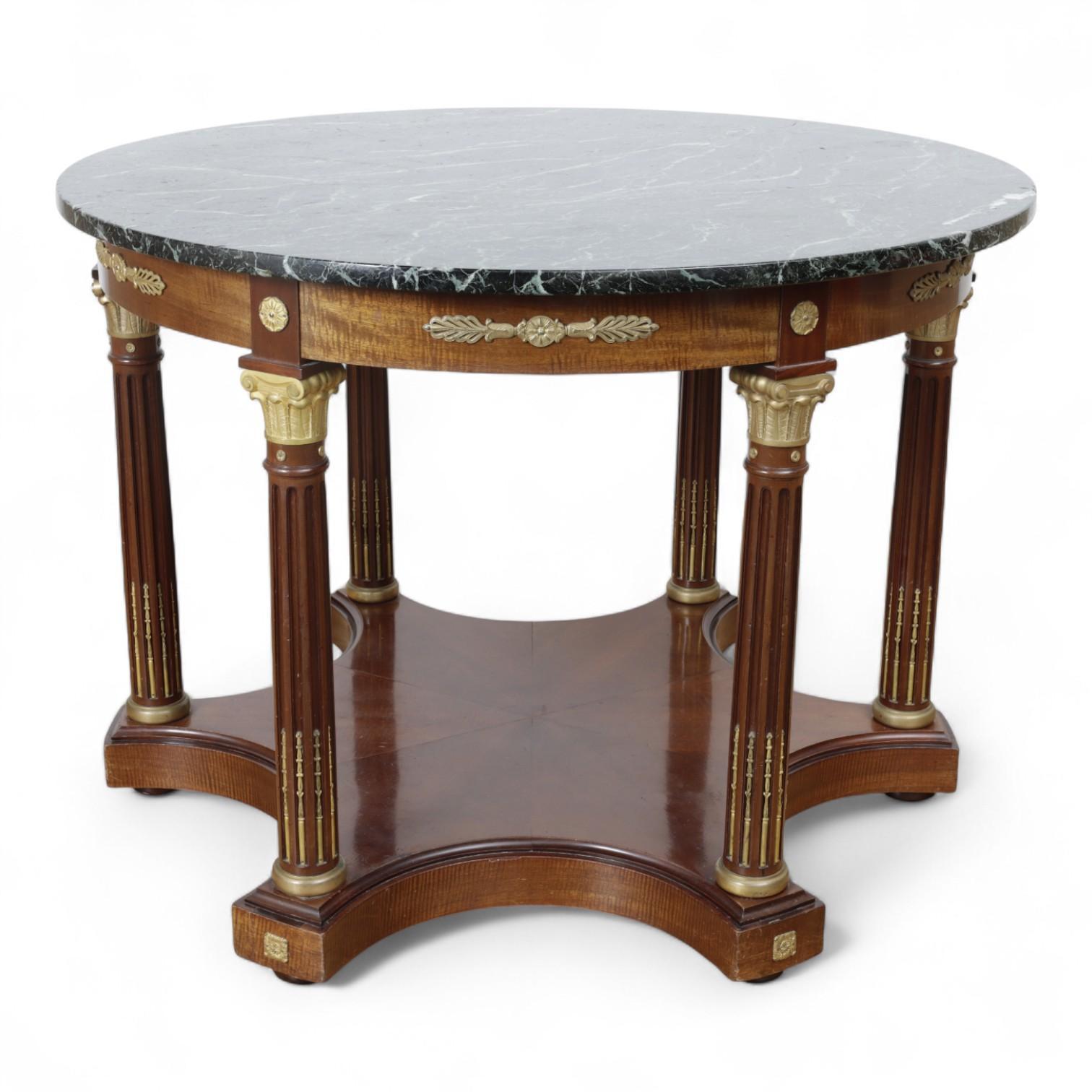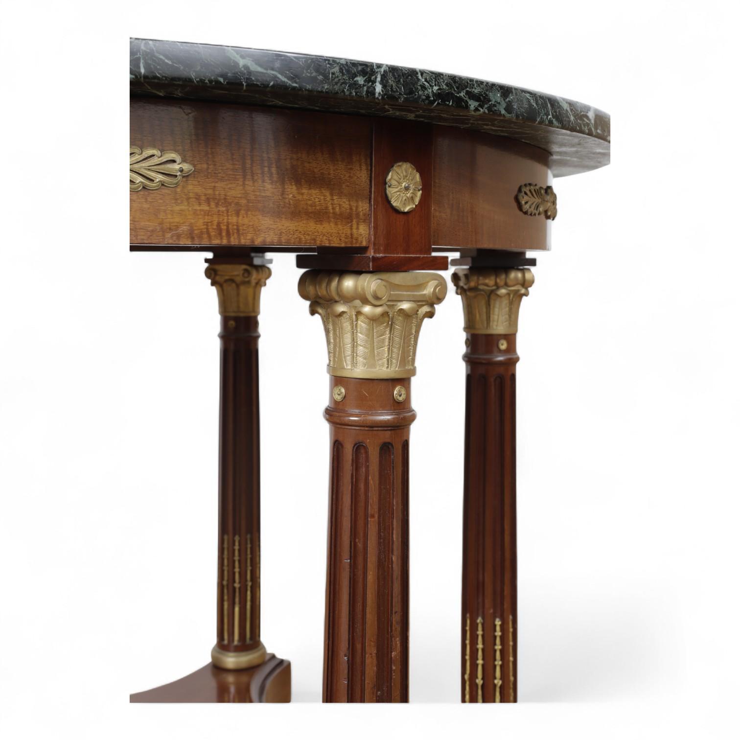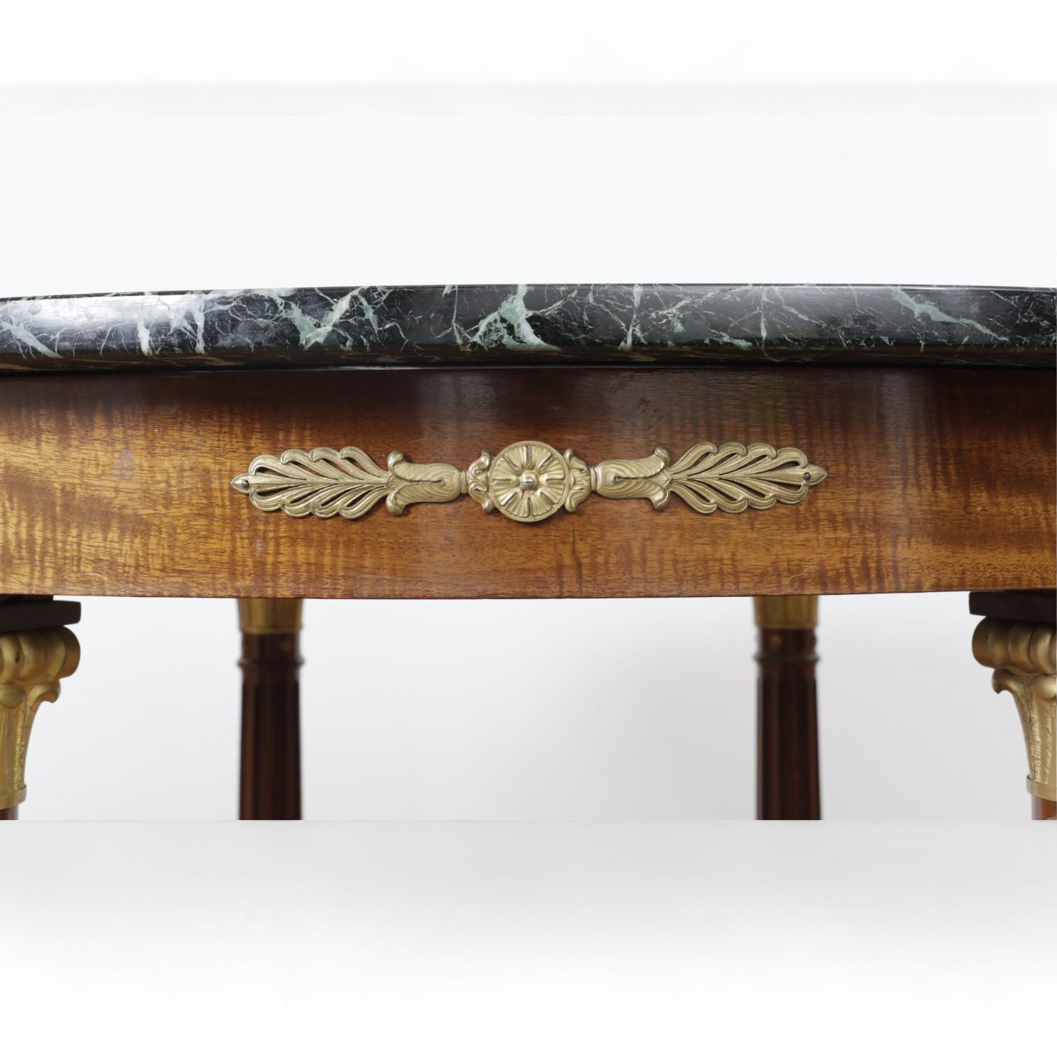 met geaderd groen marmeren blad. Op zes zuilvormige poten met Ionische-Korinthische kapitelen. Het geheel versierd met vuurverguld bronzen ornamenten