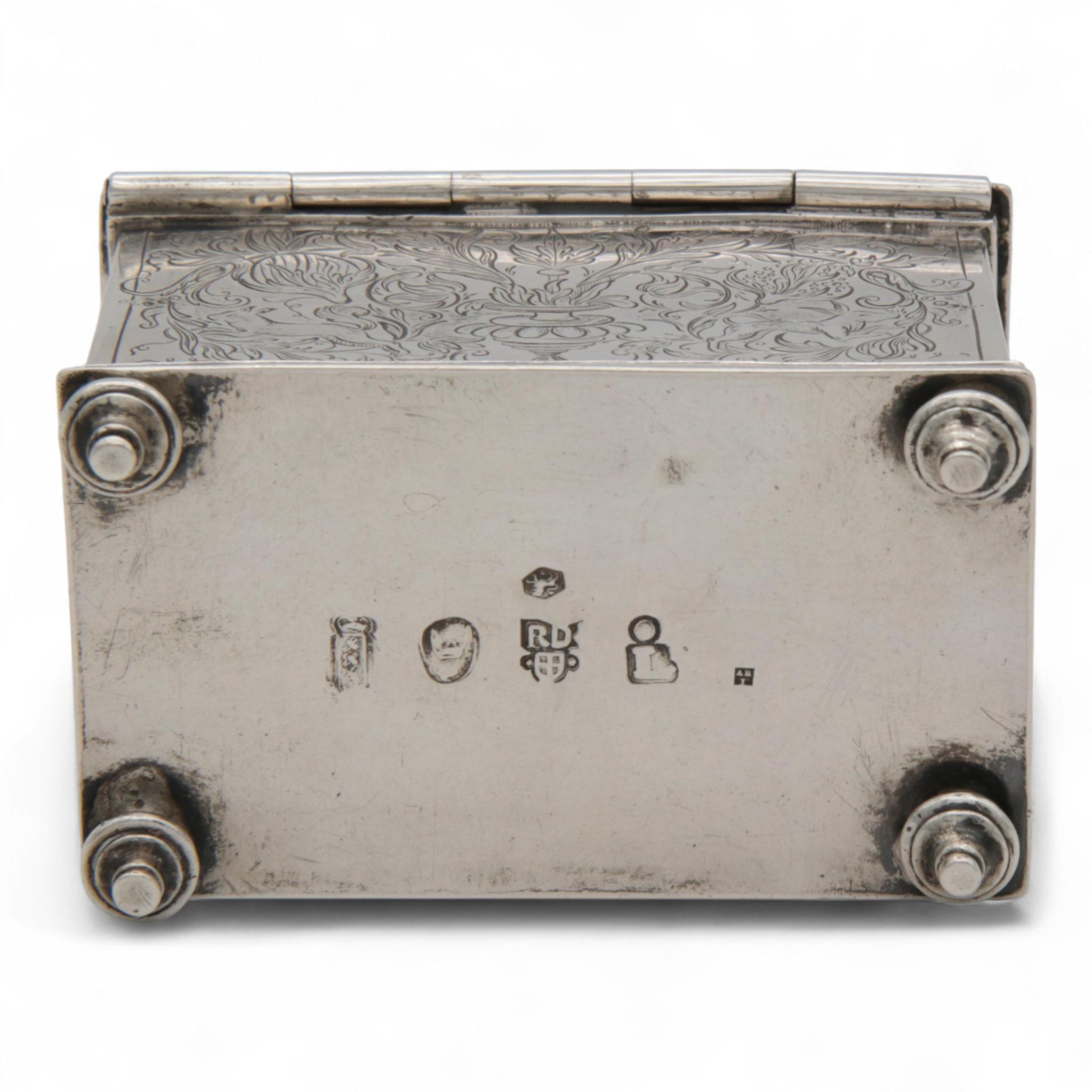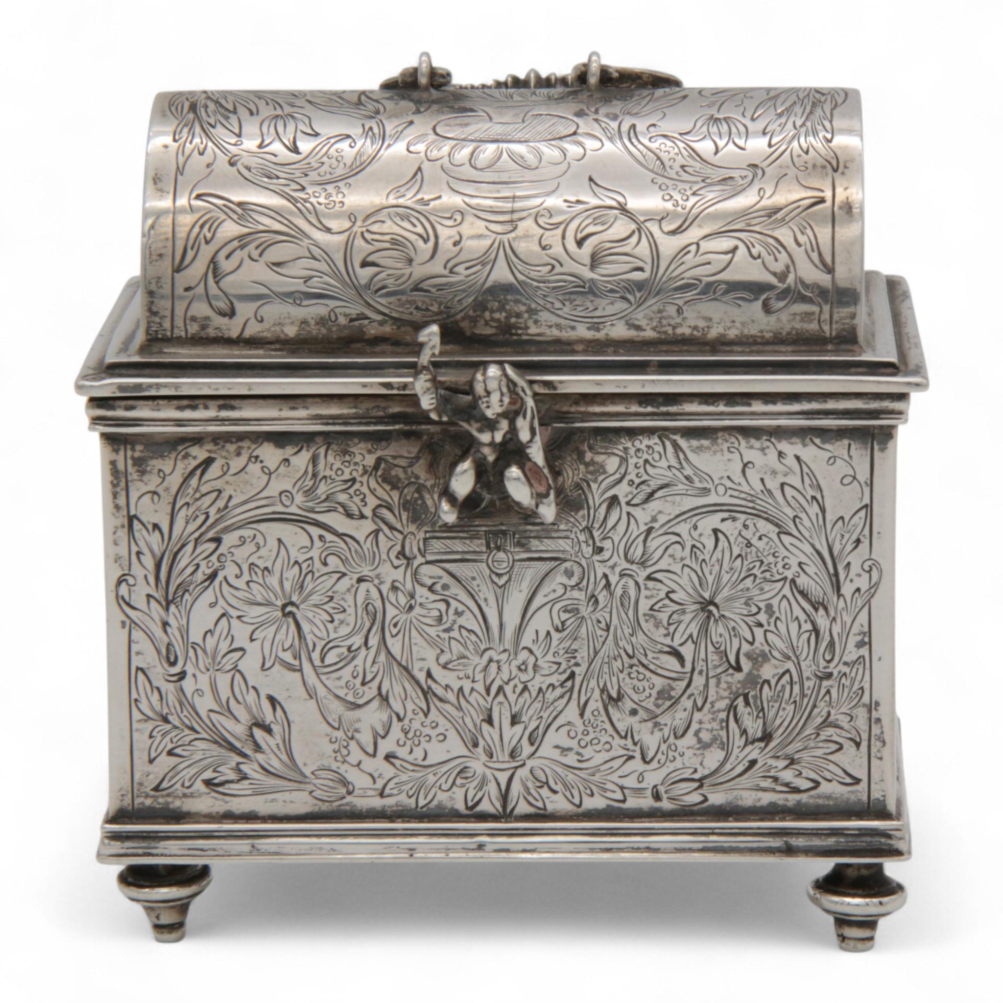 fraai versierd met gravures van vaas-, bloem- en bladmotieven, gebogen hengsel en sluitingsknopje in vorm van cupido, staand op vier balustervormige pootjes, fantasiemerken en mt. Alle de Haas Sneek 1886, 2e gehalte,