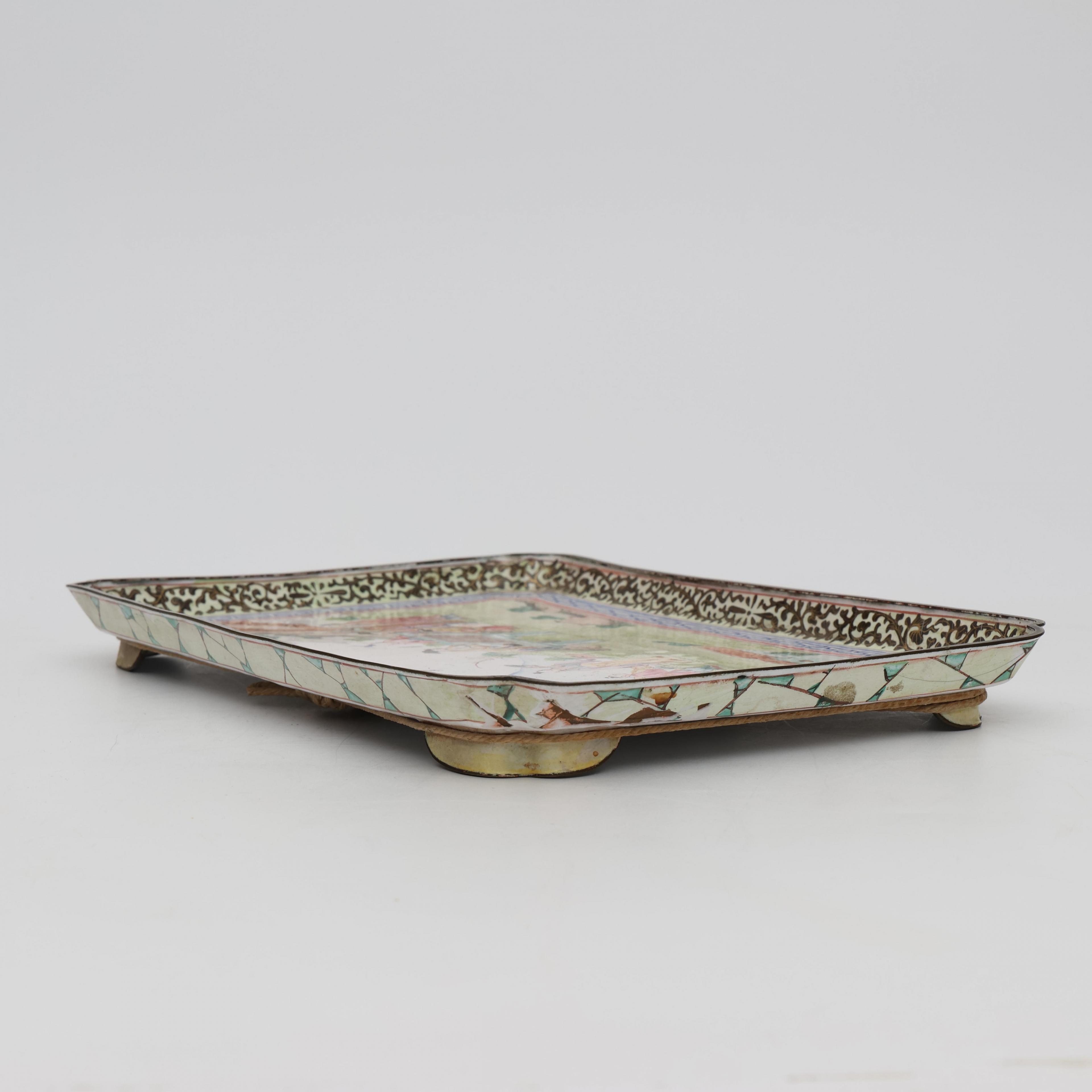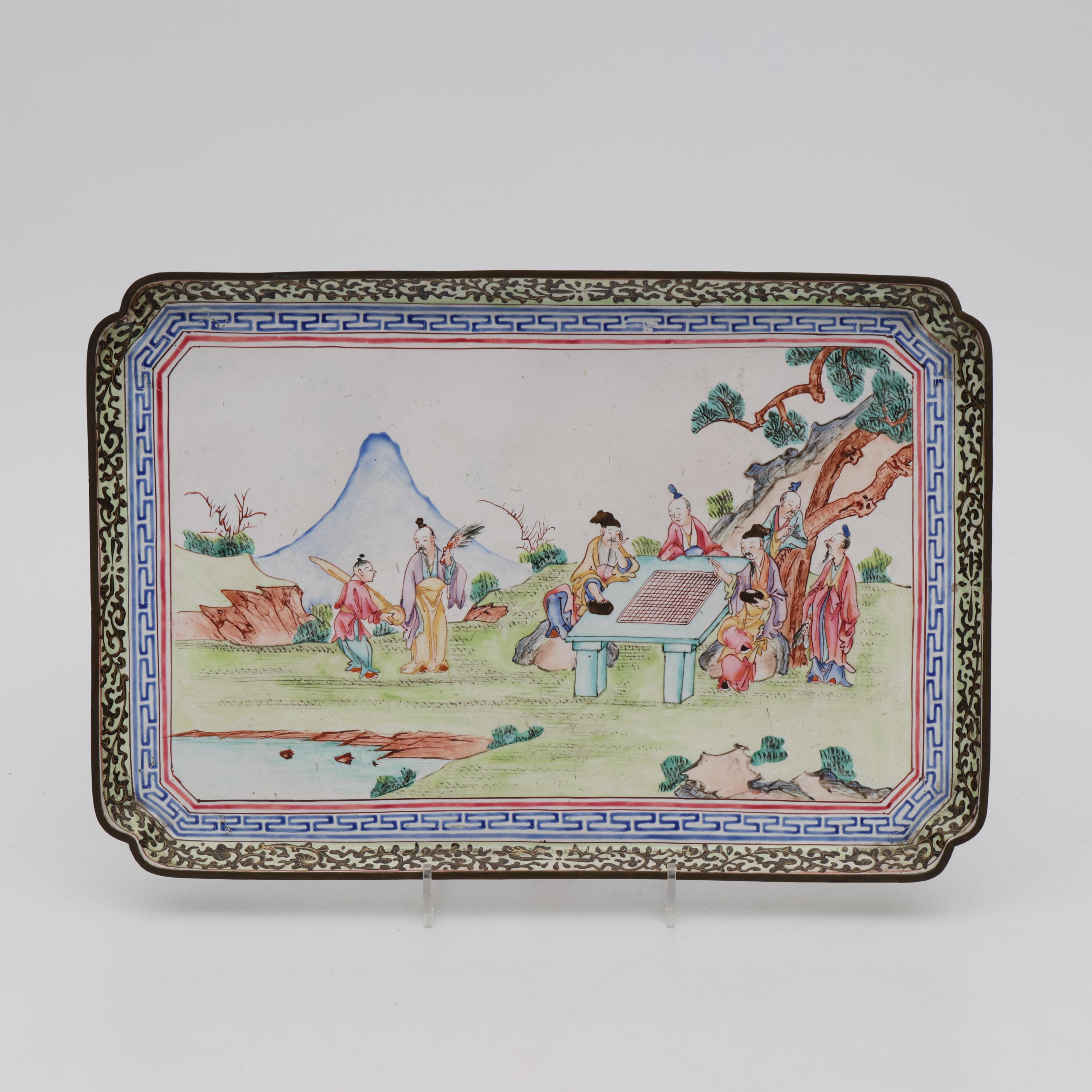 raised on four feet and painted with scholars playing go in a garden (some wear and minor damages as may be expected)