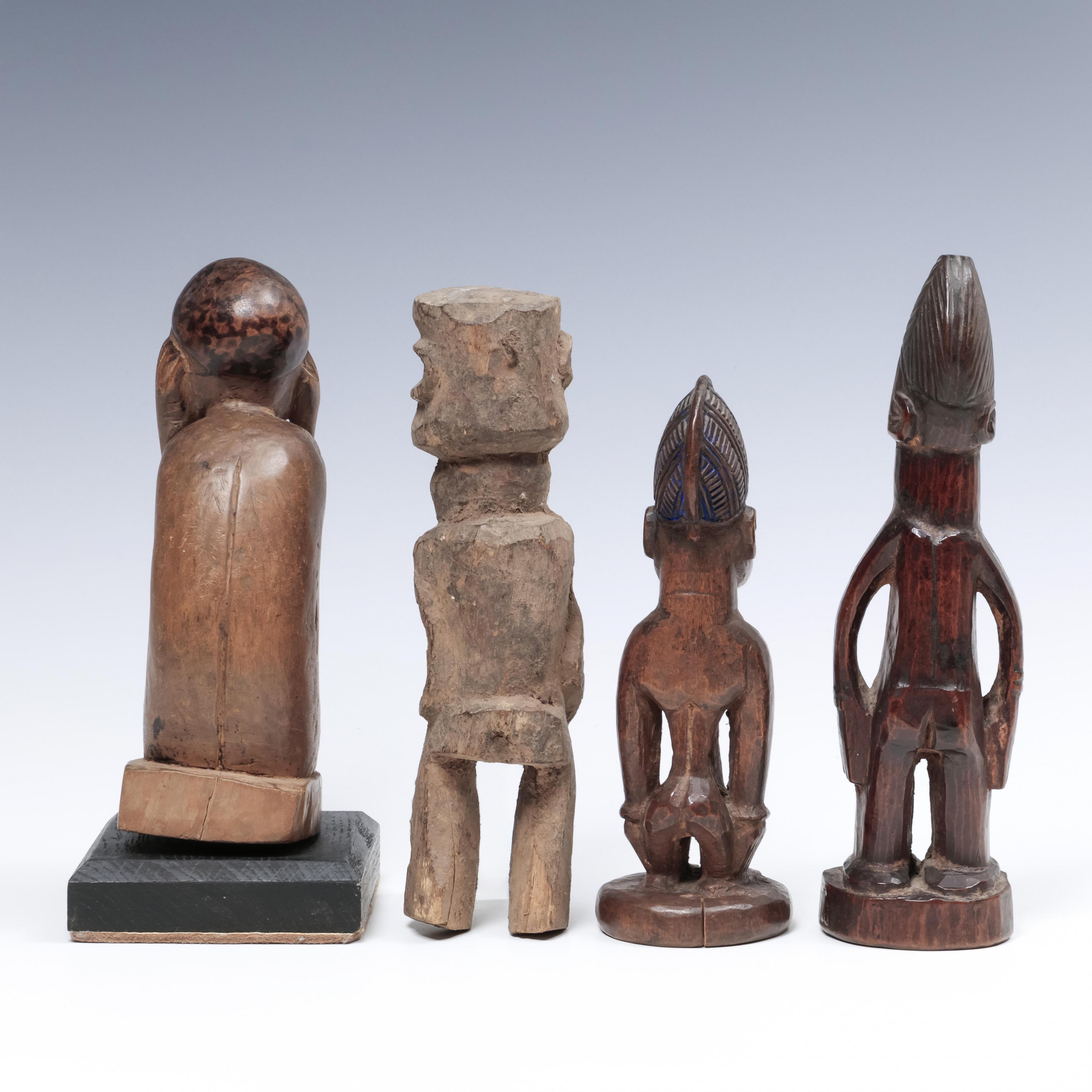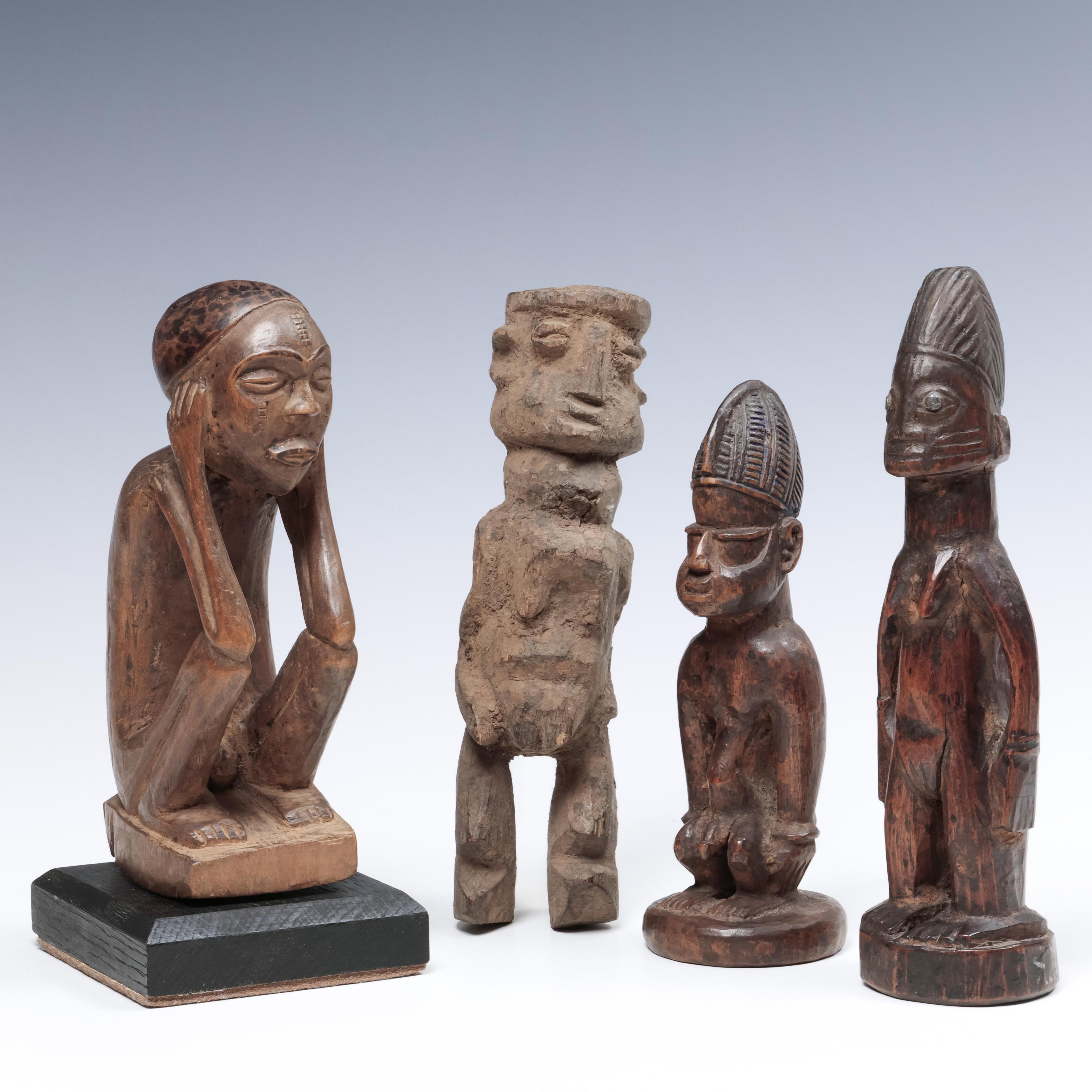 Nigeria, Yoruba, two twin figures; a Burkina Faso, Lobi, figure and a D.R. Congo, Pende, crouching figure.