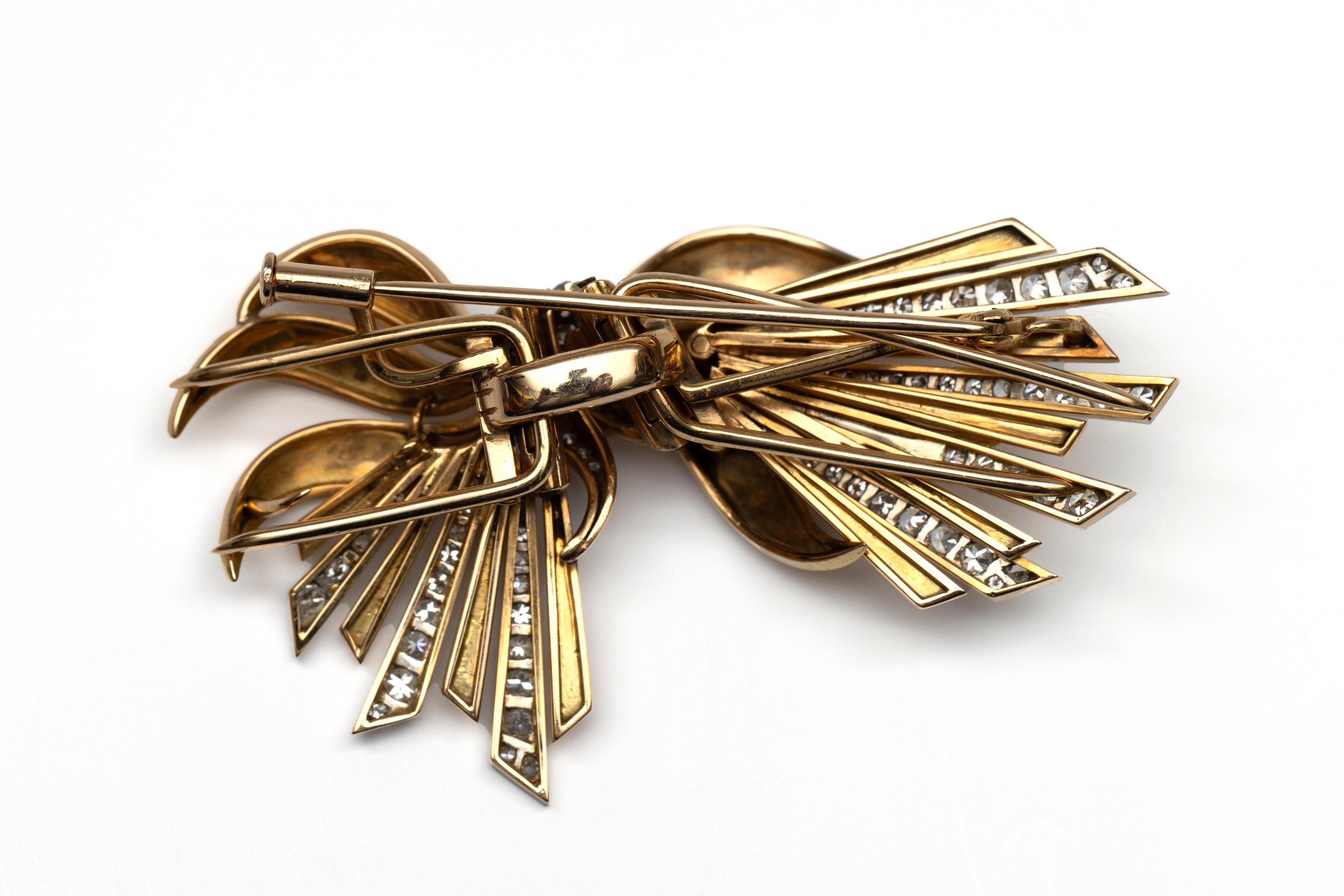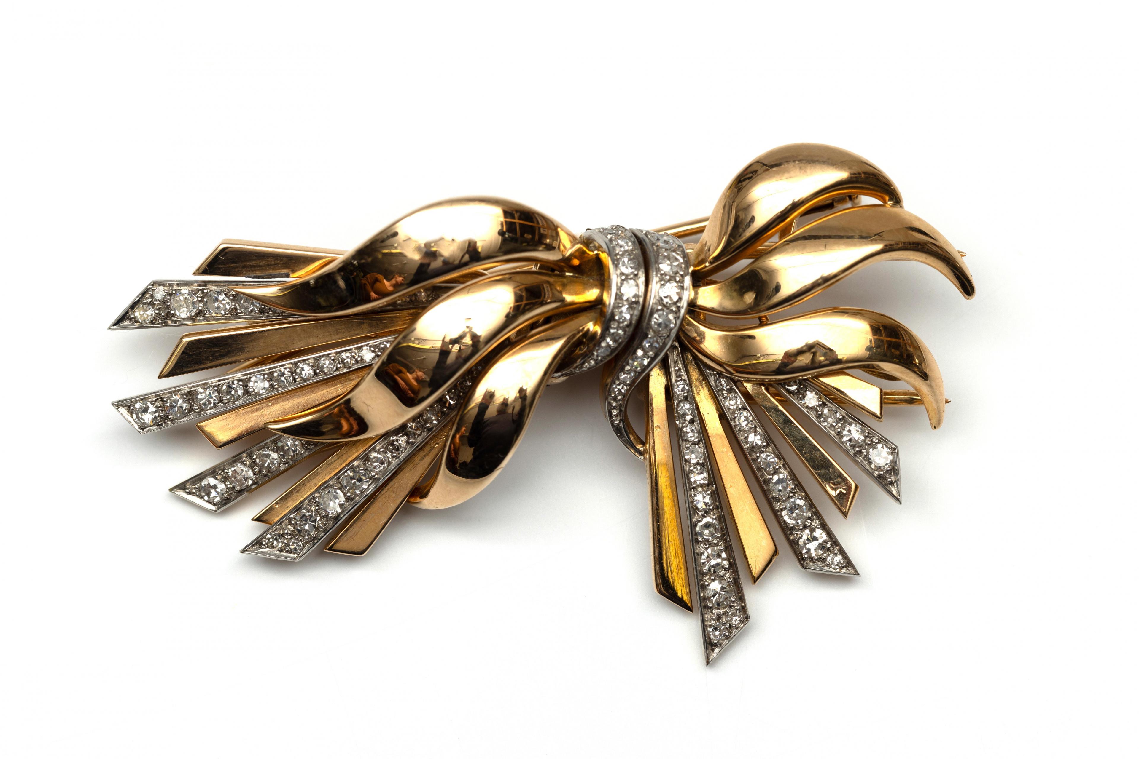 14 k. Gold and platinum double clip brooch, Retro. In the shape of a bow. Set with single cut diamonds with a total weight of approximately 1.20 ct.